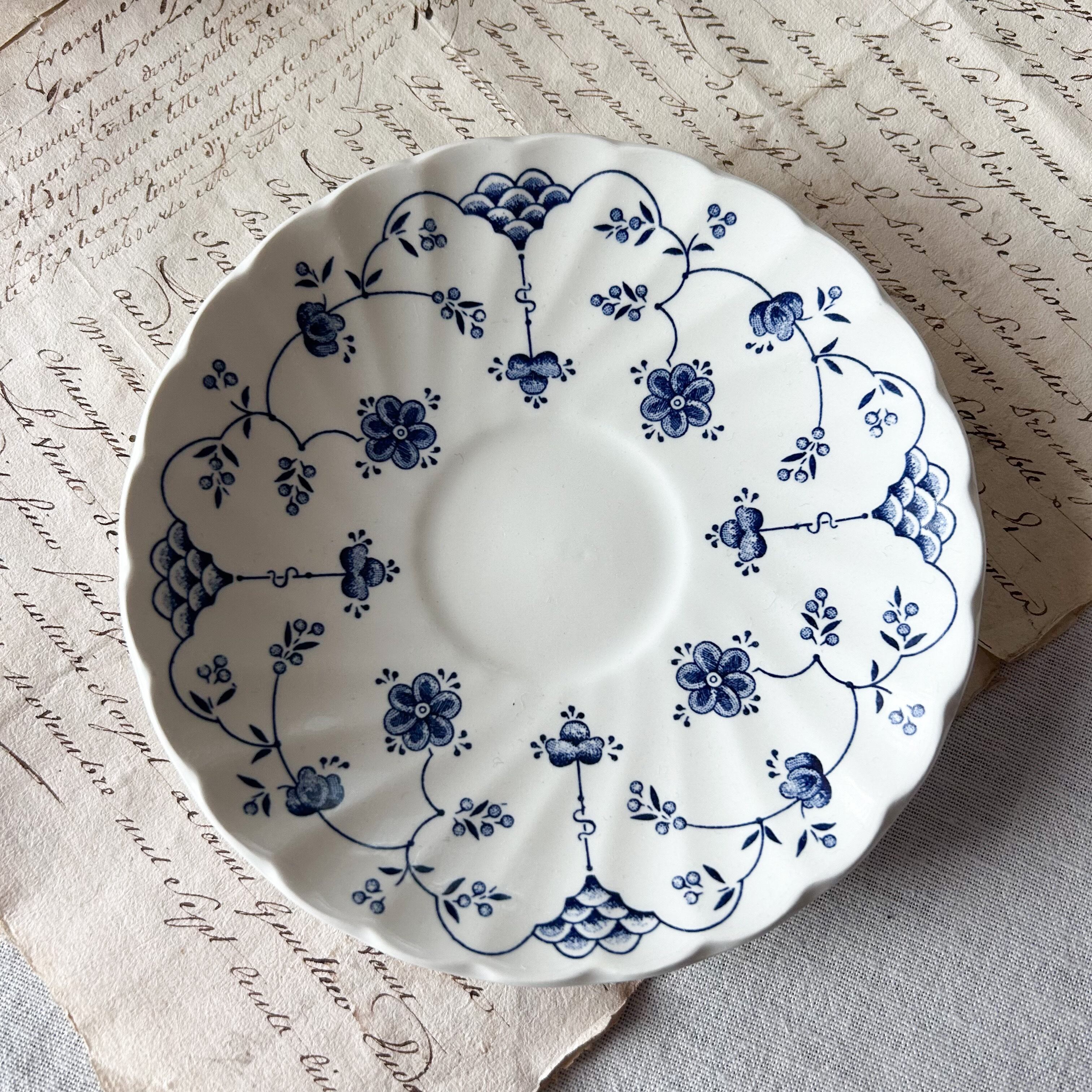 によるサキソニー柄、ブルーオニオン風のカップ&ソーサーです。白地に繊細なブルーの花唐草模様が描かれ、波打つようなレリーフが柔らかな陰影を生み出しています。伝統的なパターンでありながらも上品で清楚な佇まいがあり、紅茶やハーブティーを注ぐと一層美しさが引き立ちます。