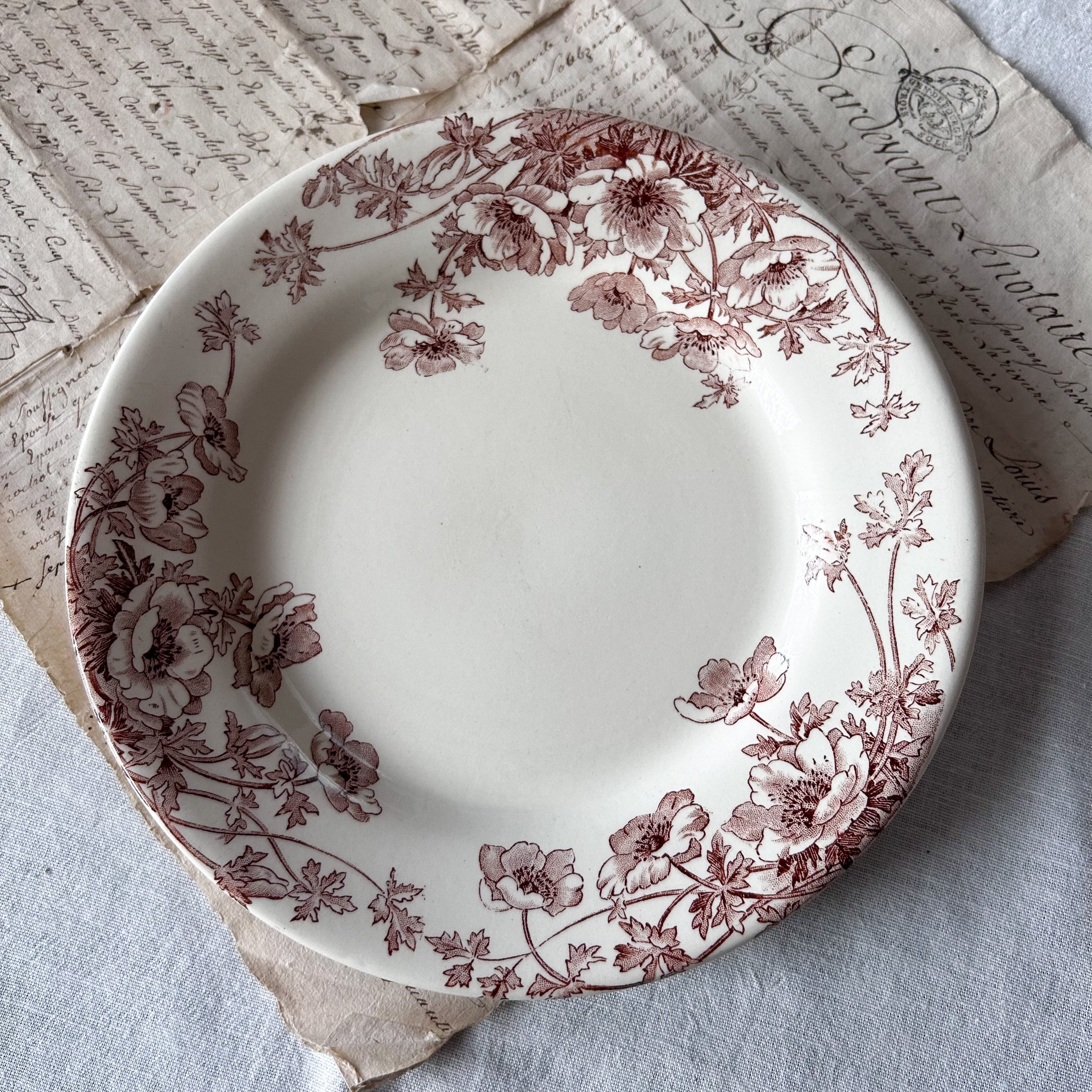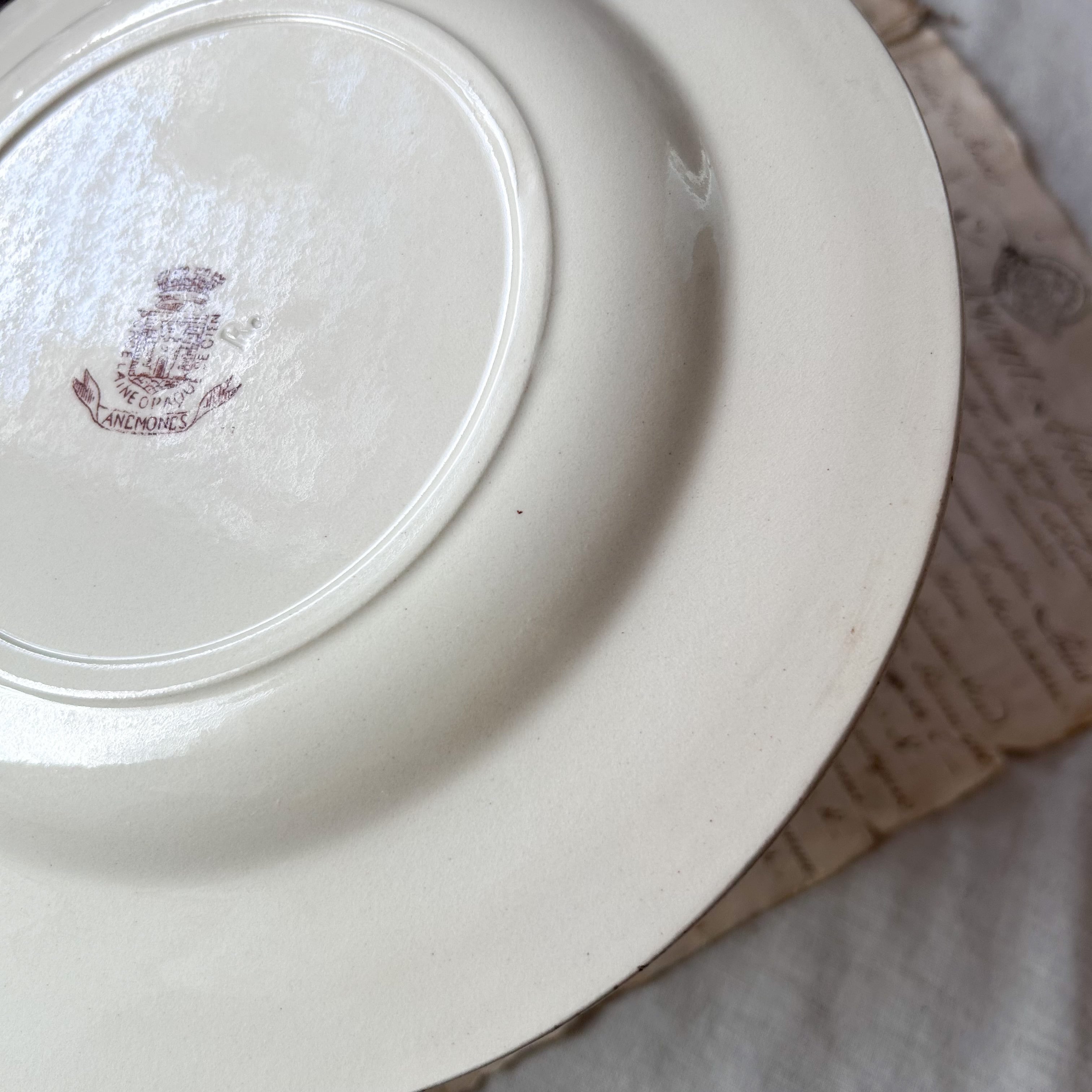 フランスの名窯ジアンによるアネモネシリーズのプレート。可憐に咲くアネモネの花がリムにぐるりと配され、シックなブラウンの単色転写が上品な印象を与えます。なめらかなクリーム色の陶肌とのコントラストも美しく、食卓を華やかに彩る存在感があります。クラシカルで落ち着いたデザインは、日常使いにも特別なひとときにも寄り添います。