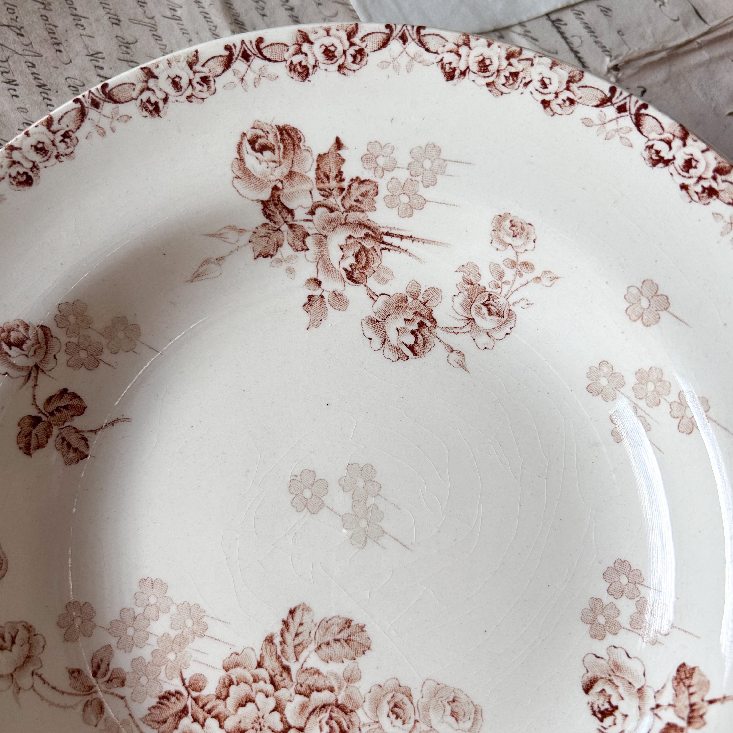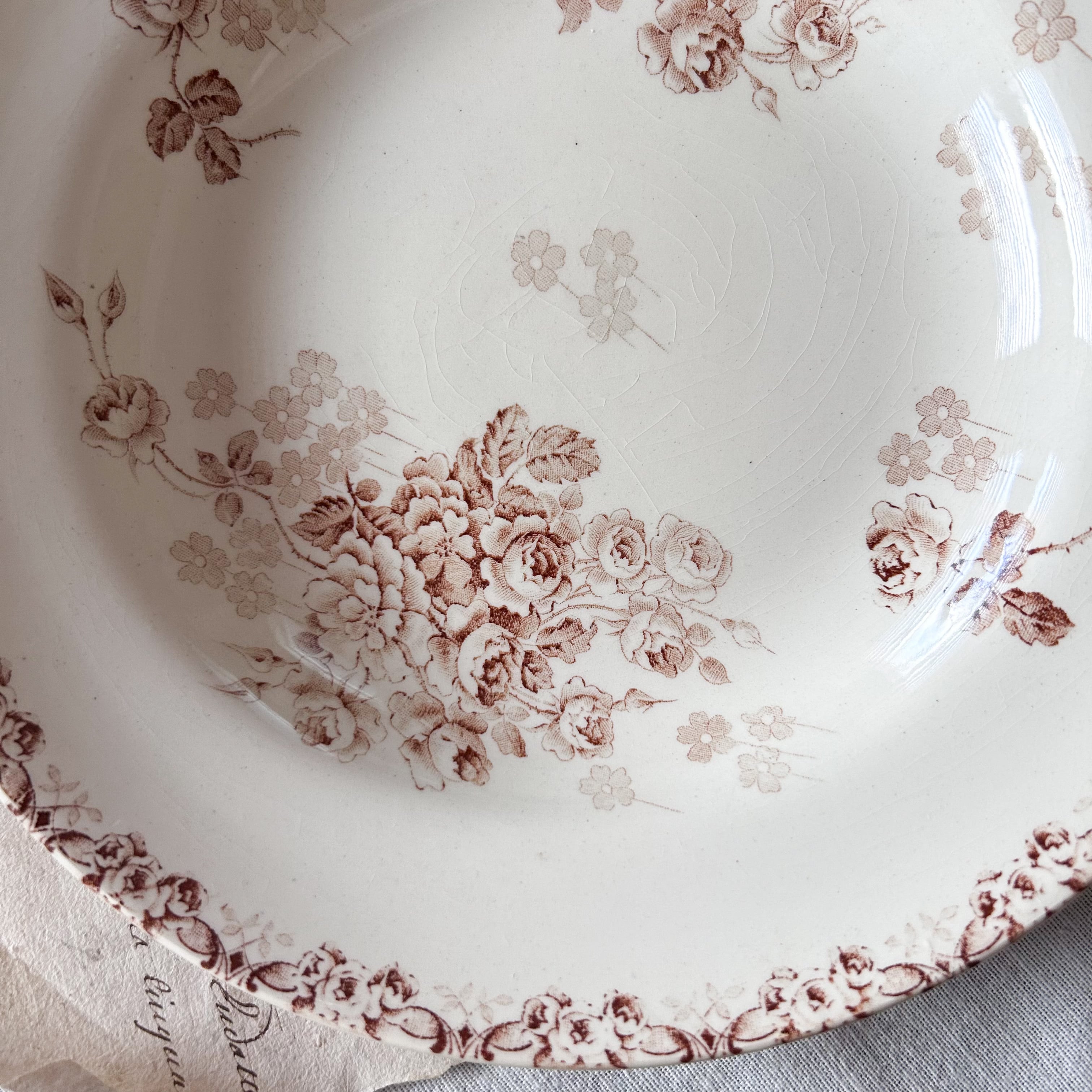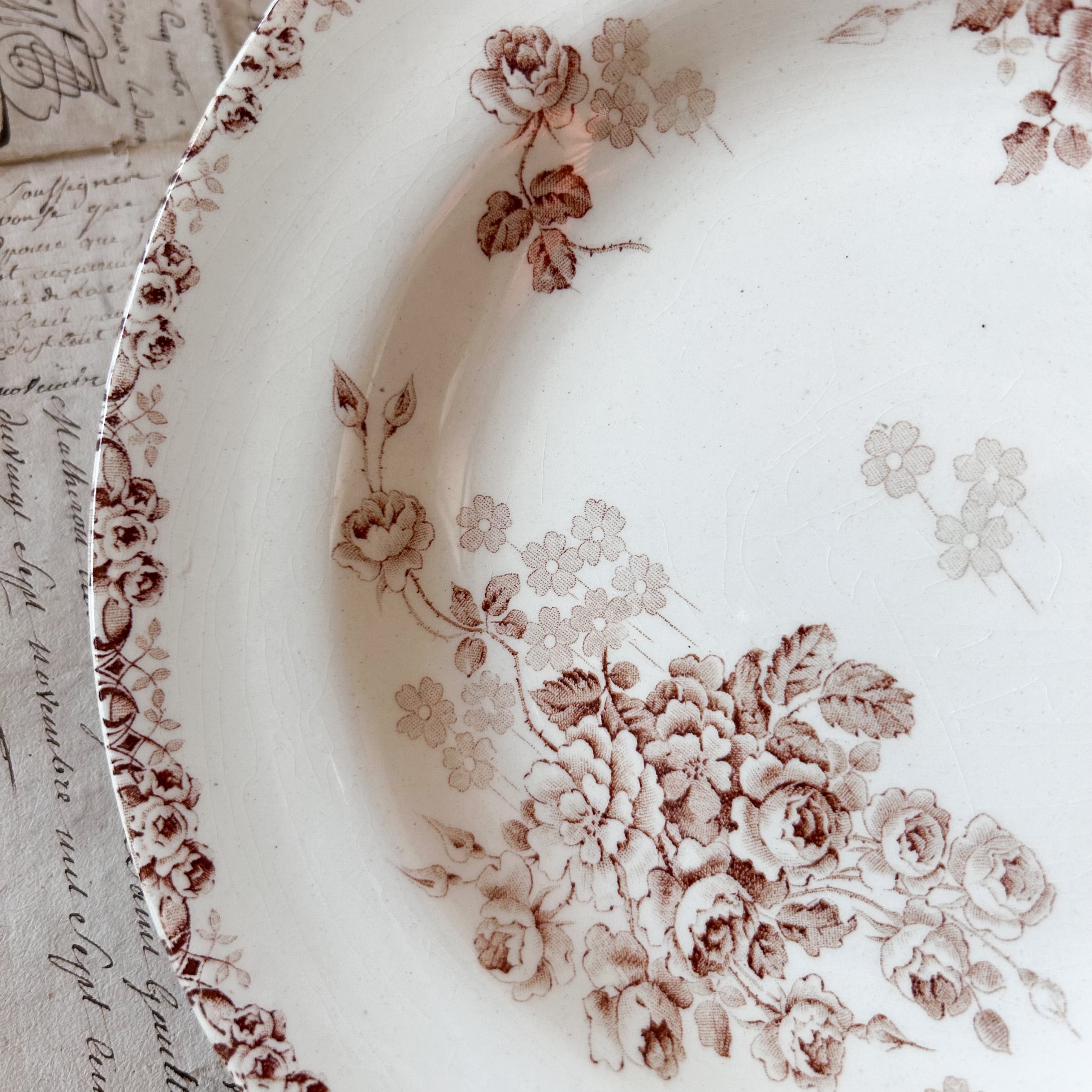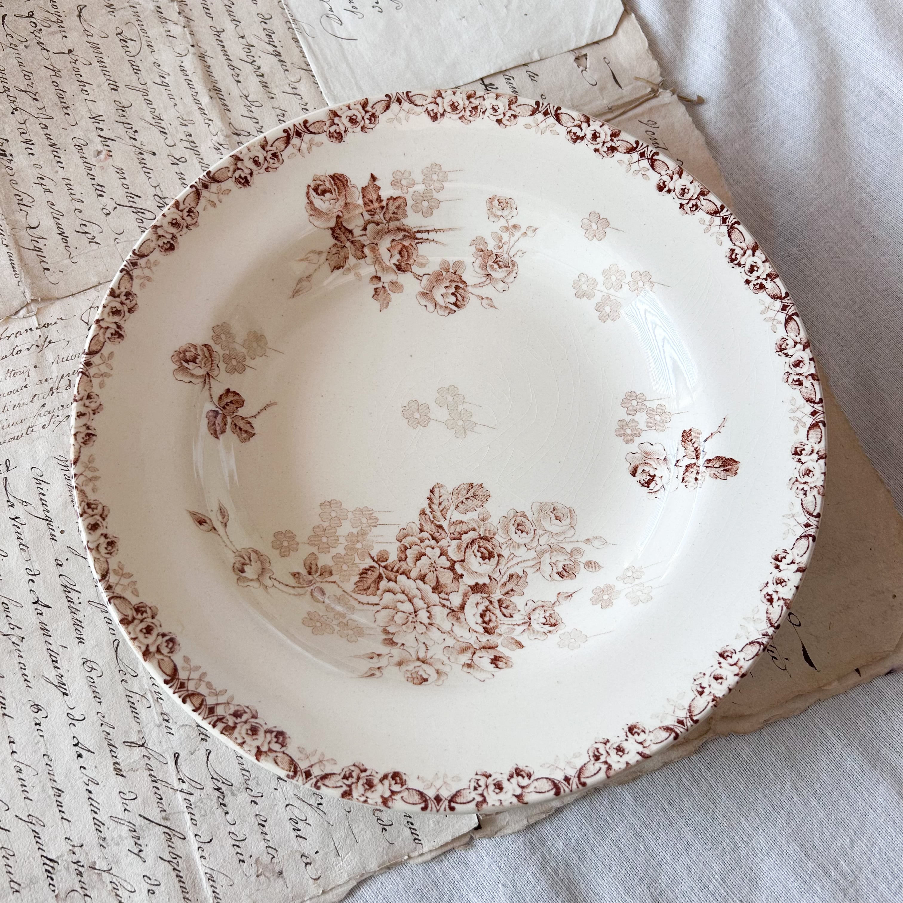 可憐な小花とバラがリースのように配置された上品なデザインが特徴のプレート。淡いブラウンのトーンで描かれた花柄が、優雅で落ち着いた雰囲気を漂わせます。縁取りにも繊細なバラのモチーフが施され、フレンチアンティークらしい気品を感じさせる一枚です。