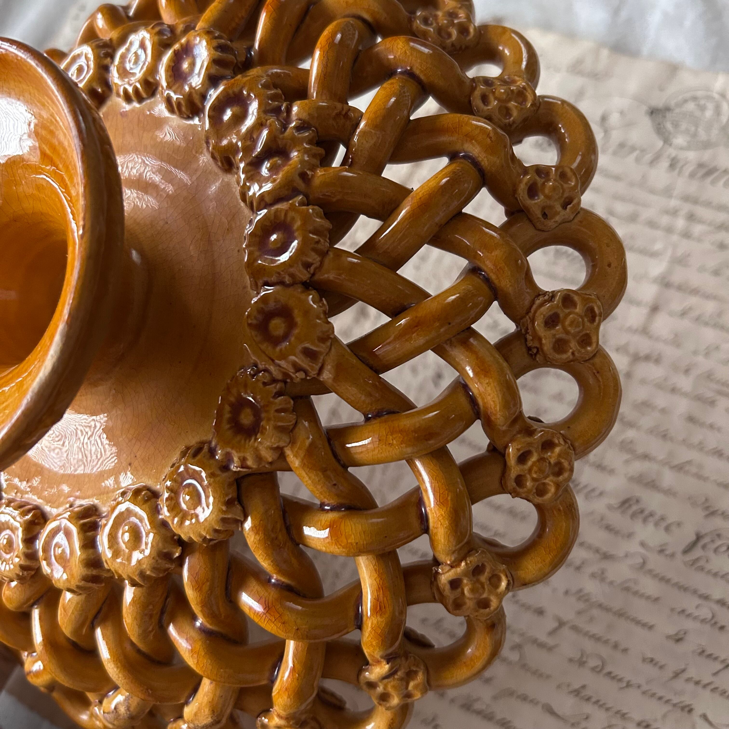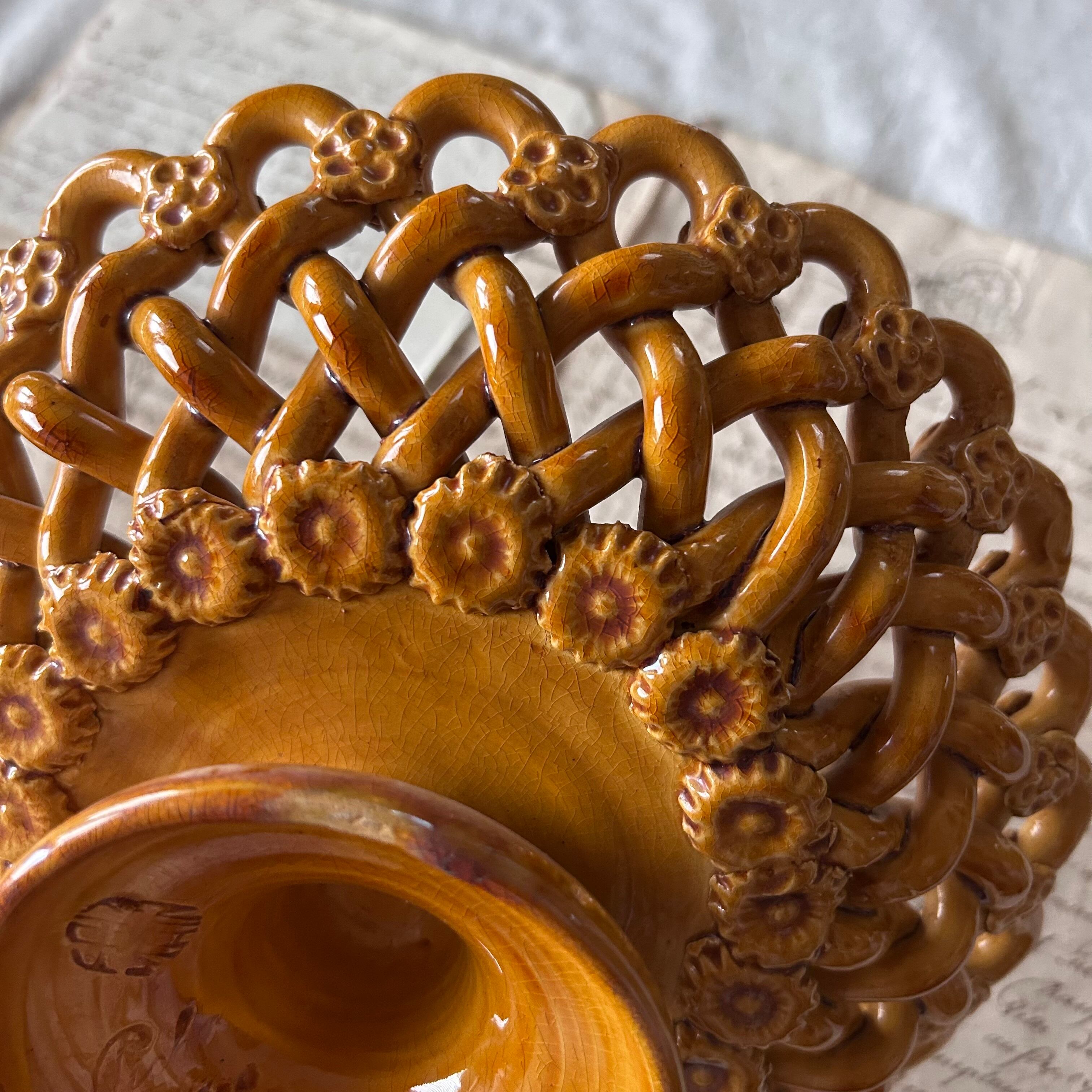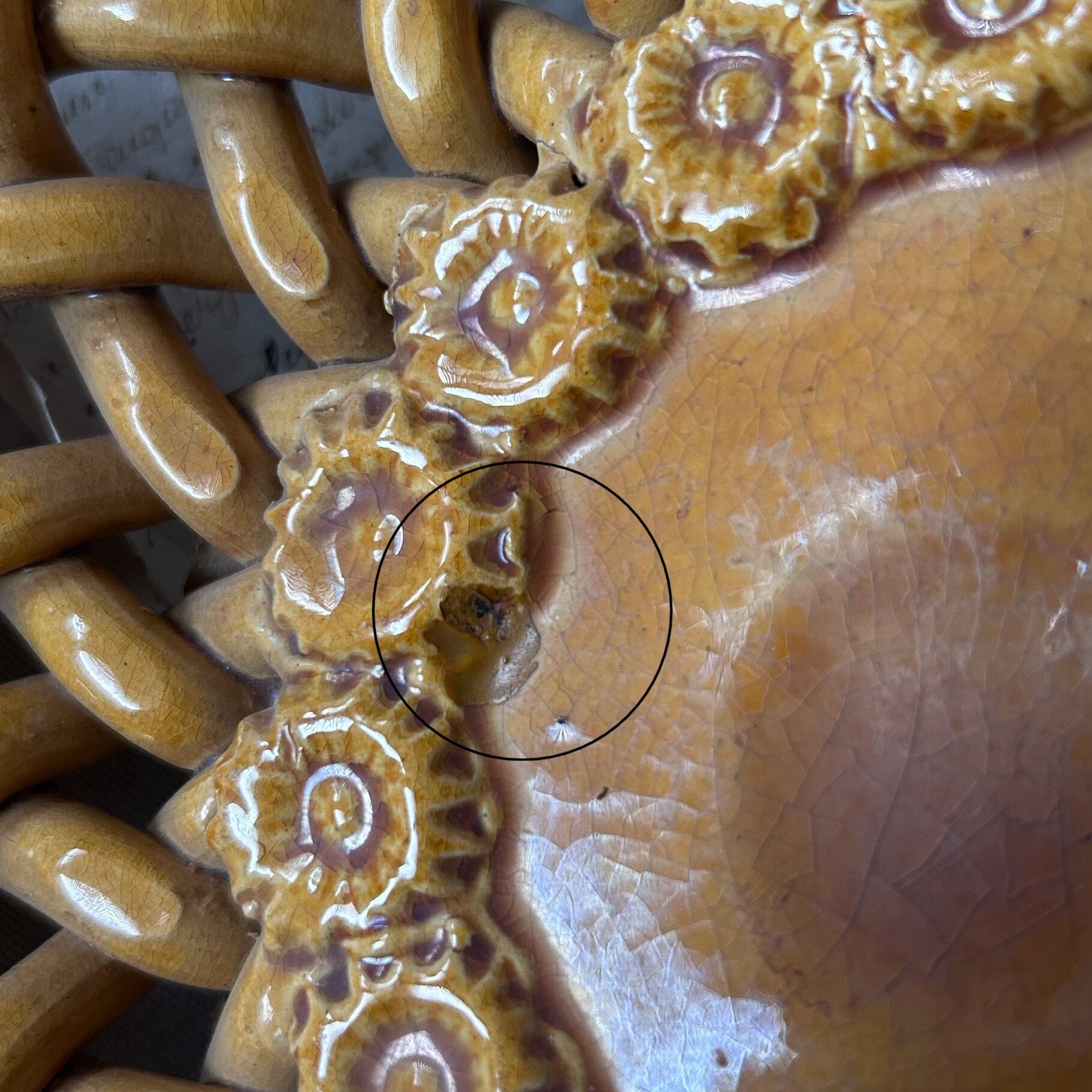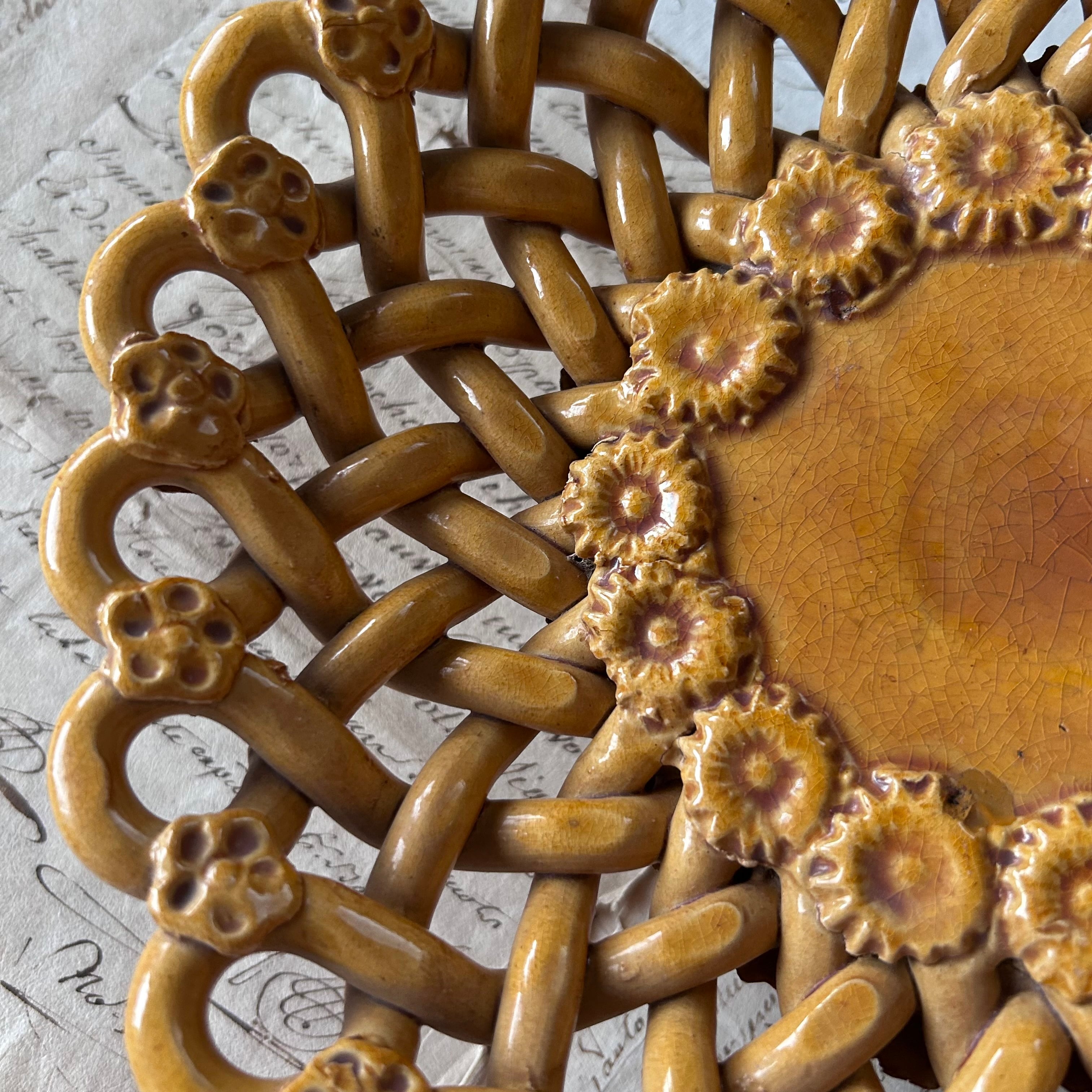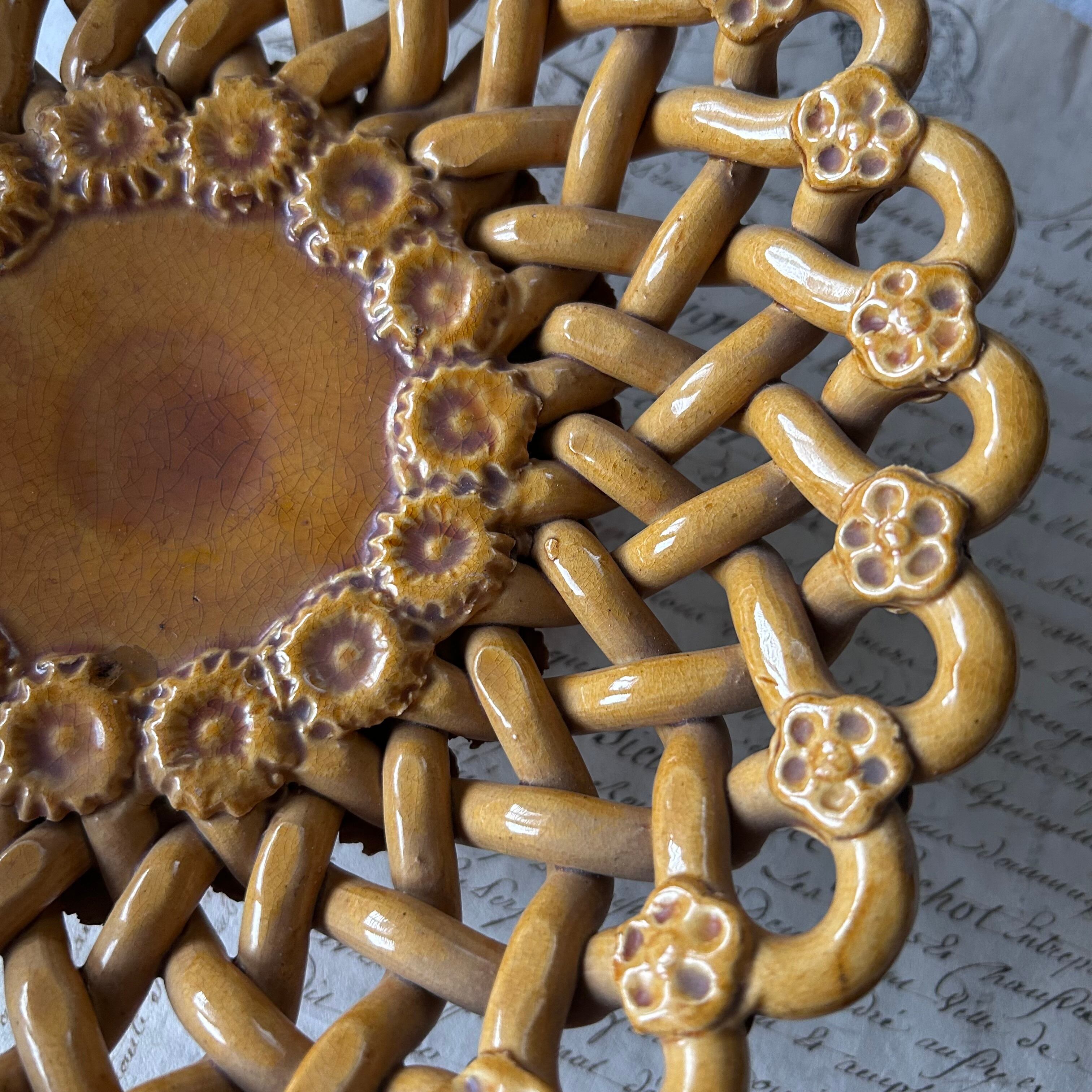 一つ一つ手で編み込むように成形された繊細なパニエ模様が美しく、職人技を感じさせる逸品。温かみのある蜂蜜色(オークル)の釉薬が施され、自然光のもとで優しい艶を放ちます。フルーツや焼き菓子を盛るのはもちろん、インテリアのアクセントとしても存在感があります。