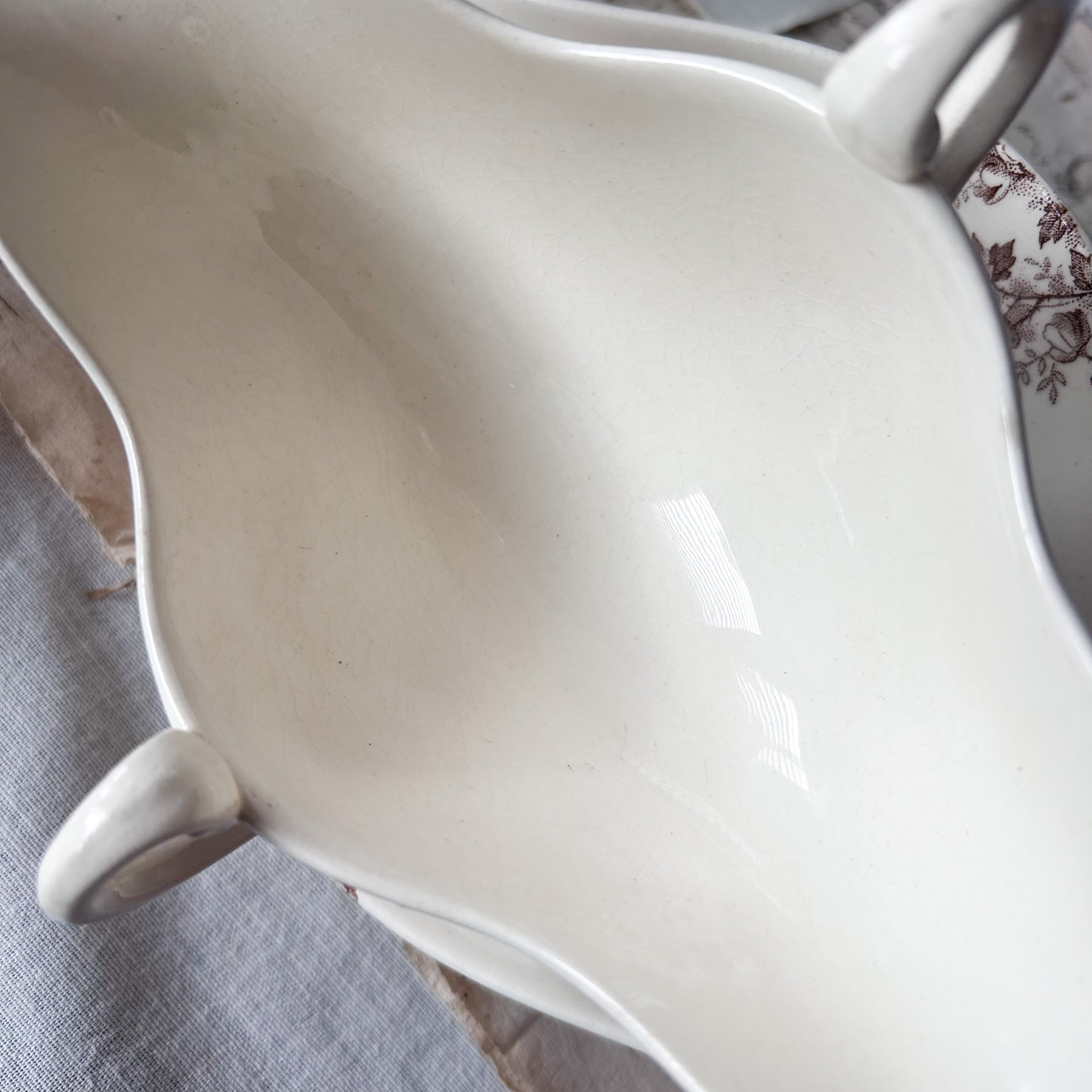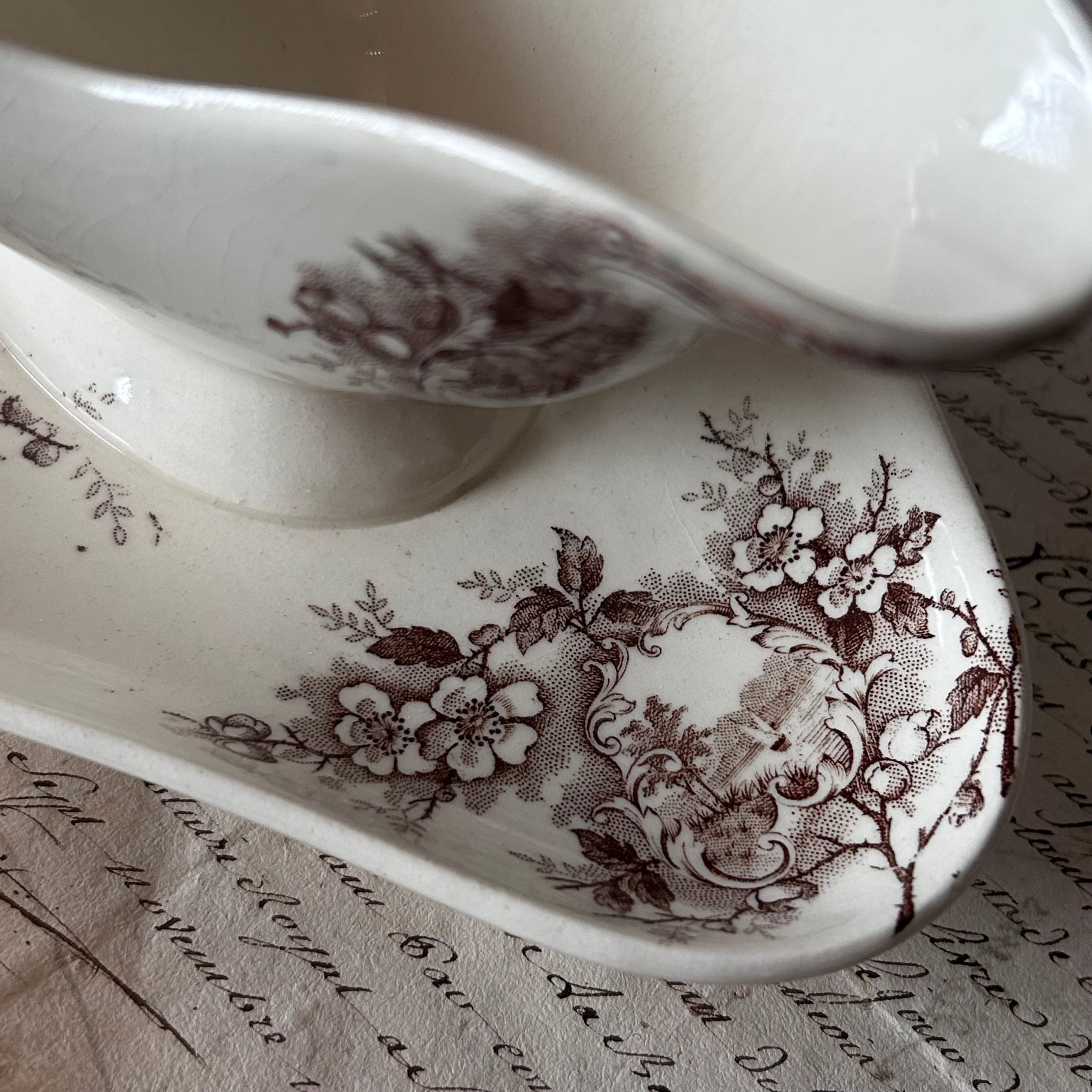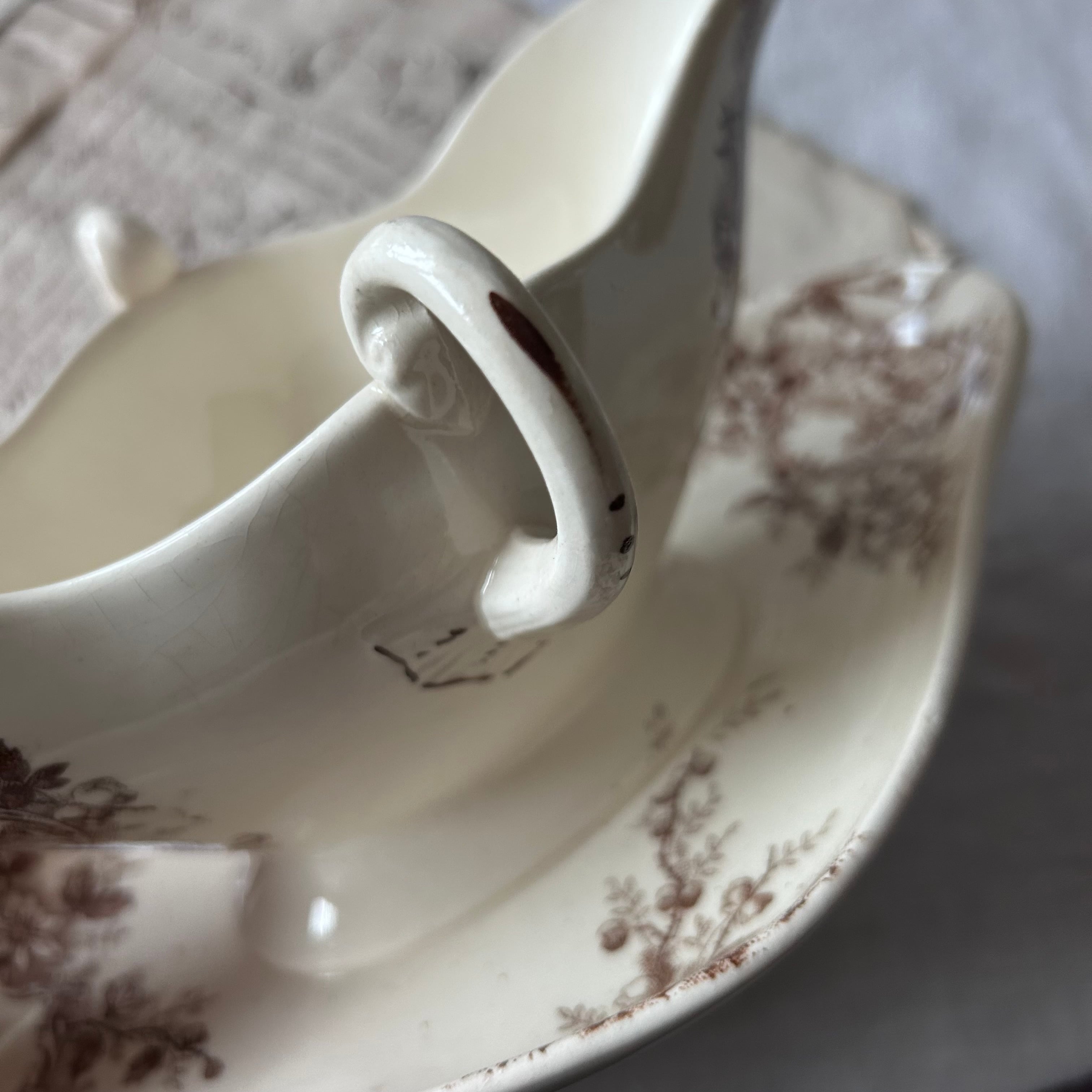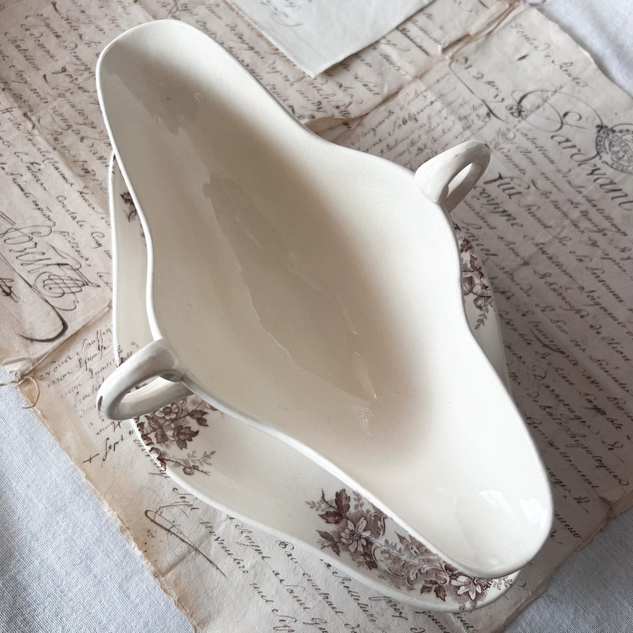 ブラウンのトランスファープリントで小花や蔓が繊細に描かれ、全体に優雅で落ち着いた印象を与えます。流れるようなフォルムと両サイドのハンドルが美しく、テーブル上で華やかな存在感を放ちます。ソースを入れる実用器としてはもちろん、花を活けたりディスプレイにも映えるアンティークです。