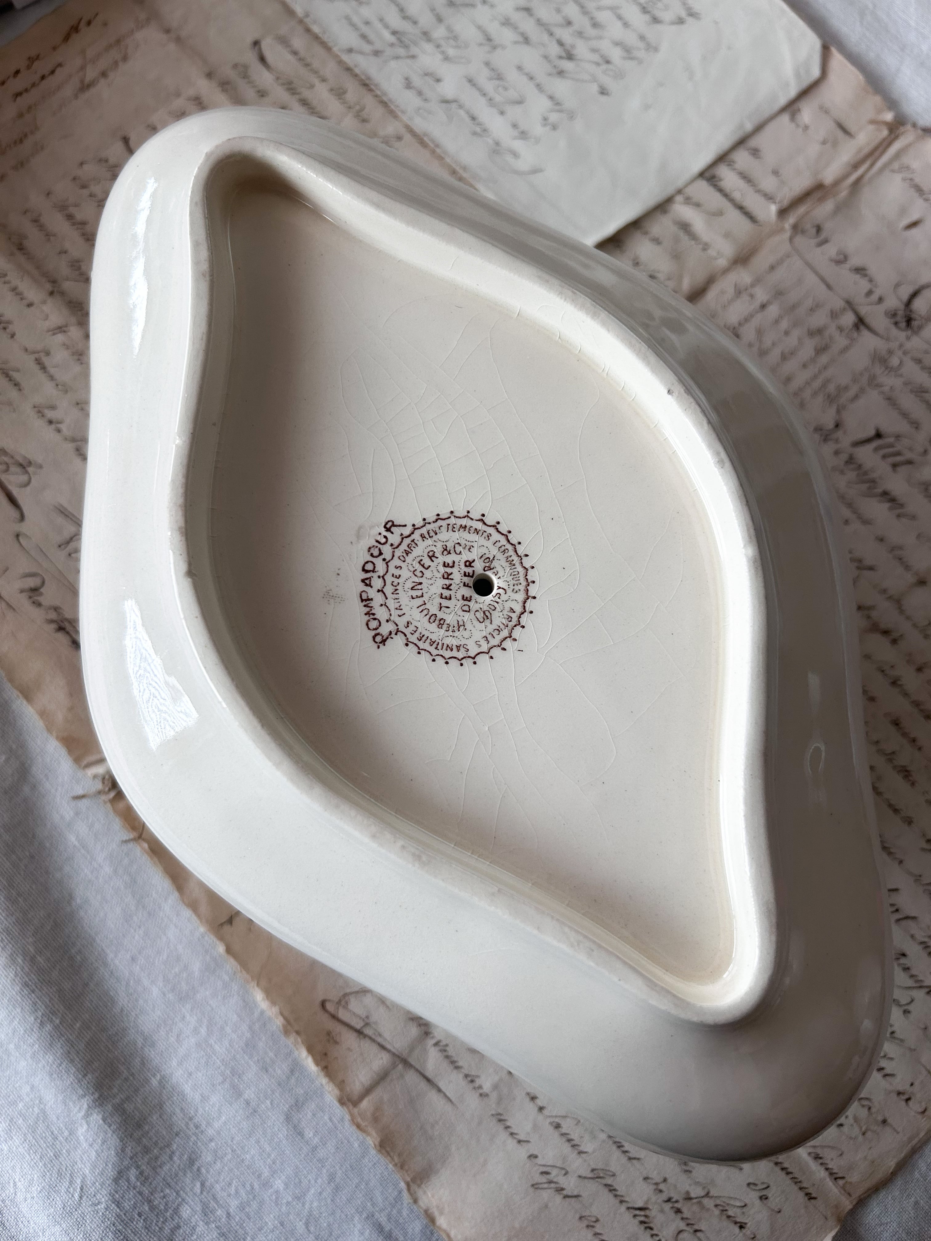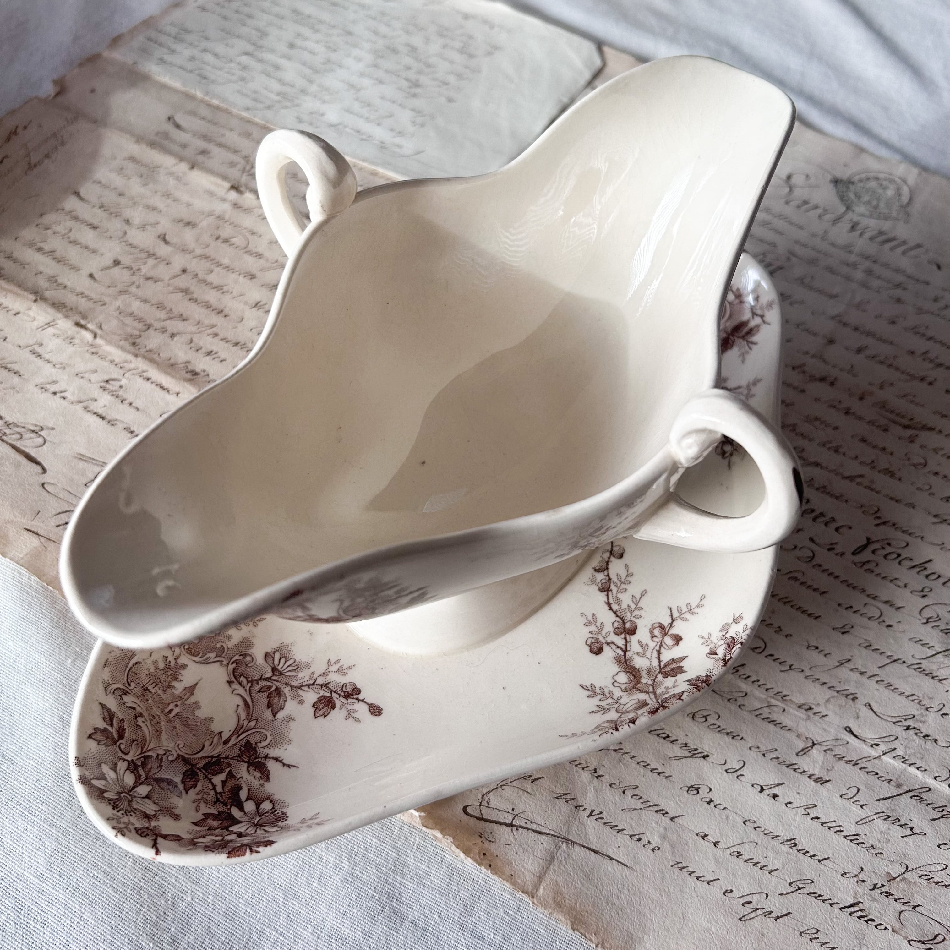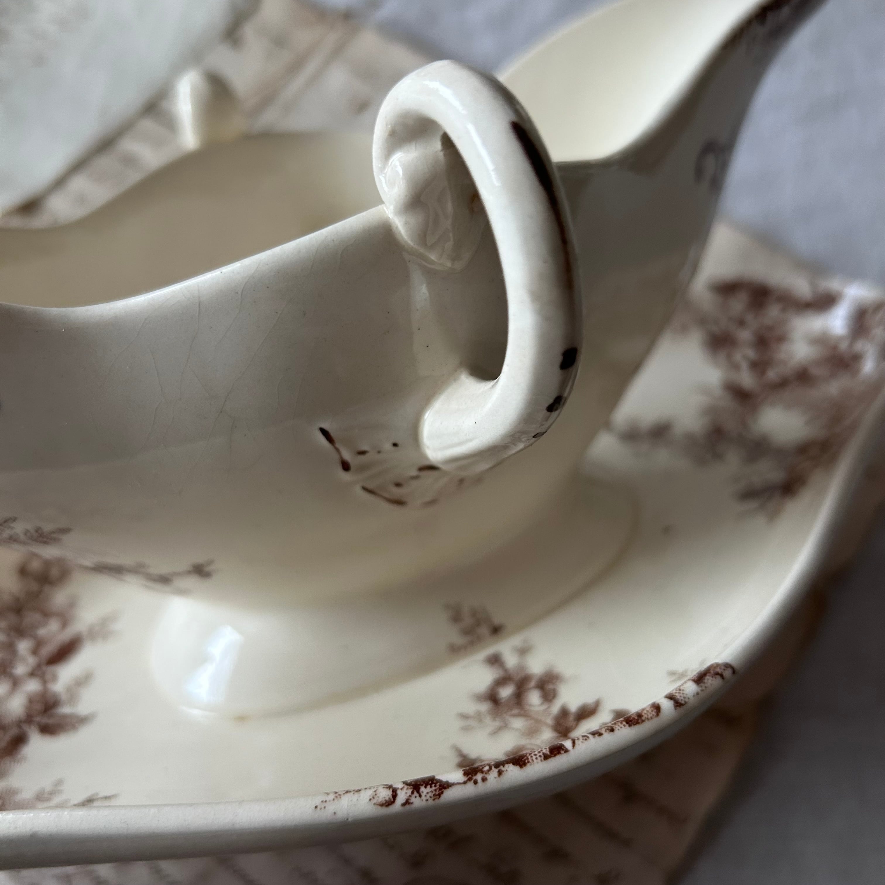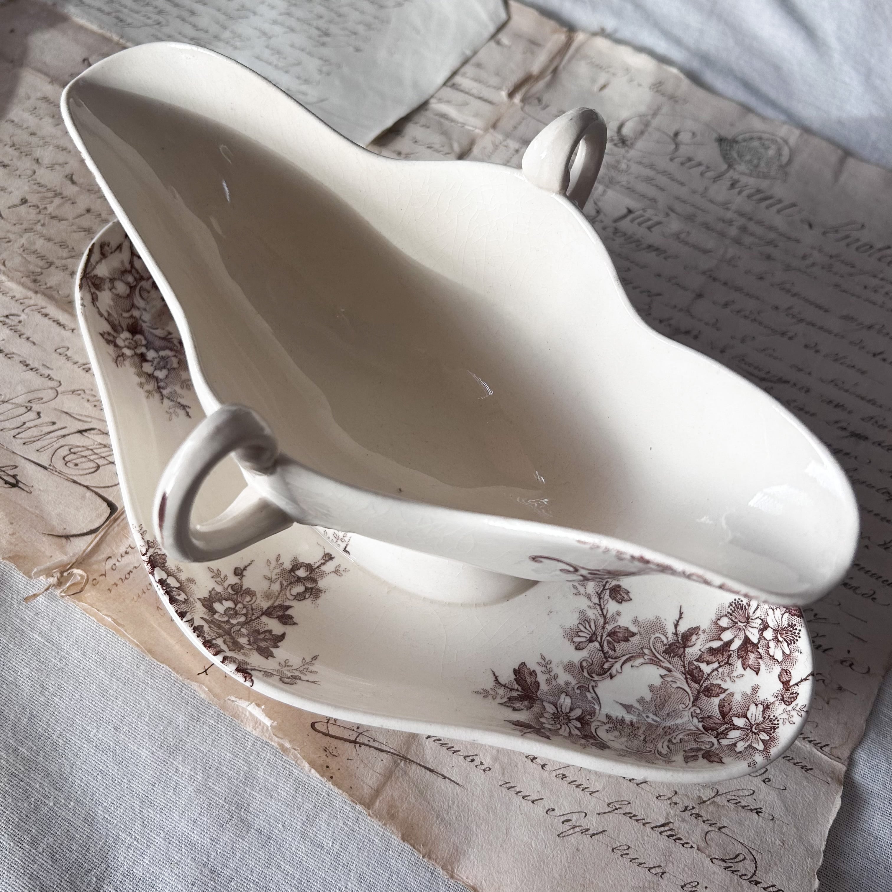 ブラウンのトランスファープリントで小花や蔓が繊細に描かれ、全体に優雅で落ち着いた印象を与えます。流れるようなフォルムと両サイドのハンドルが美しく、テーブル上で華やかな存在感を放ちます。ソースを入れる実用器としてはもちろん、花を活けたりディスプレイにも映えるアンティークです。