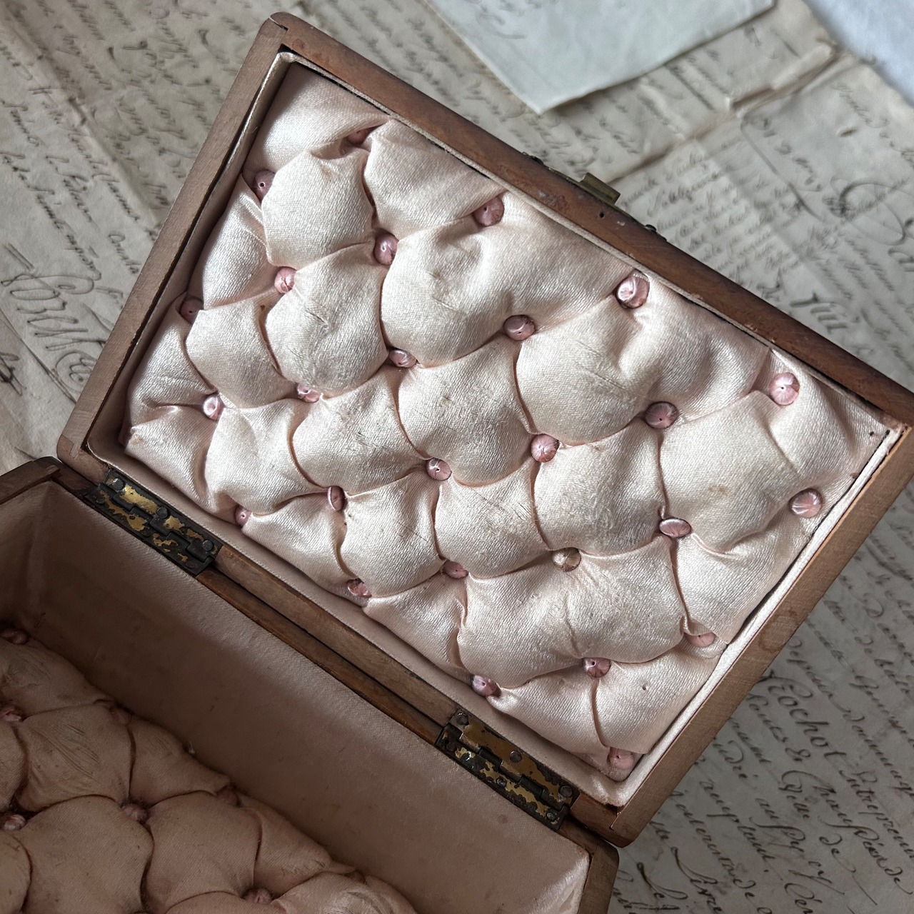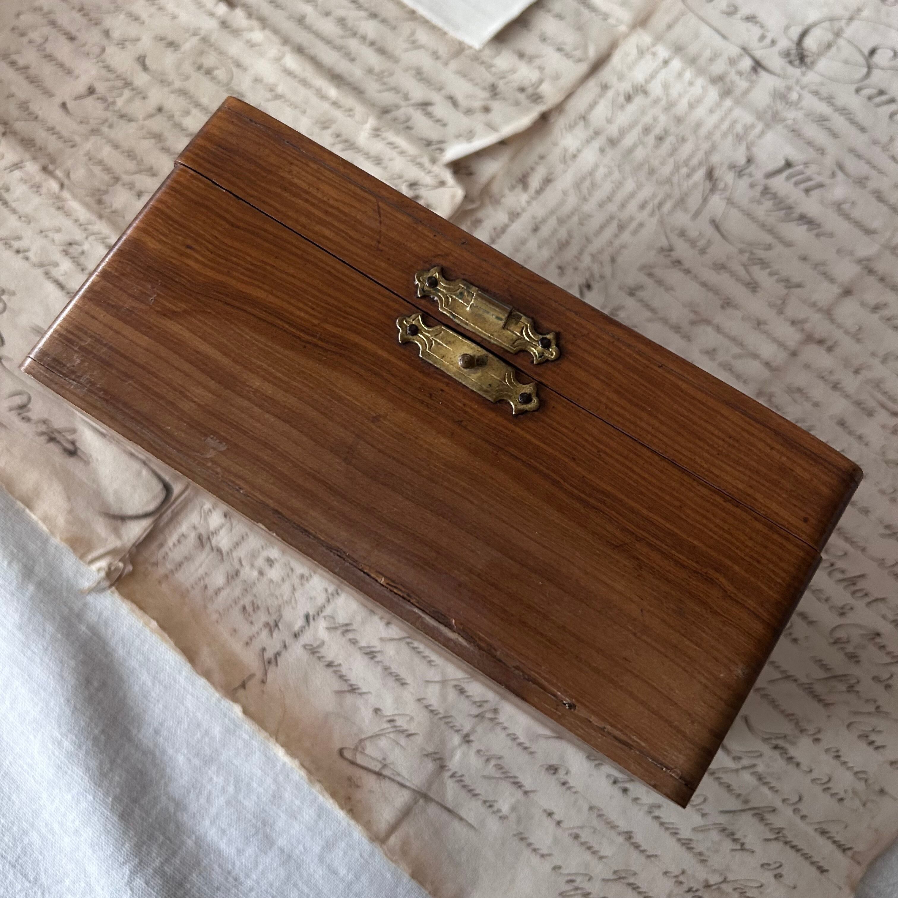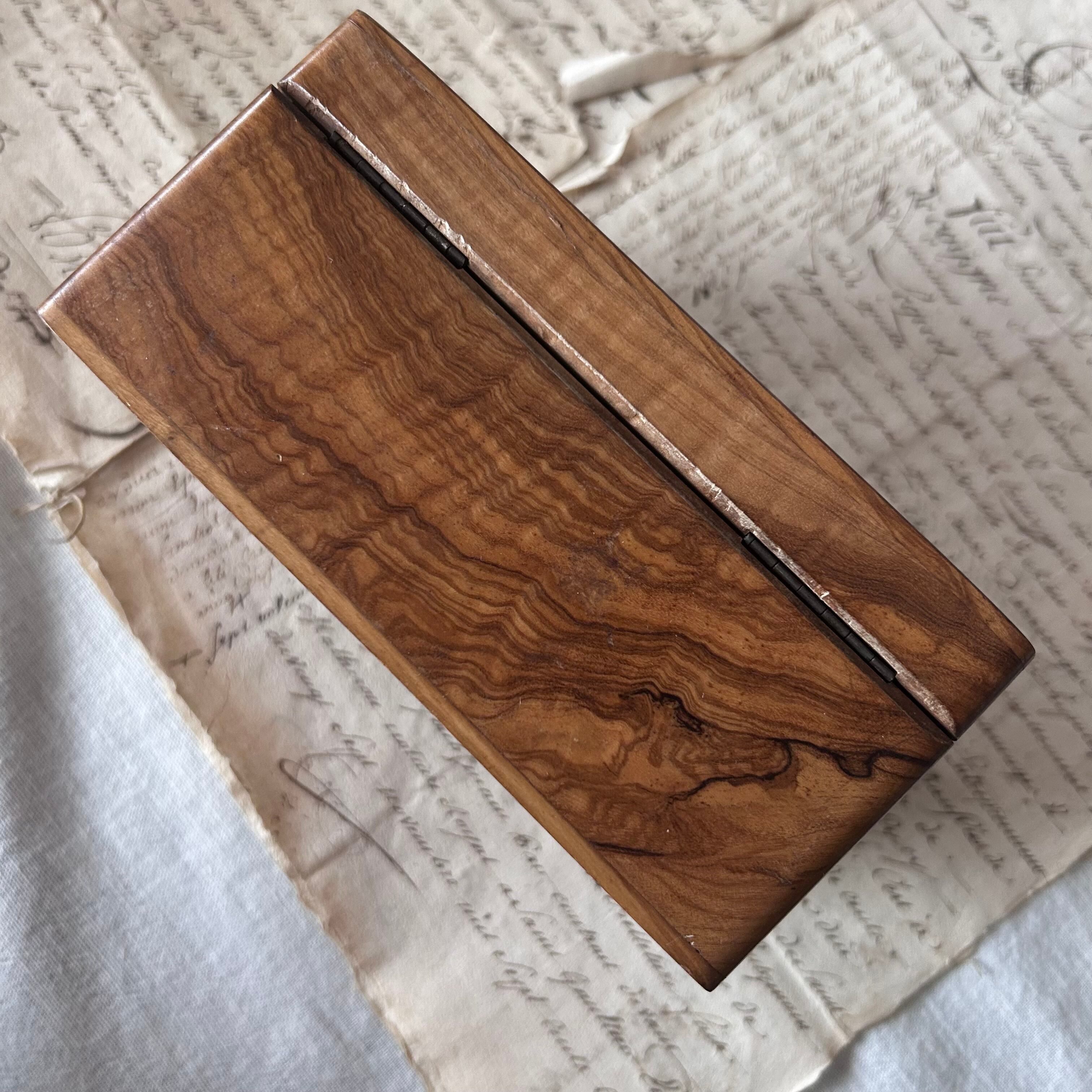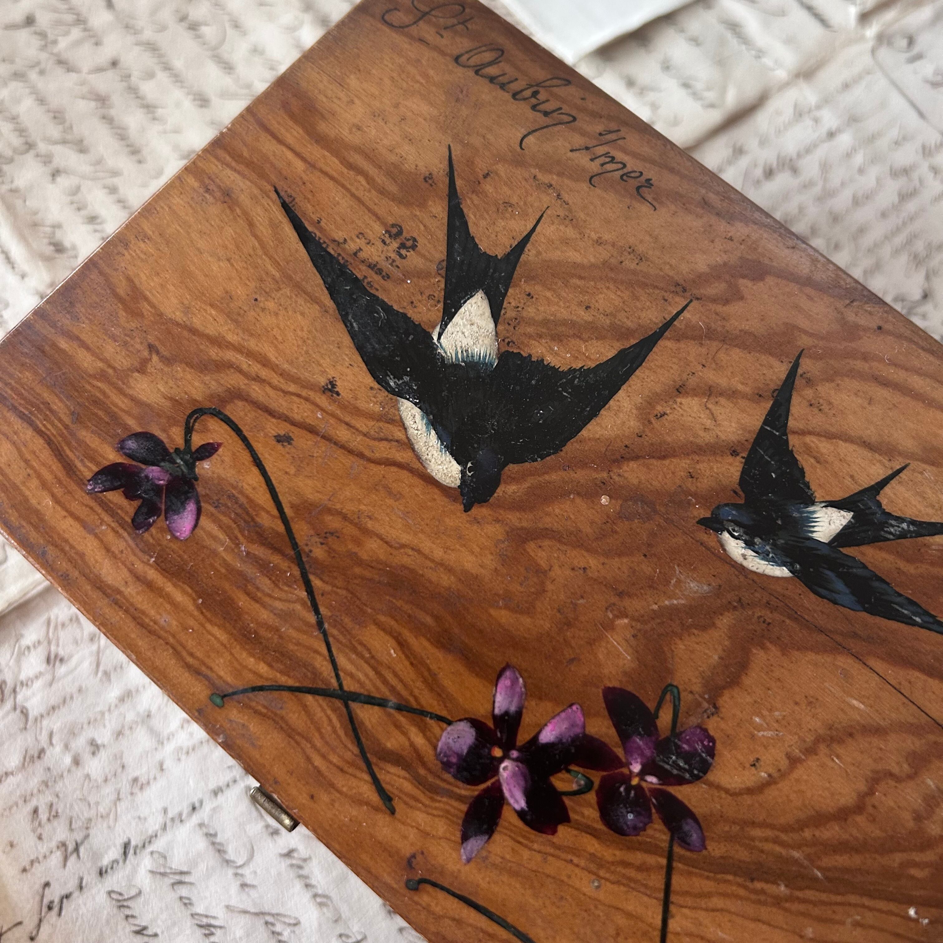 滑らかなオリーブの木肌に、愛らしいツバメとスミレの花が手描きで描かれています。優しい木目と絵付けの調和が美しく、1900年代前半の工芸品らしい繊細さと温かみを感じさせます。内側は淡いピンクのサテンで丁寧に張り込まれており、ジュエリーや手紙を収める小箱としても魅力的です。