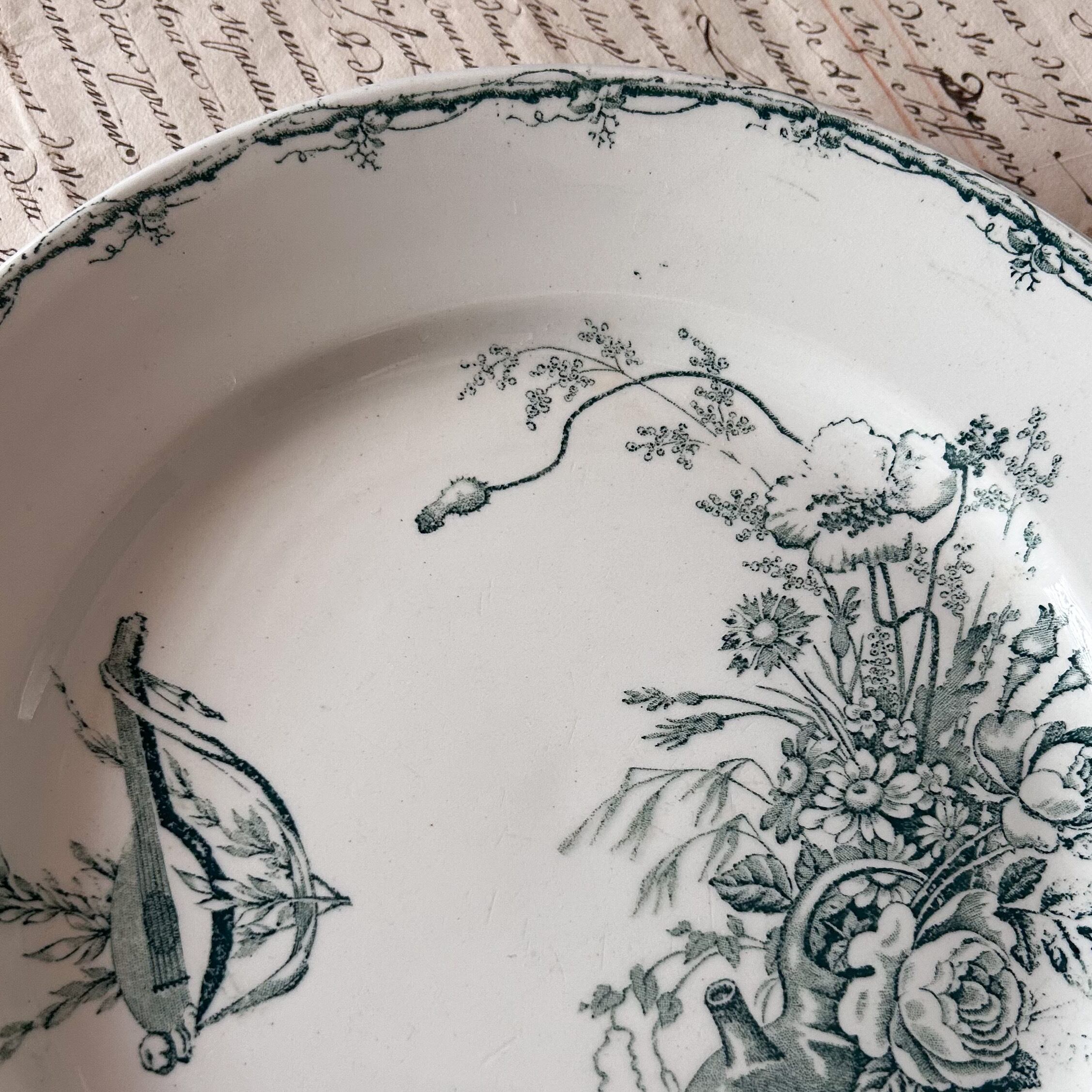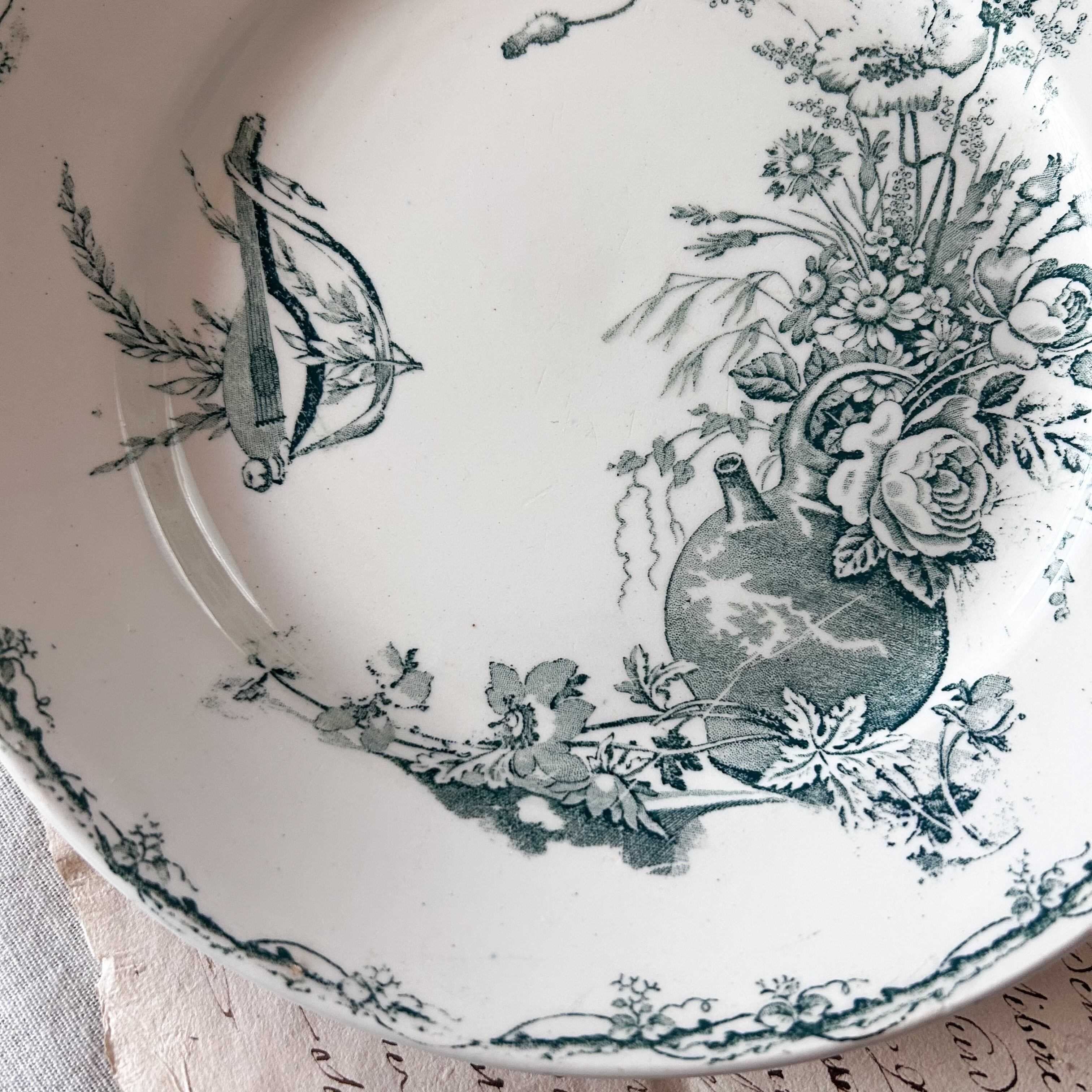 淡いグリーンで描かれた花瓶と楽器のモチーフが目を引く、リュネヴィル製のアンティークプレート。絵画のように細密で落ち着いた構図は、クラシカルな佇まいの中にどこか遊び心も感じさせます。リムには可憐な草花の縁取りが施され、全体に統一感のある上品な仕上がりです。ナチュラルなインテリアやシャビーシックな空間にぴったりの一枚です。