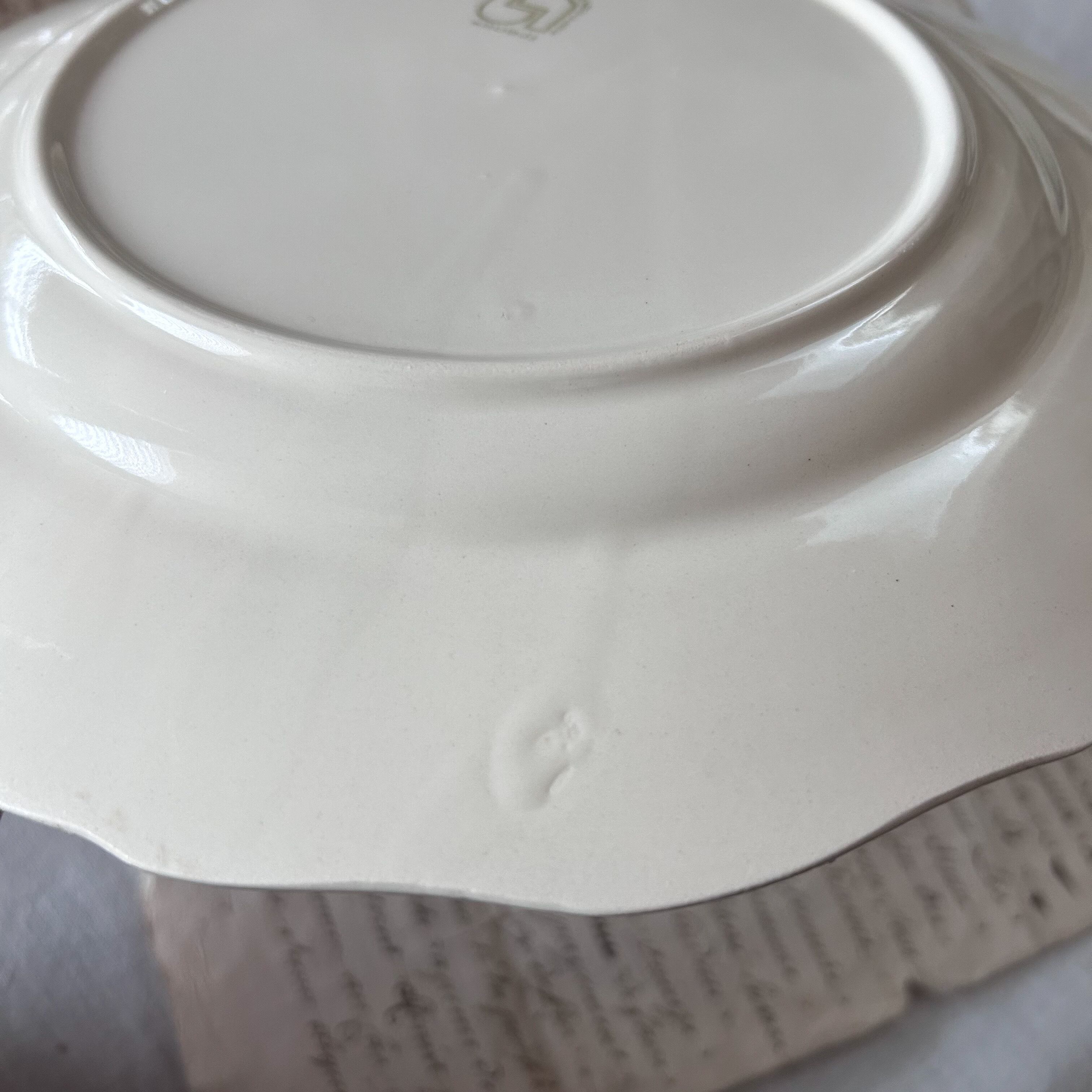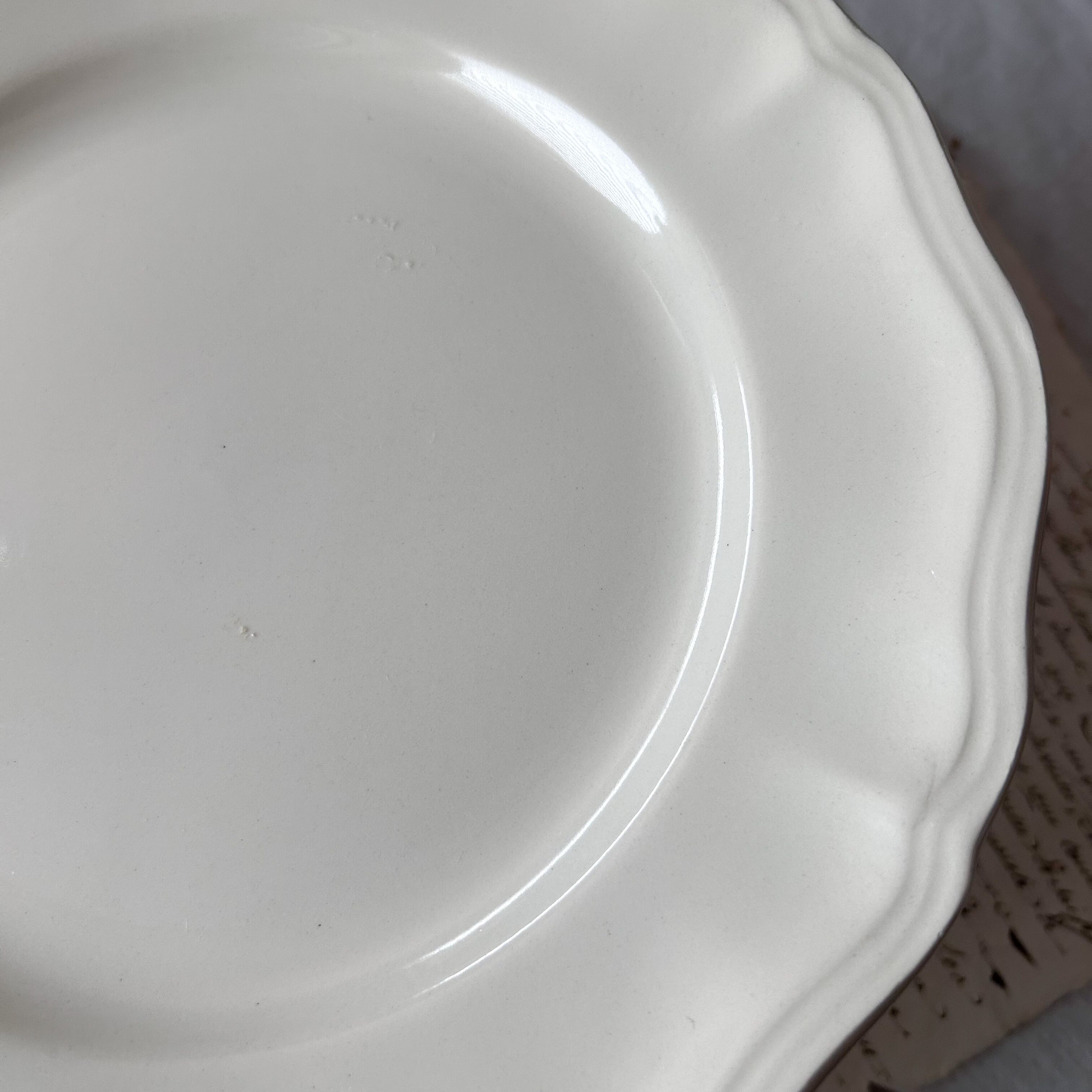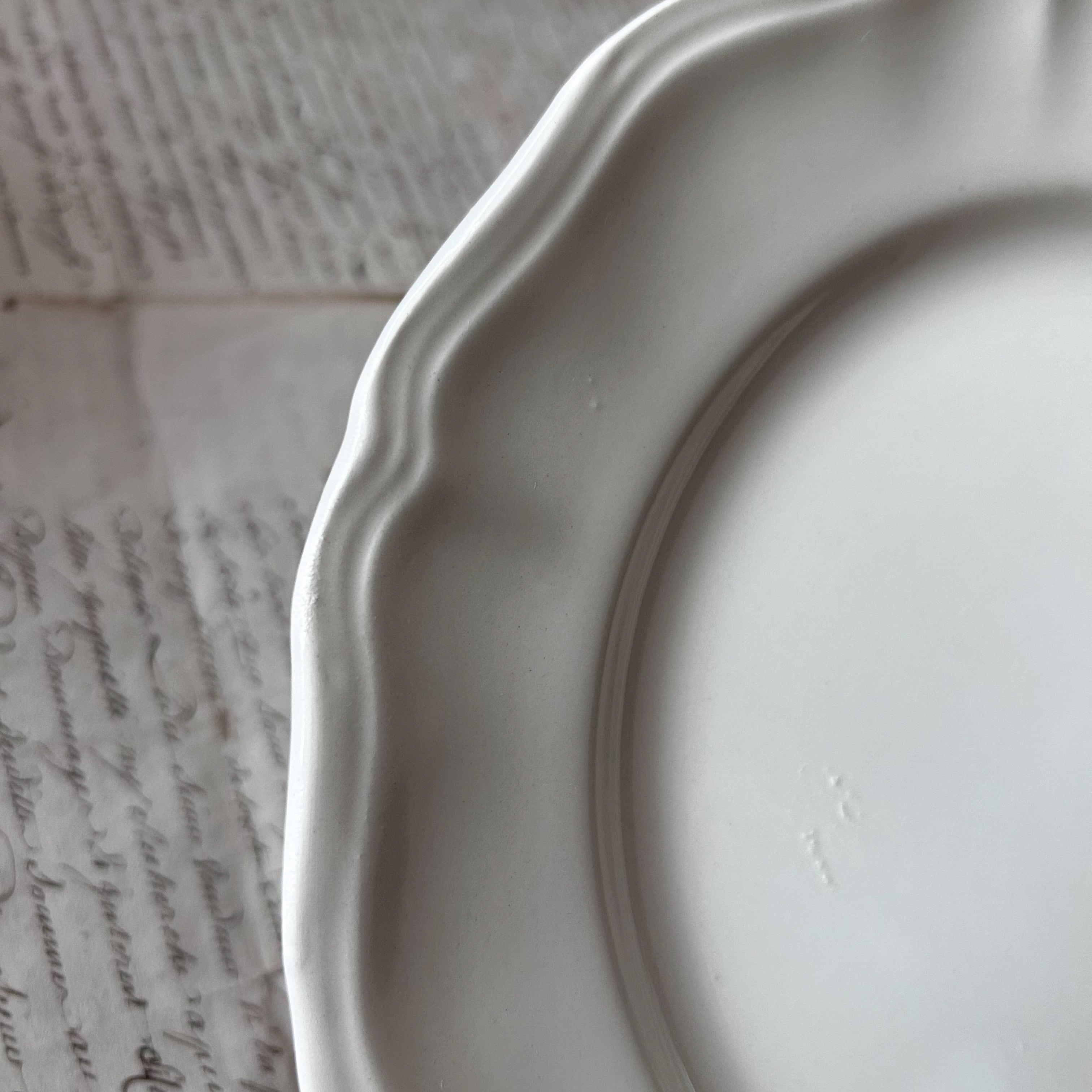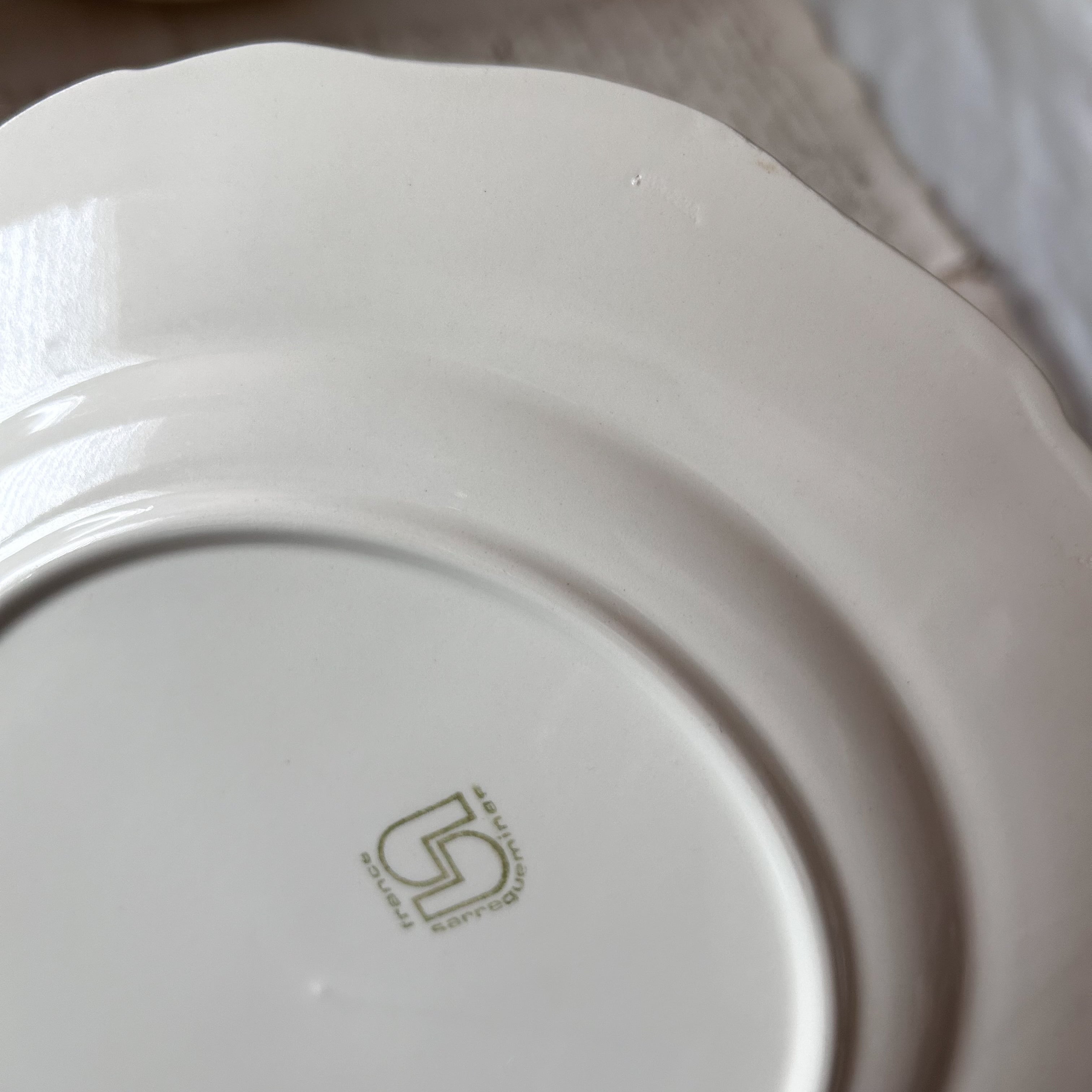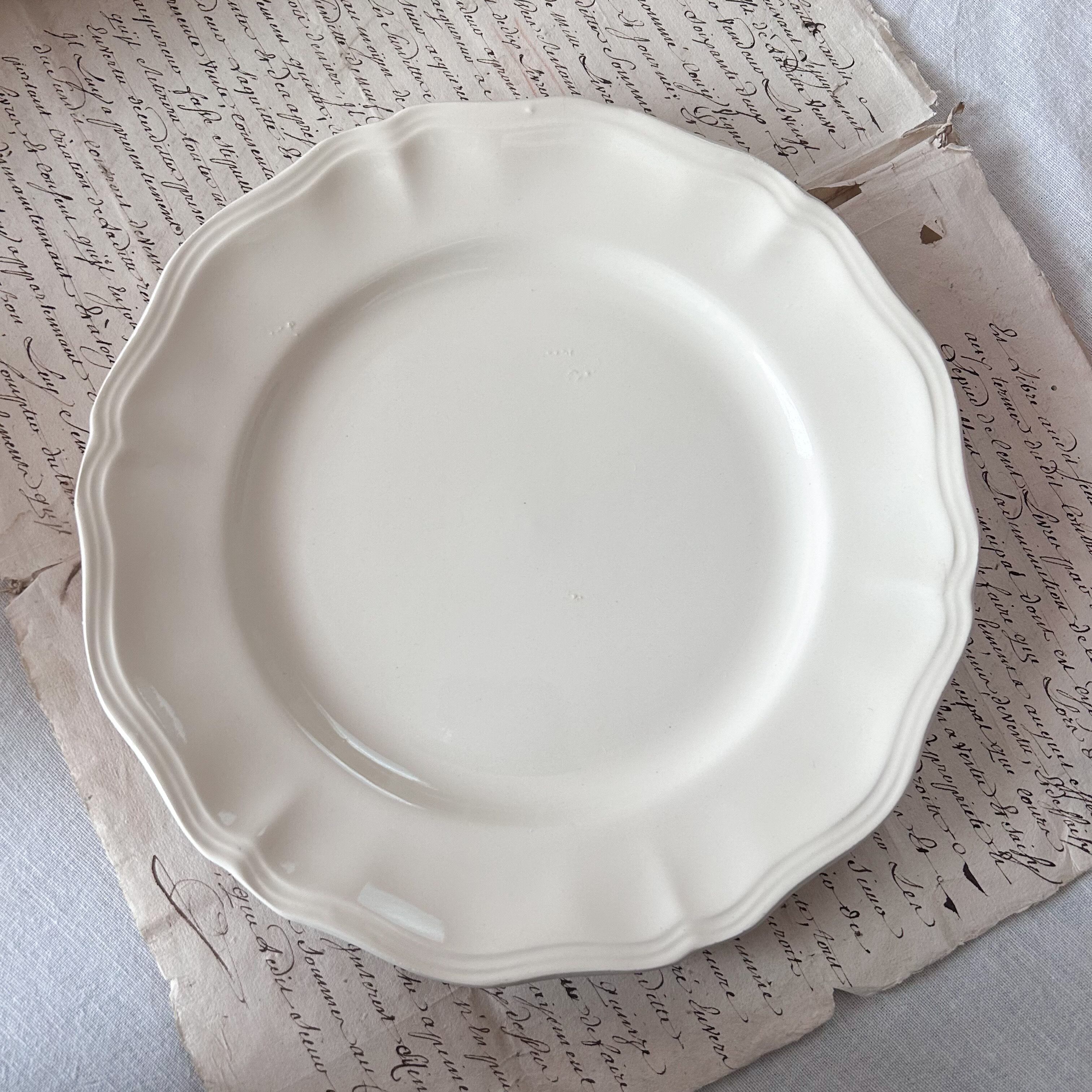 フランス東部の名窯サルグミンヌによる、やわらかなアイボリーカラーの無地の花リムプレートです。縁にスカラップ装飾が施されたシンプルなフォルムは、使い勝手が良く、日常の食卓にも特別なシーンにもよく馴染みます。広い世代に人気のある花リムプレート、状態の良いものはなかなかレアなのでこの機会にどうぞ!