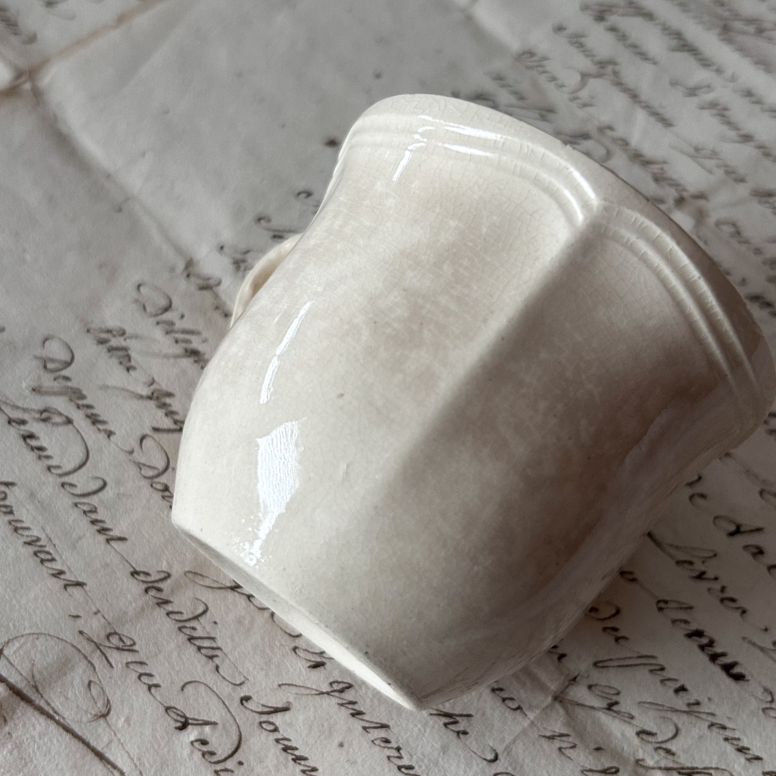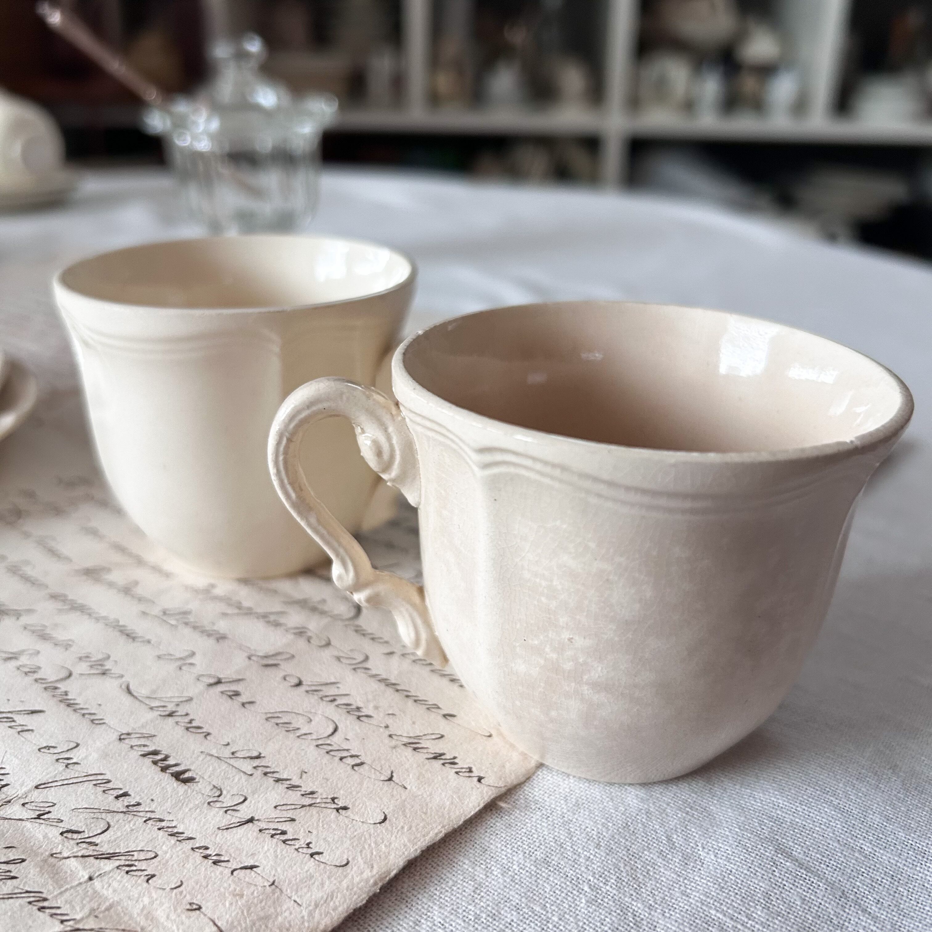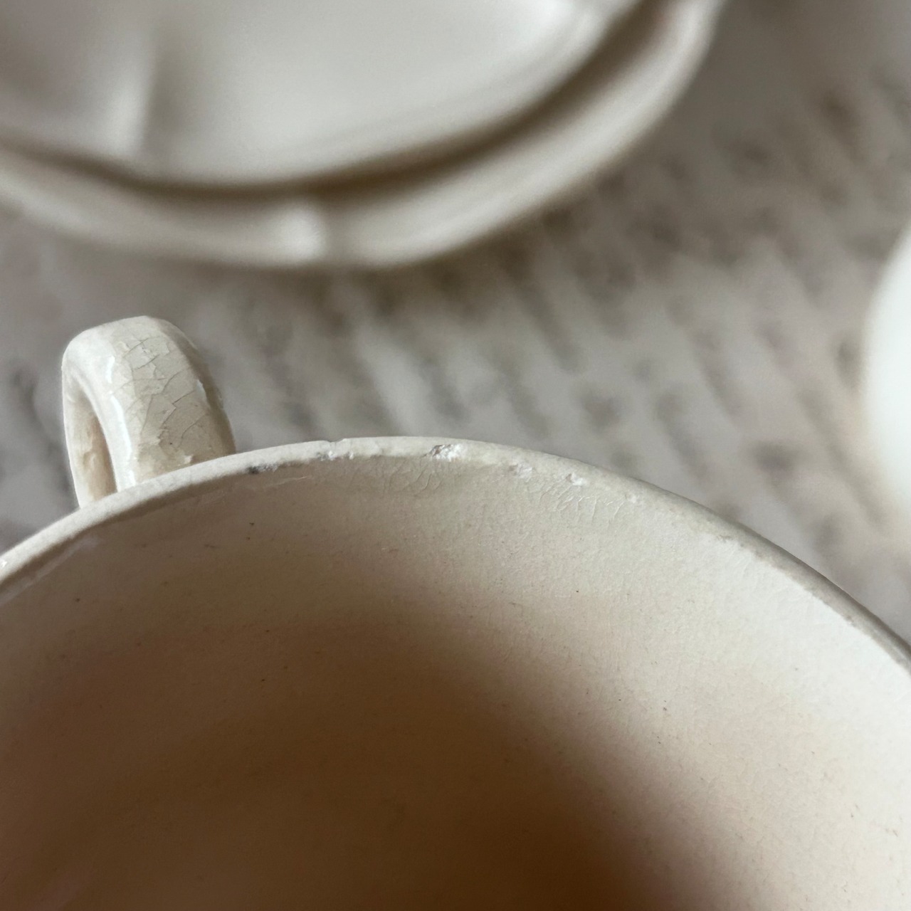 1つのカップのリム極小チップ、全体的に変色あり。もう1つのカップの内部にフリモノ、色づきあり。その他釉薬のムラやフリモノ、ピンホール、経年劣化は見られますが、全体としてつややかなヴィンテージコンディションです。