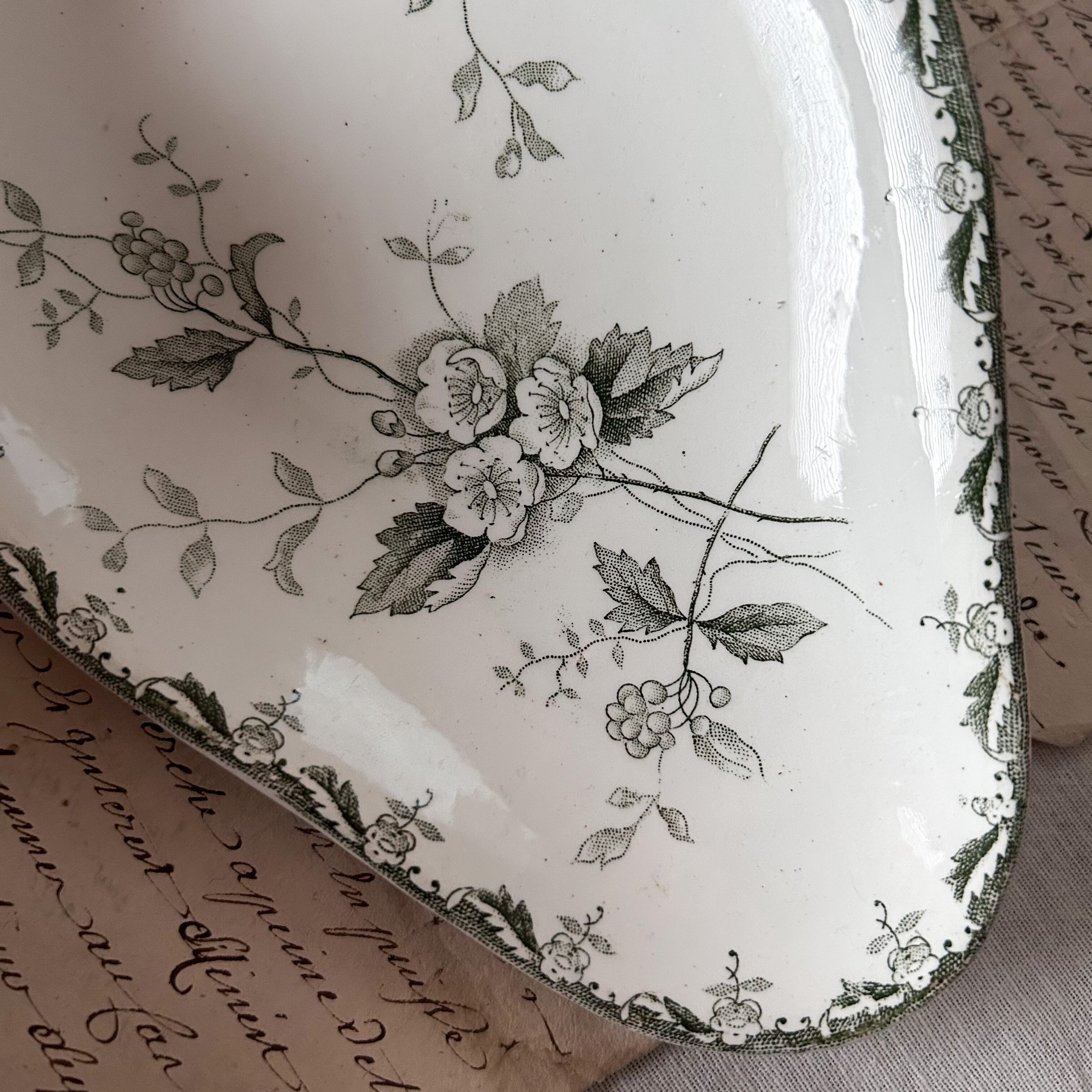 やわらかなグリーンで描かれた可憐な野ばらが、縁を軽やかに彩り、中央にも流麗な枝花を咲かせています。繊細で上品なボタニカル装飾は、アール・ヌーヴォーを思わせる優雅な佇まいを漂わせ、食卓に穏やかな華やぎを添えます。前菜、スイーツ、フルーツなどに最適なサイズ感です。