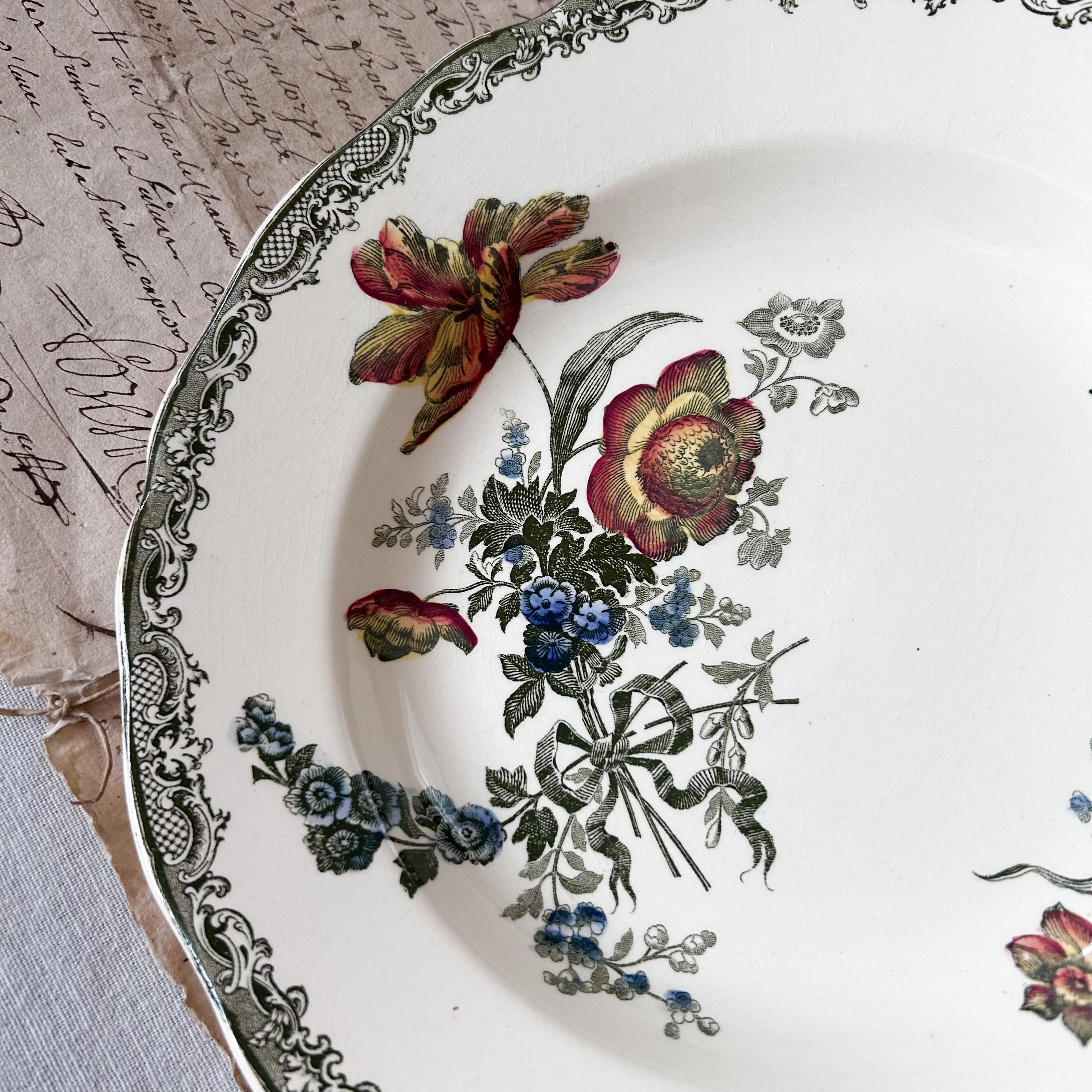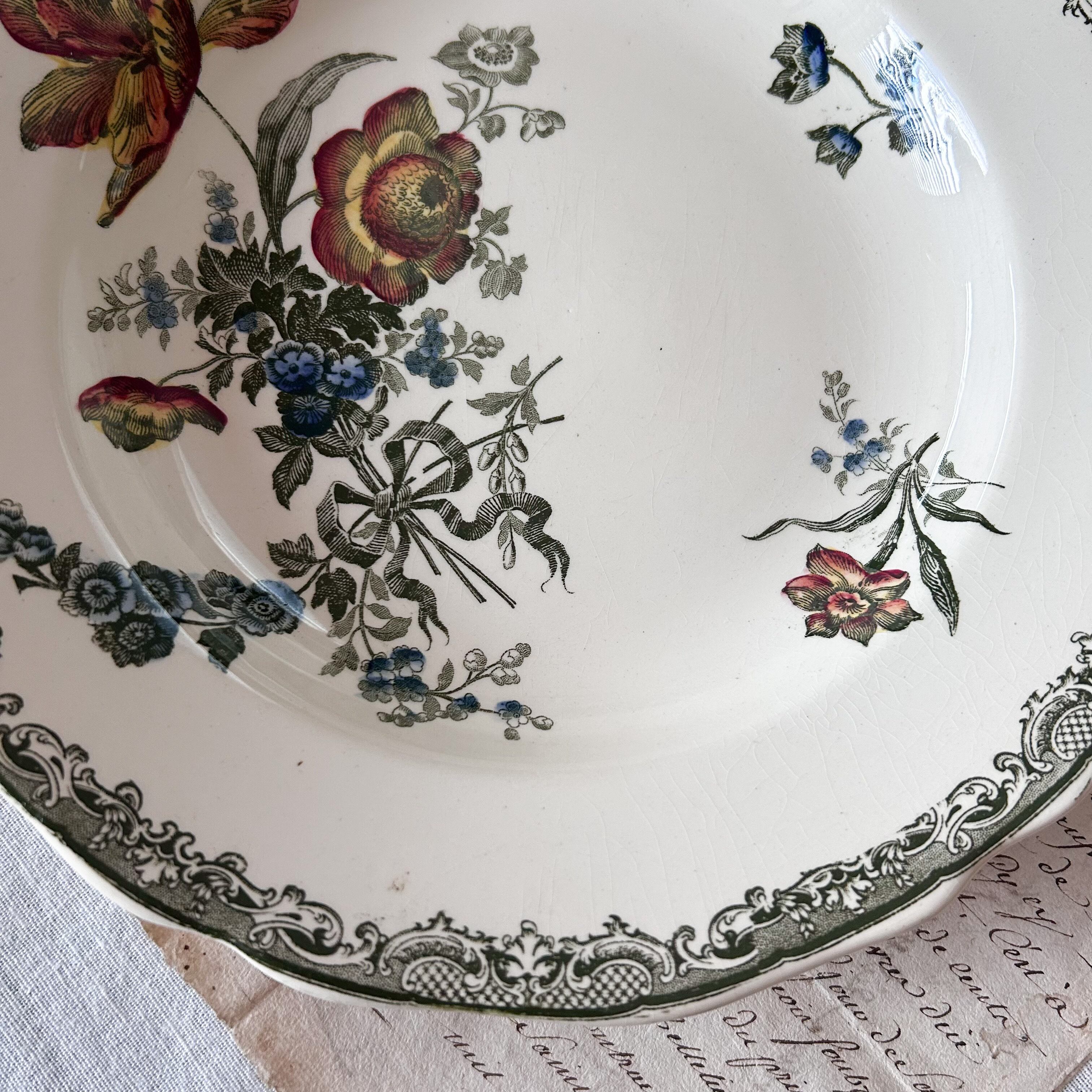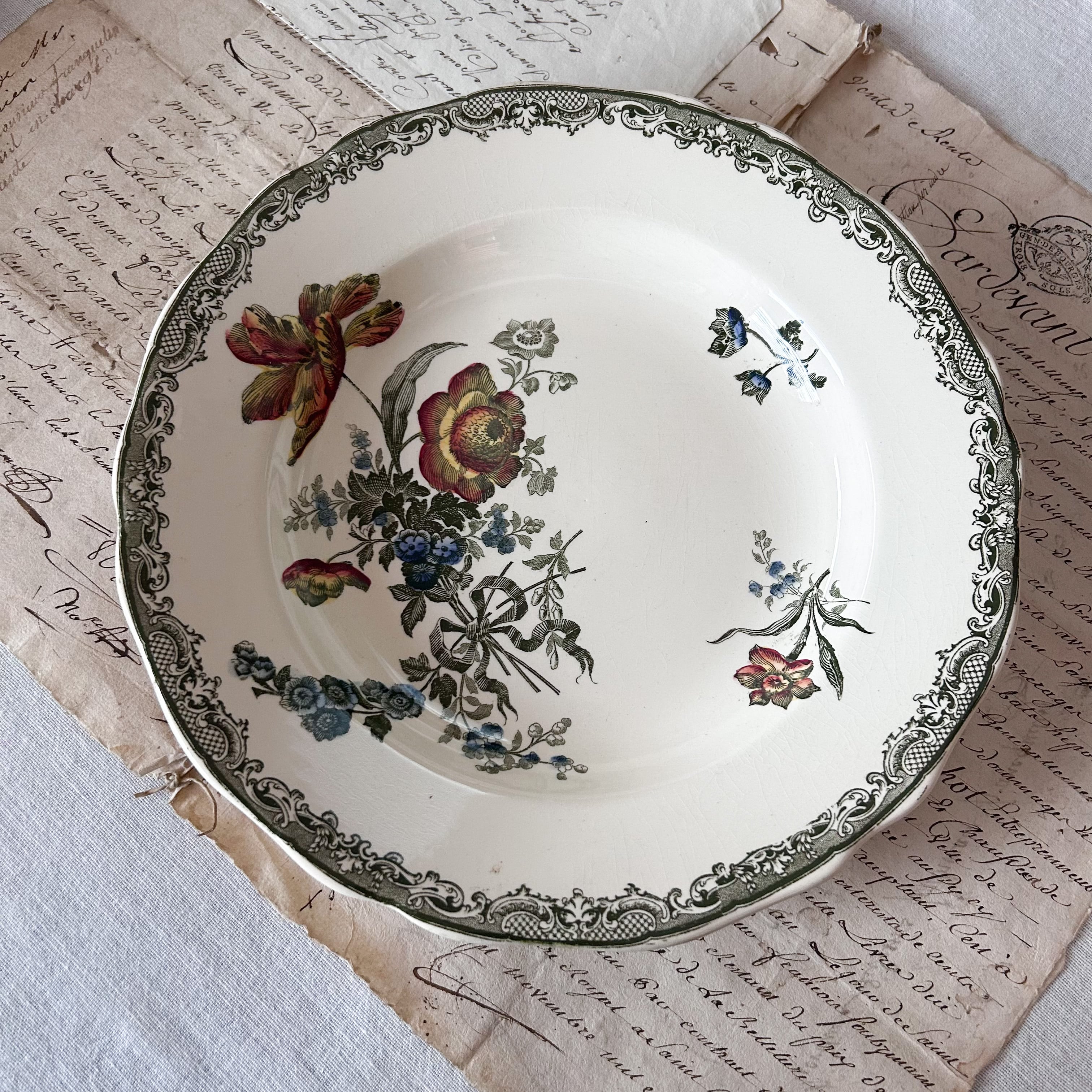淡いグリーンの繊細な縁飾りに、鮮やかな花々を多色刷りであしらった華やかな一枚です。朱赤や黄色、青の花がバランスよく配置され、リボンの装飾がロマンティックな雰囲気を添えています。サルグミンヌらしい柔らかな陶肌に、彩り豊かな花々が生き生きと映える、優雅で存在感あるかなりレアな深皿です。スープやパスタ、盛皿として特別な日に使いたいお品です。