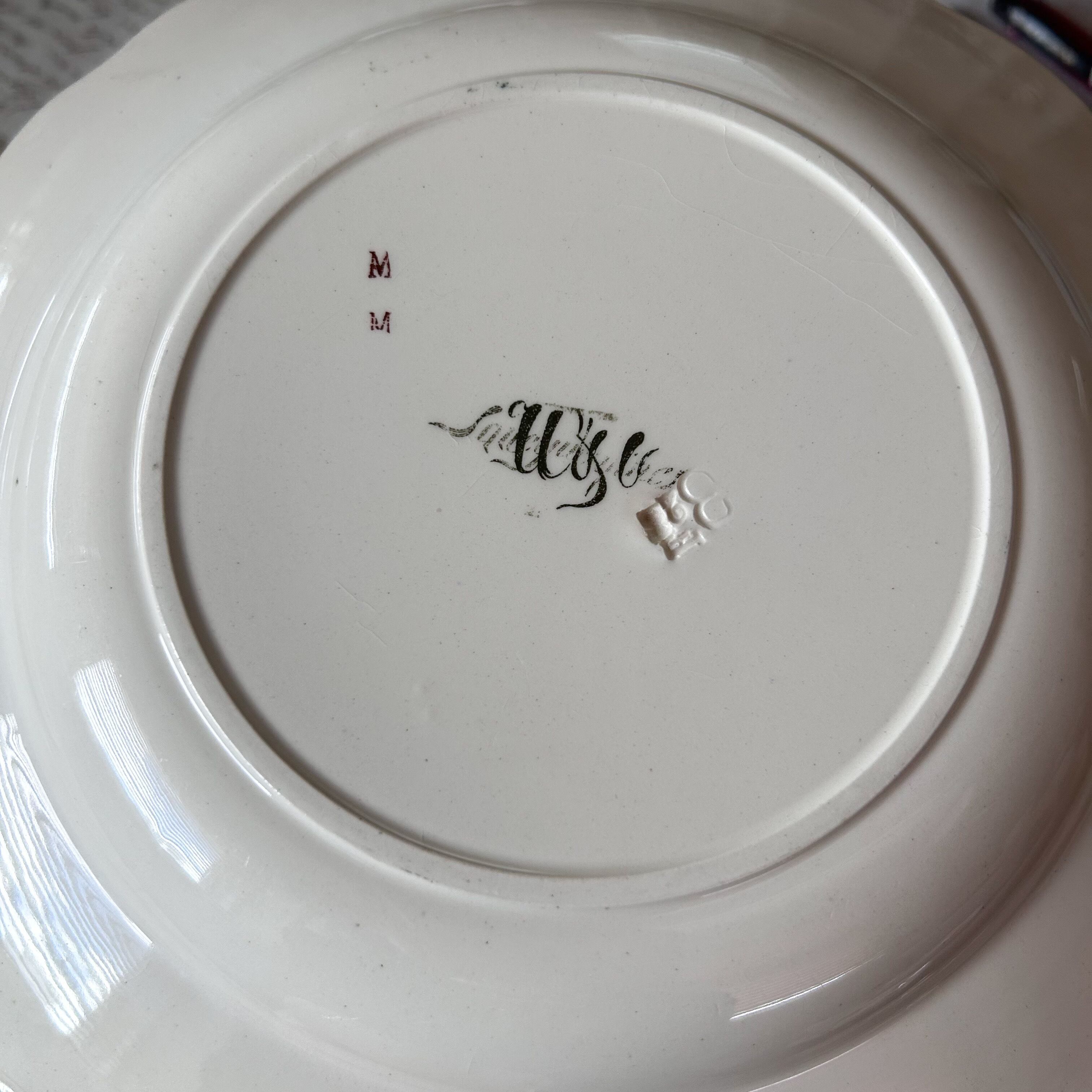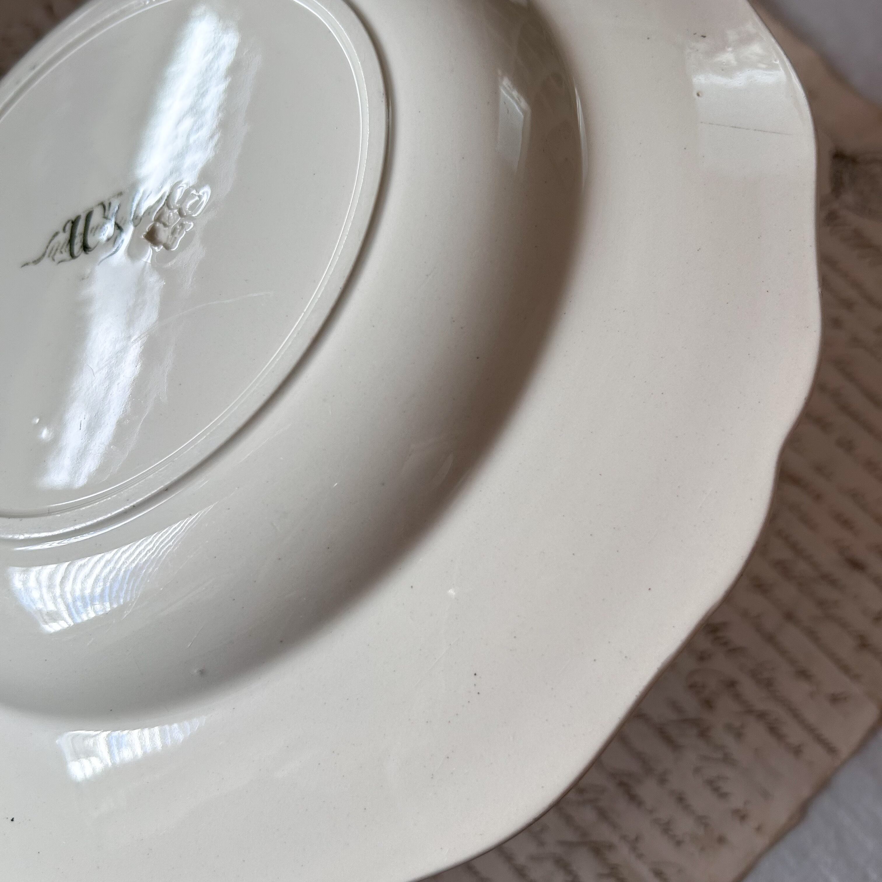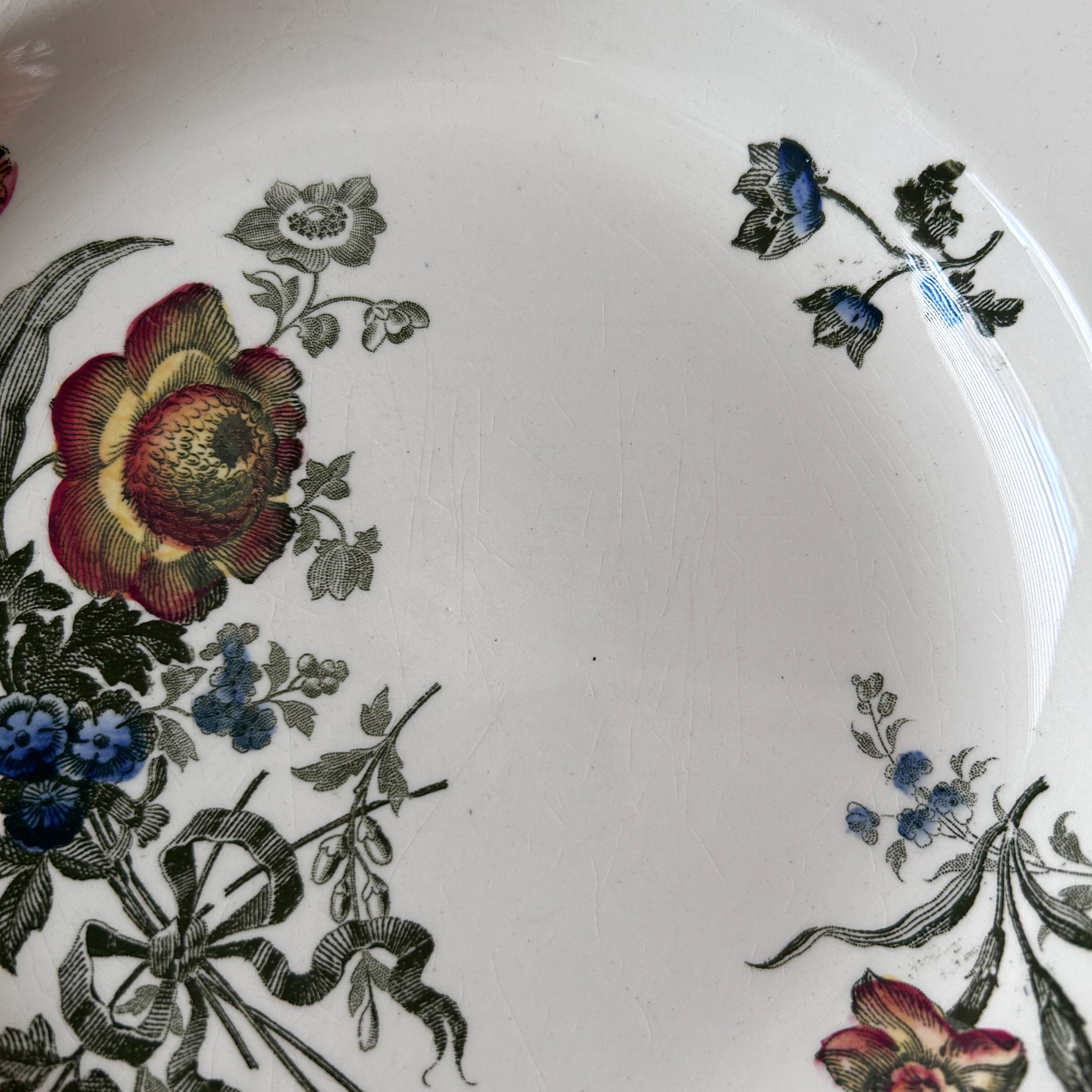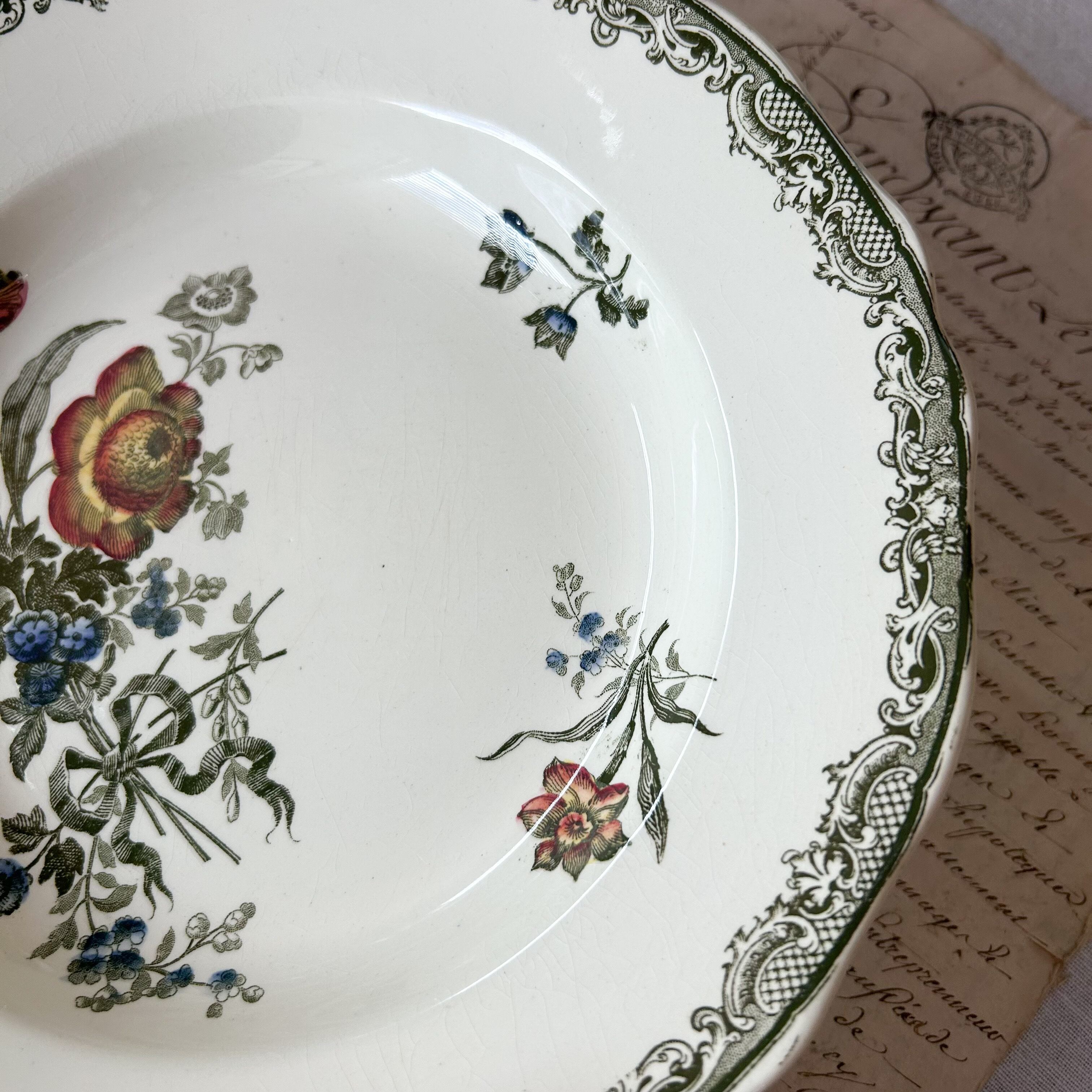 淡いグリーンの繊細な縁飾りに、鮮やかな花々を多色刷りであしらった華やかな一枚です。朱赤や黄色、青の花がバランスよく配置され、リボンの装飾がロマンティックな雰囲気を添えています。サルグミンヌらしい柔らかな陶肌に、彩り豊かな花々が生き生きと映える、優雅で存在感あるかなりレアな深皿です。スープやパスタ、盛皿として特別な日に使いたいお品です。