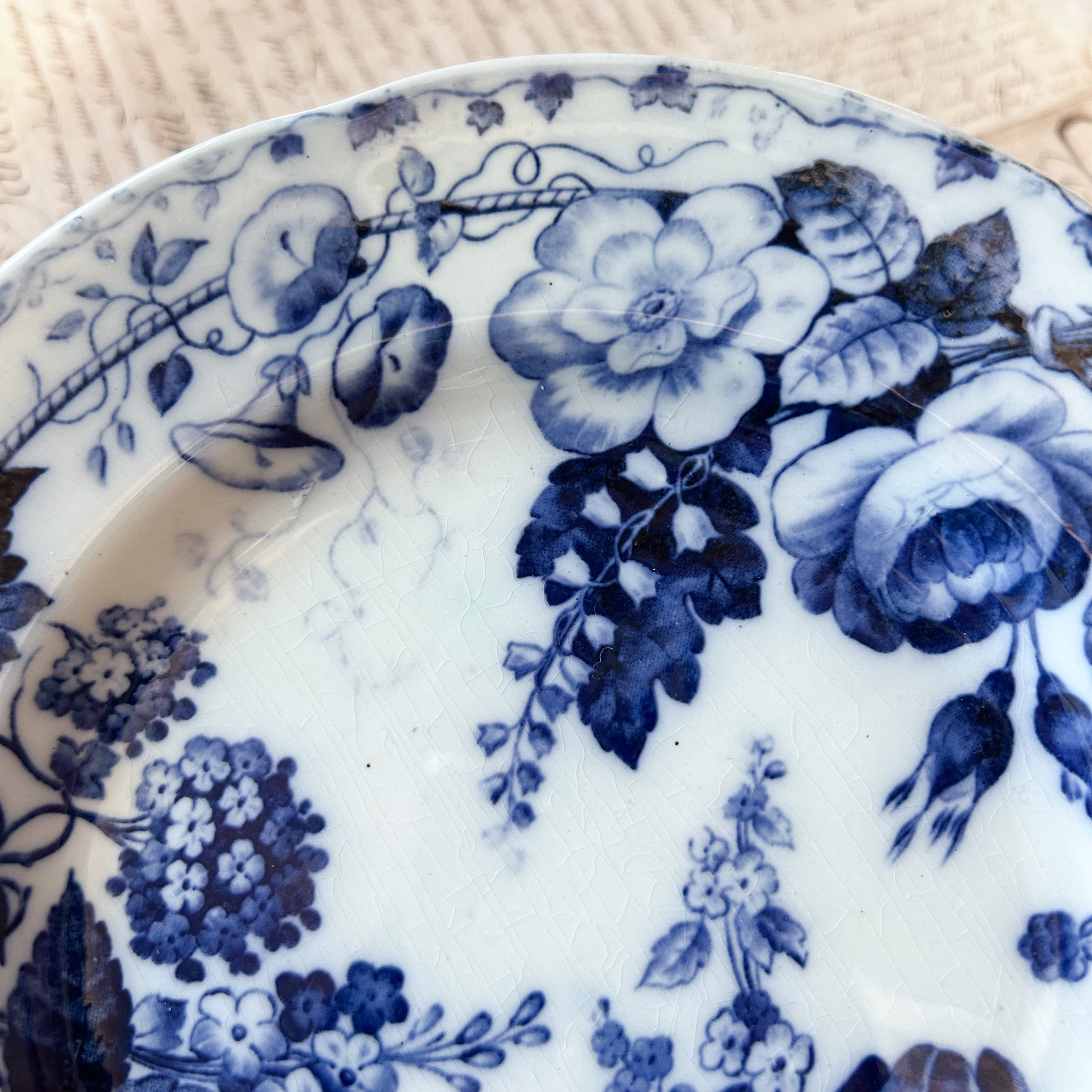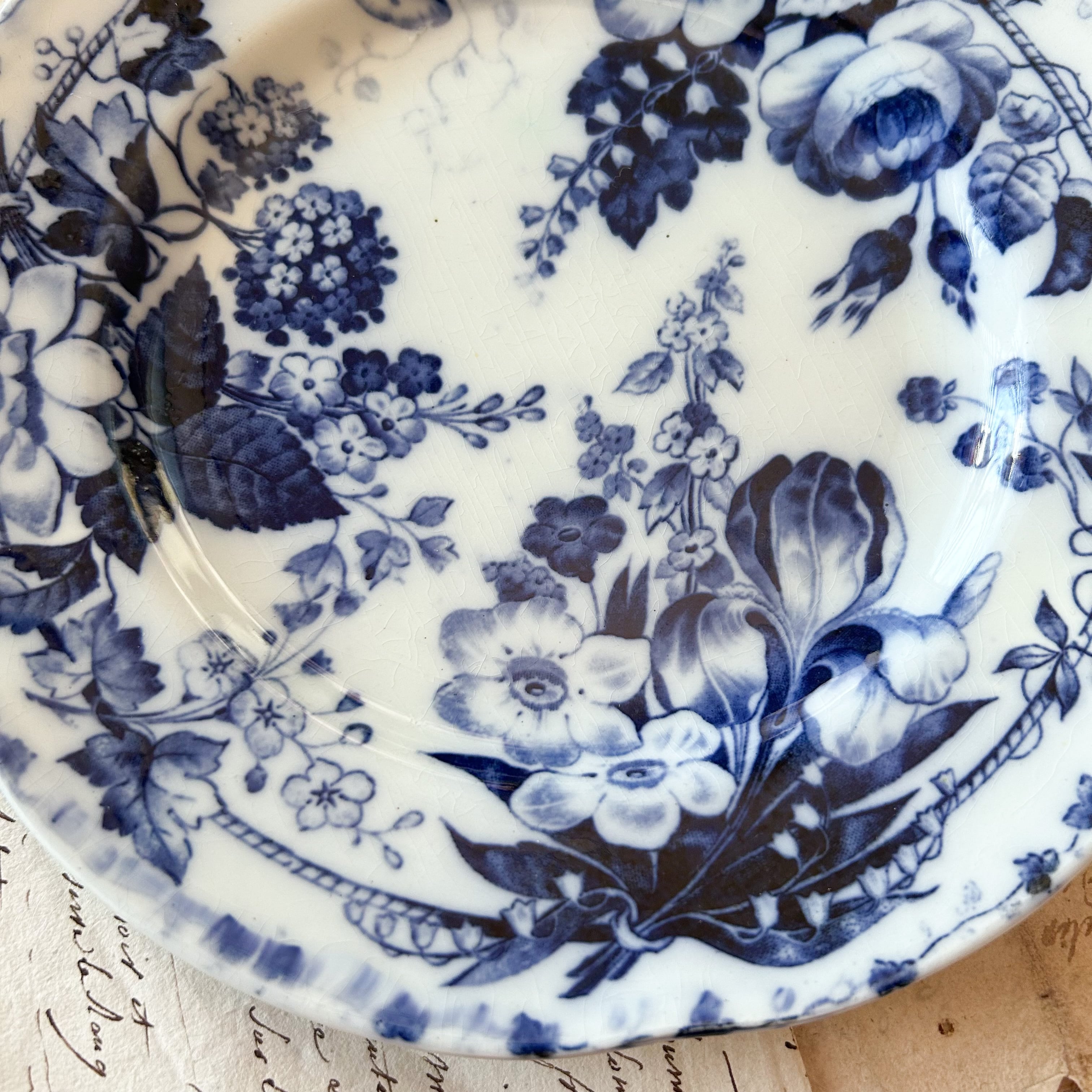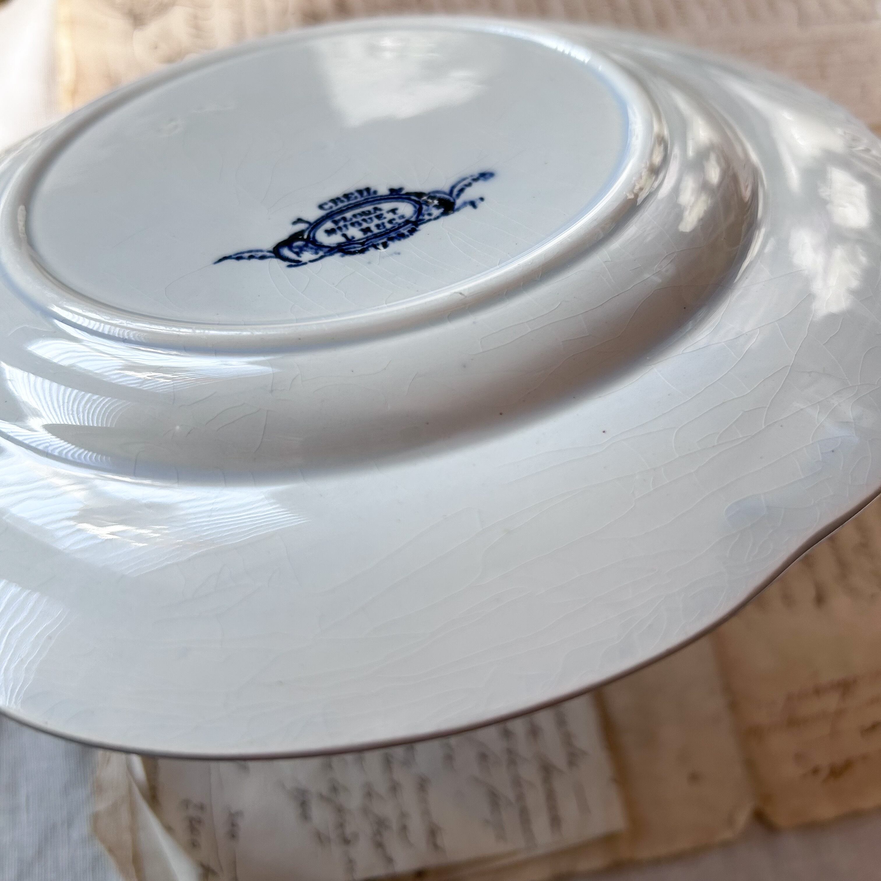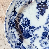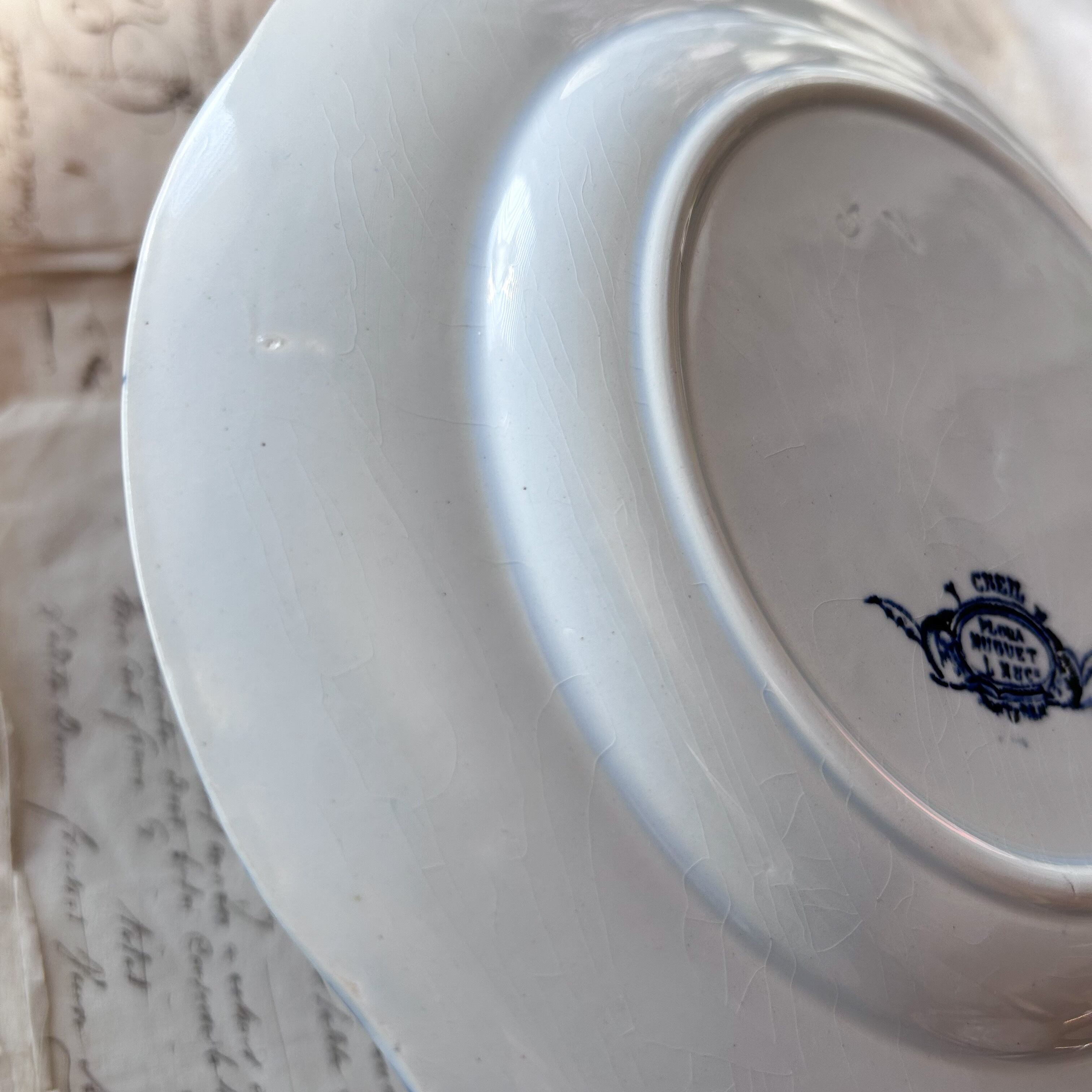 深みのあるブルーでミュゲなどの花々が描かれた、クレイユ・エ・モントローの“FLORA”シリーズのプレートです。精密な転写技法により表現されたボタニカルモチーフは、19世紀フランスの自然主義的美意識を感じさせます。柔らかな白色の陶肌にブルーの発色が映え、テーブルに優雅な陰影を添えてくれます。ディスプレイとして飾っても美しく、古いリネンや銀器、また和食器との相性も抜群です。