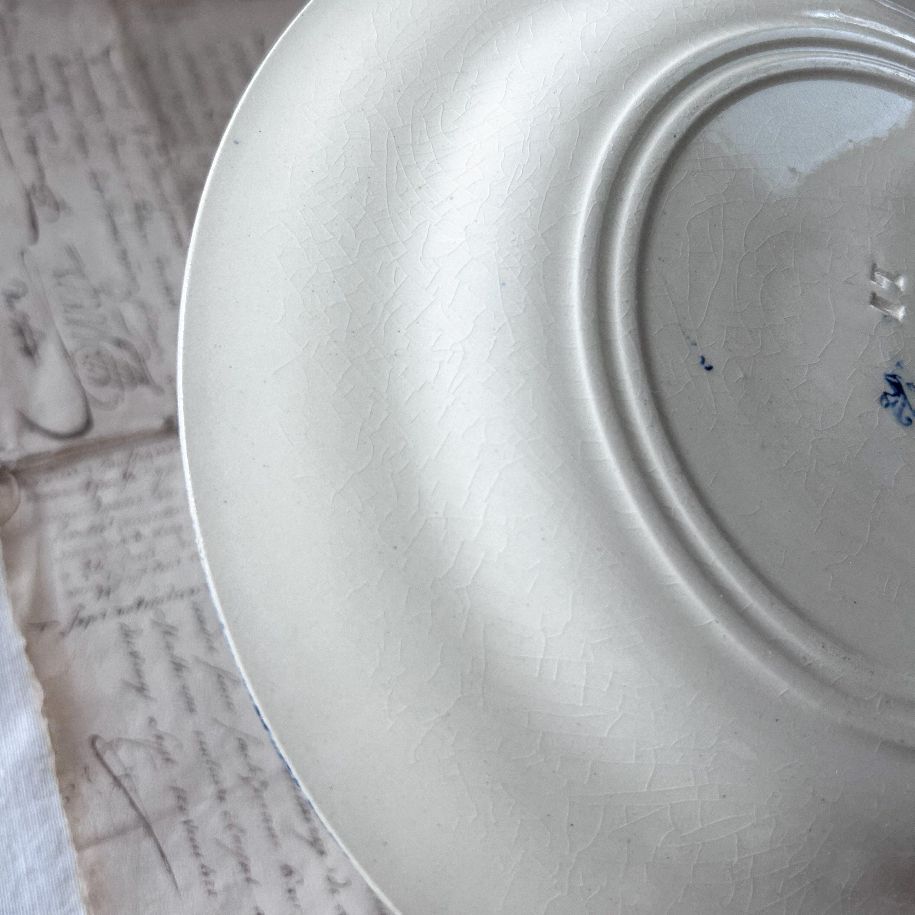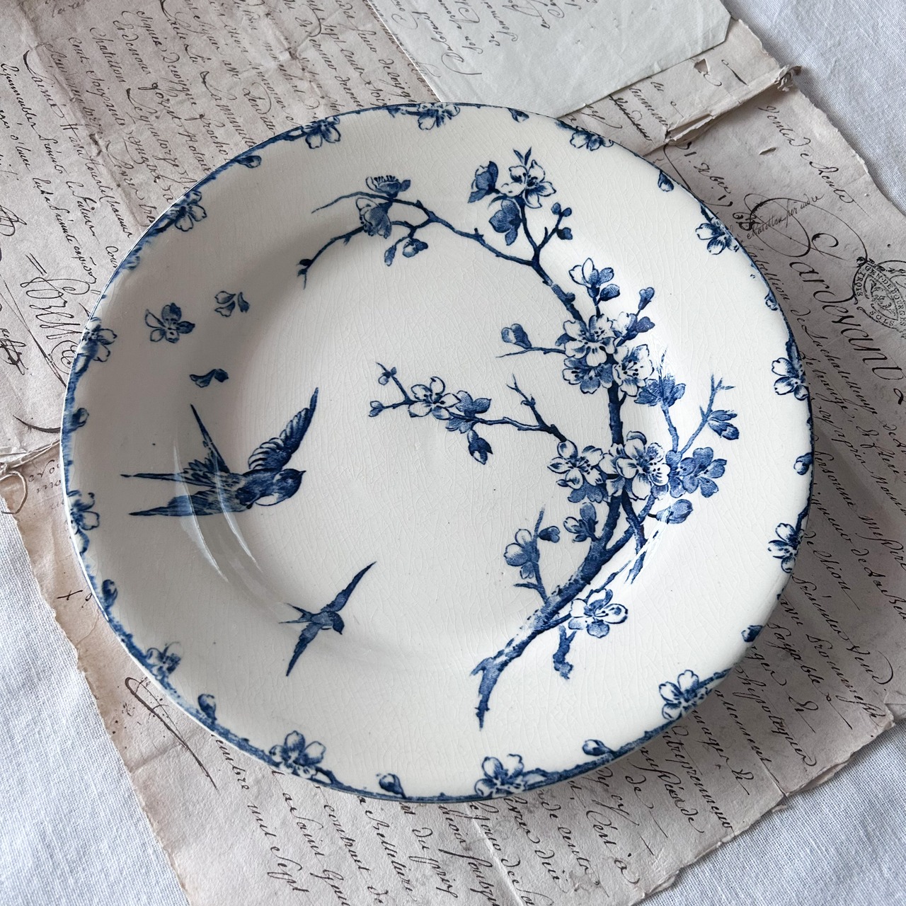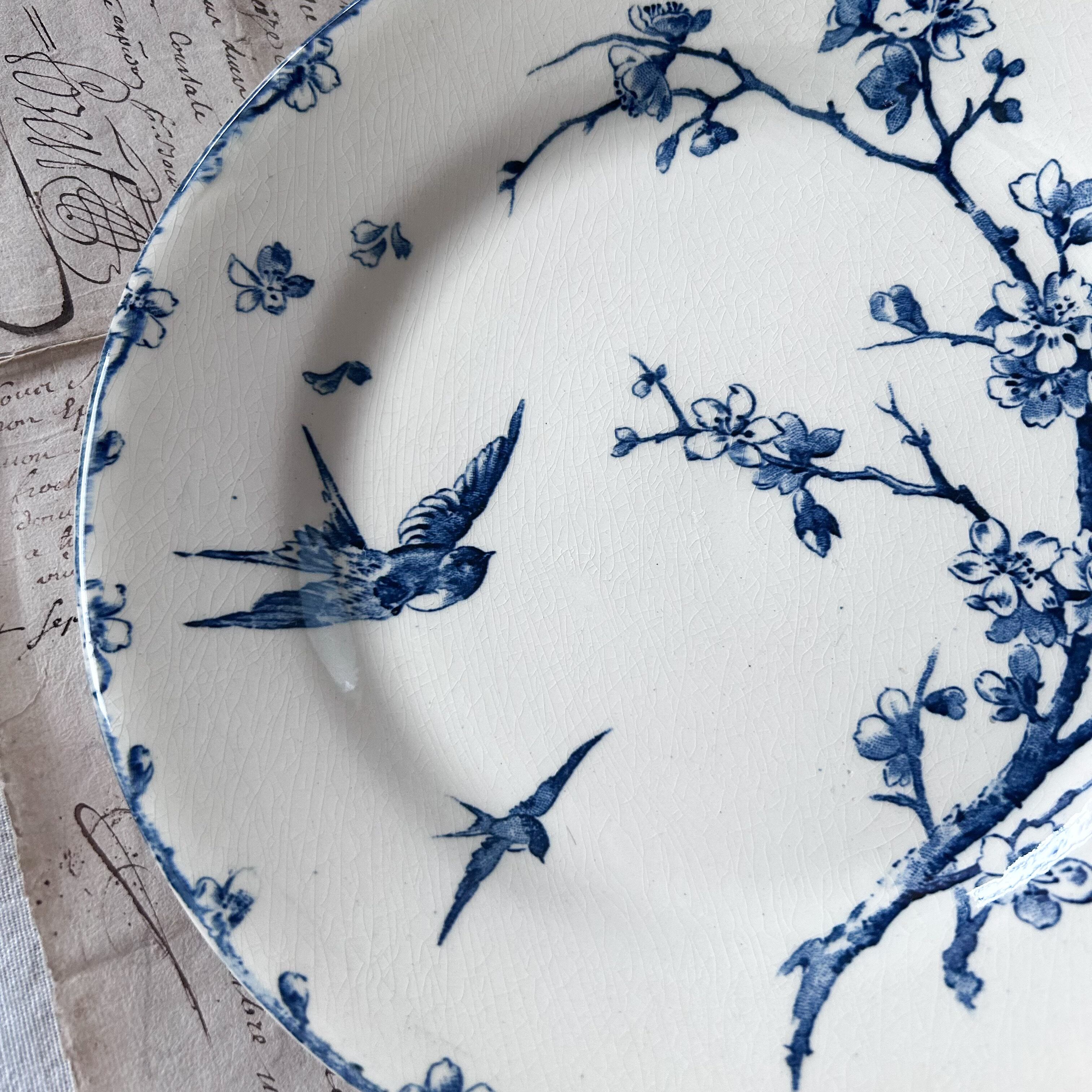 やわらかな白地に濃紺のツバメと桜花(と思われる)が軽やかに描かれた、ジアンのジャポニスム様式を色濃く感じる美しいプレートです。飛び交うツバメの伸びやかな姿と、枝に咲く可憐な花々がバランスよく配され、19世紀末〜20世紀初頭のフランス陶器らしい上品さと詩情が漂います。縁を囲む小花のモチーフが柔らかいアクセントとなり、テーブルに置くだけで季節感と優雅さを添えてくれる一枚です。ディスプレイとしても映える存在感があります。