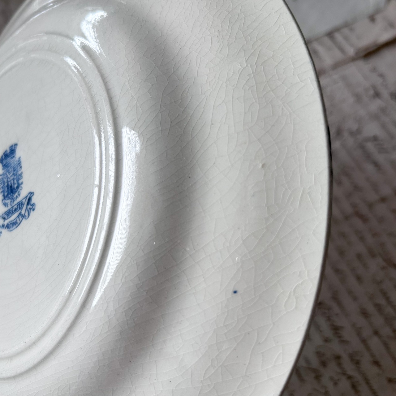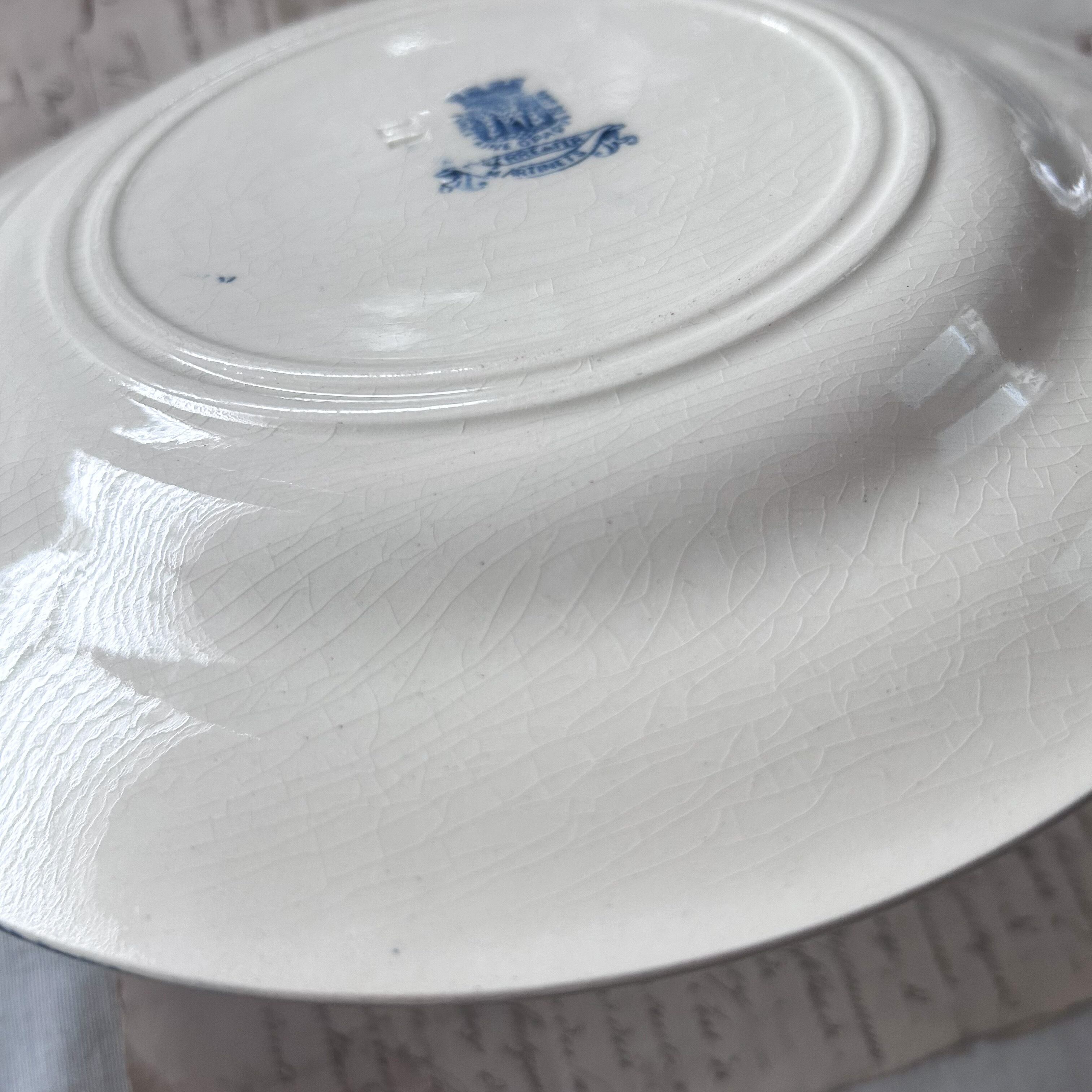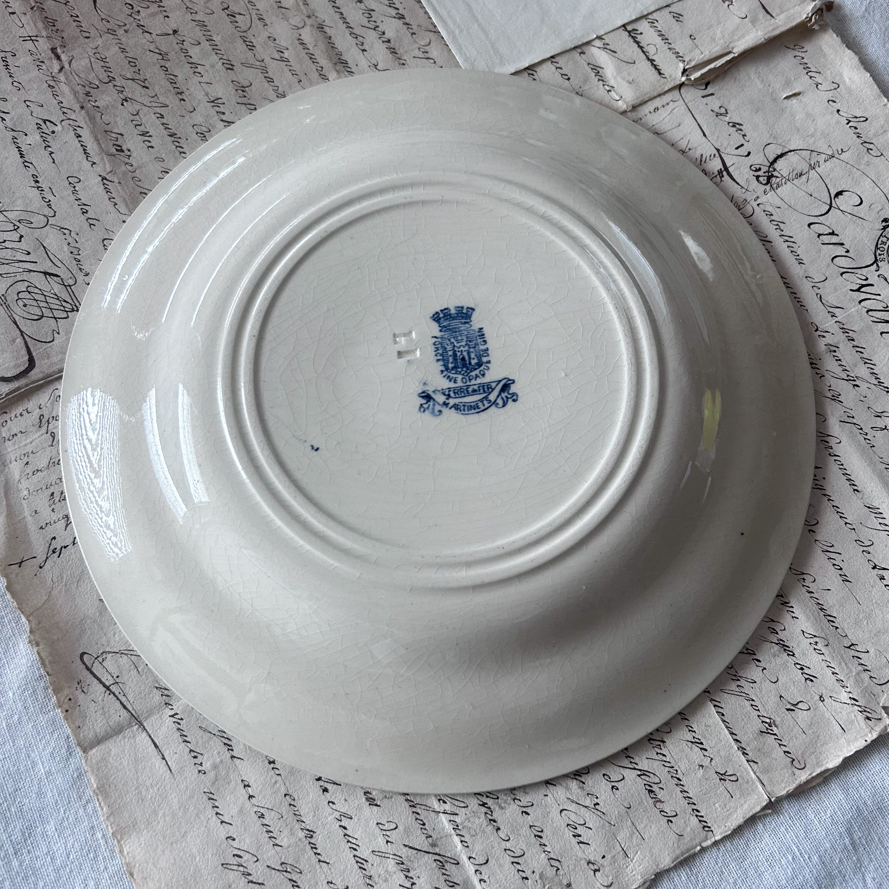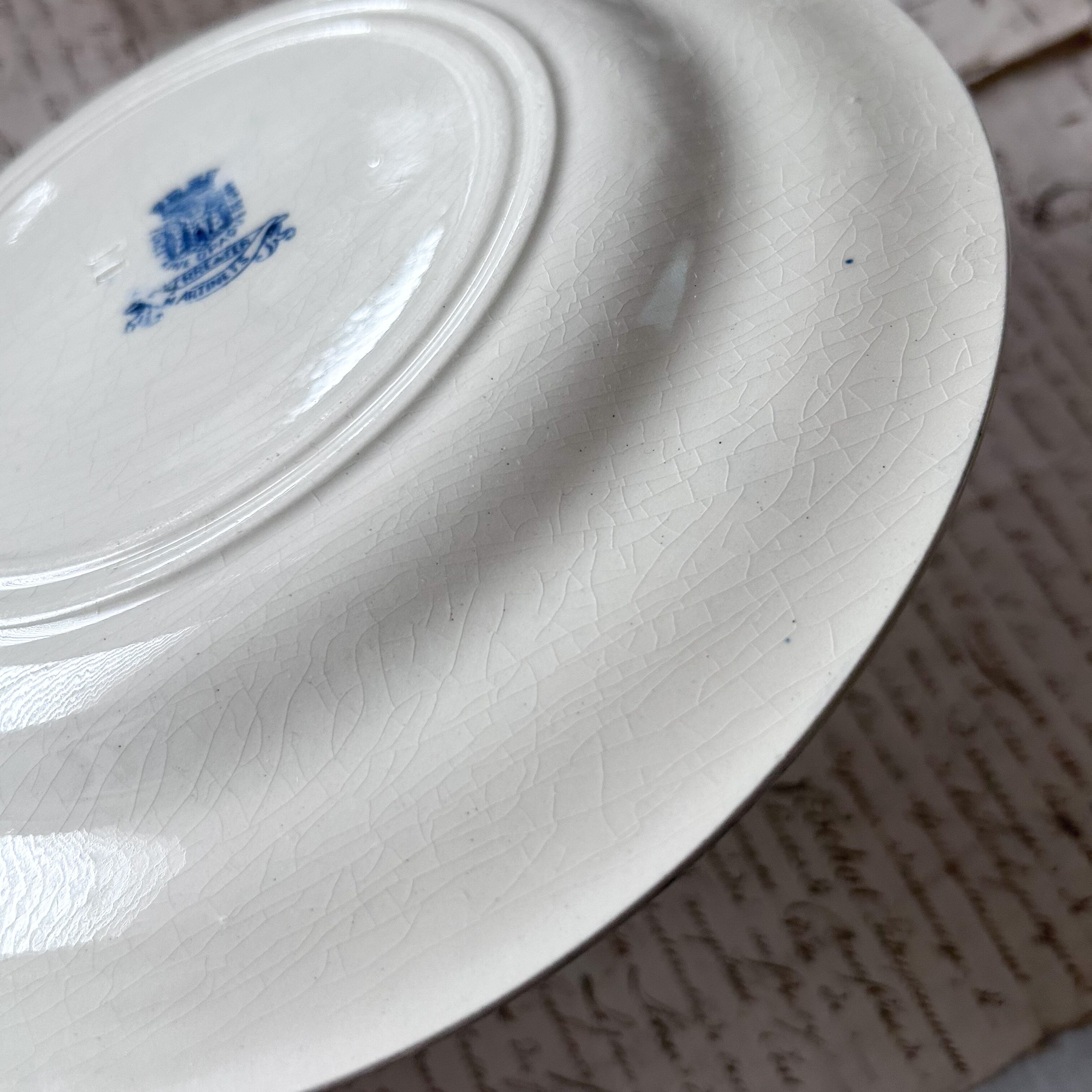 やわらかな白地に濃紺のツバメと桜花(と思われる)が軽やかに描かれた、ジアンのジャポニスム様式を色濃く感じる美しいプレートです。飛び交うツバメの伸びやかな姿と、枝に咲く可憐な花々がバランスよく配され、19世紀末〜20世紀初頭のフランス陶器らしい上品さと詩情が漂います。縁を囲む小花のモチーフが柔らかいアクセントとなり、テーブルに置くだけで季節感と優雅さを添えてくれる一枚です。ディスプレイとしても映える存在感があります。