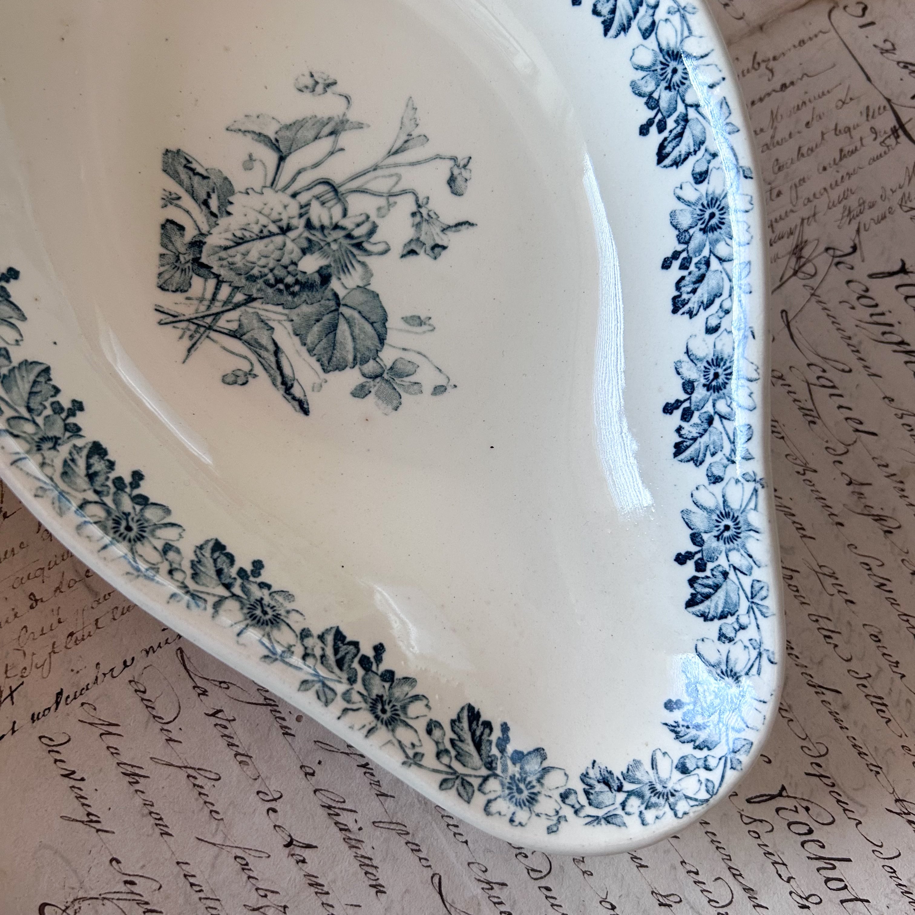 リュネヴィルの人気シリーズ「Violettes(スミレ)」のラヴィエです。藍色一色で清らかに描かれたスミレの花束が中央を飾り、縁にはスミレのガーランドが連なる愛らしいデザイン。可憐でありながらも凛とした存在感を放ち、シンプルさの中に上品な華やぎを感じさせます。テーブルに爽やかで優しい空気を添えてくれます。前菜やフルーツ、スイーツにぴったりのサイズ感です。