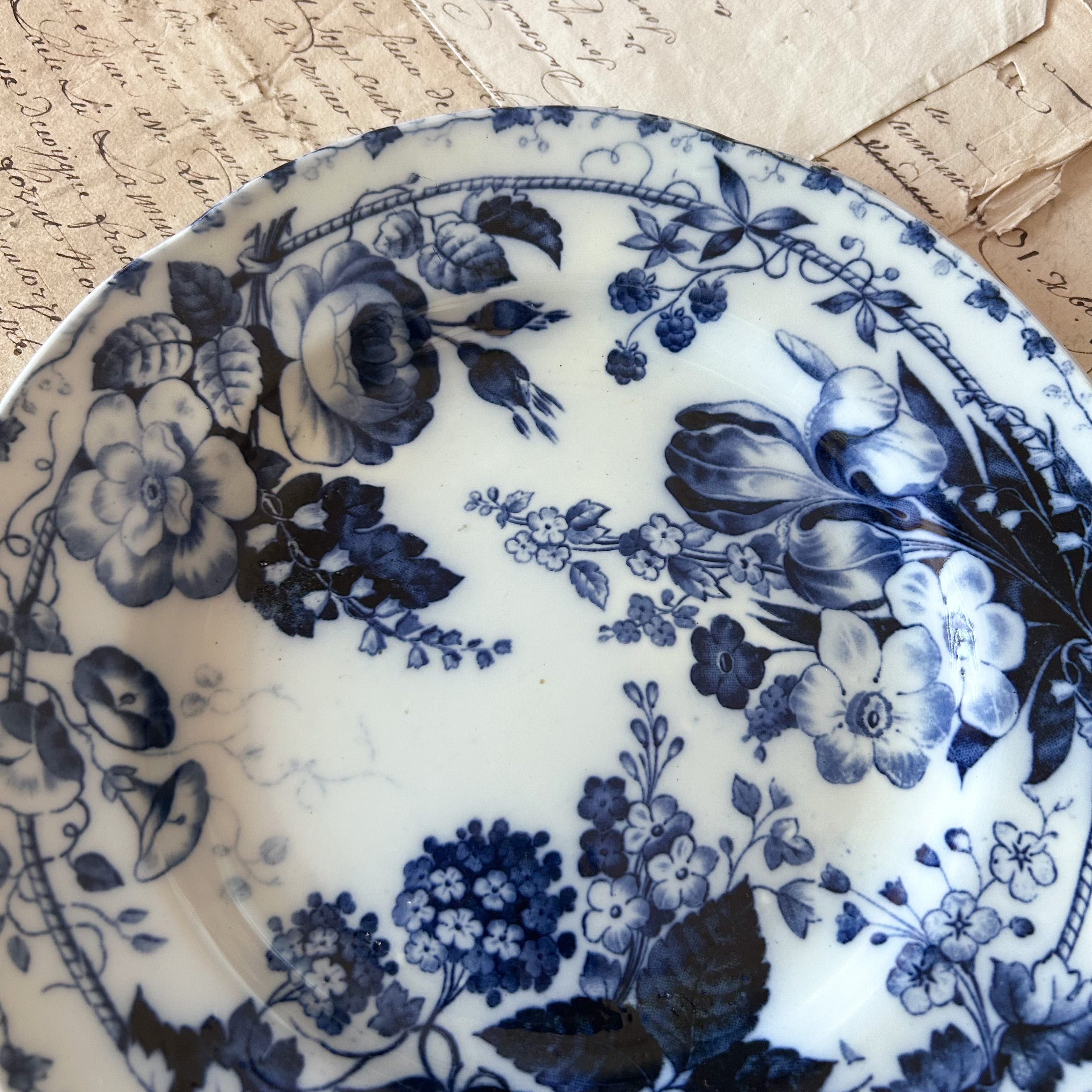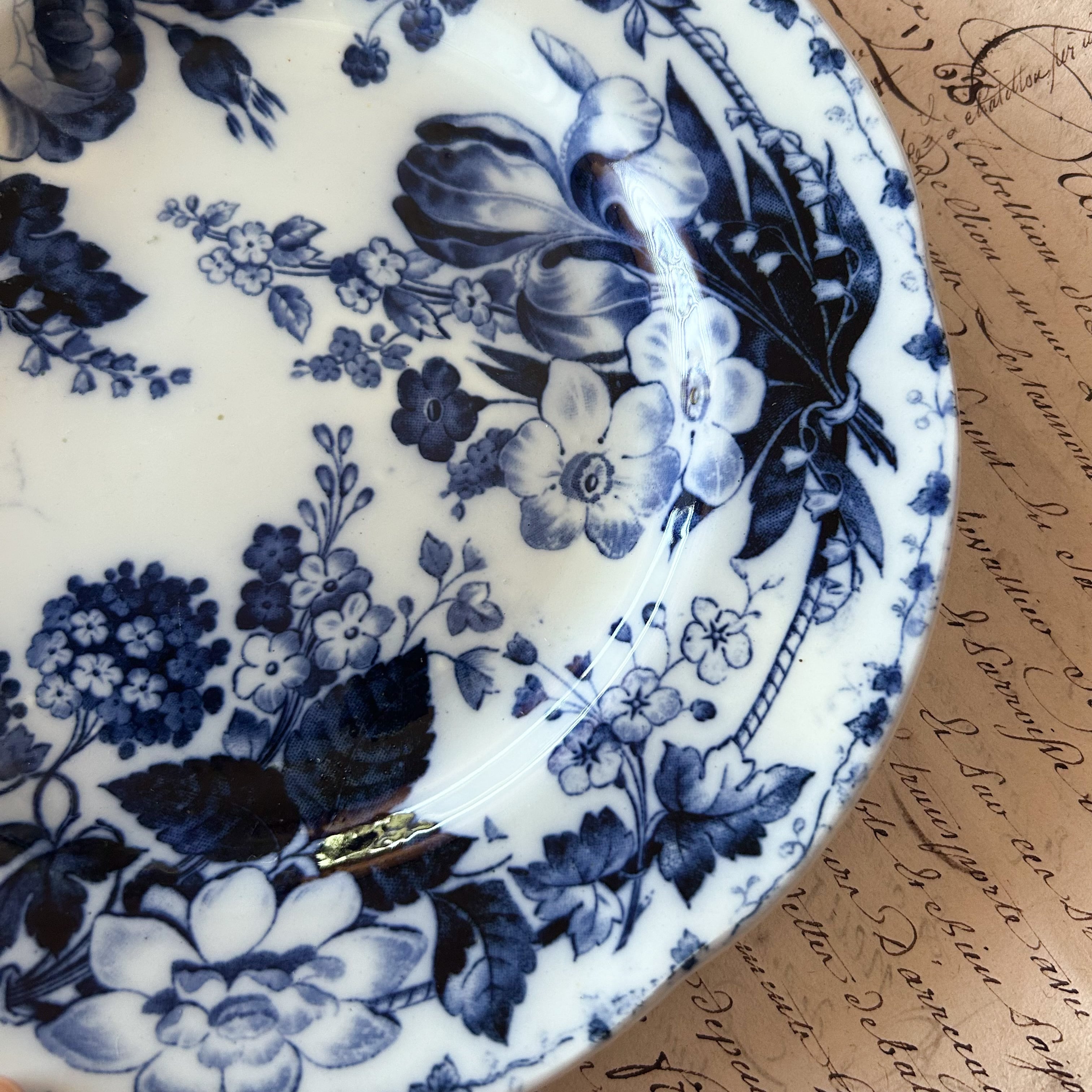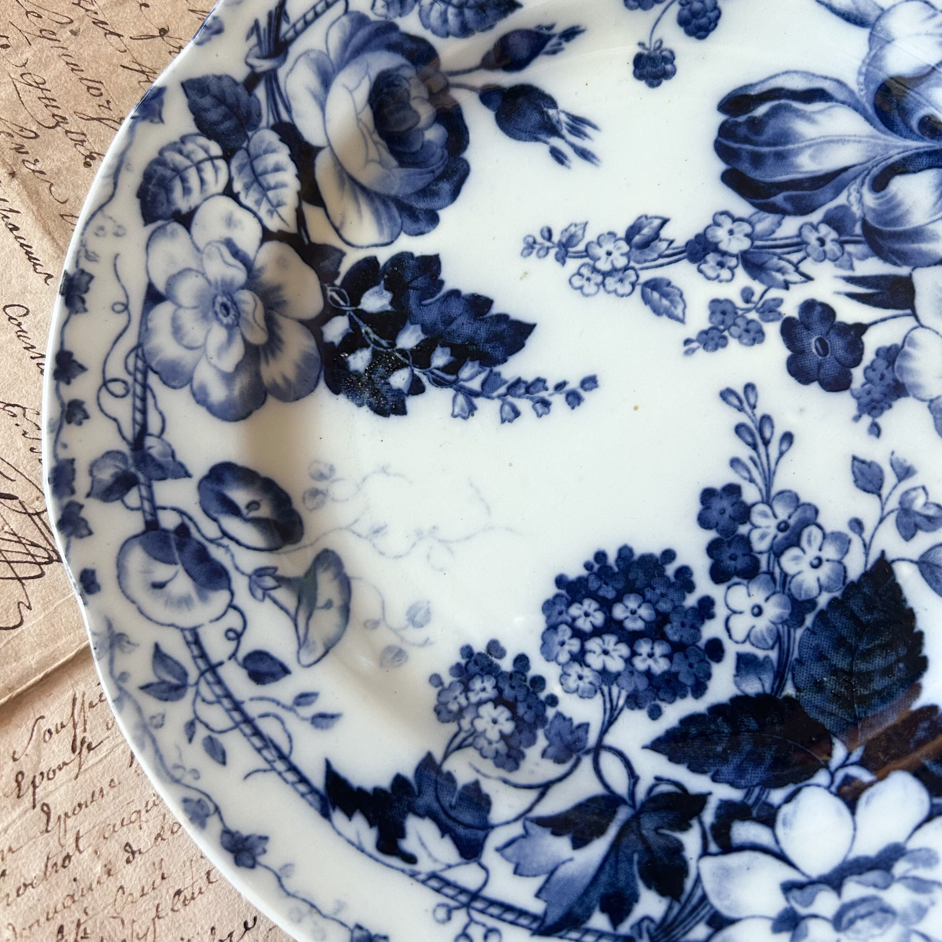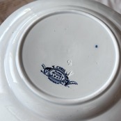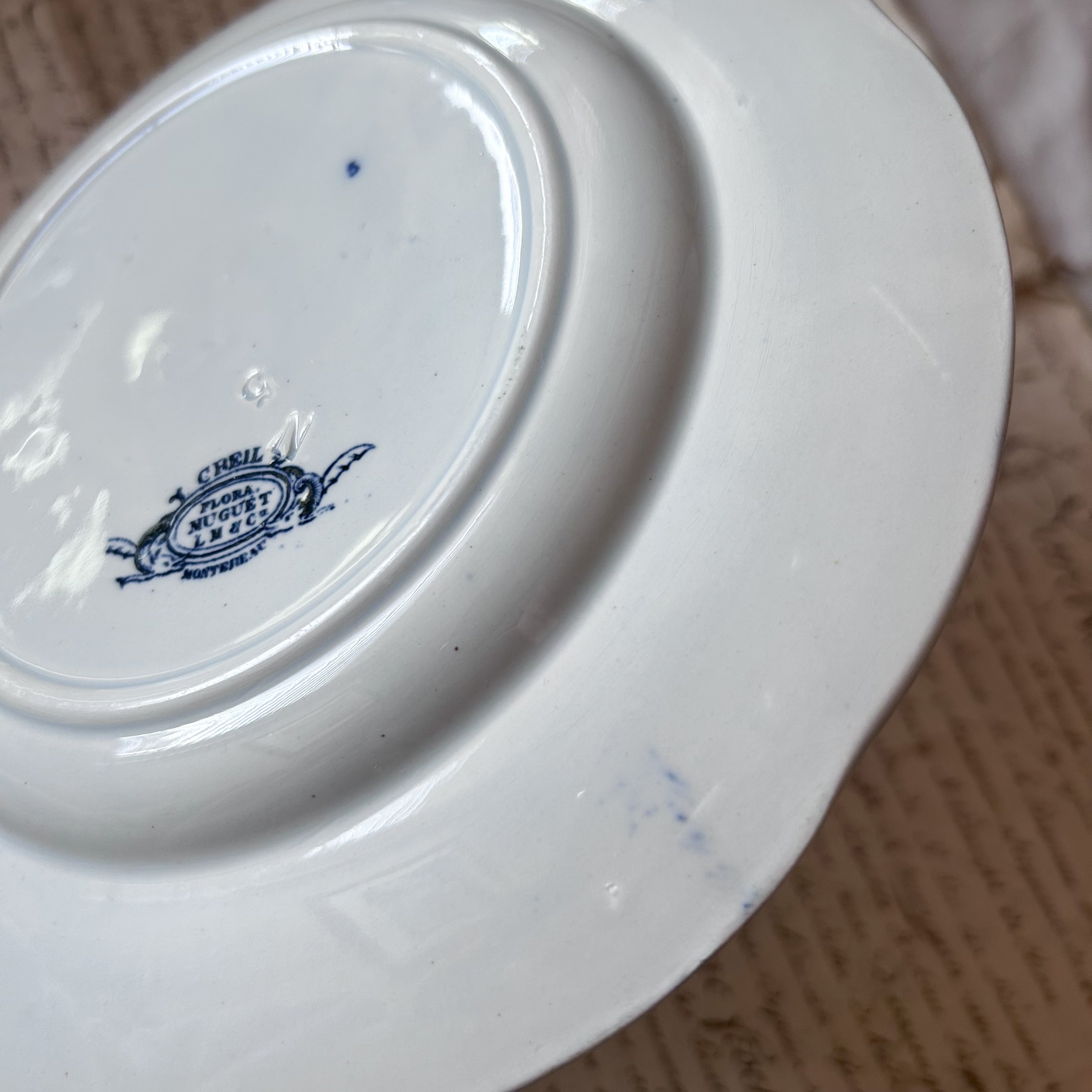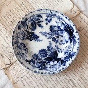 深みのあるブルーでミュゲなどの花々が描かれた、クレイユ・エ・モントローの“FLORA”シリーズのプレートです。精密な転写技法により表現されたボタニカルモチーフは、19世紀フランスの自然主義的美意識を感じさせます。柔らかな白色の陶肌にブルーの発色が映え、テーブルに優雅な陰影を添えてくれます。ディスプレイとして飾っても美しく、古いリネンや銀器、また和食器との相性も抜群です。