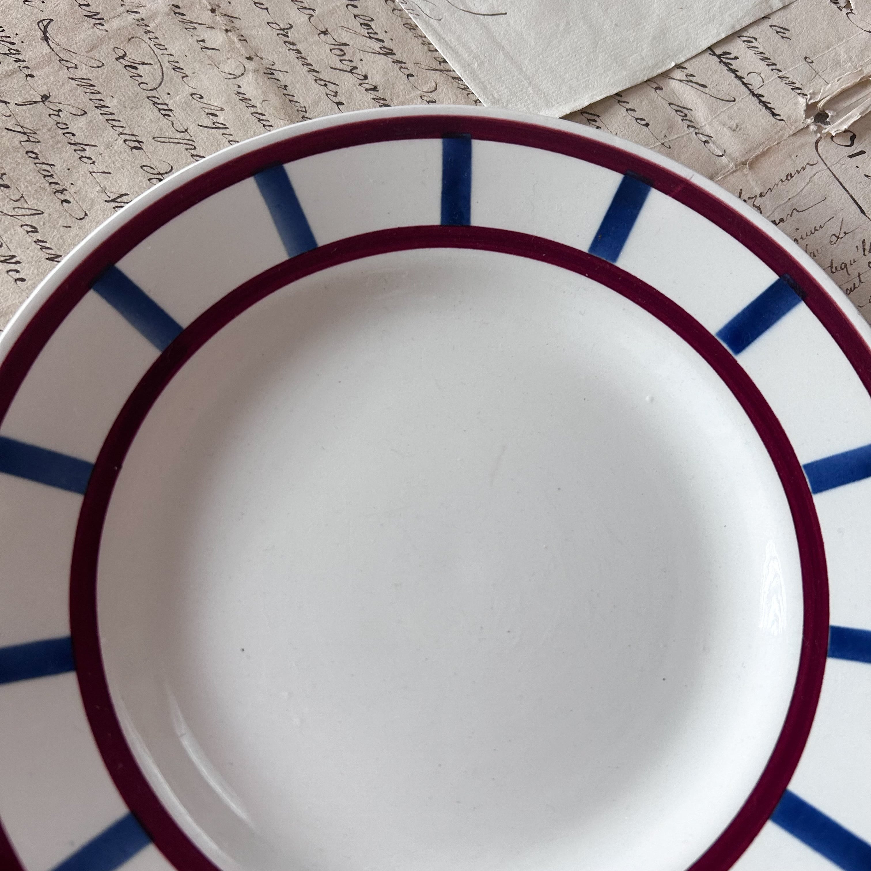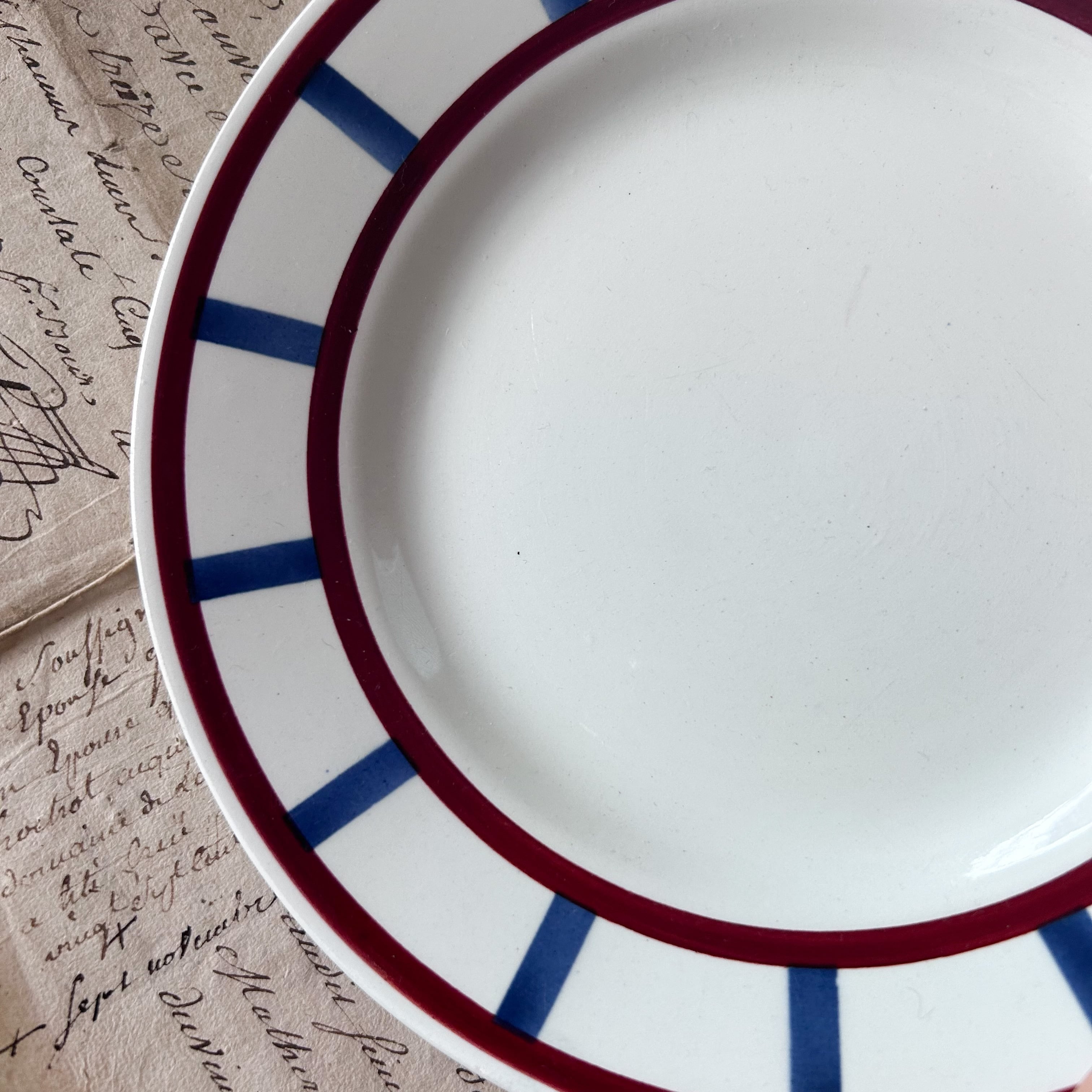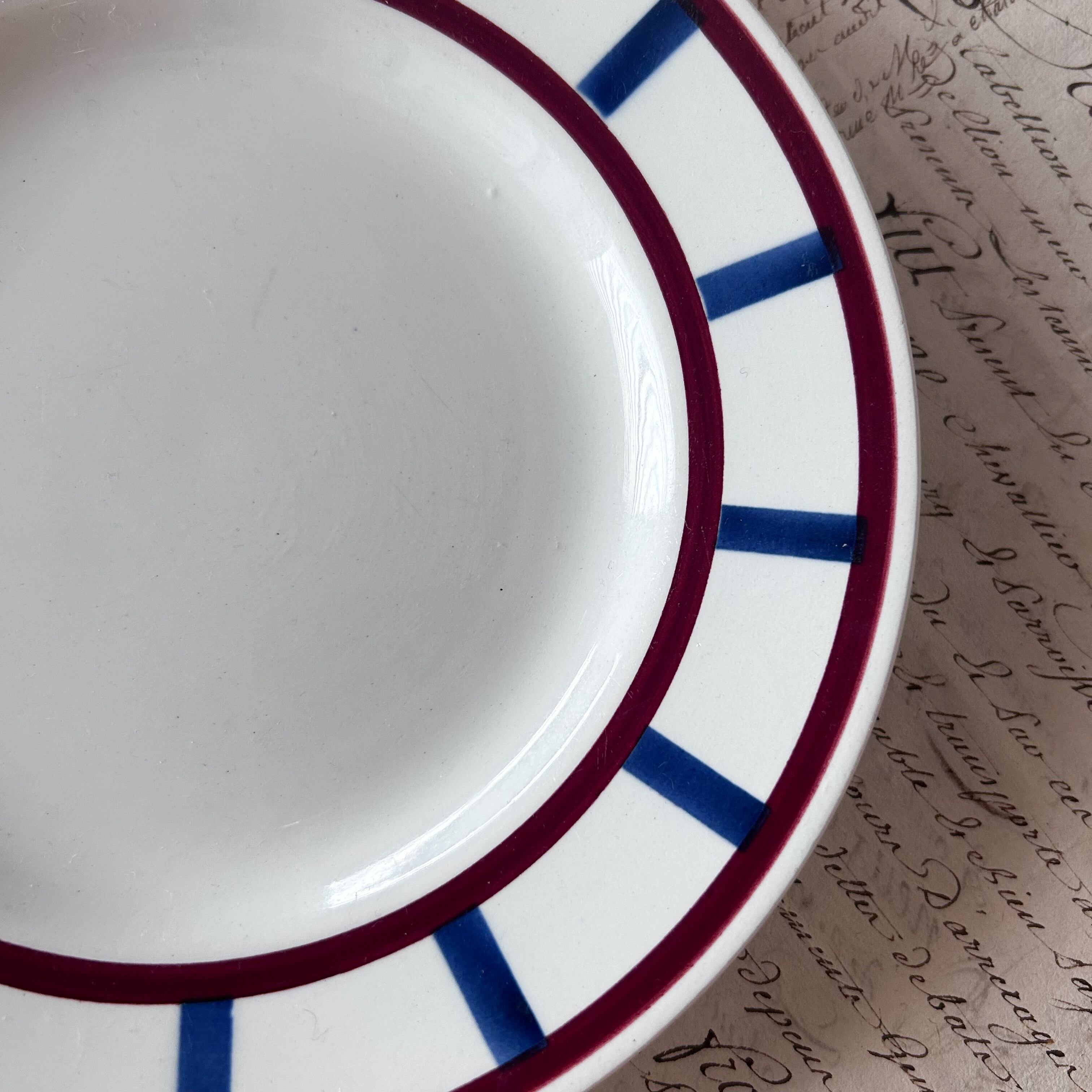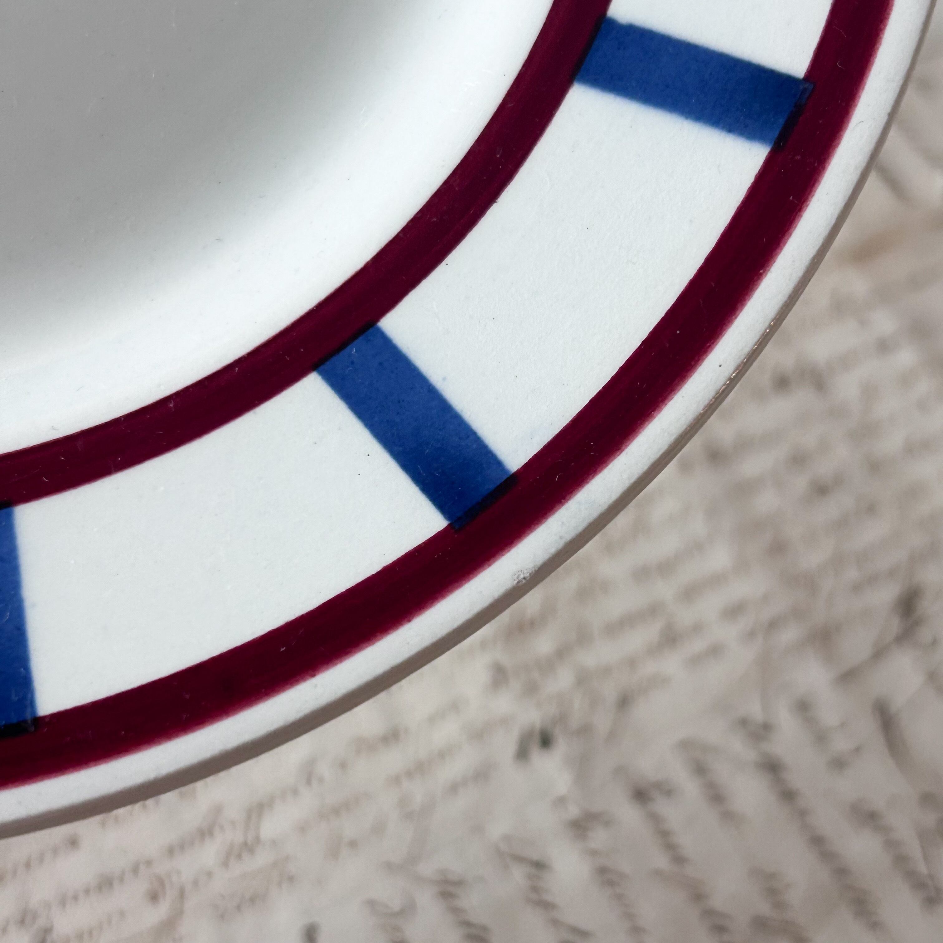 赤と青のラインが交互に並ぶ、フランスらしいトリコロールと素朴な温かみを感じさせる「バスク柄」のプレート。こちらは、数あるバスク柄の中でも人気の高い、クレイユ・エ・モントロー製Bearn シリーズの一枚です。潔い直線のラインが刻むブルーとルージュのコントラストが美しく、田舎のビストロを思わせるかしい雰囲気。白磁とのバランスもよく、和洋問わず日常使いに取り入れやすいのが魅力です。
