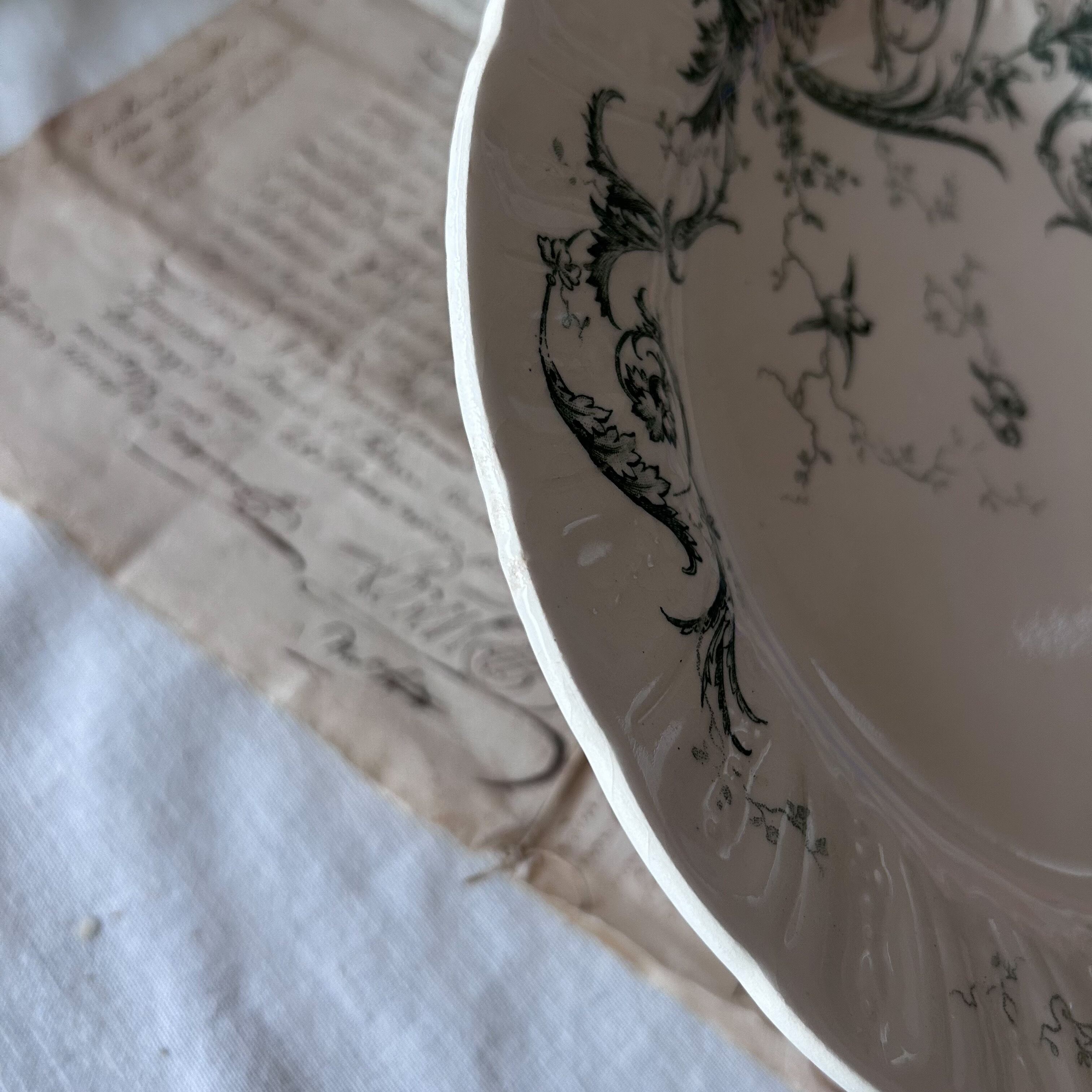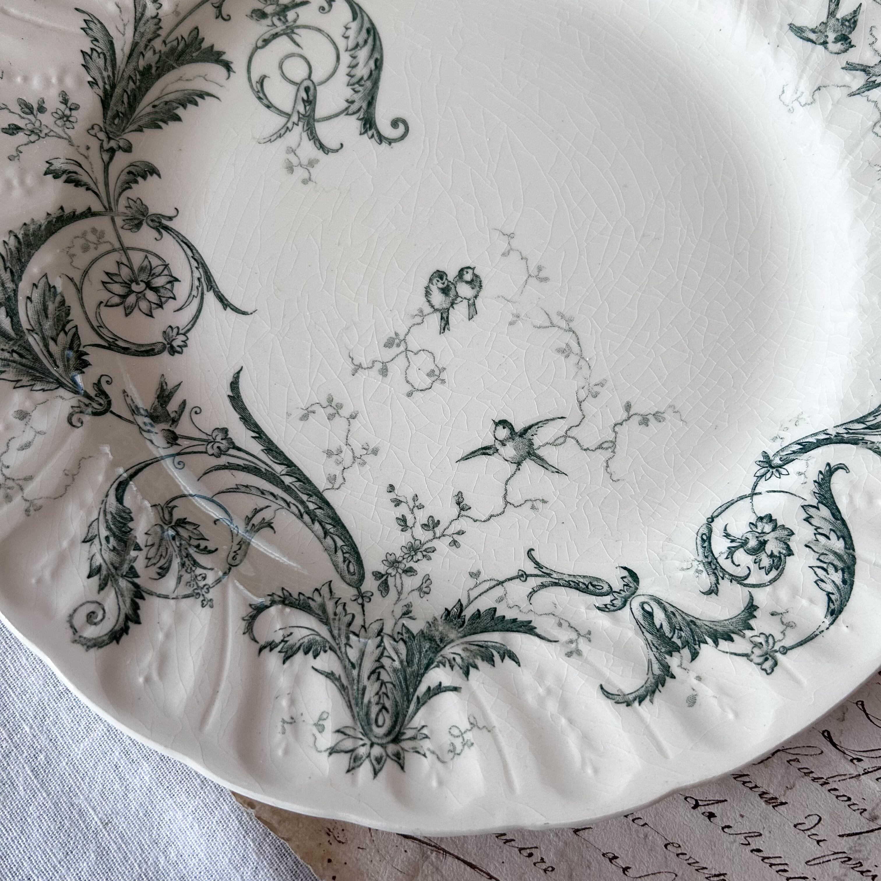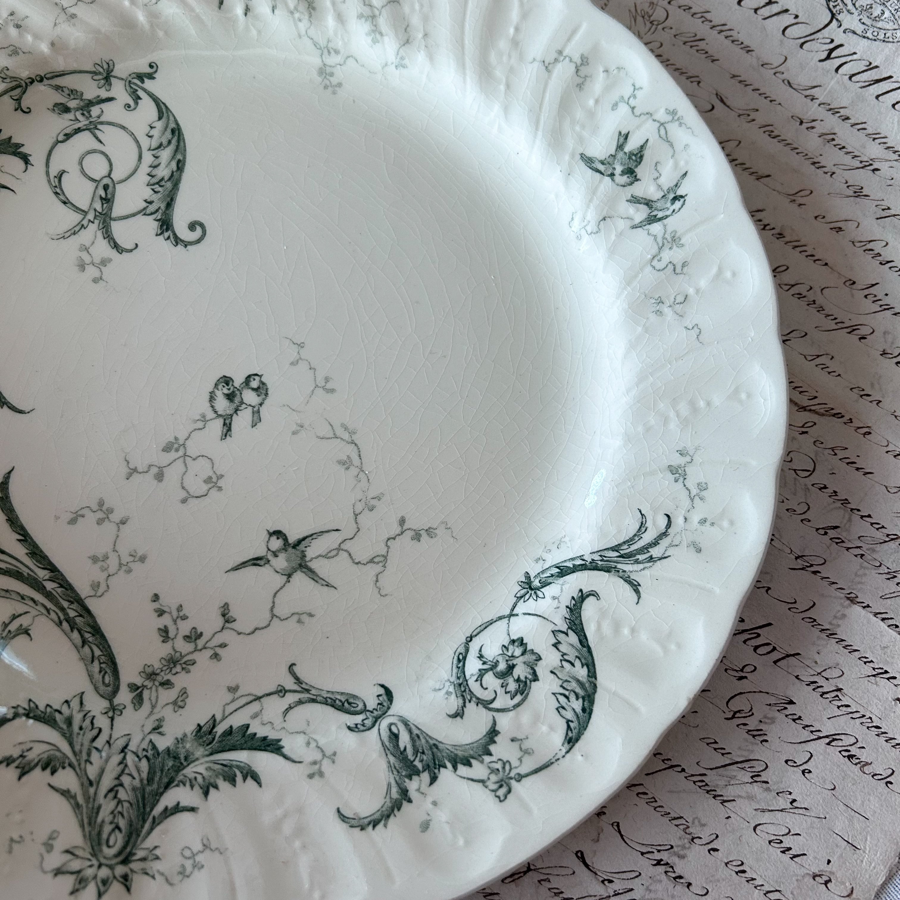 優美な唐草模様と小鳥のモチーフが描かれた、クラシカルな雰囲気漂うプレート。よもぎ色の単色転写による繊細な装飾は、19世紀のフレンチアンティークならではの趣を感じさせます。リム部分には柔らかなレリーフが施され、立体感と陰影が上品なアクセントに。コレクションやディスプレイにも最適な一枚です。