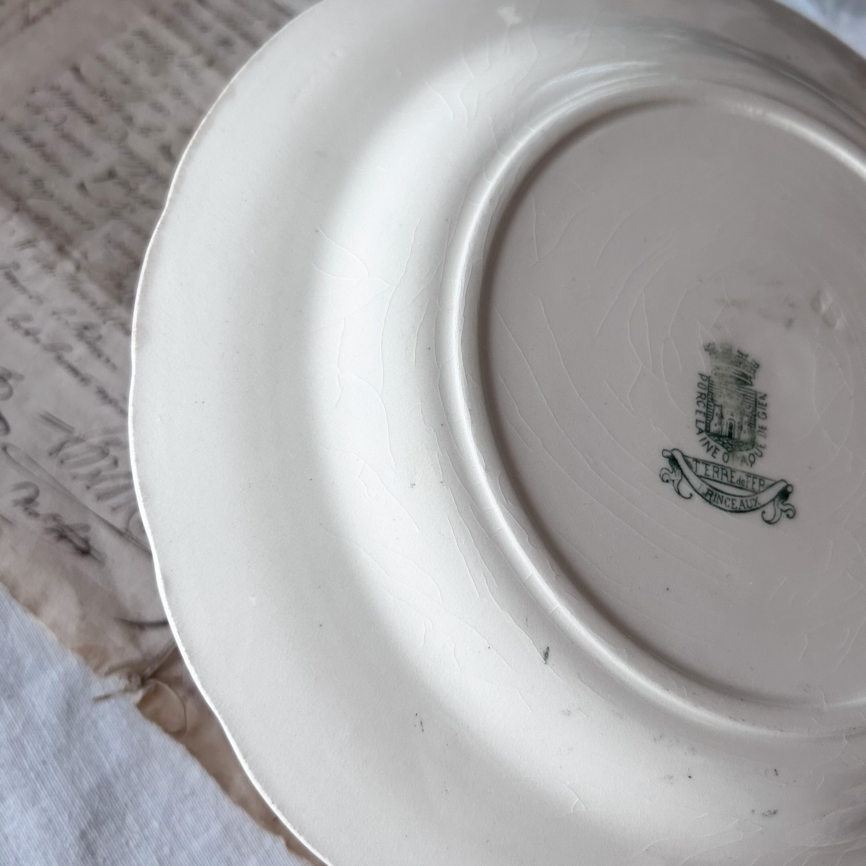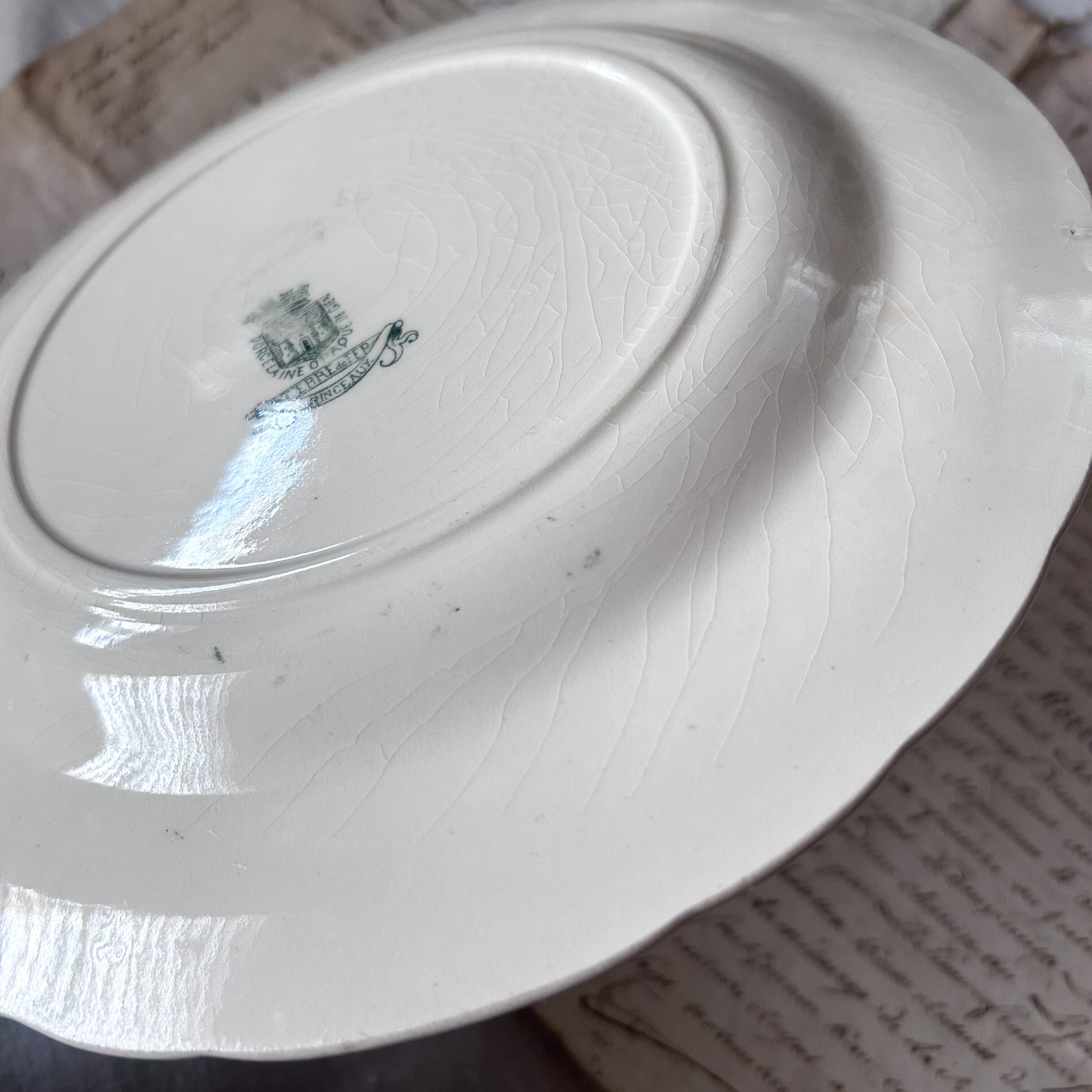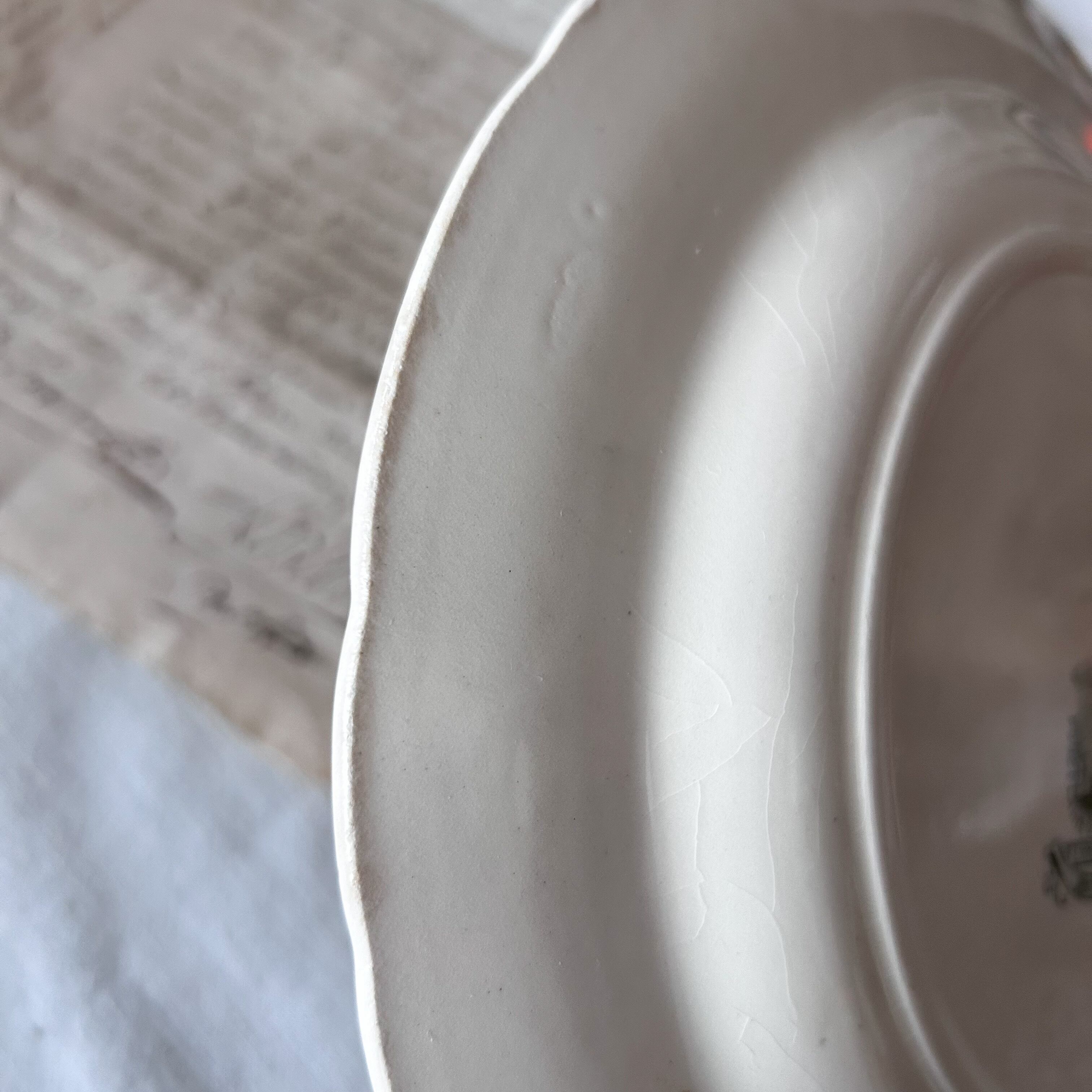 優美な唐草模様と小鳥のモチーフが描かれた、クラシカルな雰囲気漂うプレート。よもぎ色の単色転写による繊細な装飾は、19世紀のフレンチアンティークならではの趣を感じさせます。リム部分には柔らかなレリーフが施され、立体感と陰影が上品なアクセントに。コレクションやディスプレイにも最適な一枚です。