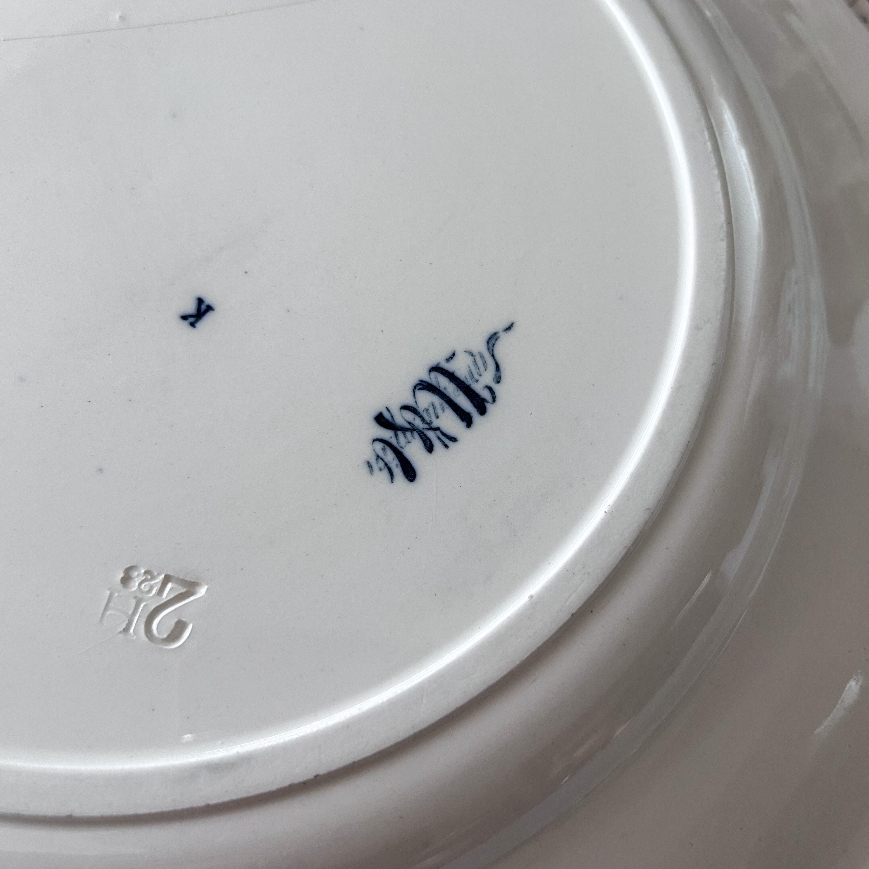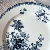 濃いブルーの繊細な縁飾りに、鮮やかな花々をあしらった華やかな一枚です。美しい花がバランスよく配置され、リボンの装飾がロマンティックな雰囲気を添えています。サルグミンヌらしい柔らかな陶肌に、表情豊かな花々が生き生きと映える、優雅で存在感あるかなりレアな大皿です。特別な日に使いたいお品です。