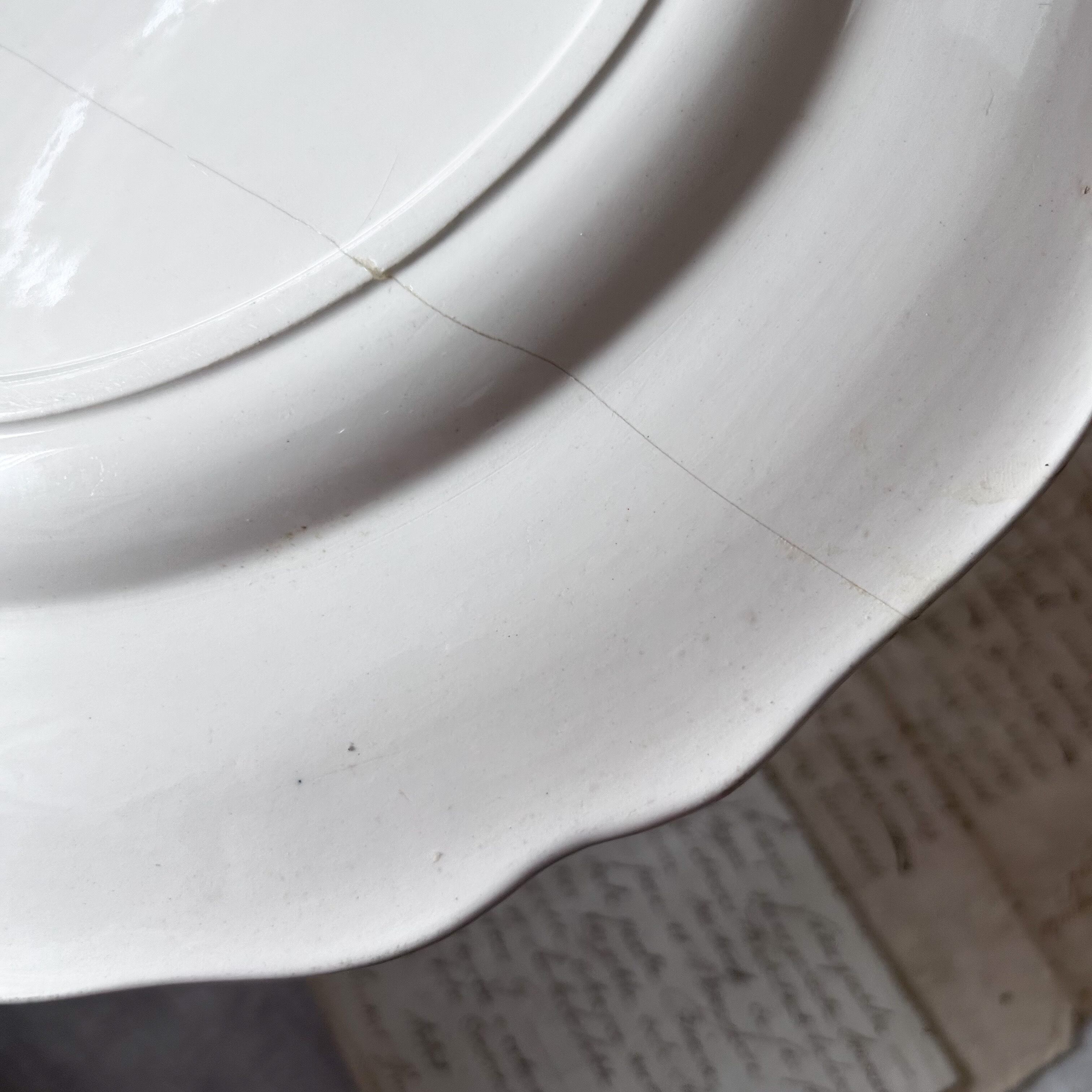 真ん中に修復跡あり。強固に接着されています。乾き物などに。またパティスリーなどの什器としても素敵にご利用いただけそうです。その他強めの貫入、それに伴う変色等ありますが、大変つややかな状態です。