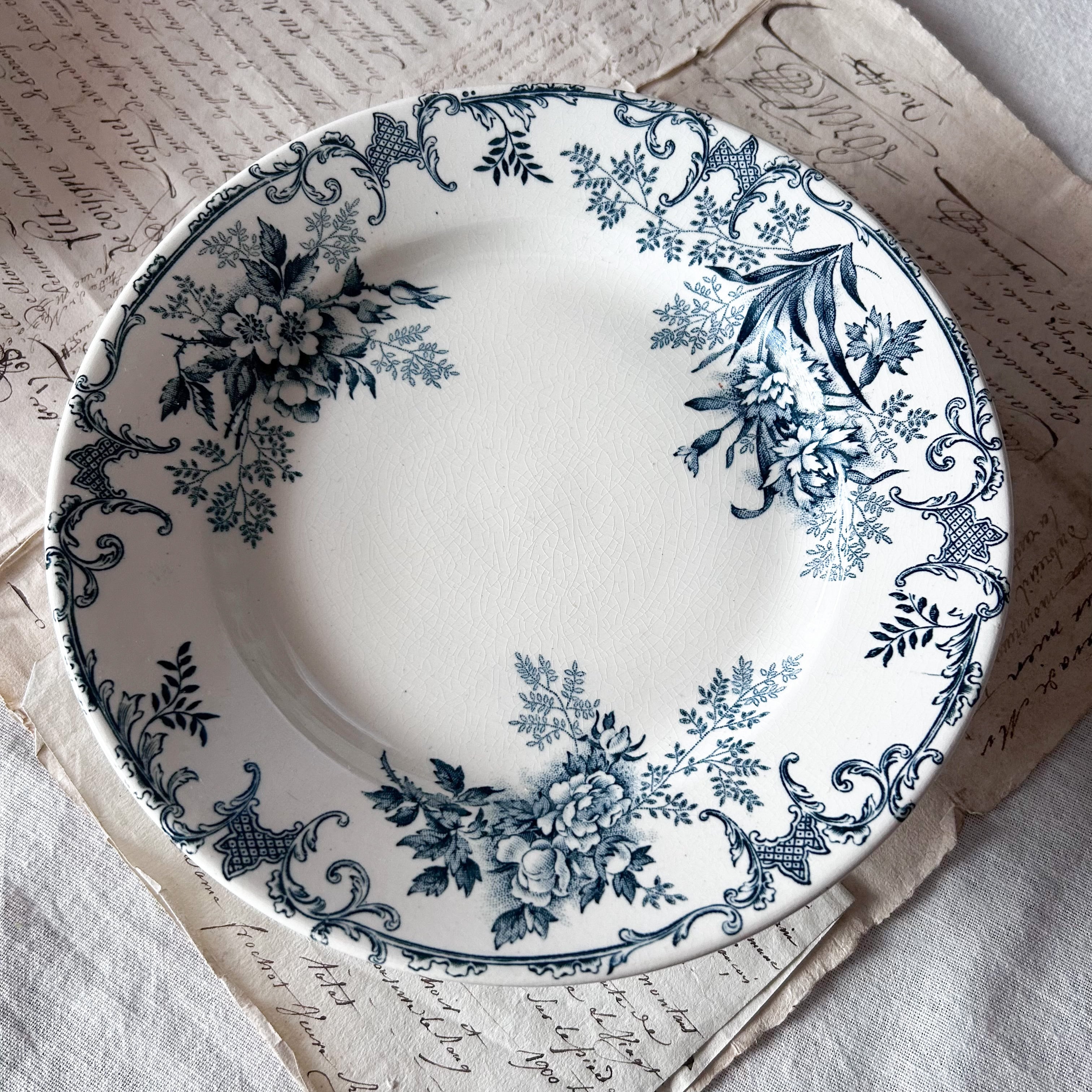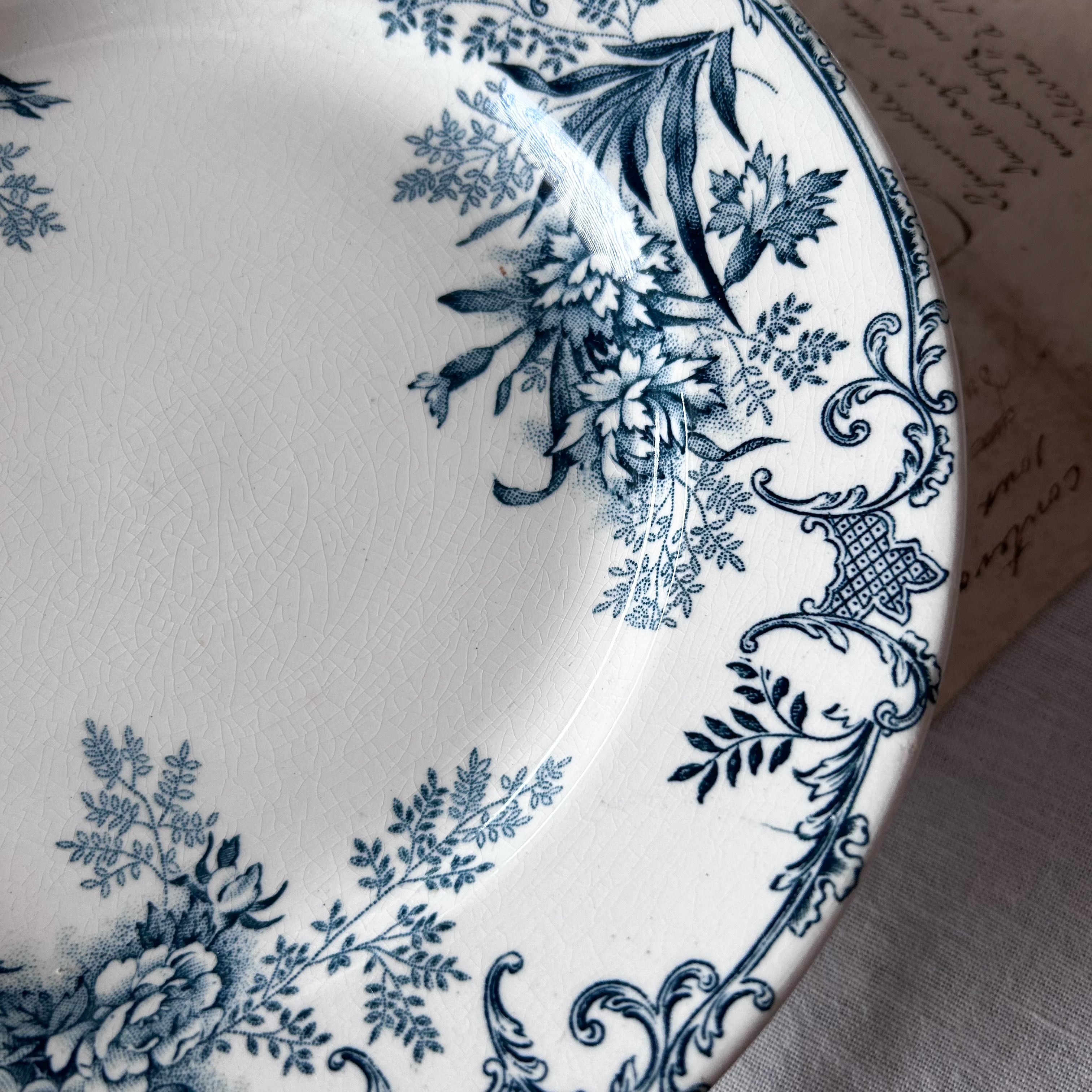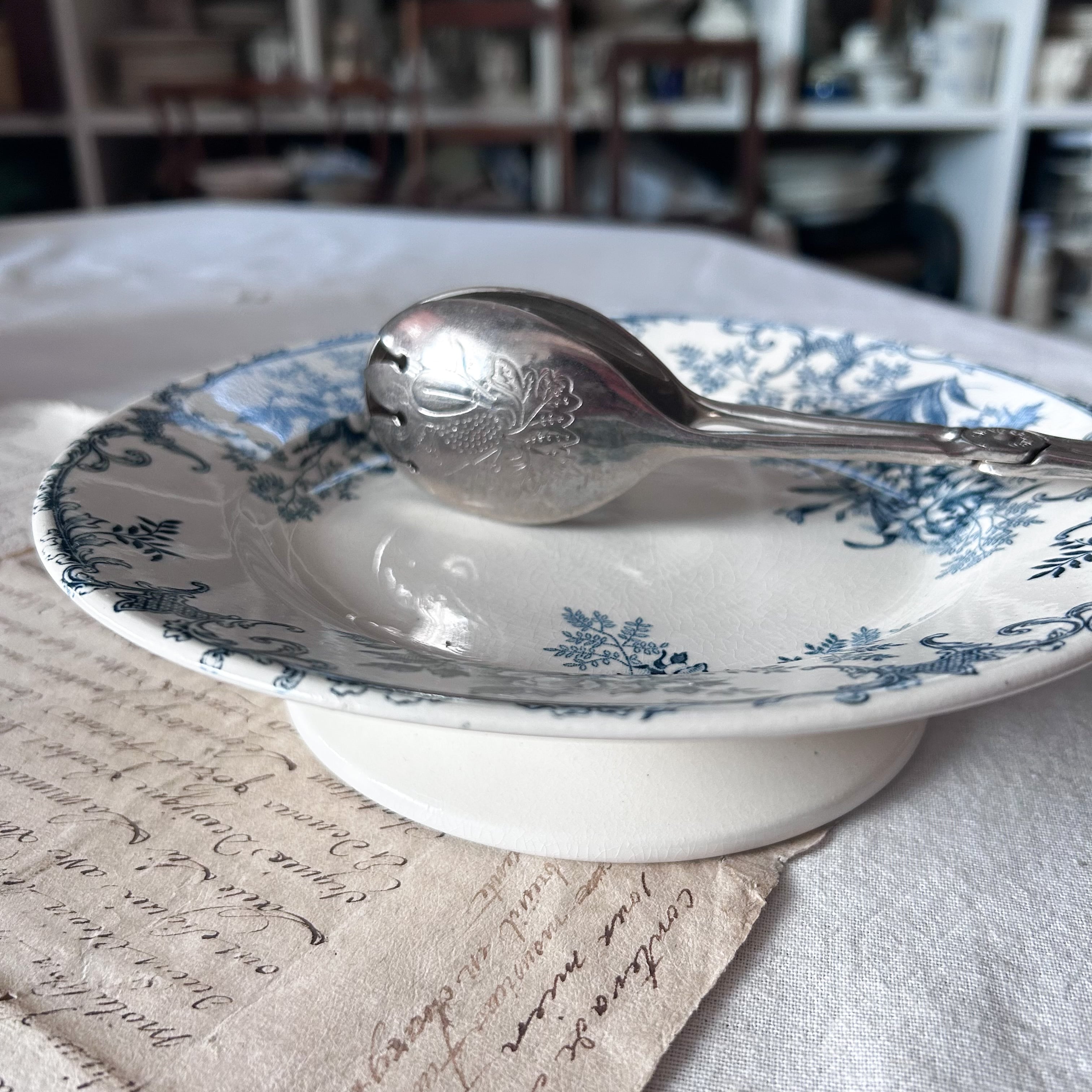 深みのあるブルーで草花が描かれた“Floreal”シリーズのコンポティエ。ショワジールロワらしい繊細な転写図案が見事で、優雅な花々とスクロール模様がリズミカルに配されています。低めに設えられた脚部が軽やかな佇まいを生み、テーブルに置いた際にも抜群の安定感。