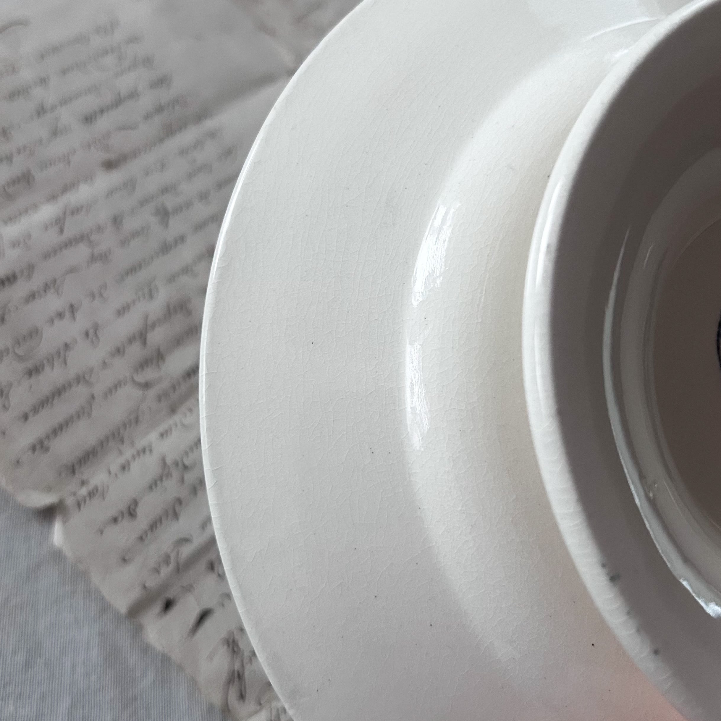 図案の転写が極めて鮮明に残っており、100年前の青がそのままの美しさで保存されてます。貫入等経年劣化は見られますが、使用感少なめのつややかで大変美しいアンティークコンディションです。