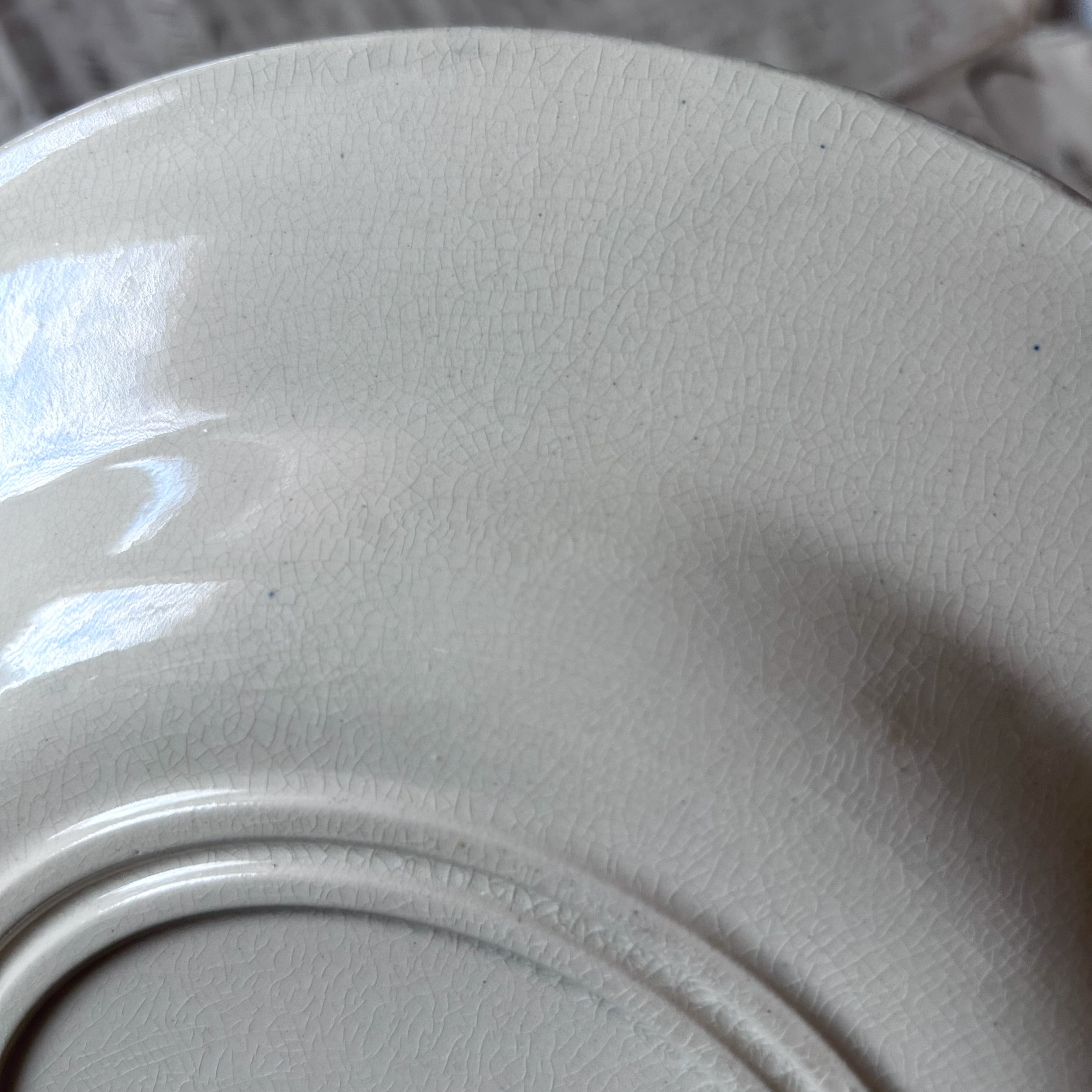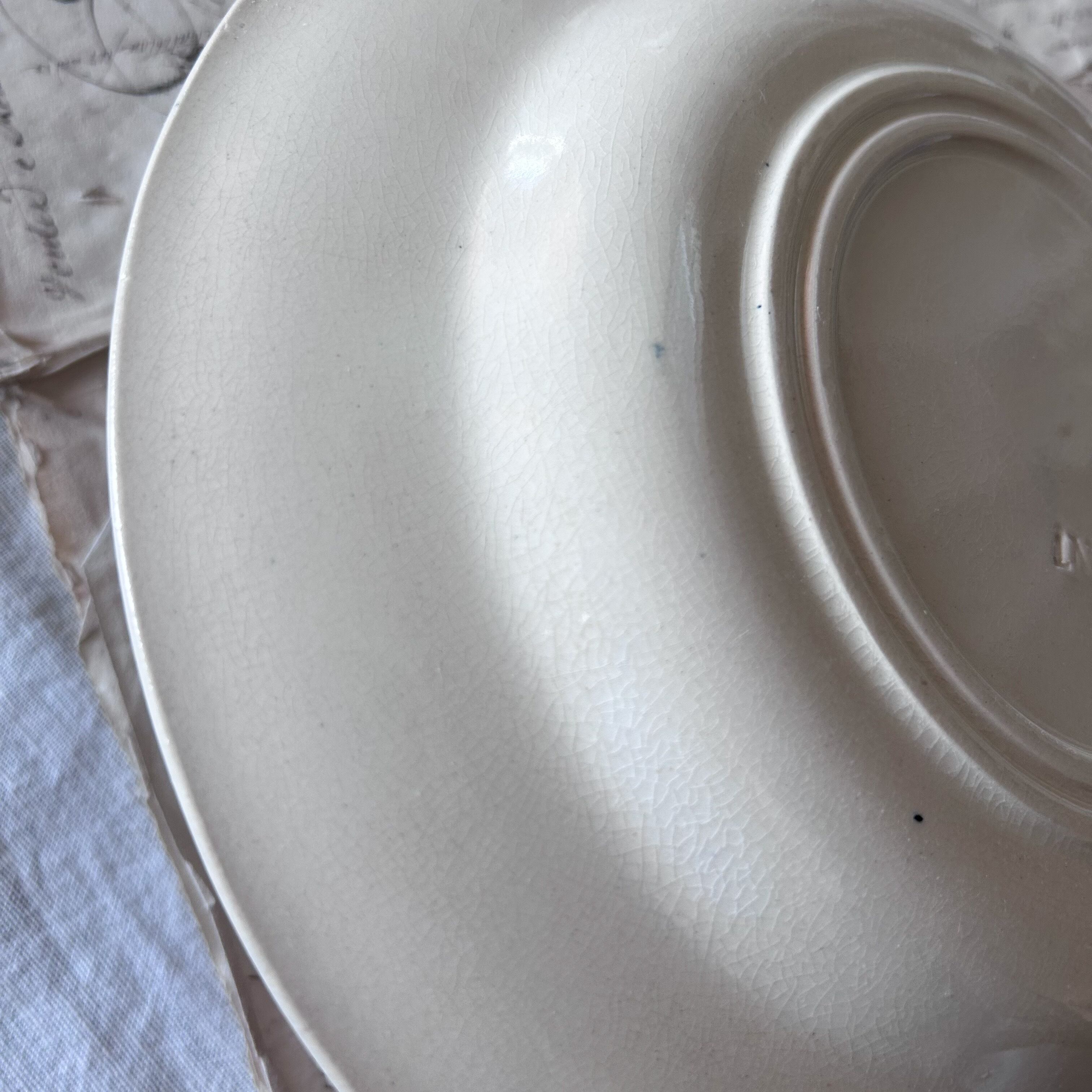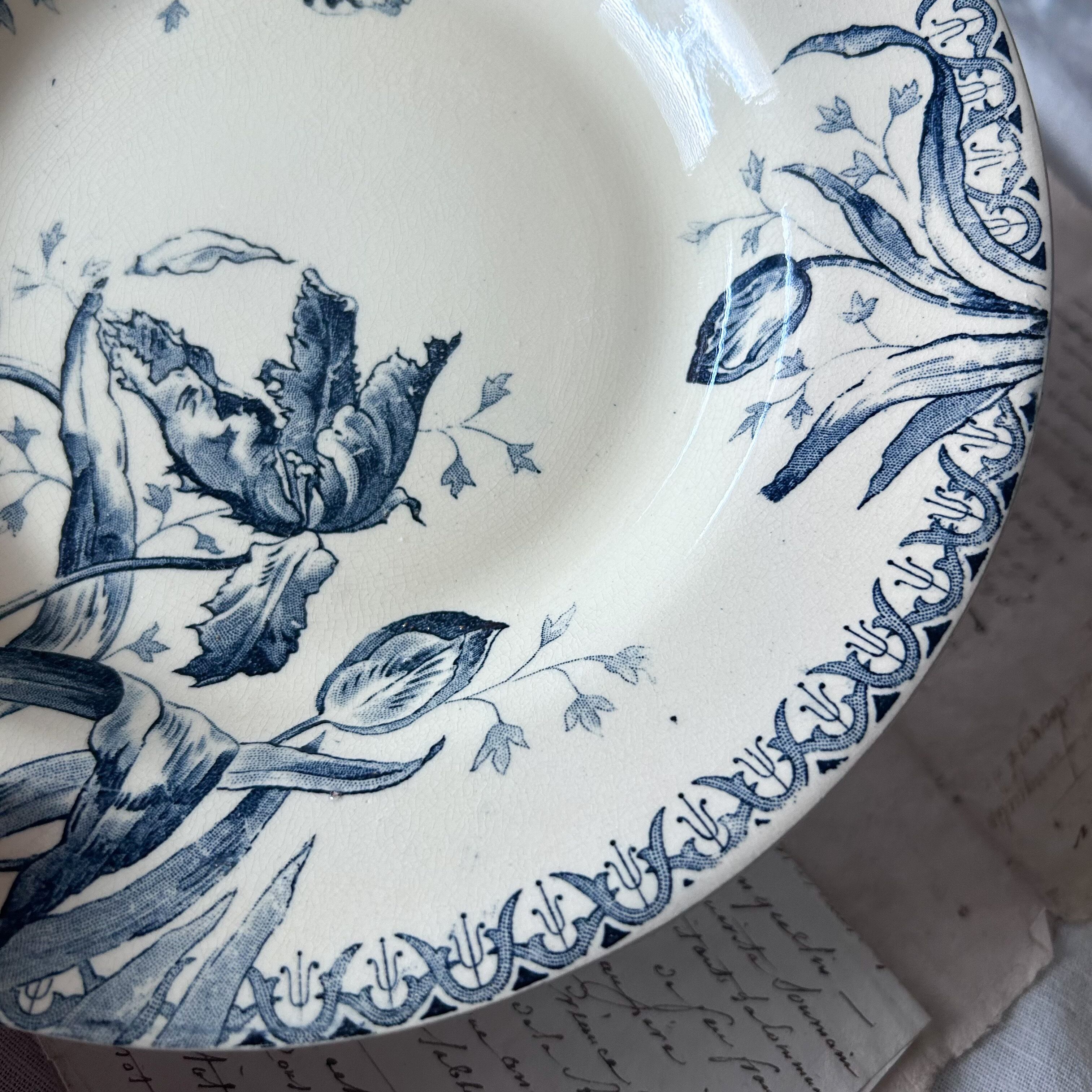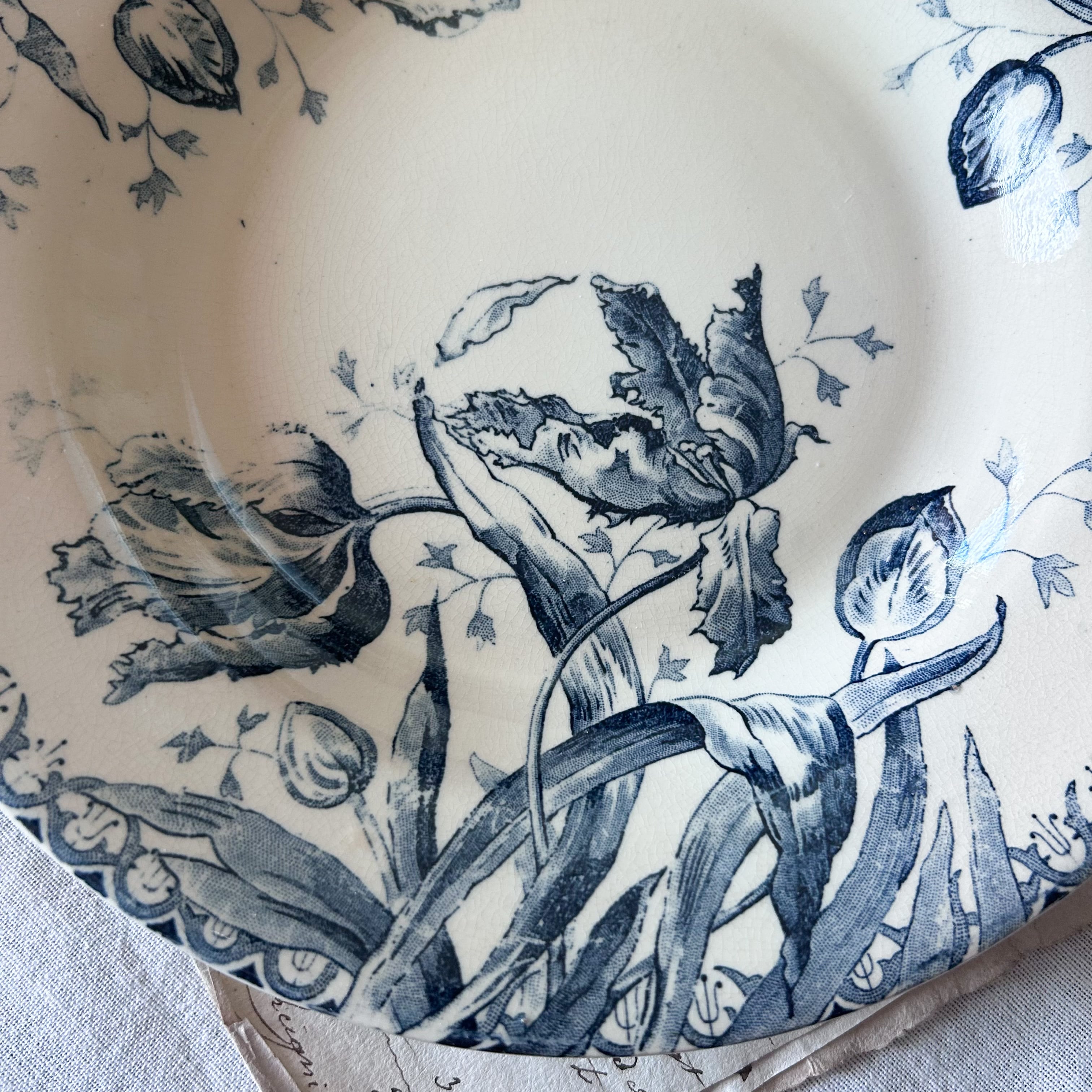 大胆に描かれたチューリップが印象的な、ジアン窯のアンティークプレート。波打つ葉の動きや花の陰影まで細やかに表現された濃淡のブルーが、どこかクラシカルで凛とした美しさを漂わせます。落ち着いた生成りの陶肌に深いブルーがよく映え、飾り皿としても、スープやパスタなどの盛り付けにも存在感を添えてくれる一枚です。