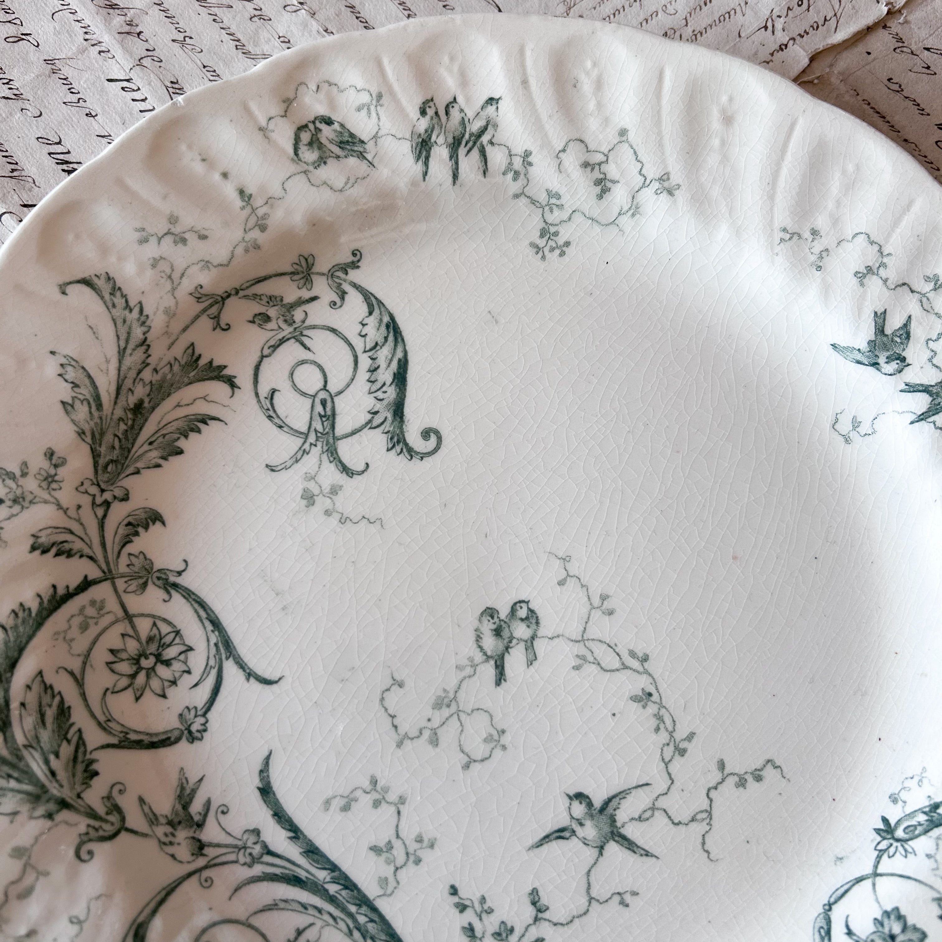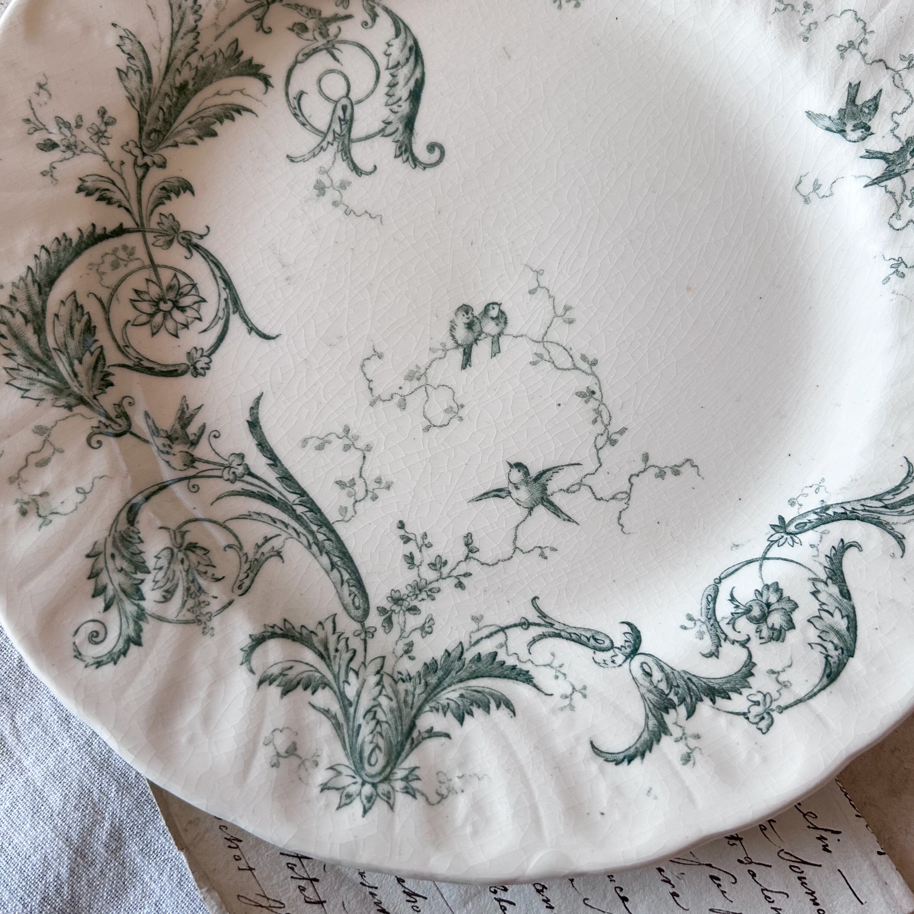 優美な唐草模様と小鳥のモチーフが描かれた、クラシカルな雰囲気漂うプレート。よもぎ色の単色転写による繊細な装飾は、19世紀のフレンチアンティークならではの趣を感じさせます。リム部分には柔らかなレリーフが施され、立体感と陰影が上品なアクセントに。コレクションやディスプレイにも最適な一枚です。