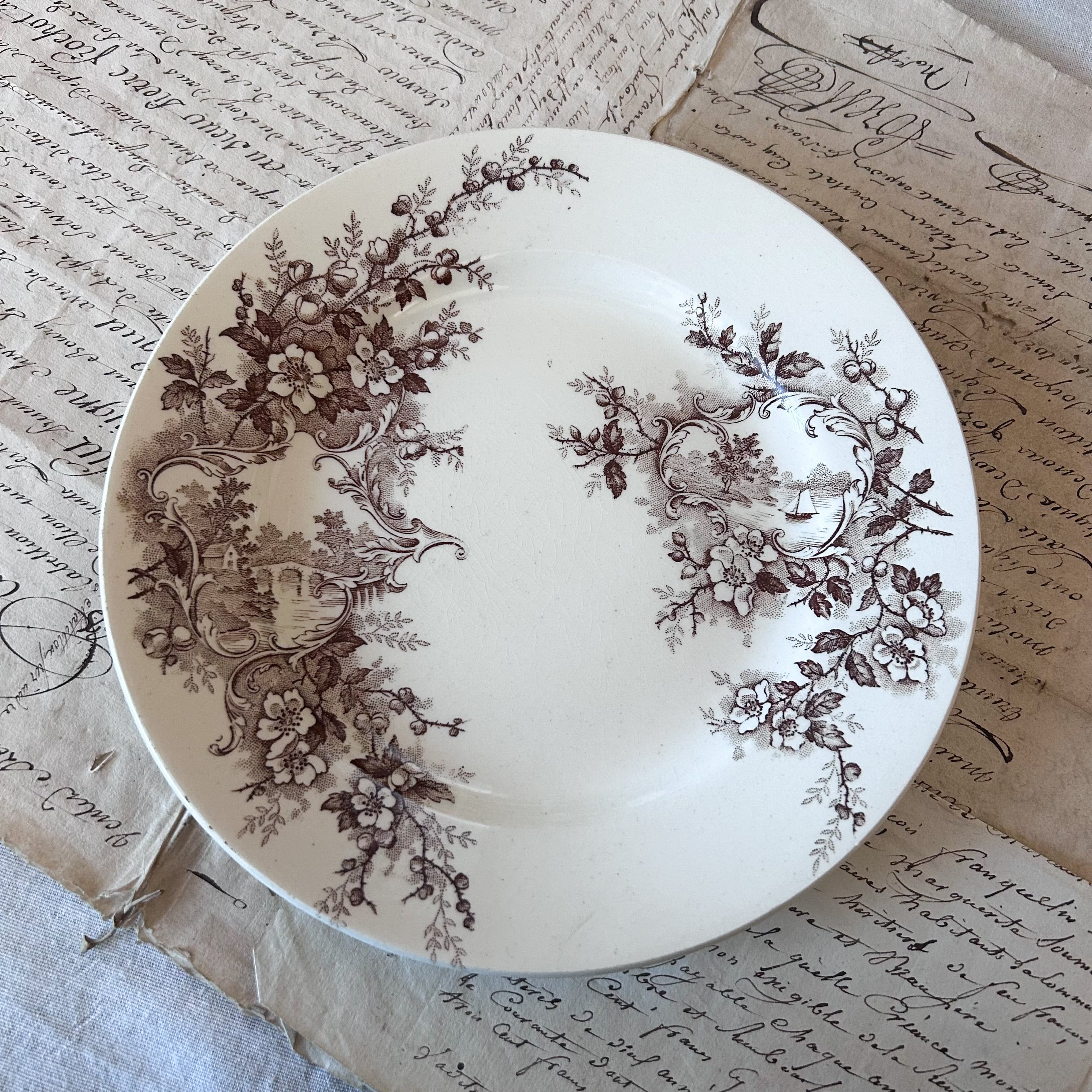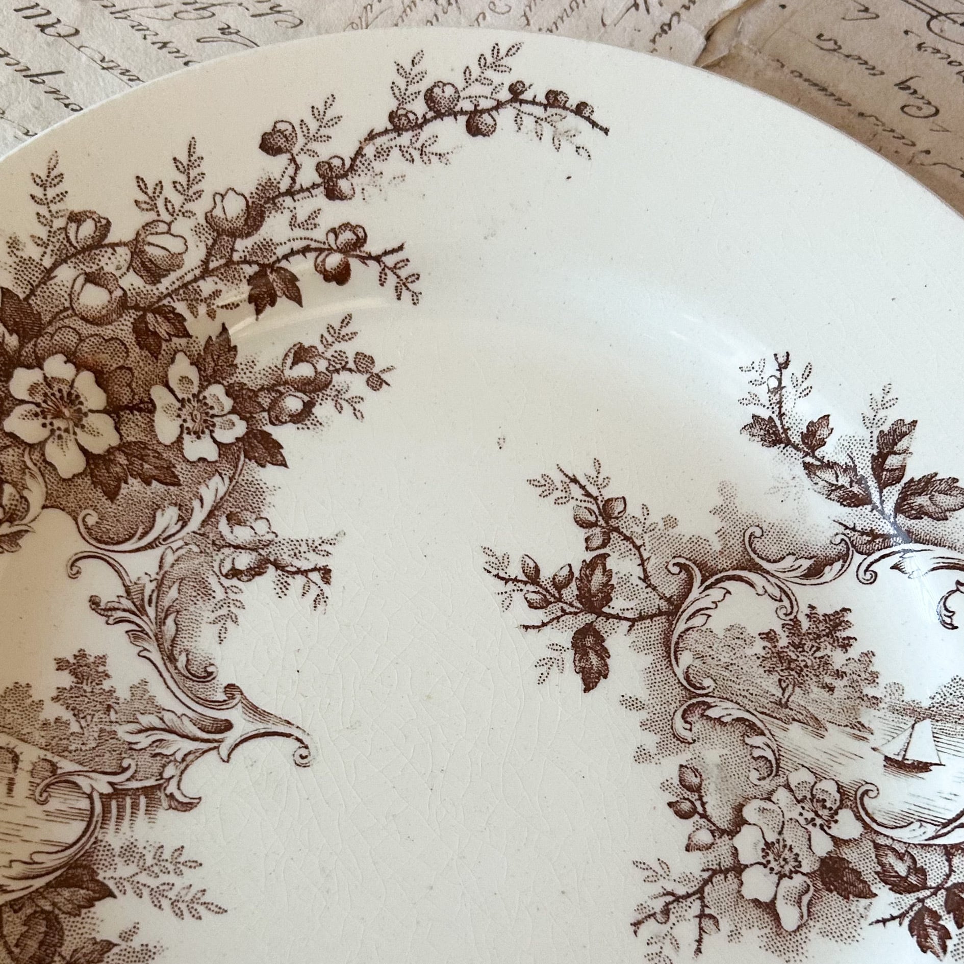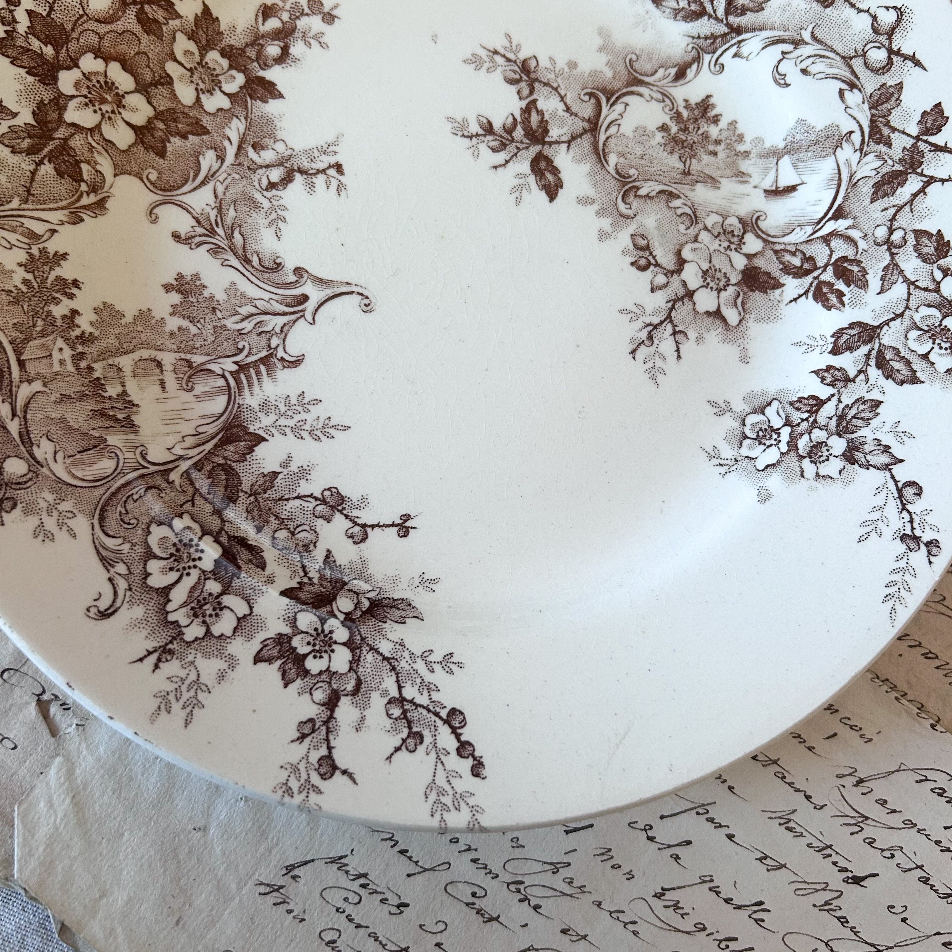 深みのあるブラウンで転写された花とロカイユ装飾、そして風景画が織り込まれた優雅なプレートです。クラシカルな花のブーケやスクロールの中に田園風景が描かれ、まるで絵画を切り取ったかのような芸術性を感じさせます。繊細な花々と柔らかな陶肌の組み合わせが、19世紀フランスのサロン文化を彷彿とさせる一枚。この「Pompadour (ポンパドール)」は、ショワジールロワを代表するデザインのひとつであり、コレクターや愛好家の間でも人気の高いシリーズとして知られています。飾っても使っても華やかさを添える、大変魅力的なお品です。