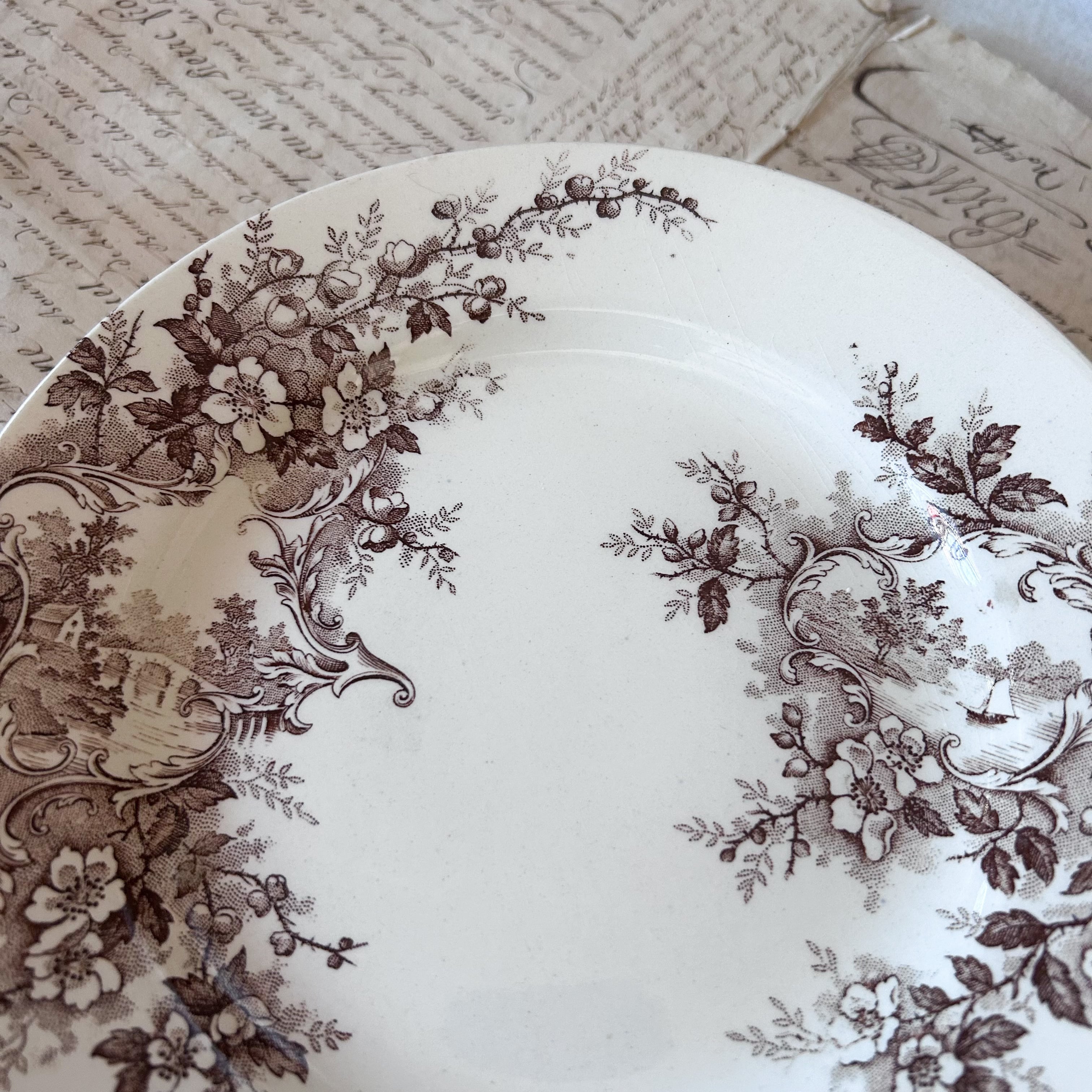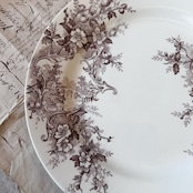 深みのあるブラウンで転写された花とロカイユ装飾、そして風景画が織り込まれた優雅なプレートです。クラシカルな花のブーケやスクロールの中に田園風景が描かれ、まるで絵画を切り取ったかのような芸術性を感じさせます。繊細な花々と柔らかな陶肌の組み合わせが、19世紀フランスのサロン文化を彷彿とさせる一枚。この「Pompadour (ポンパドール)」は、ショワジールロワを代表するデザインのひとつであり、コレクターや愛好家の間でも人気の高いシリーズとして知られています。飾っても使っても華やかさを添える、大変魅力的なお品です。