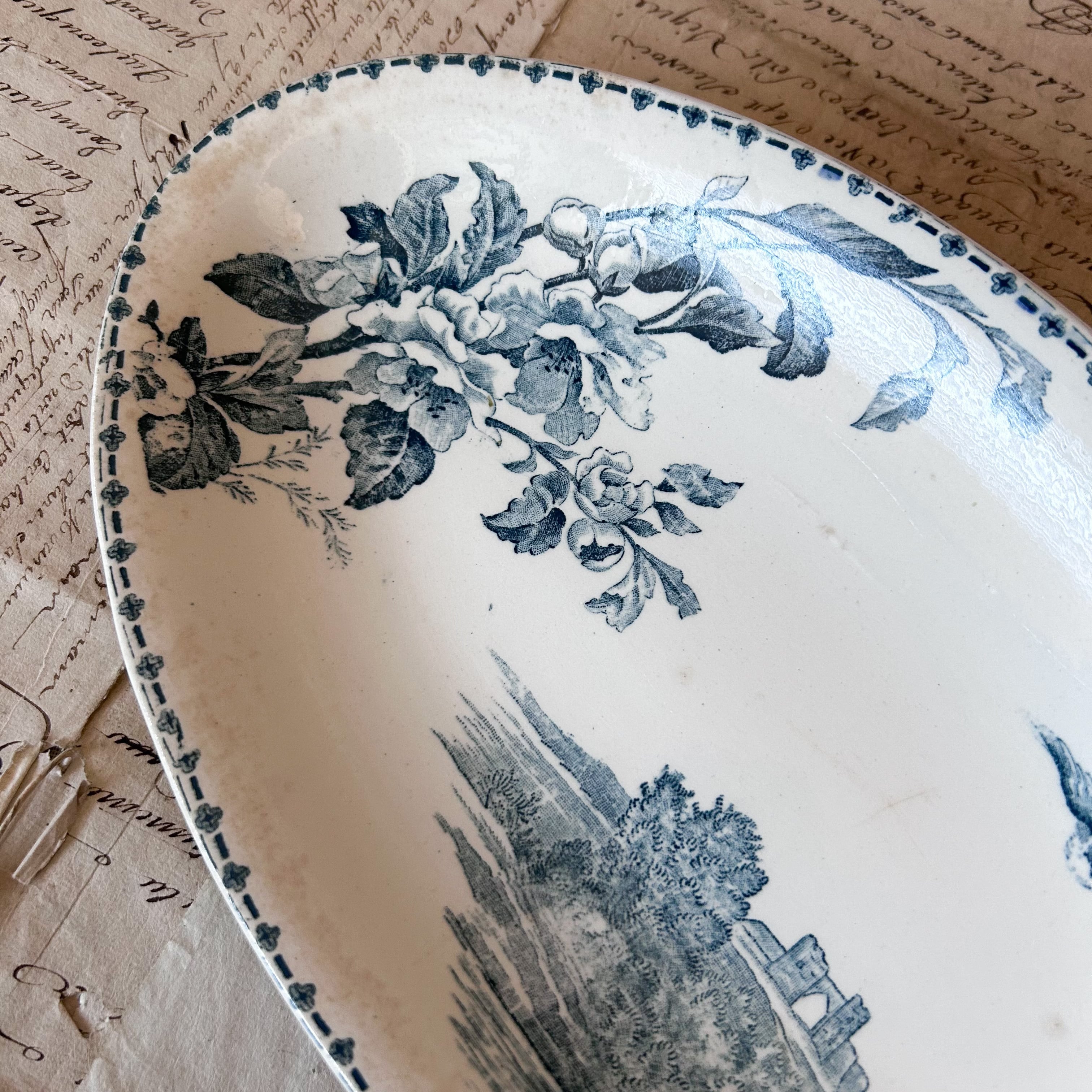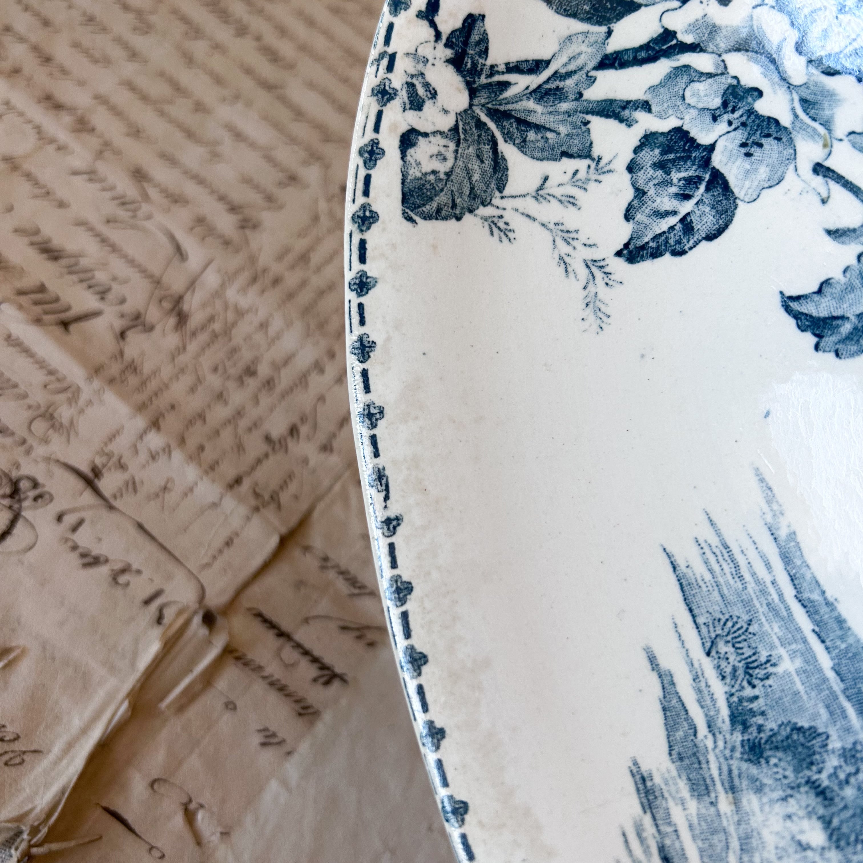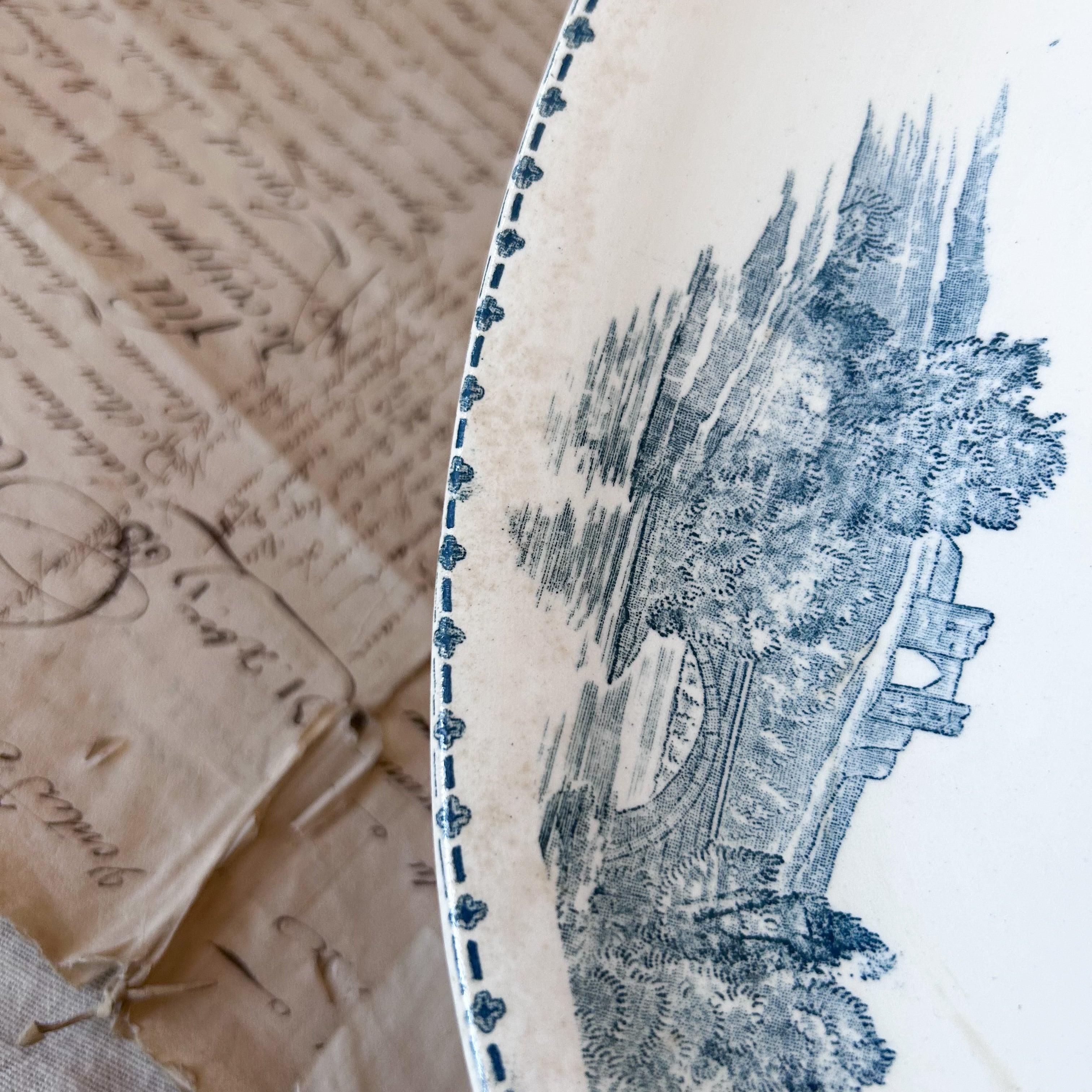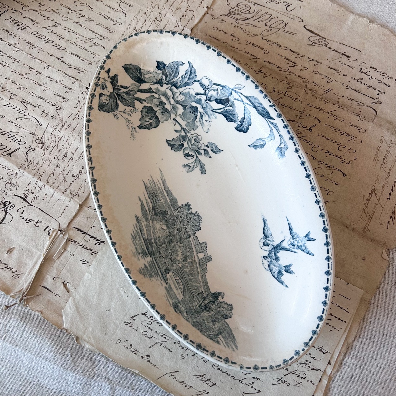 静かな田園の風景と、可憐な鳥や花々が淡いブルーで描かれた、ロンウィによる詩情豊かな一枚。空を舞う鳥たち、枝にとまる小鳥、遠くに見える教会の塔や家々など、物語の一場面のような情景が、余白を活かして美しく配置されています。縁の点描風の装飾が全体を引き締めたデザインです。テーブルコーディネートの主役にも、ディスプレイにも映えるアンティークプレートです。
