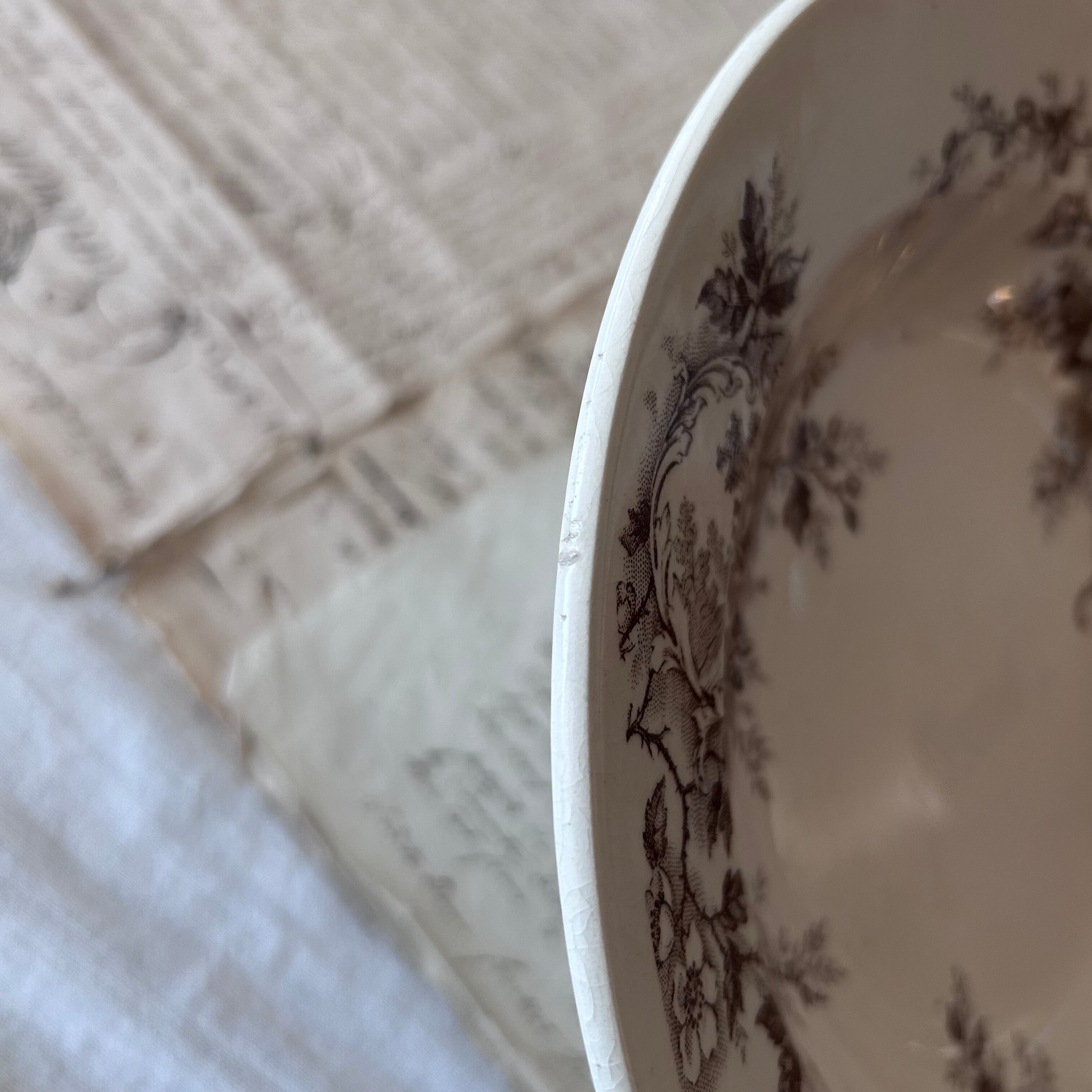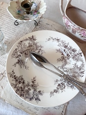 深みのあるブラウンで転写された花とロカイユ装飾、そして風景画が織り込まれた優雅なプレートです。クラシカルな花のブーケやスクロールの中に田園風景が描かれ、まるで絵画を切り取ったかのような芸術性を感じさせます。繊細な花々と柔らかな陶肌の組み合わせが、19世紀フランスのサロン文化を彷彿とさせる一枚。この「Pompadour (ポンパドール)」は、ショワジールロワを代表するデザインのひとつであり、コレクターや愛好家の間でも人気の高いシリーズとして知られています。飾っても使っても華やかさを添える、大変魅力的なお品です。