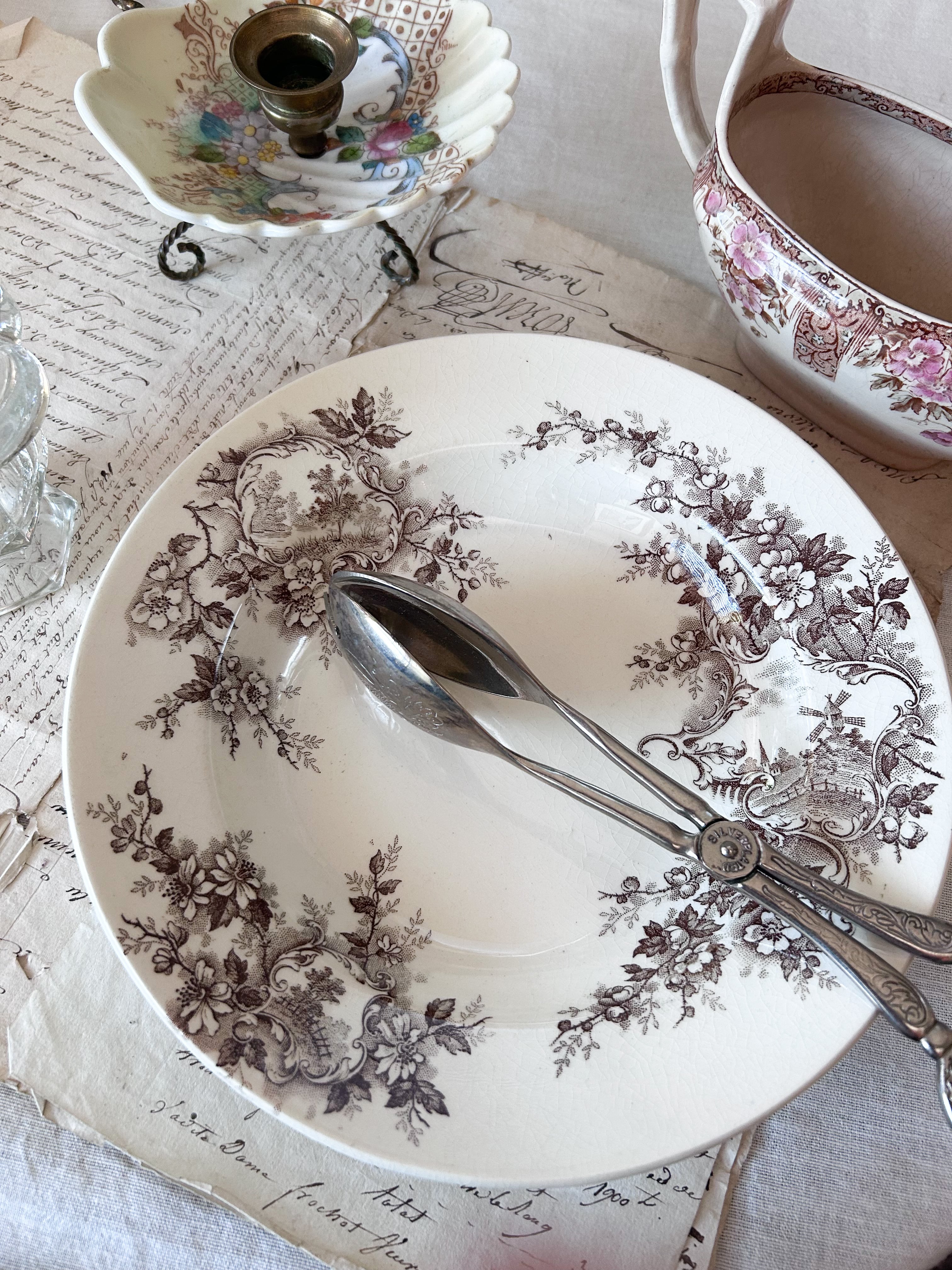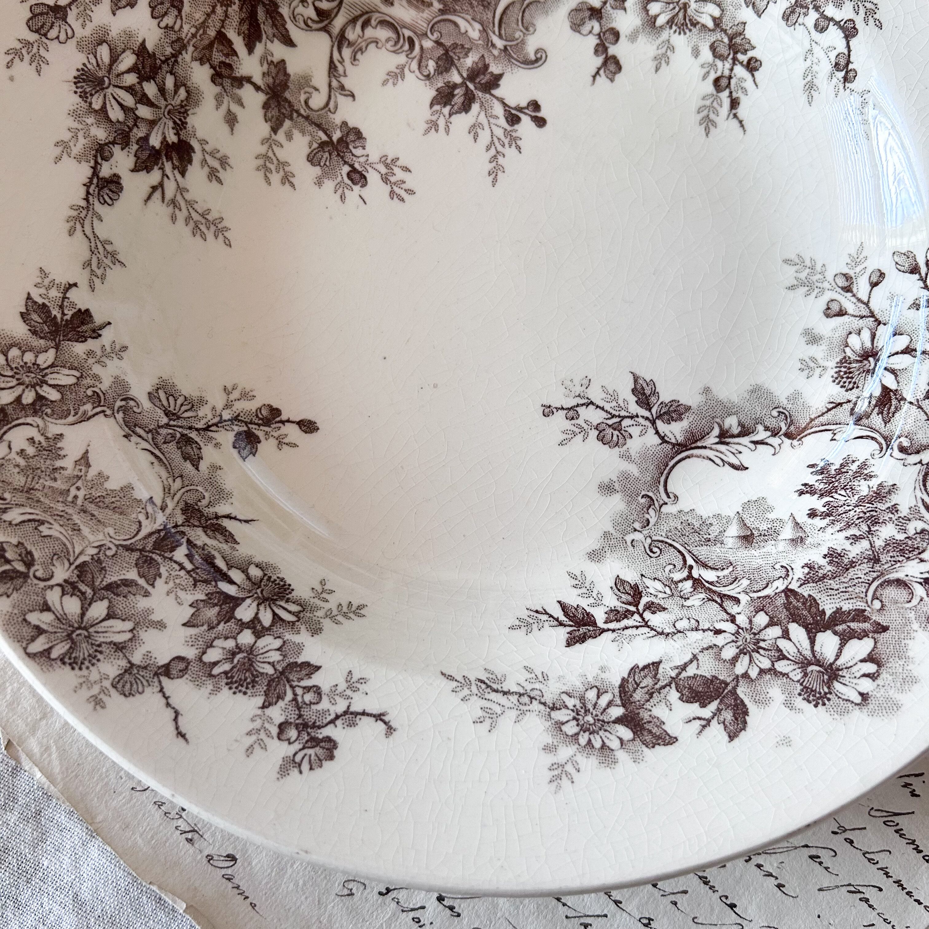 深みのあるブラウンで転写された花とロカイユ装飾、そして風景画が織り込まれた優雅なプレートです。クラシカルな花のブーケやスクロールの中に田園風景が描かれ、まるで絵画を切り取ったかのような芸術性を感じさせます。繊細な花々と柔らかな陶肌の組み合わせが、19世紀フランスのサロン文化を彷彿とさせる一枚。この「Pompadour (ポンパドール)」は、ショワジールロワを代表するデザインのひとつであり、コレクターや愛好家の間でも人気の高いシリーズとして知られています。飾っても使っても華やかさを添える、大変魅力的なお品です。