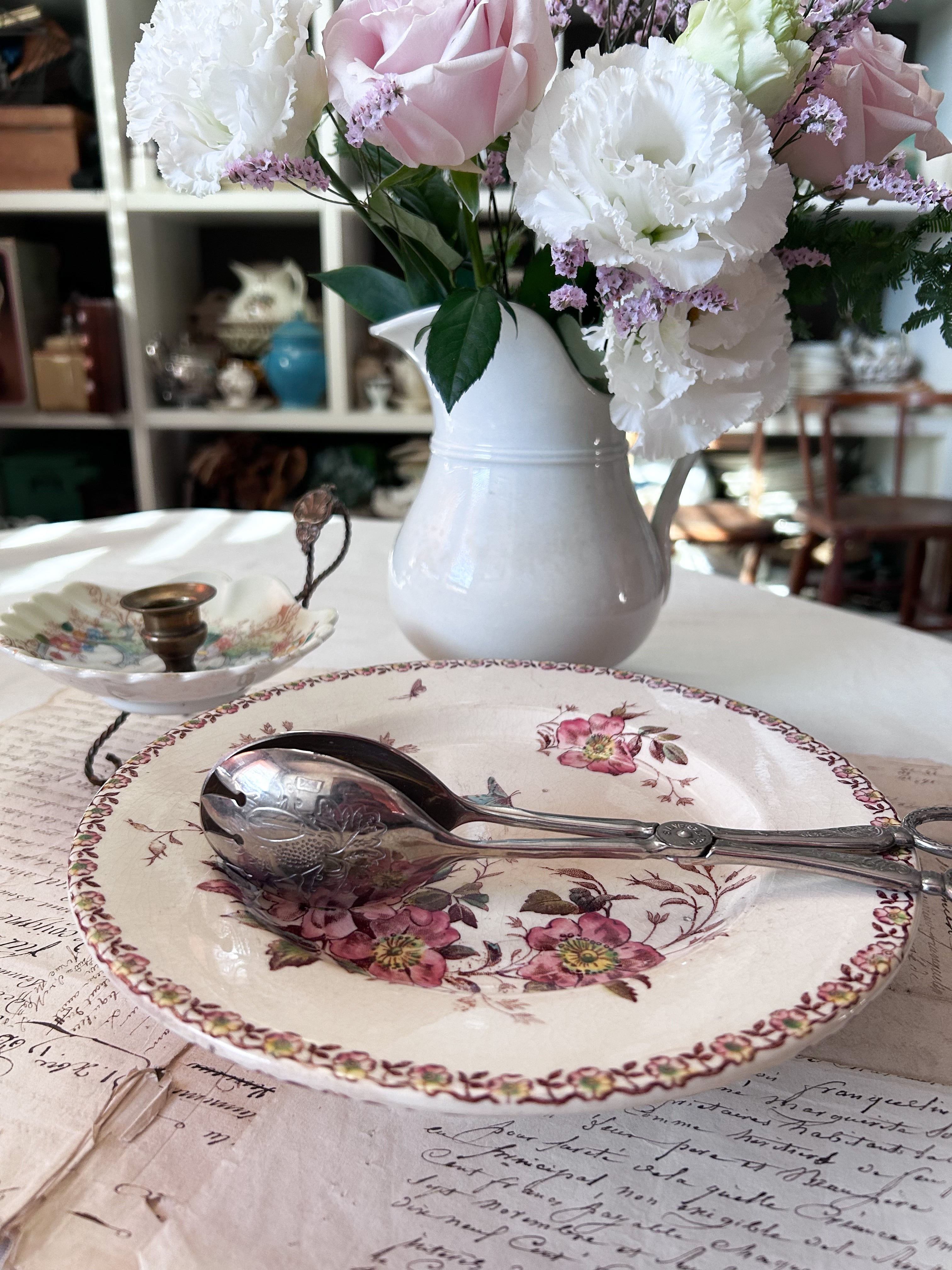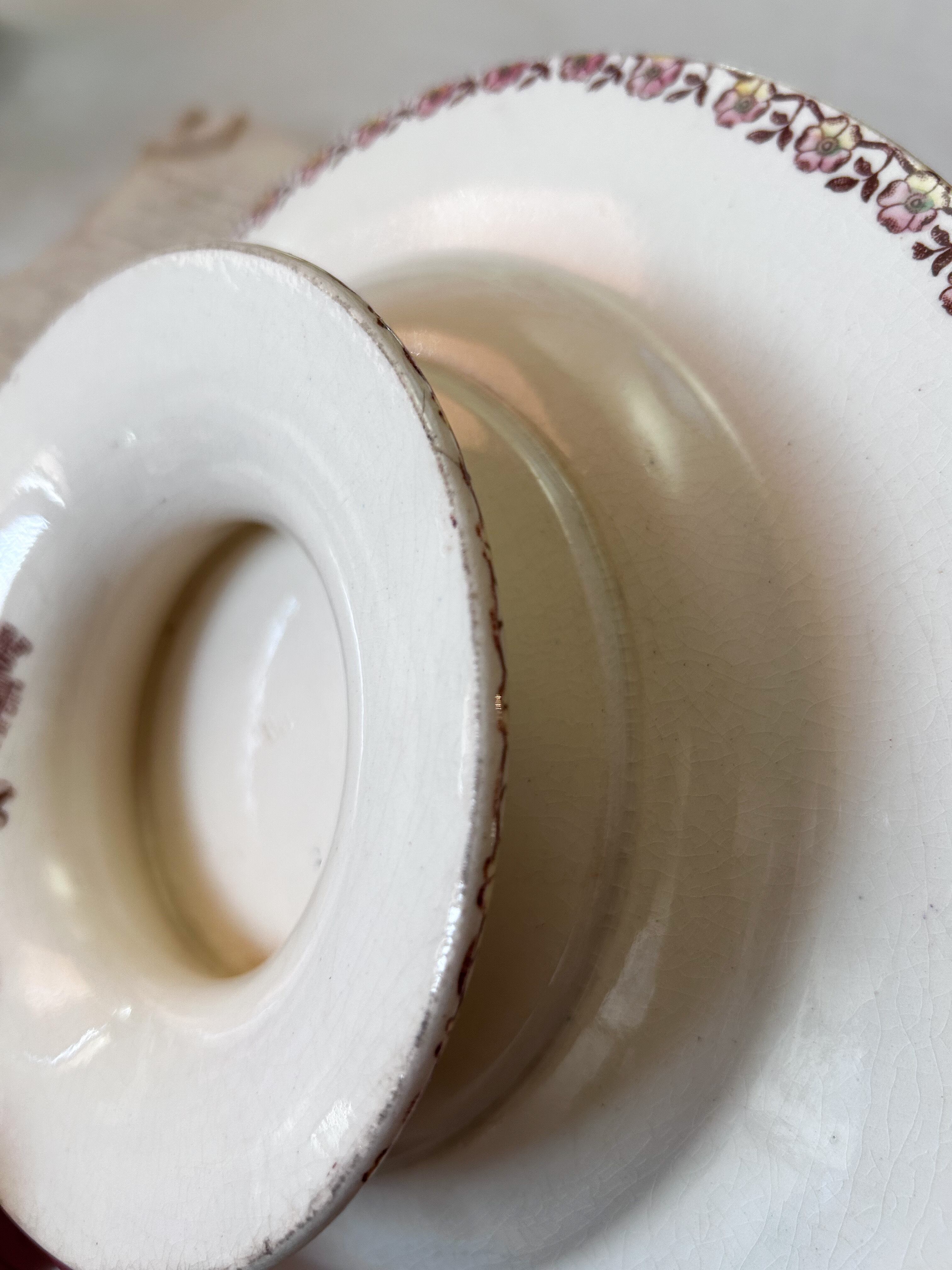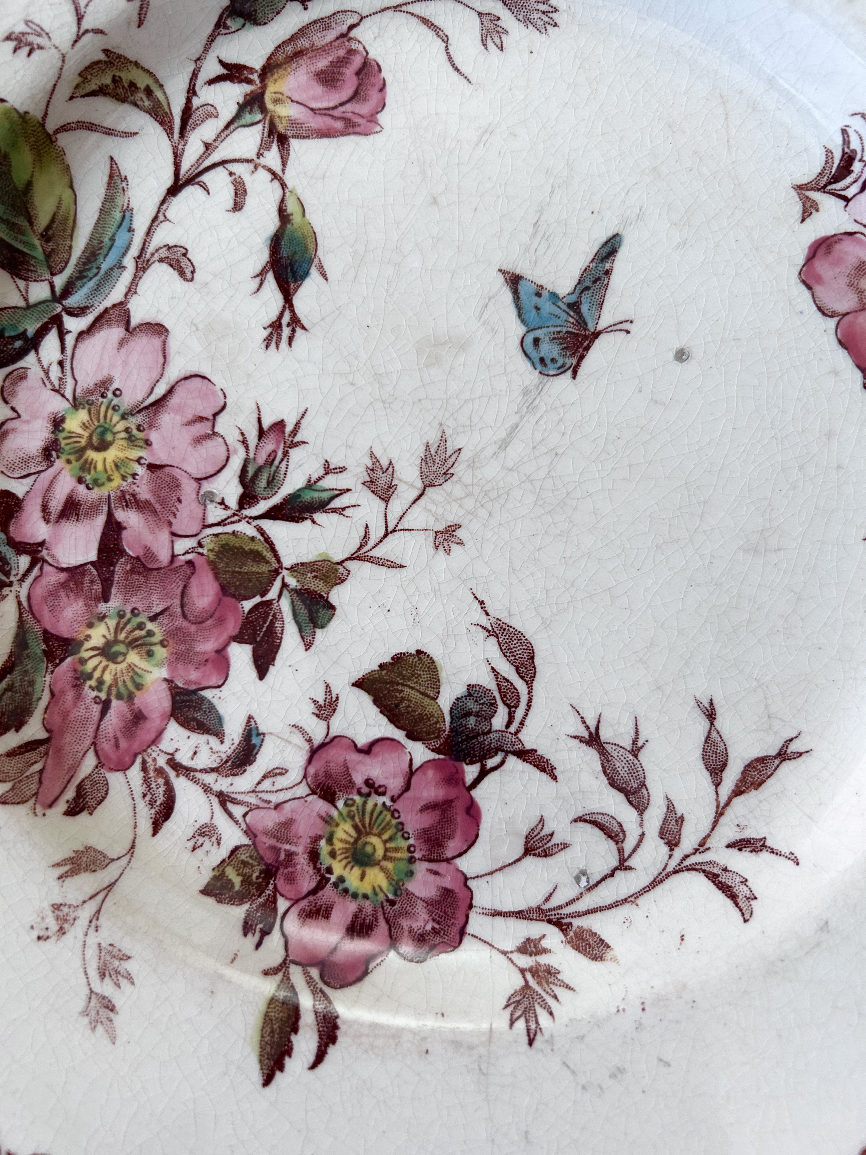 低めで安定感のあるフォルムが美しい、ジアンのコンポティエ。柔らかな生成りの陶肌に、可憐な野ばらと蝶が舞う大変レアな多彩色の絵柄があしらわれ、春の庭のような伸びやかな世界が広がります。フルーツやお菓子、アクセサリートレイとしても絵になりますし、ディスプレイとして飾るだけでも存在感のある一台。