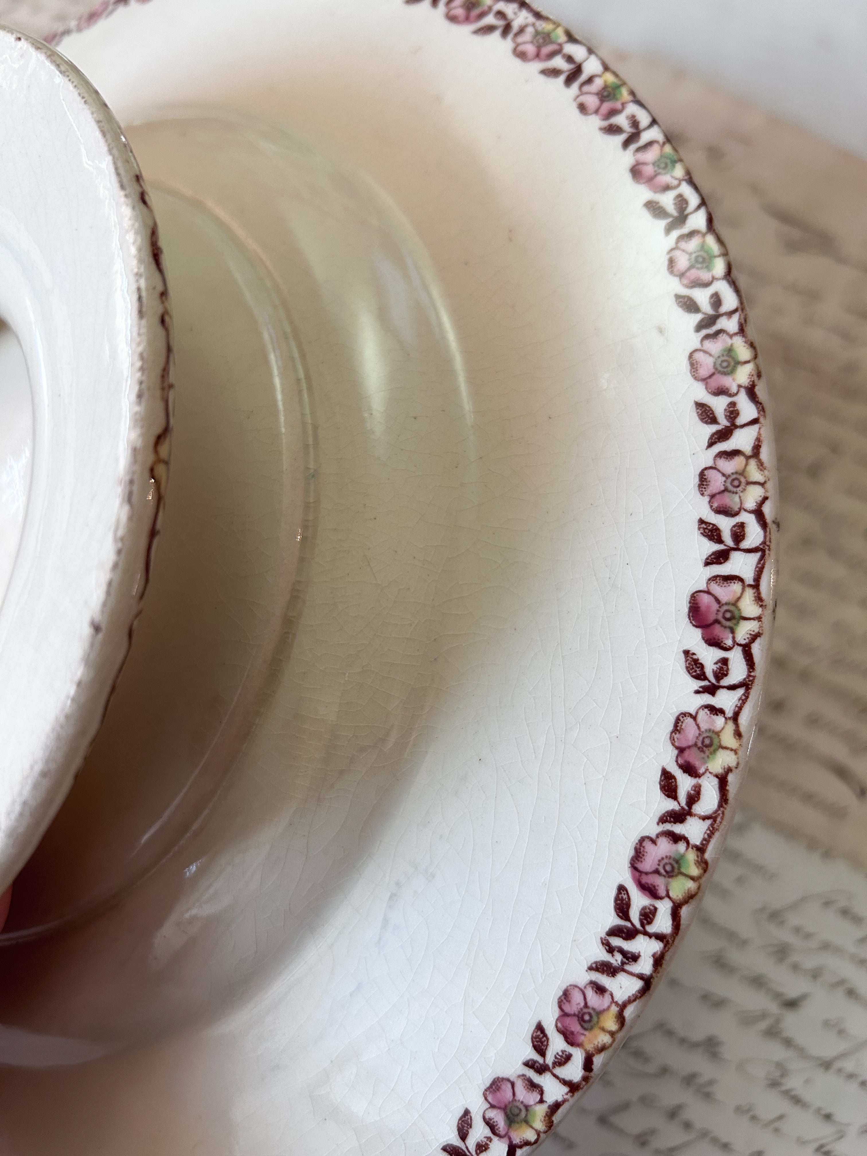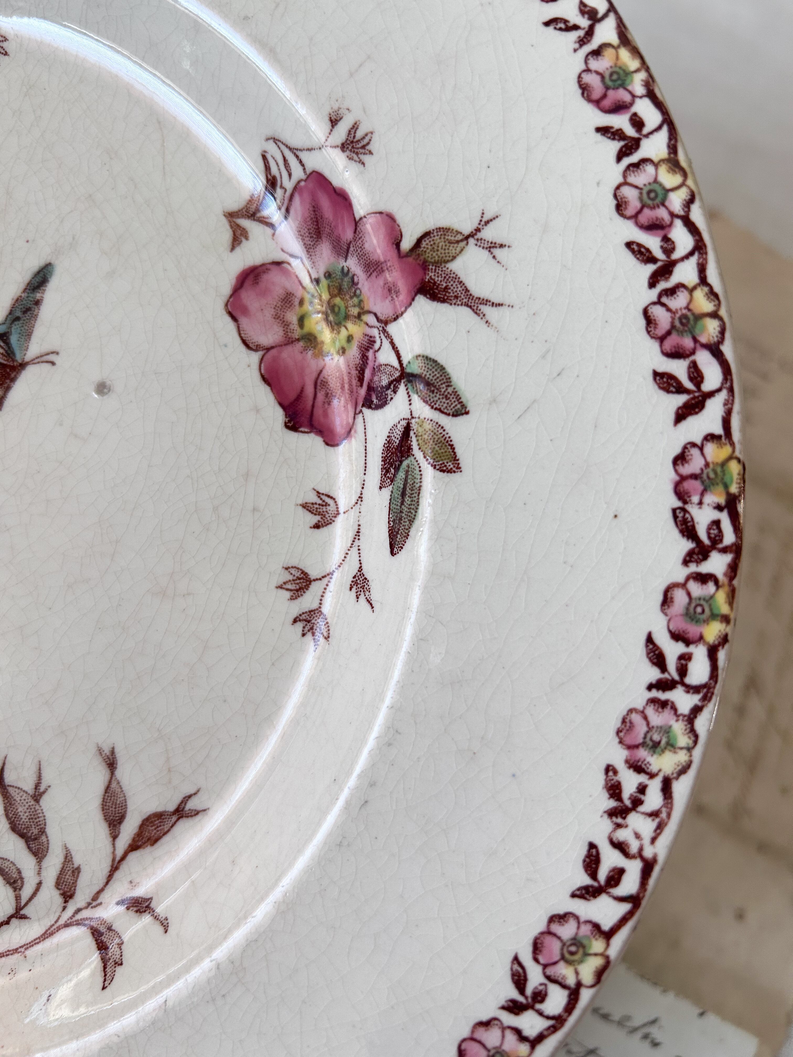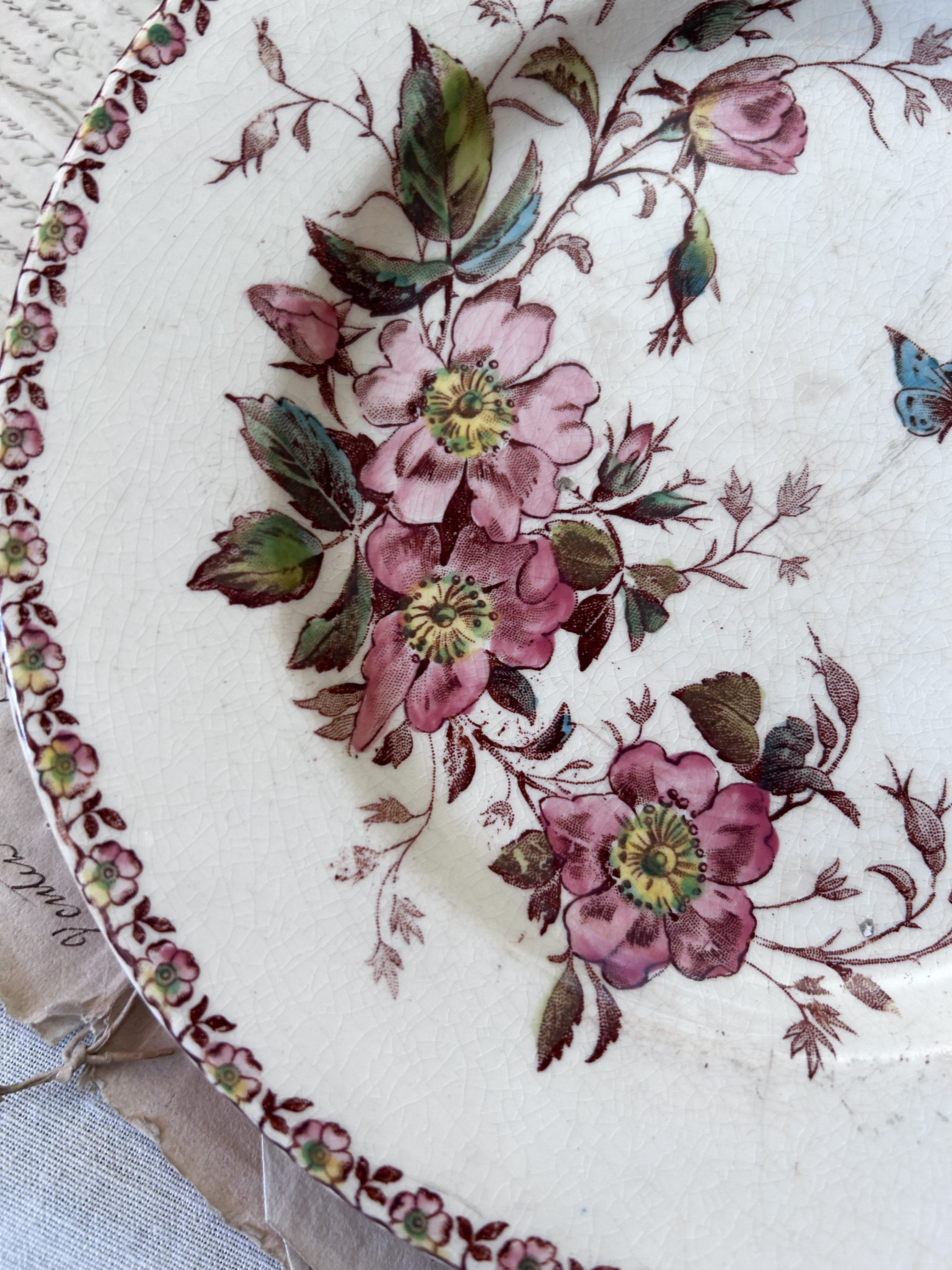低めで安定感のあるフォルムが美しい、ジアンのコンポティエ。柔らかな生成りの陶肌に、可憐な野ばらと蝶が舞う大変レアな多彩色の絵柄があしらわれ、春の庭のような伸びやかな世界が広がります。フルーツやお菓子、アクセサリートレイとしても絵になりますし、ディスプレイとして飾るだけでも存在感のある一台。