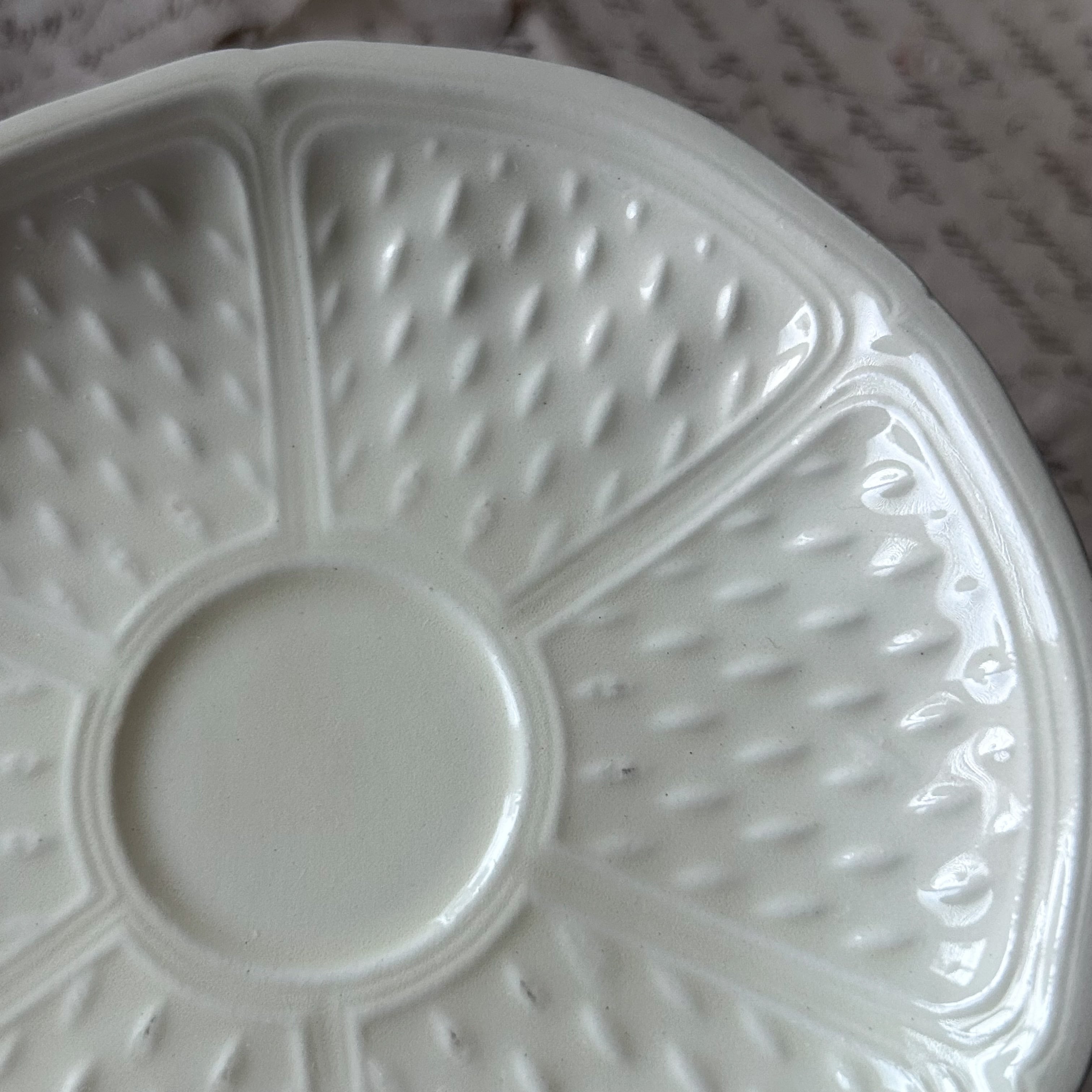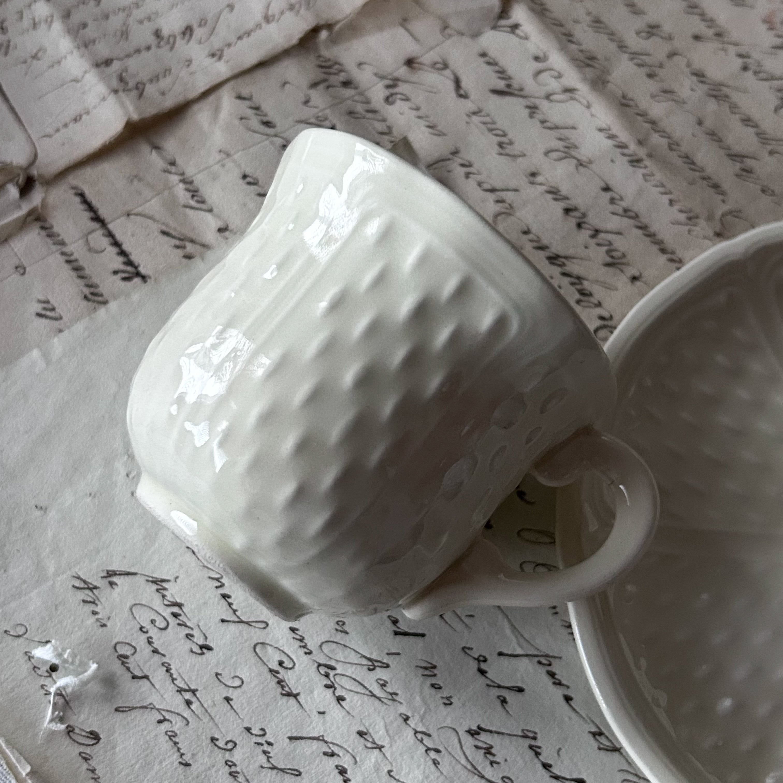 表面に施された細かなレリーフは、お米の粒を思わせる繊細な装飾として親しまれ、古くからフランスで愛され続けてきました。やわらかな乳白色の陶肌と可憐な質感が醸し出す、静かな上品さが魅力の一品。小振りながら存在感があり、エスプレッソや濃いめの珈琲にぴったりのサイズです。