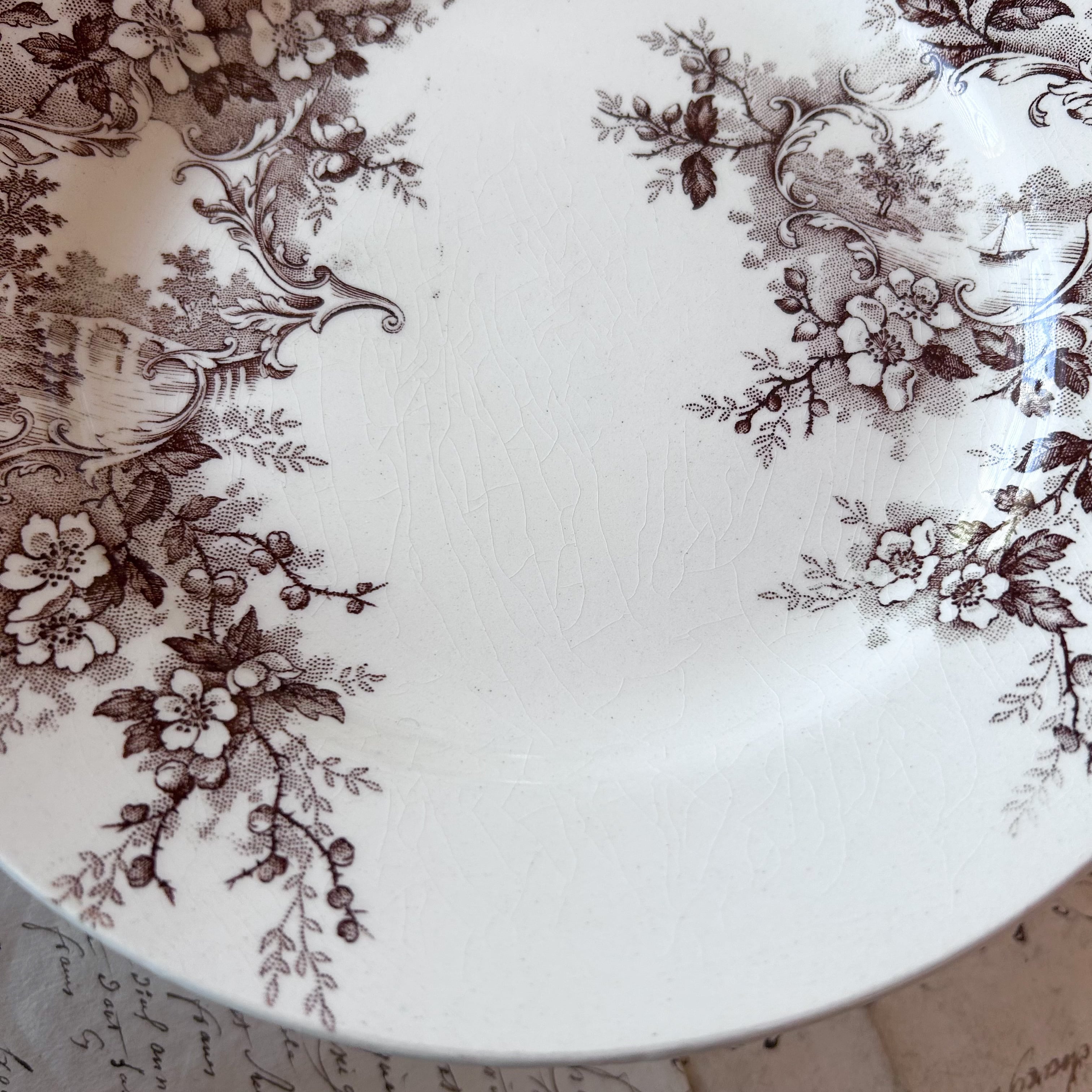 深みのあるブラウンで転写された花とロカイユ装飾、そして風景画が織り込まれた優雅なプレートです。クラシカルな花のブーケやスクロールの中に田園風景が描かれ、まるで絵画を切り取ったかのような芸術性を感じさせます。繊細な花々と柔らかな陶肌の組み合わせが、19世紀フランスのサロン文化を彷彿とさせる一枚。この「Pompadour (ポンパドール)」は、ショワジールロワを代表するデザインのひとつであり、コレクターや愛好家の間でも人気の高いシリーズとして知られています。飾っても使っても華やかさを添える、大変魅力的なお品です。