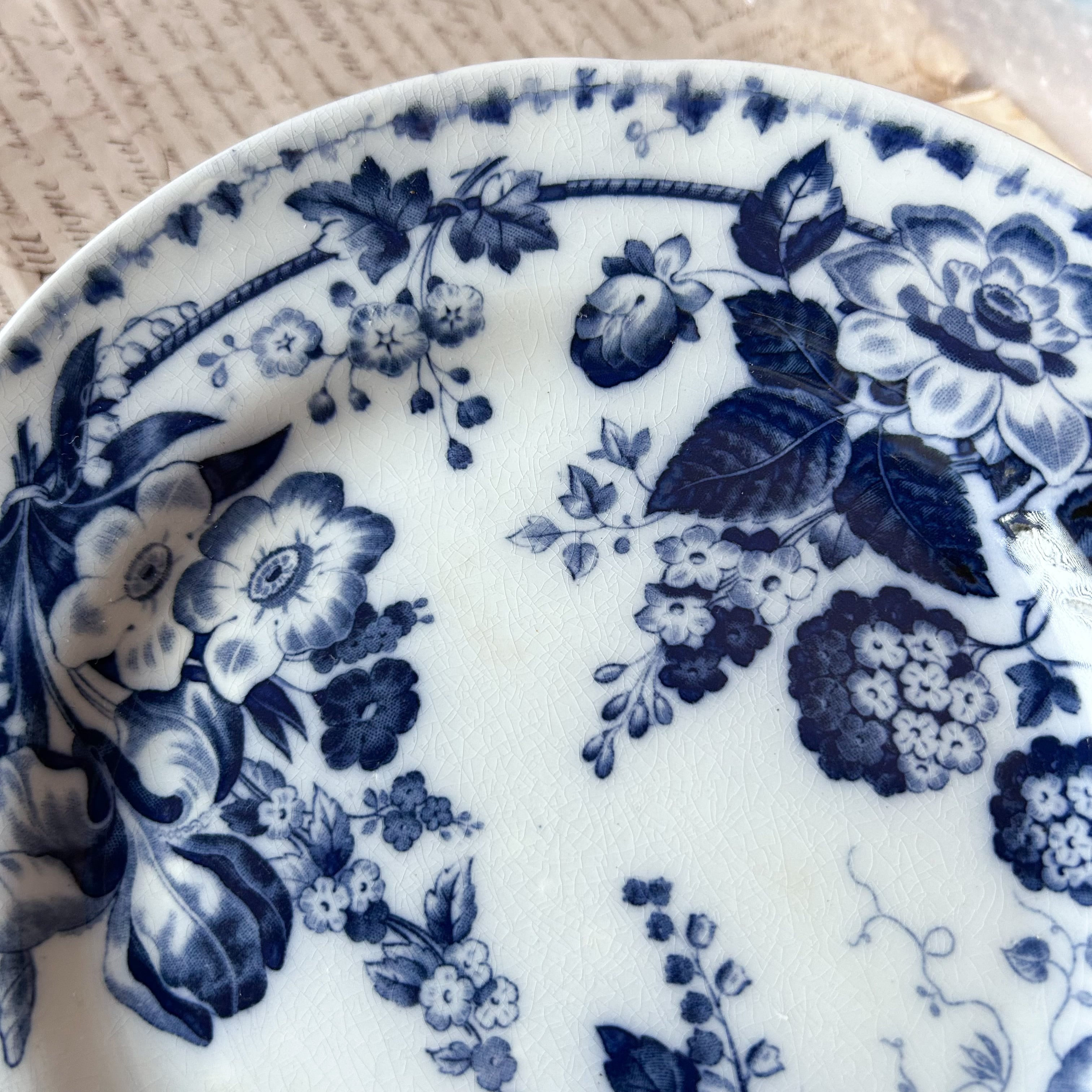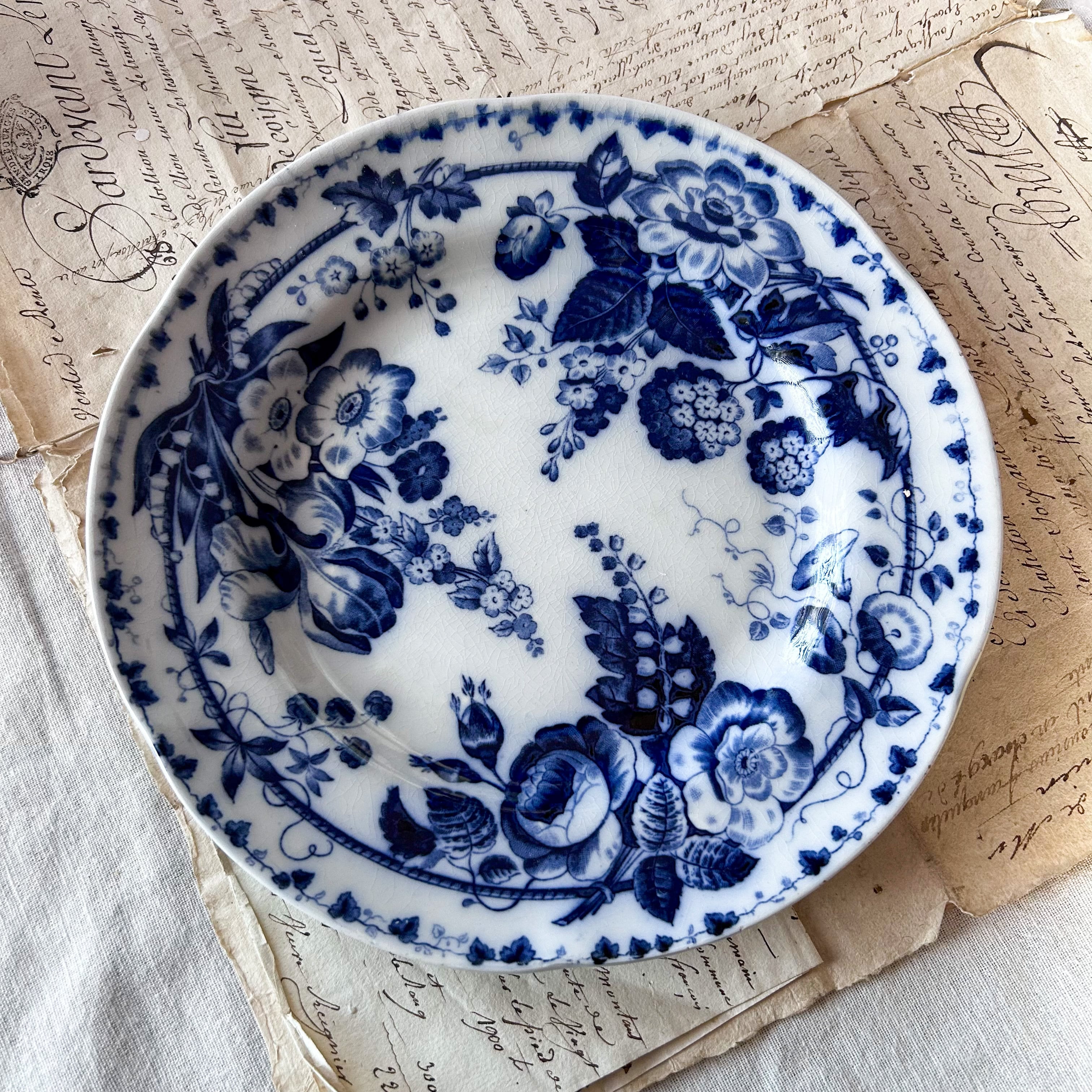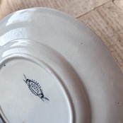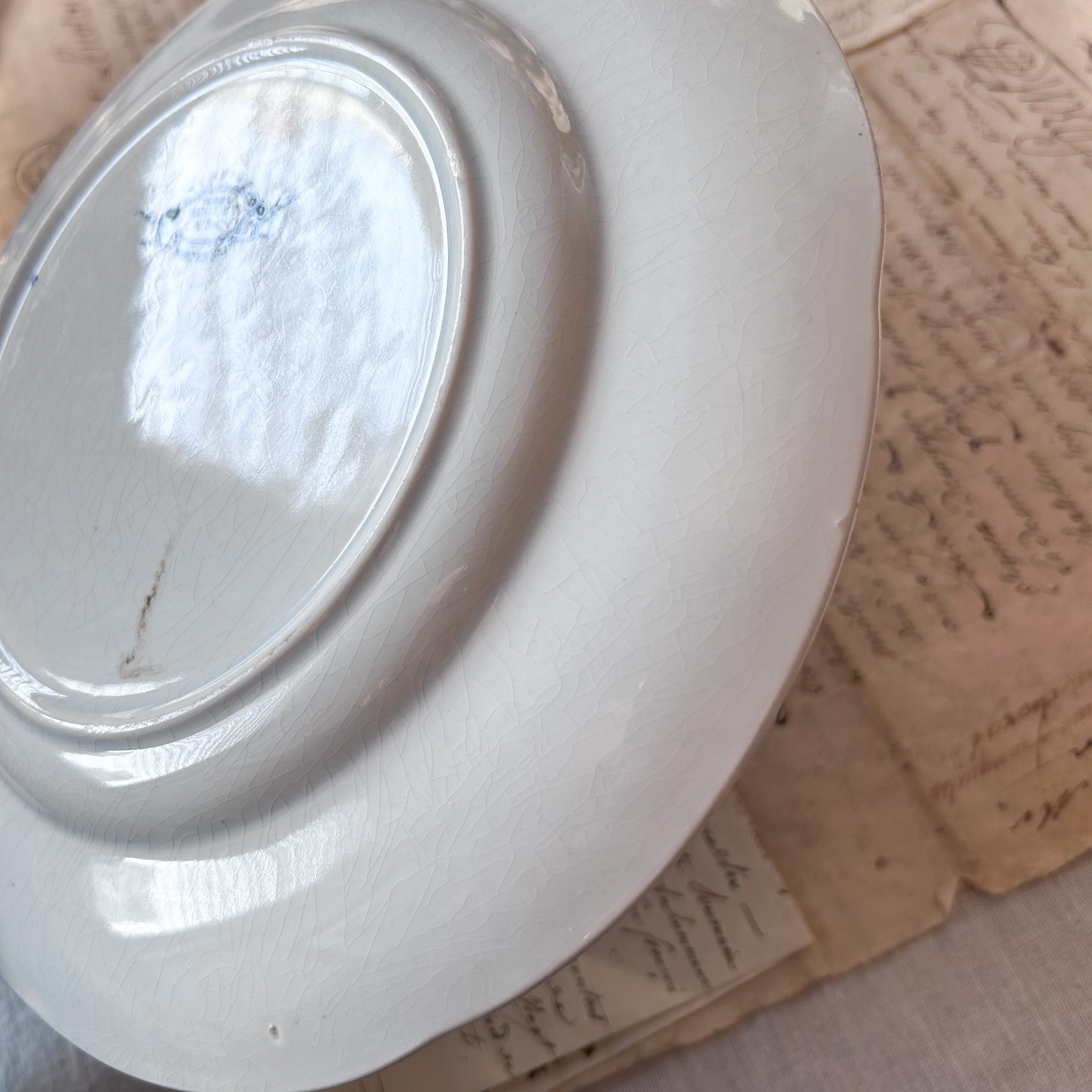 深みのあるブルーでミュゲなどの花々が描かれた、クレイユ・エ・モントローの“FLORA”シリーズのプレートです。精密な転写技法により表現されたボタニカルモチーフは、19世紀フランスの自然主義的美意識を感じさせます。柔らかな白色の陶肌にブルーの発色が映え、テーブルに優雅な陰影を添えてくれます。ディスプレイとして飾っても美しく、古いリネンや銀器、また和食器との相性も抜群です。