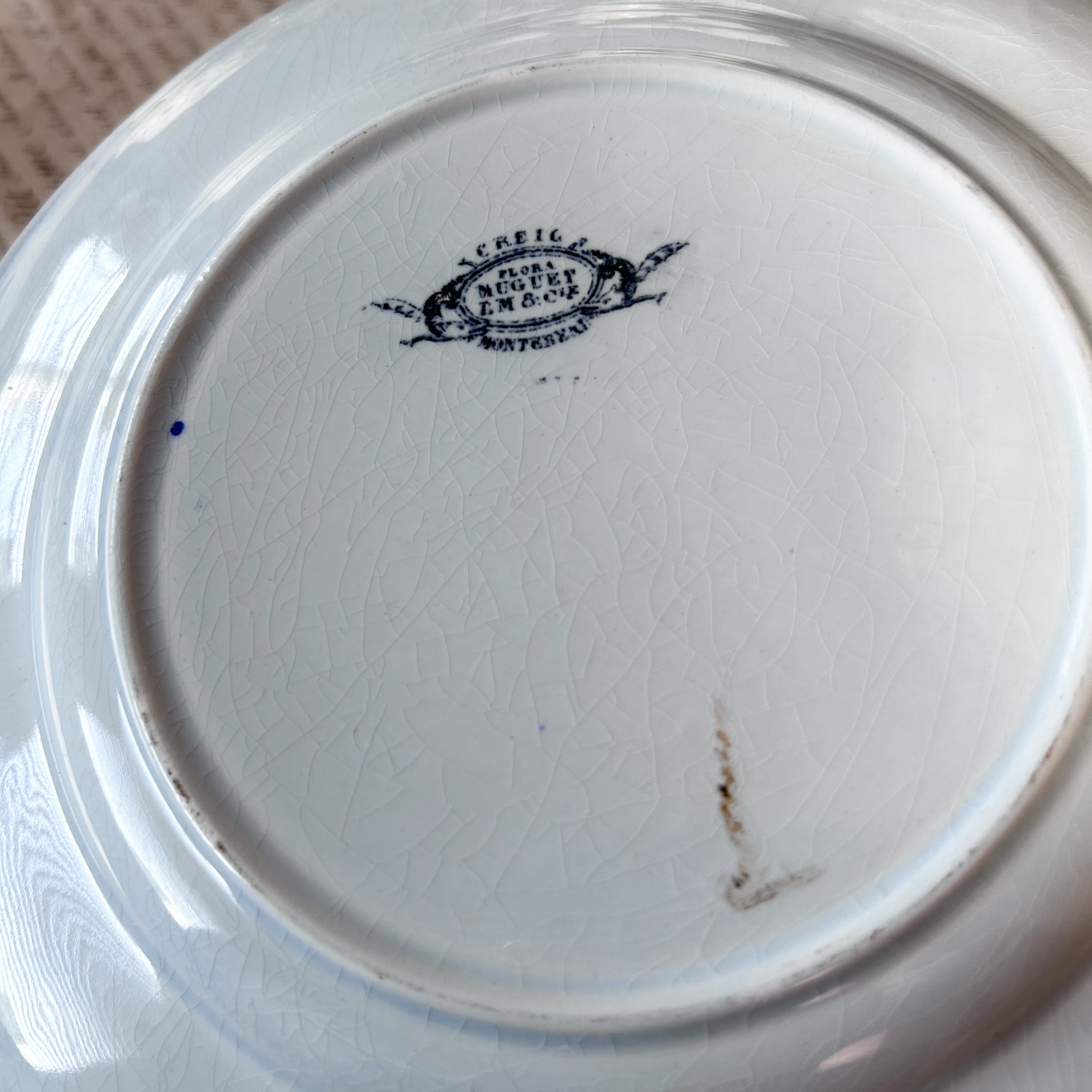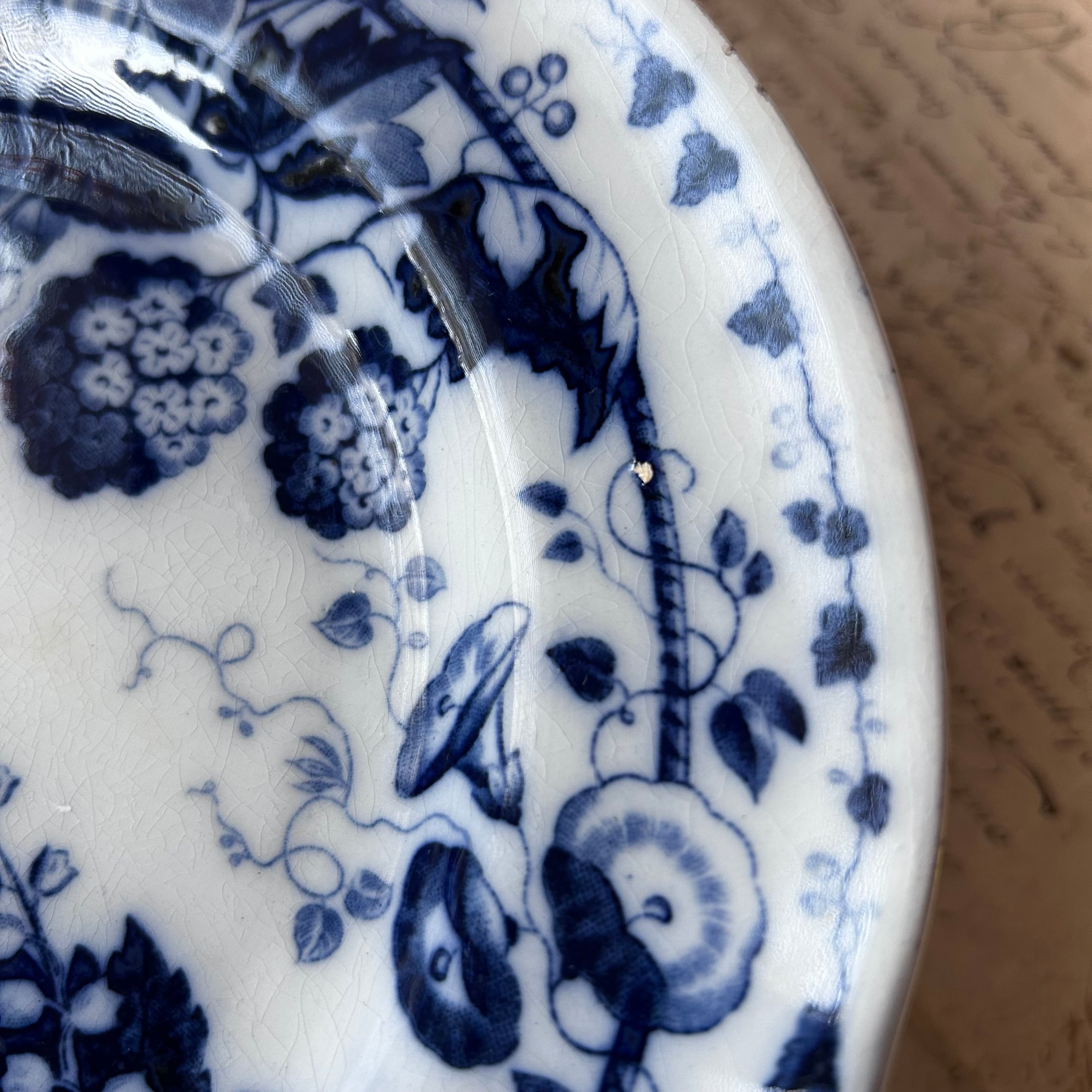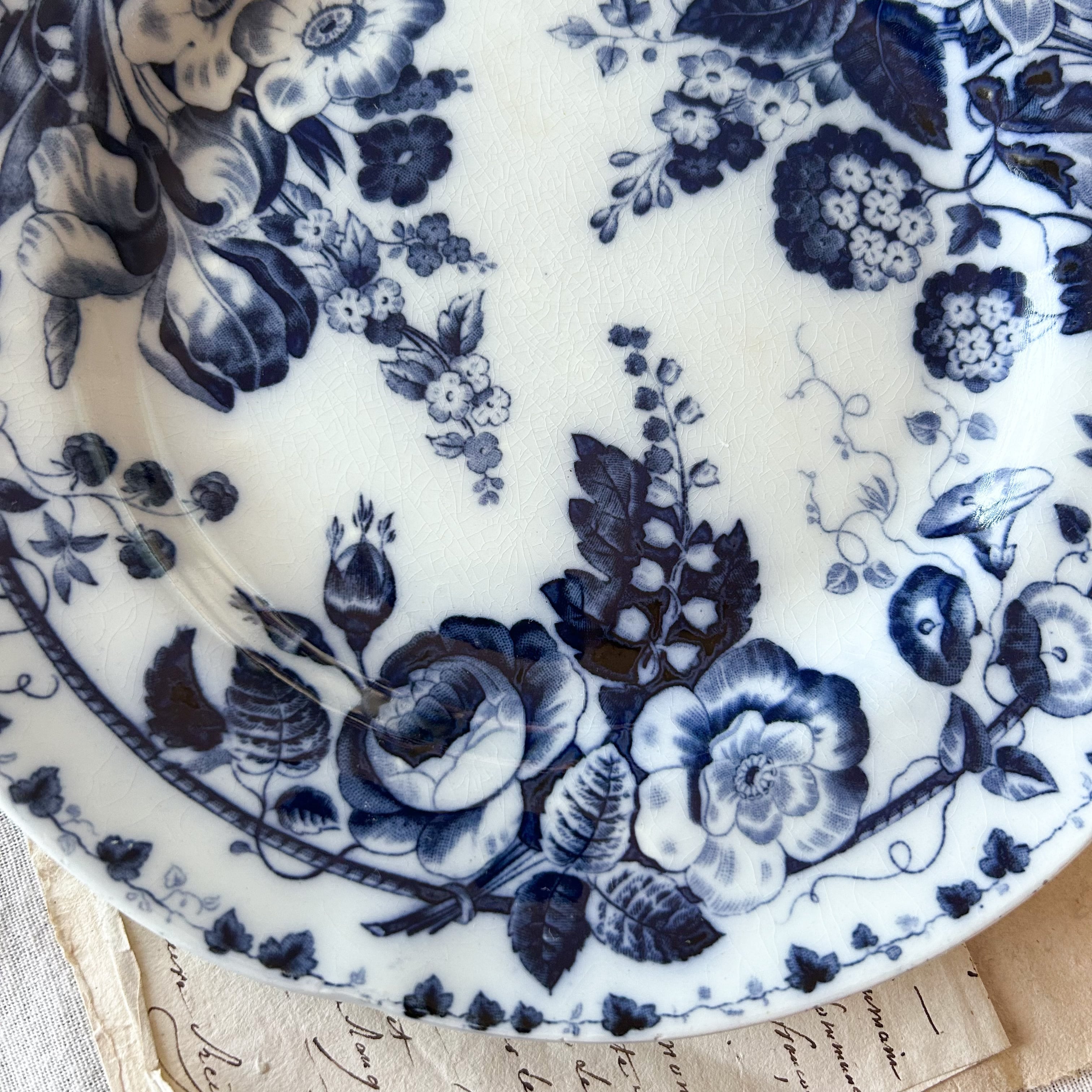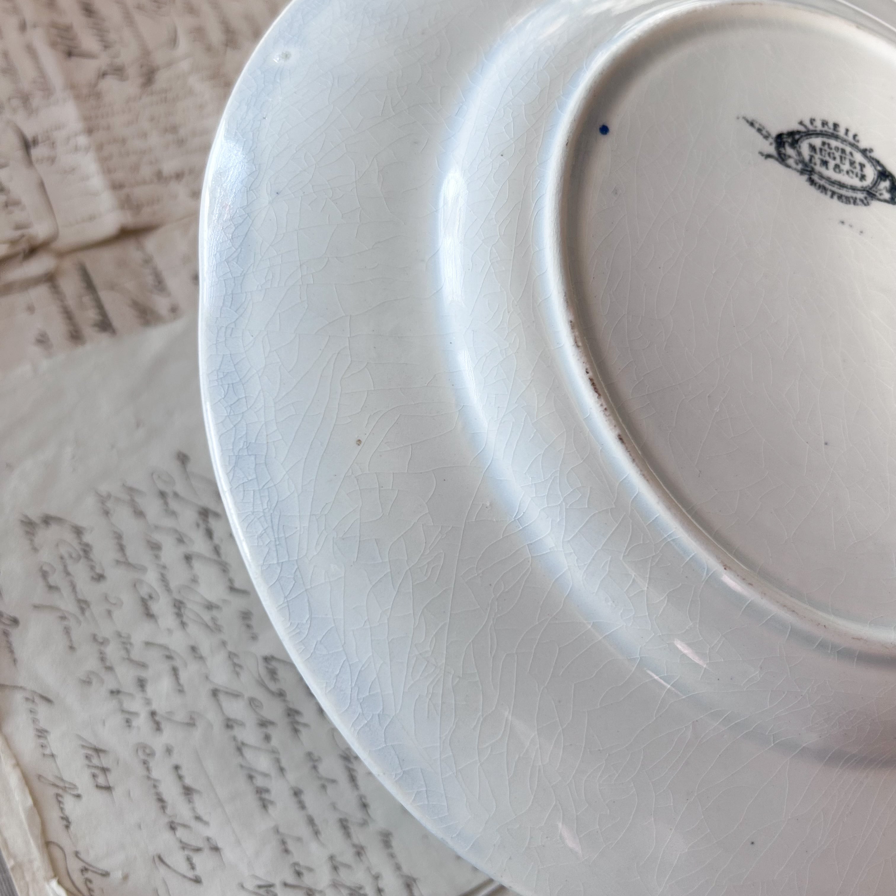 深みのあるブルーでミュゲなどの花々が描かれた、クレイユ・エ・モントローの“FLORA”シリーズのプレートです。精密な転写技法により表現されたボタニカルモチーフは、19世紀フランスの自然主義的美意識を感じさせます。柔らかな白色の陶肌にブルーの発色が映え、テーブルに優雅な陰影を添えてくれます。ディスプレイとして飾っても美しく、古いリネンや銀器、また和食器との相性も抜群です。