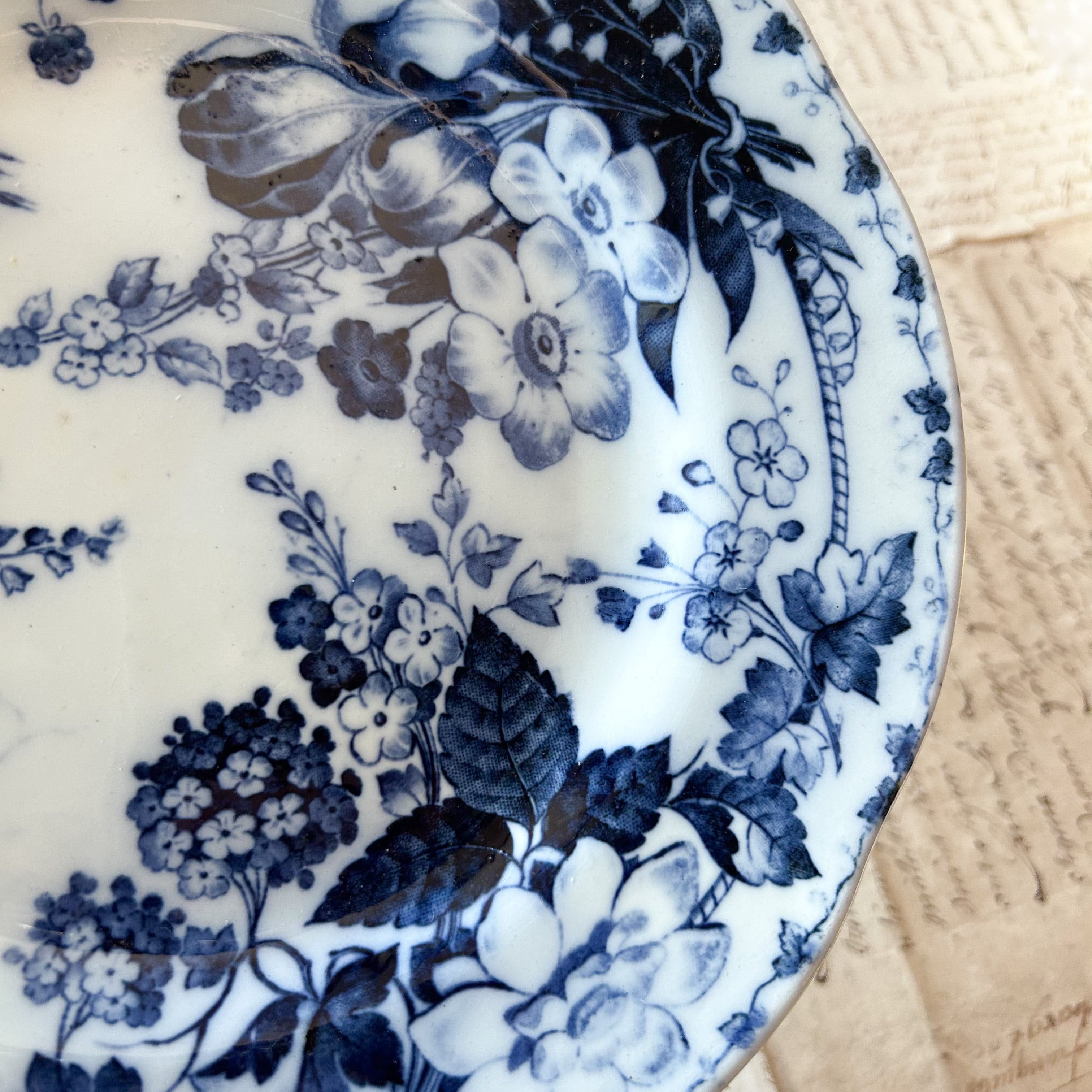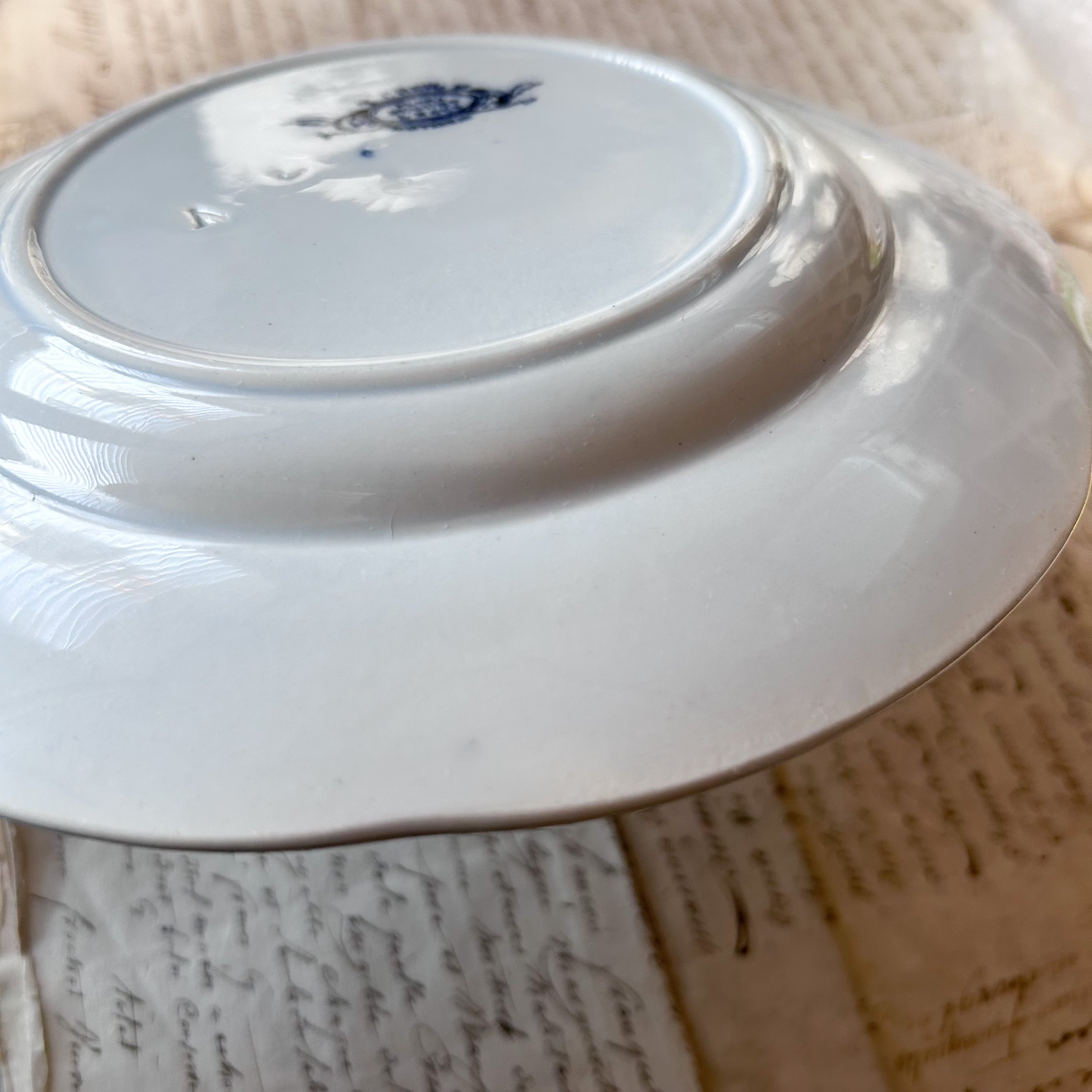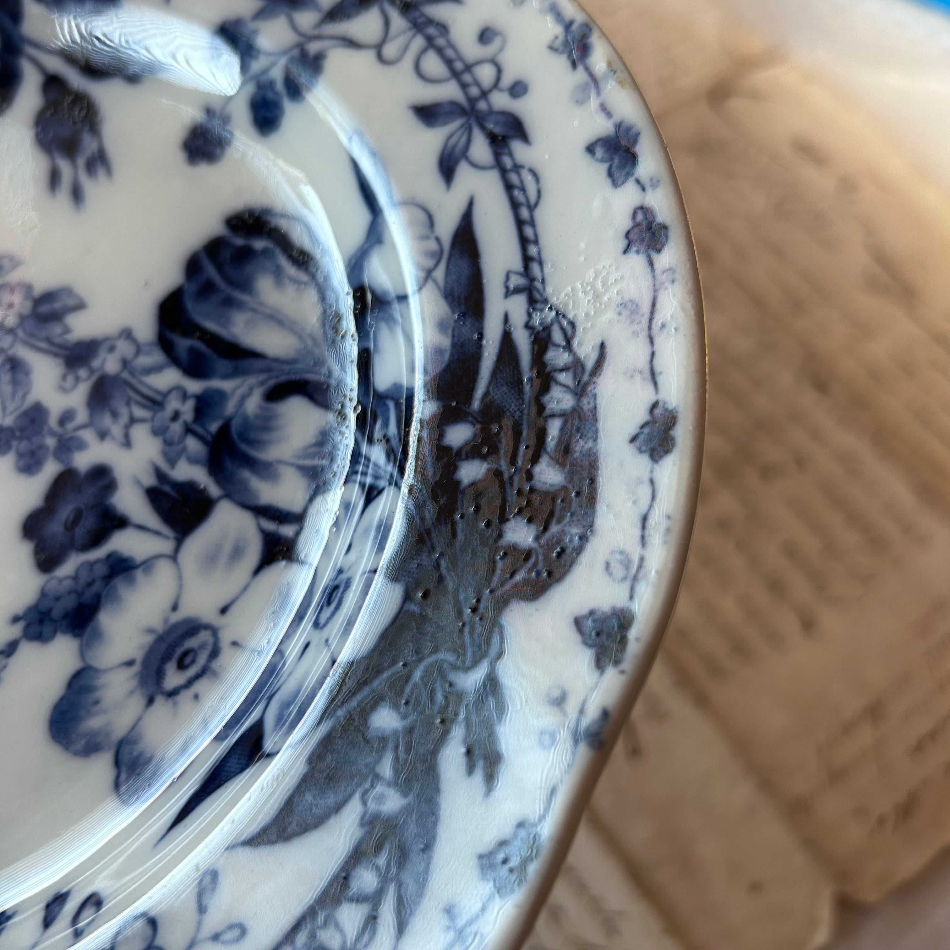 深みのあるブルーでミュゲなどの花々が描かれた、クレイユ・エ・モントローの“FLORA”シリーズのプレートです。精密な転写技法により表現されたボタニカルモチーフは、19世紀フランスの自然主義的美意識を感じさせます。柔らかな白色の陶肌にブルーの発色が映え、テーブルに優雅な陰影を添えてくれます。ディスプレイとして飾っても美しく、古いリネンや銀器、また和食器との相性も抜群です。