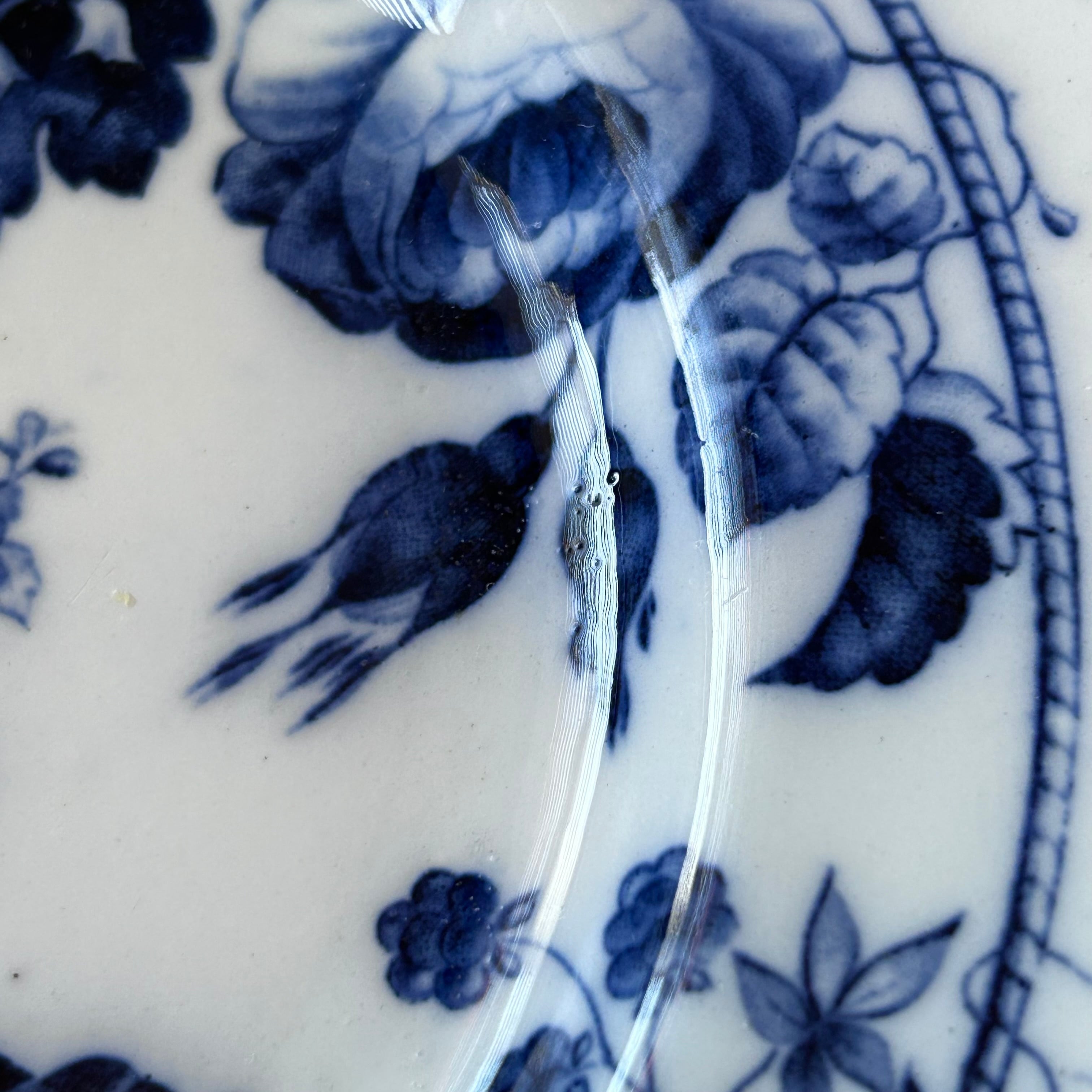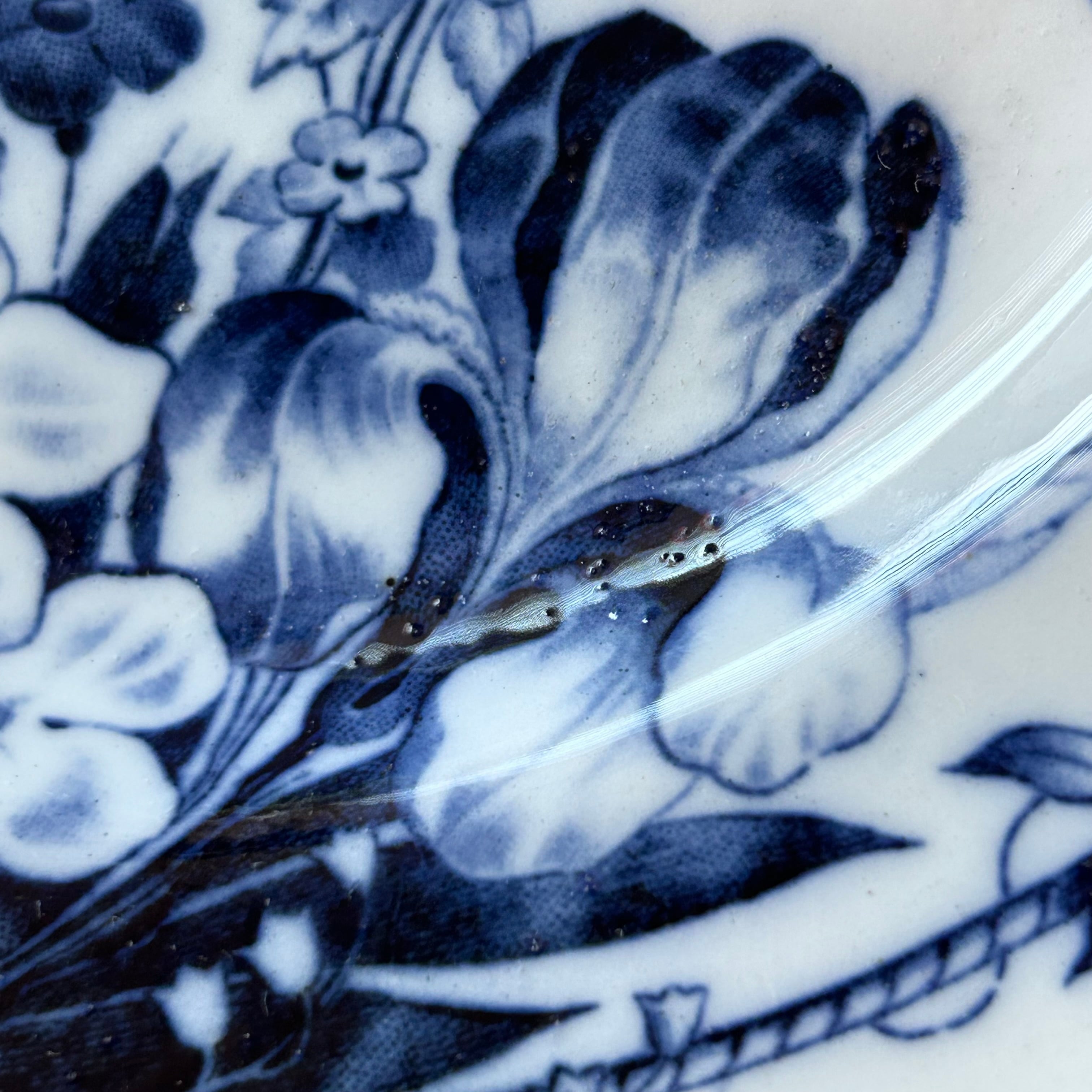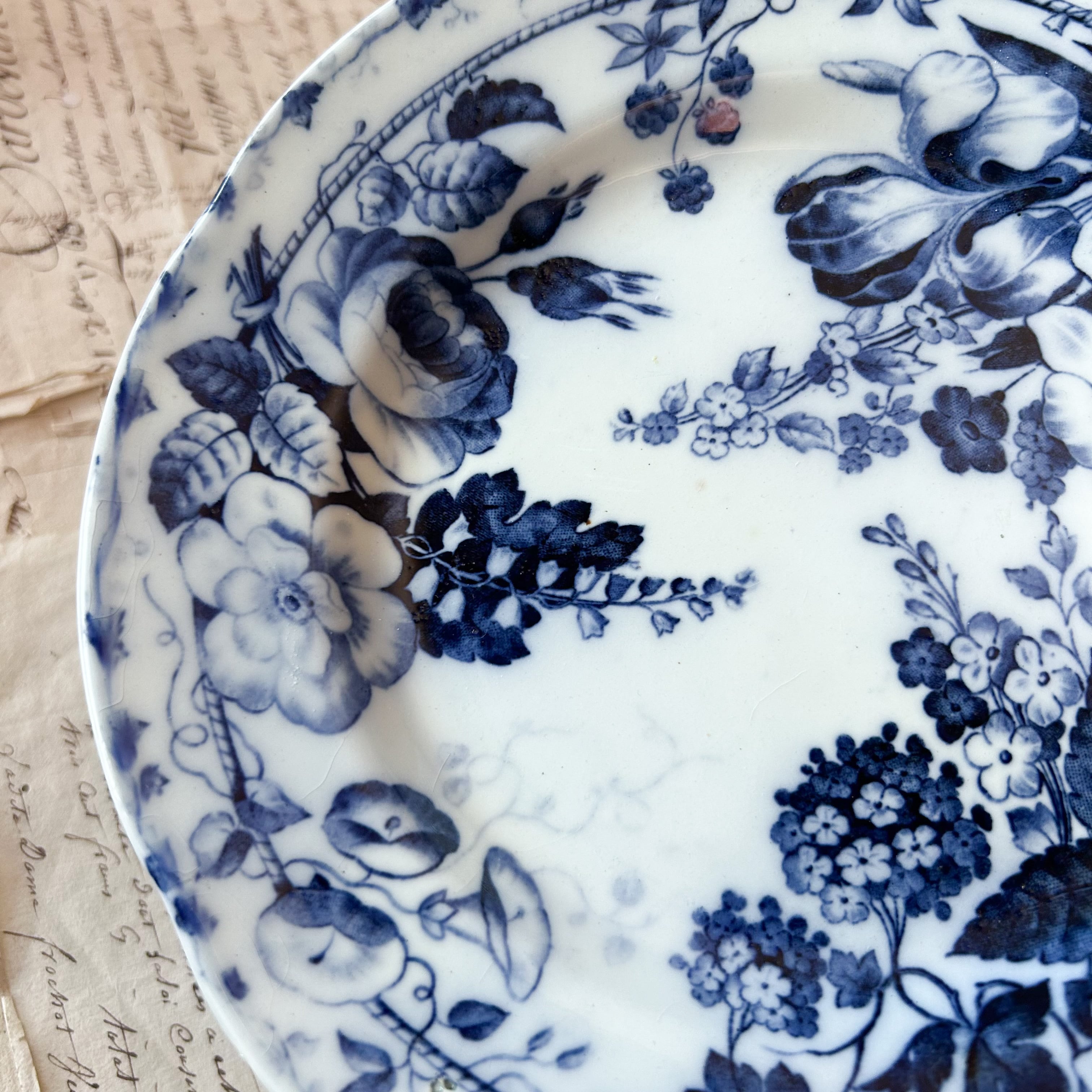 深みのあるブルーでミュゲなどの花々が描かれた、クレイユ・エ・モントローの“FLORA”シリーズのプレートです。精密な転写技法により表現されたボタニカルモチーフは、19世紀フランスの自然主義的美意識を感じさせます。柔らかな白色の陶肌にブルーの発色が映え、テーブルに優雅な陰影を添えてくれます。ディスプレイとして飾っても美しく、古いリネンや銀器、また和食器との相性も抜群です。