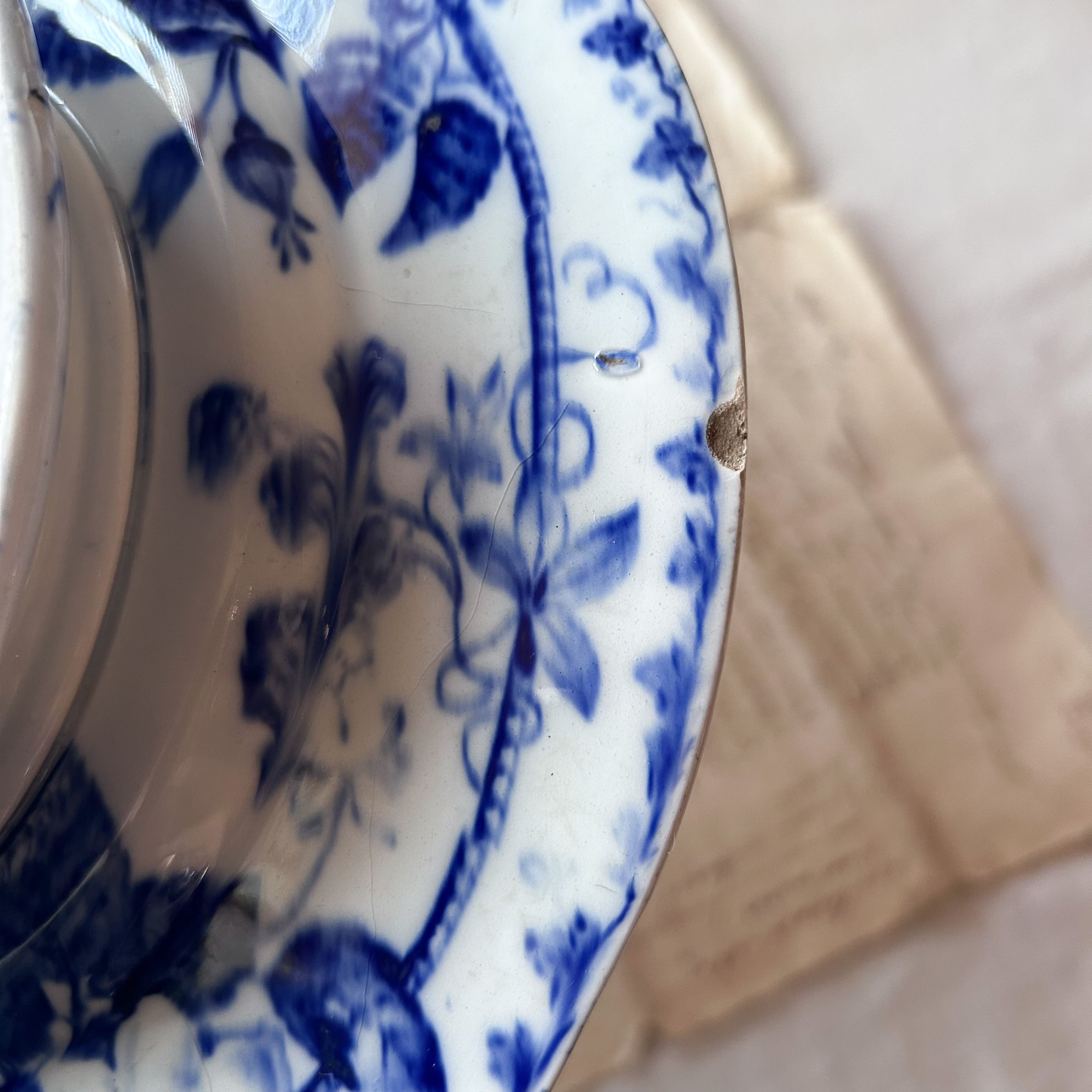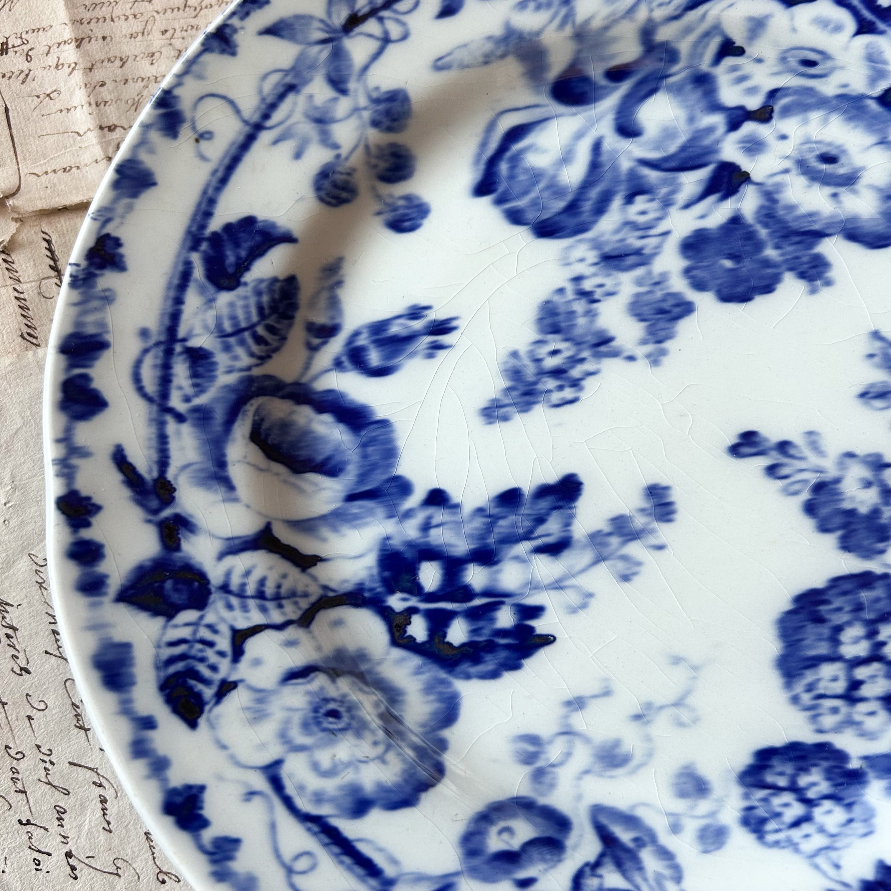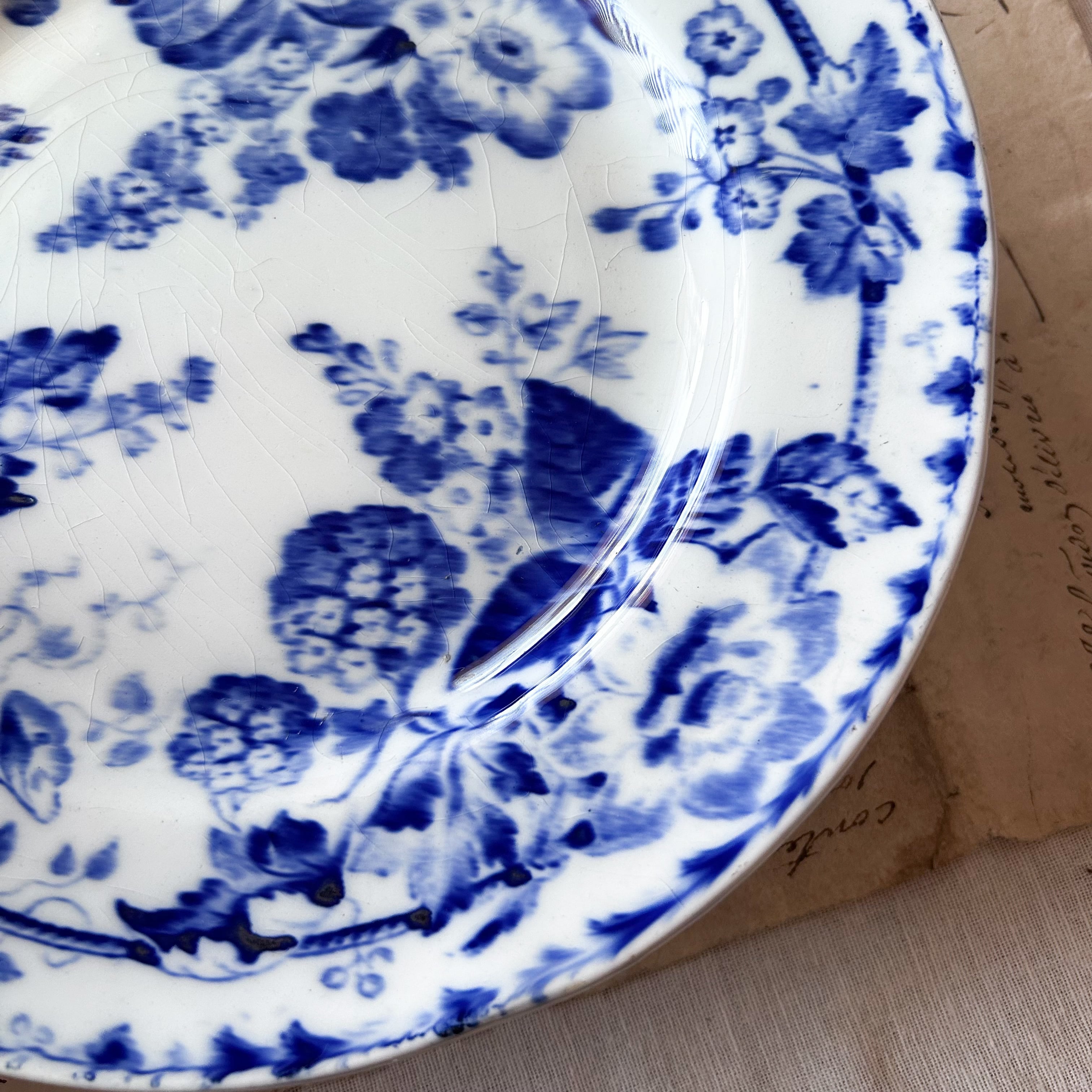 深みのあるブルーでミュゲなどの花々が描かれた、クレイユ・エ・モントローの“FLORA”シリーズのプレートです。精密な転写技法により表現されたボタニカルモチーフは、19世紀フランスの自然主義的美意識を感じさせます。柔らかな白色の陶肌にブルーの発色が映え、テーブルに優雅な陰影を添えてくれます。ディスプレイとして飾っても美しく、古いリネンや銀器、また和食器との相性も抜群です。