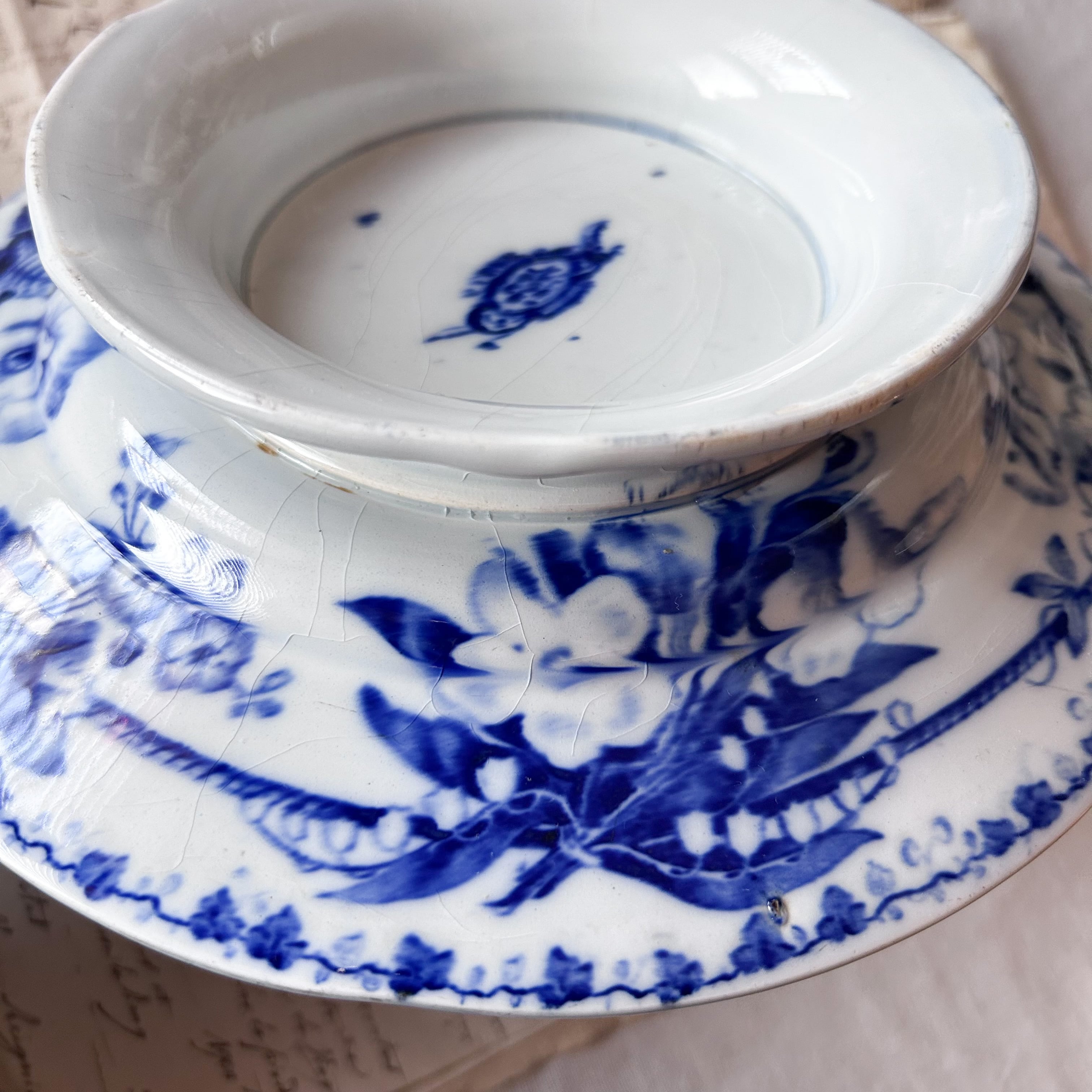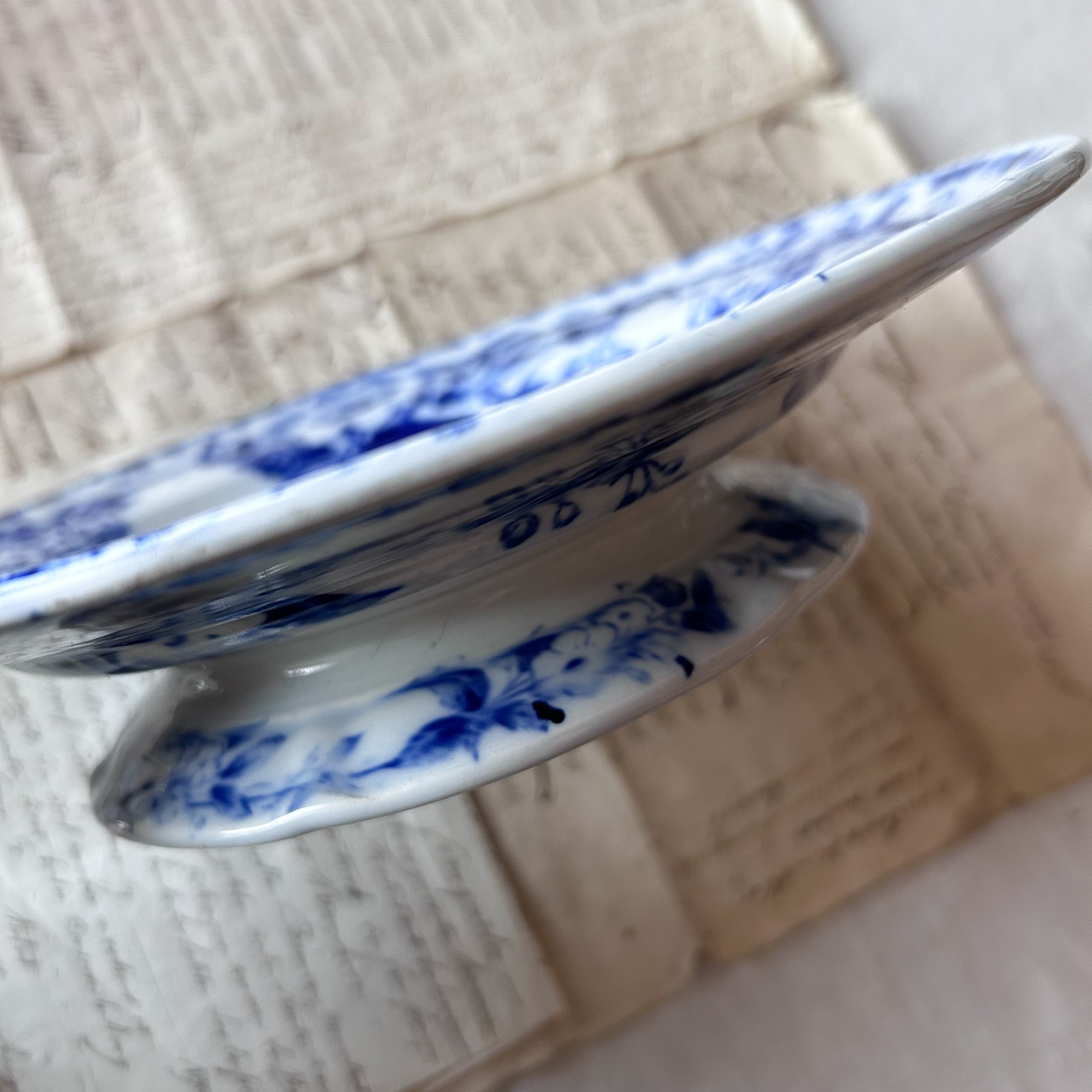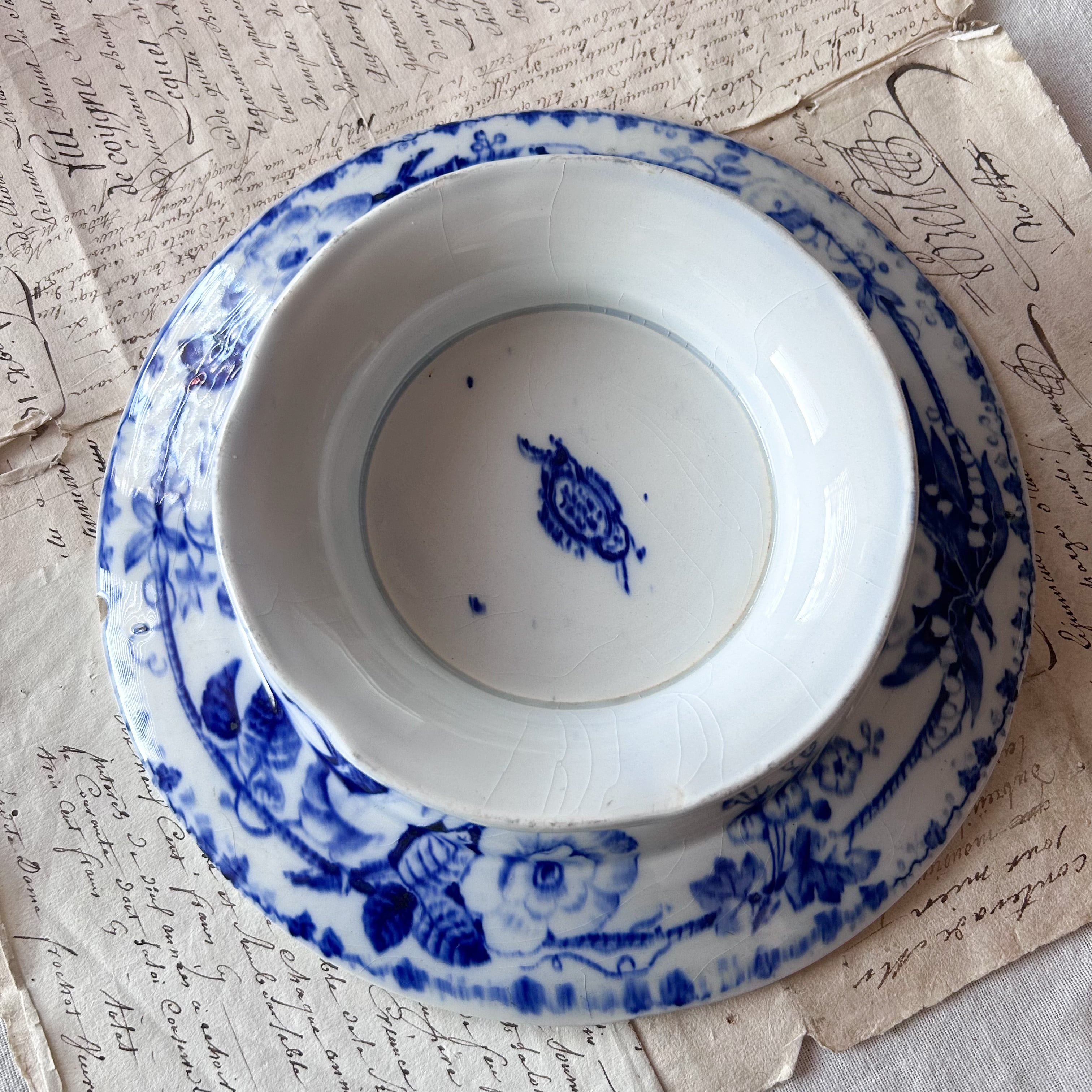 深みのあるブルーでミュゲなどの花々が描かれた、クレイユ・エ・モントローの“FLORA”シリーズのプレートです。精密な転写技法により表現されたボタニカルモチーフは、19世紀フランスの自然主義的美意識を感じさせます。柔らかな白色の陶肌にブルーの発色が映え、テーブルに優雅な陰影を添えてくれます。ディスプレイとして飾っても美しく、古いリネンや銀器、また和食器との相性も抜群です。