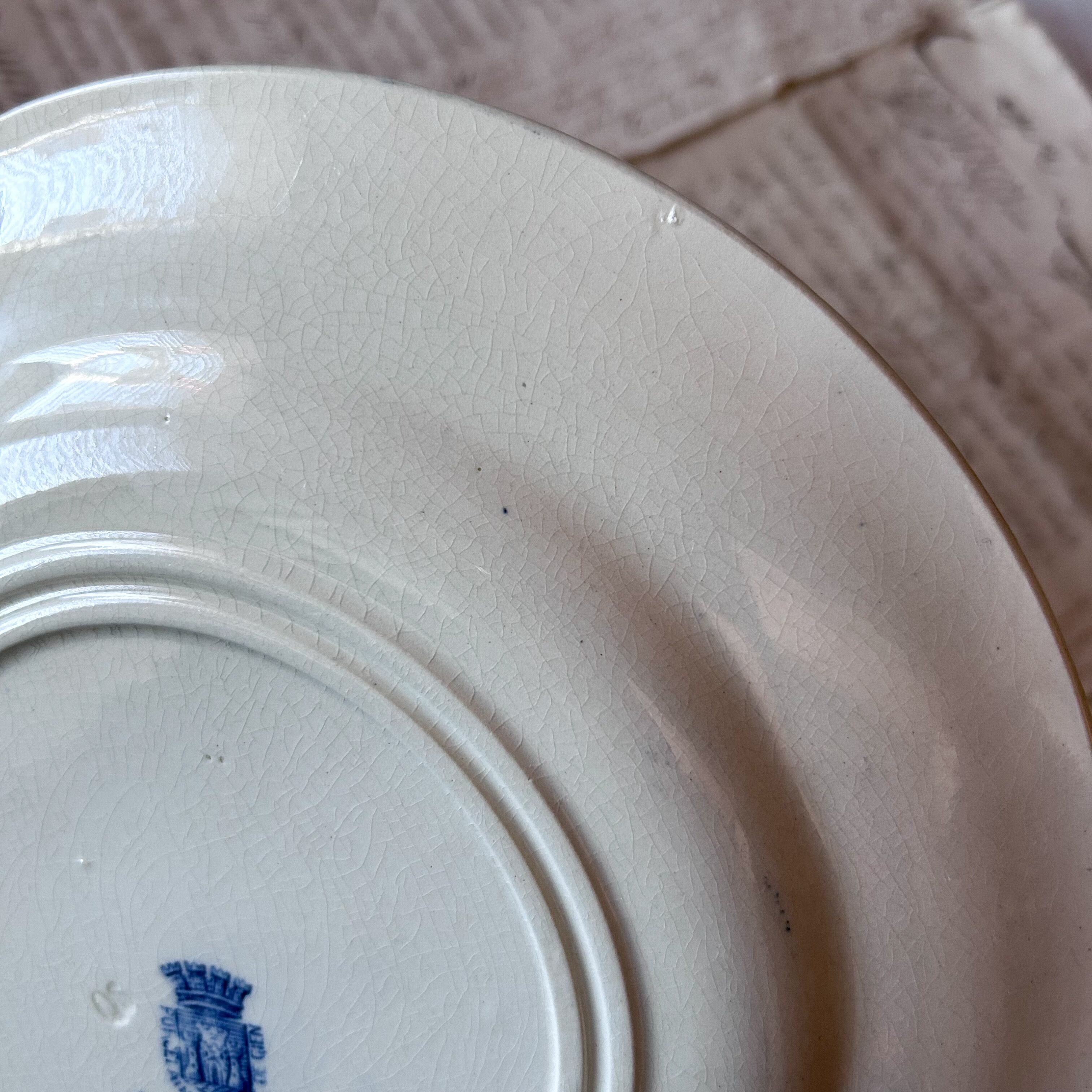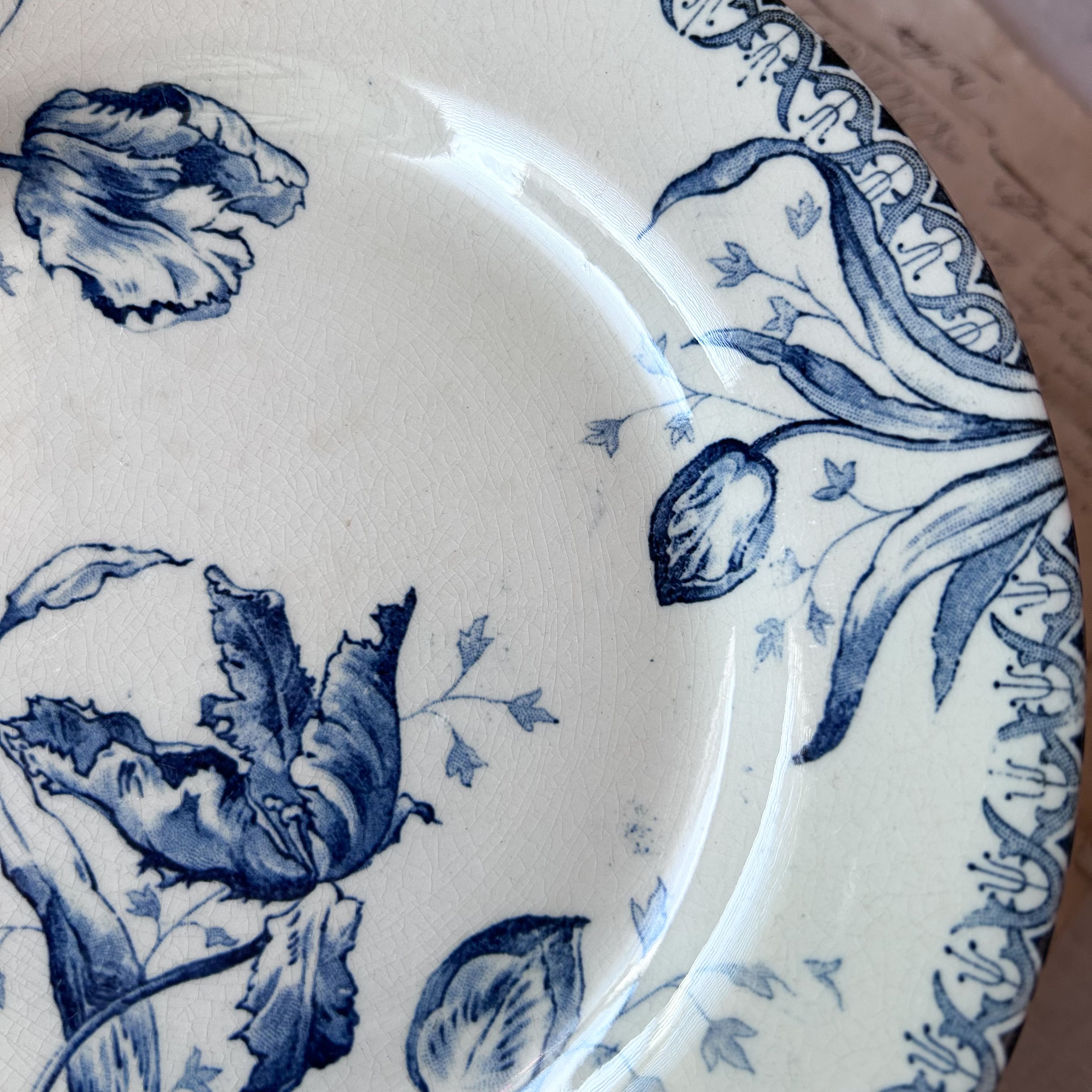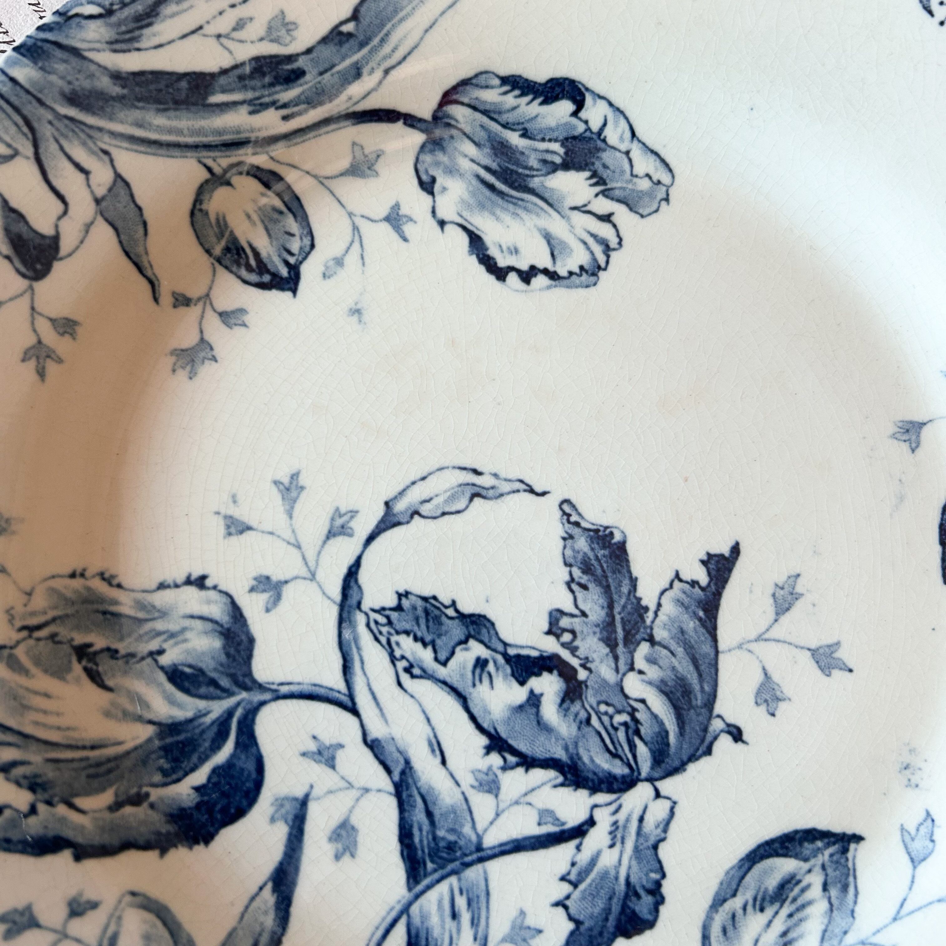大胆に描かれたチューリップが印象的な、ジアン窯のアンティークプレート。波打つ葉の動きや花の陰影まで細やかに表現された濃淡のブルーが、どこかクラシカルで凛とした美しさを漂わせます。落ち着いた生成りの陶肌に深いブルーがよく映え、飾り皿としても、スイーツの盛り付けにも存在感を添えてくれる一枚です。