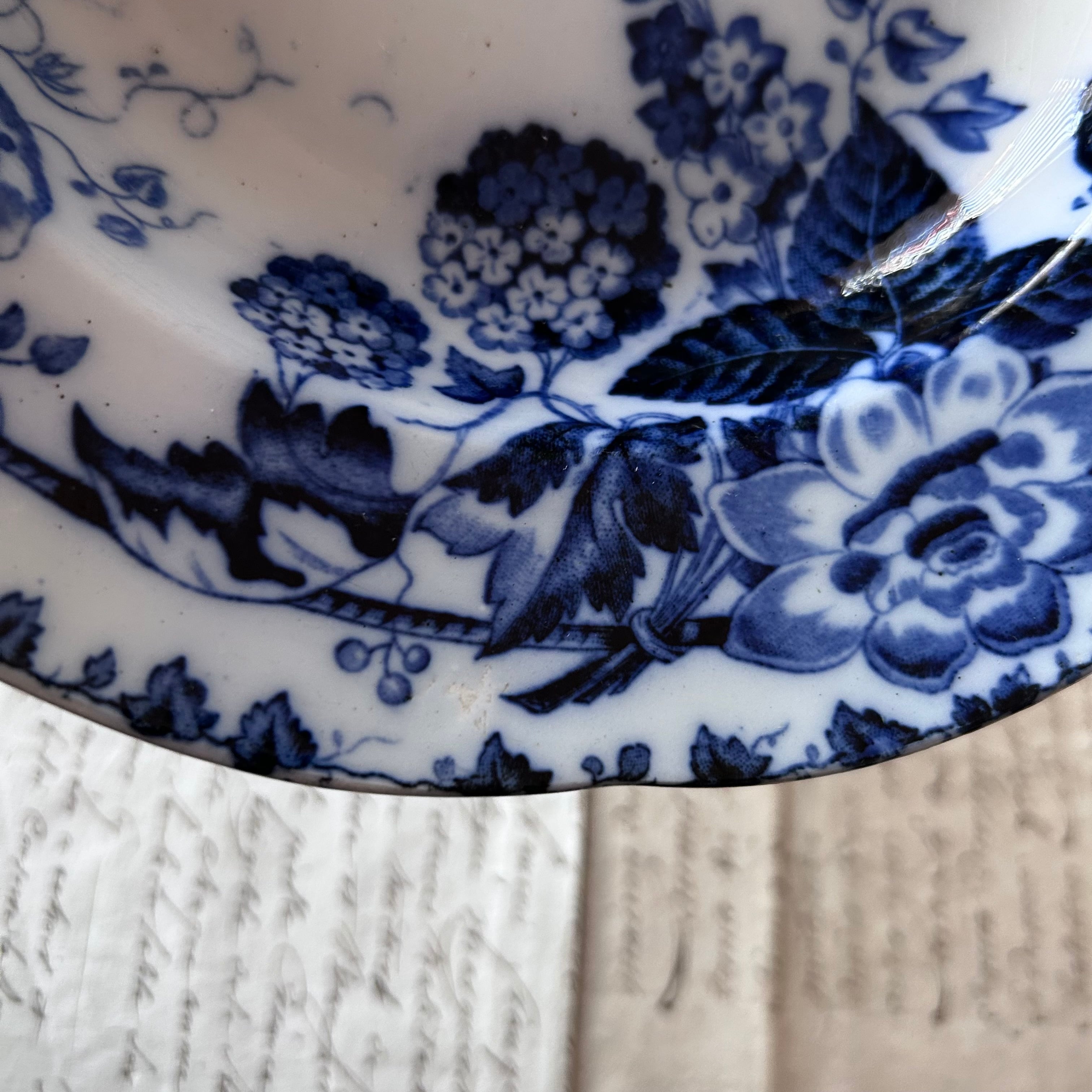 少し深みのあるブルーでミュゲなどの花々が描かれた、クレイユ・エ・モントローの“FLORA”シリーズのプレートです。精密な転写技法により表現されたボタニカルモチーフは、19世紀フランスの自然主義的美意識を感じさせます。柔らかな白色の陶肌にブルーの発色が映え、テーブルに優雅な陰影を添えてくれます。ディスプレイとして飾っても美しく、古いリネンや銀器、また和食器との相性も抜群です。