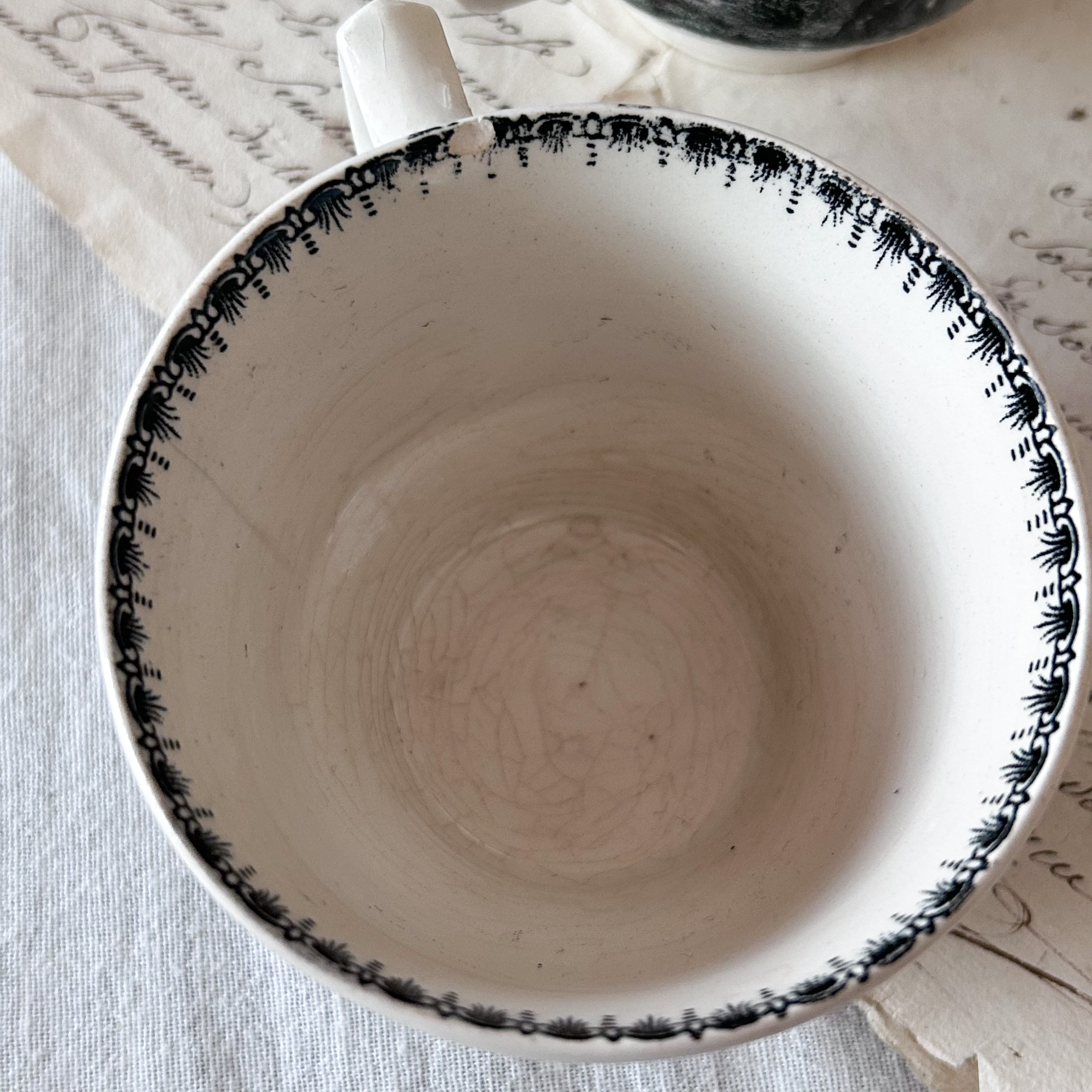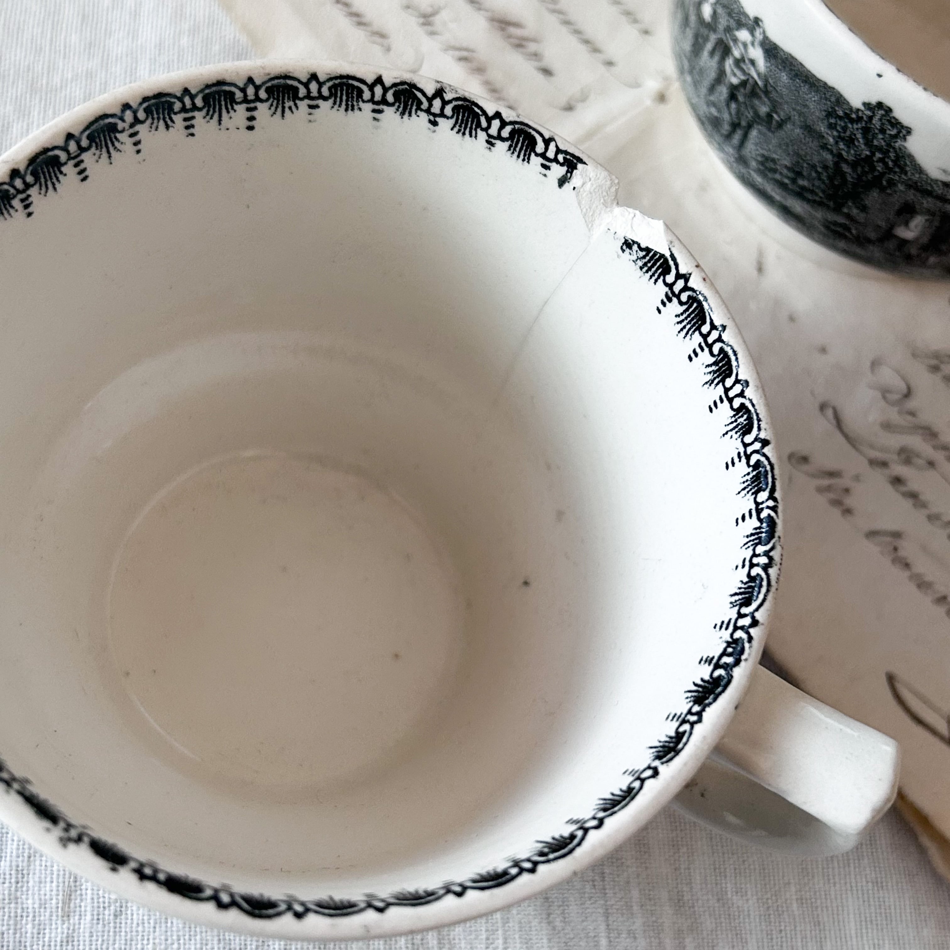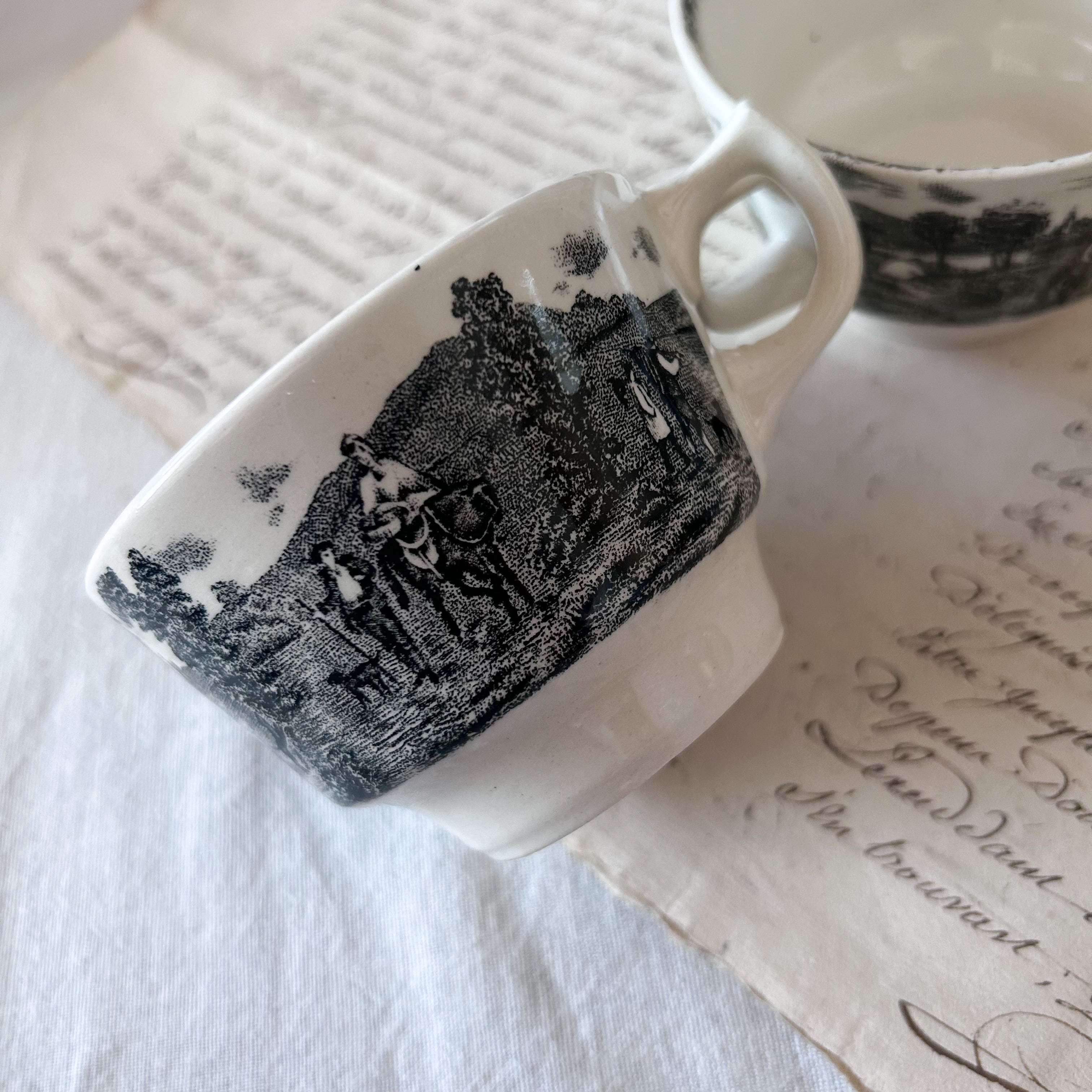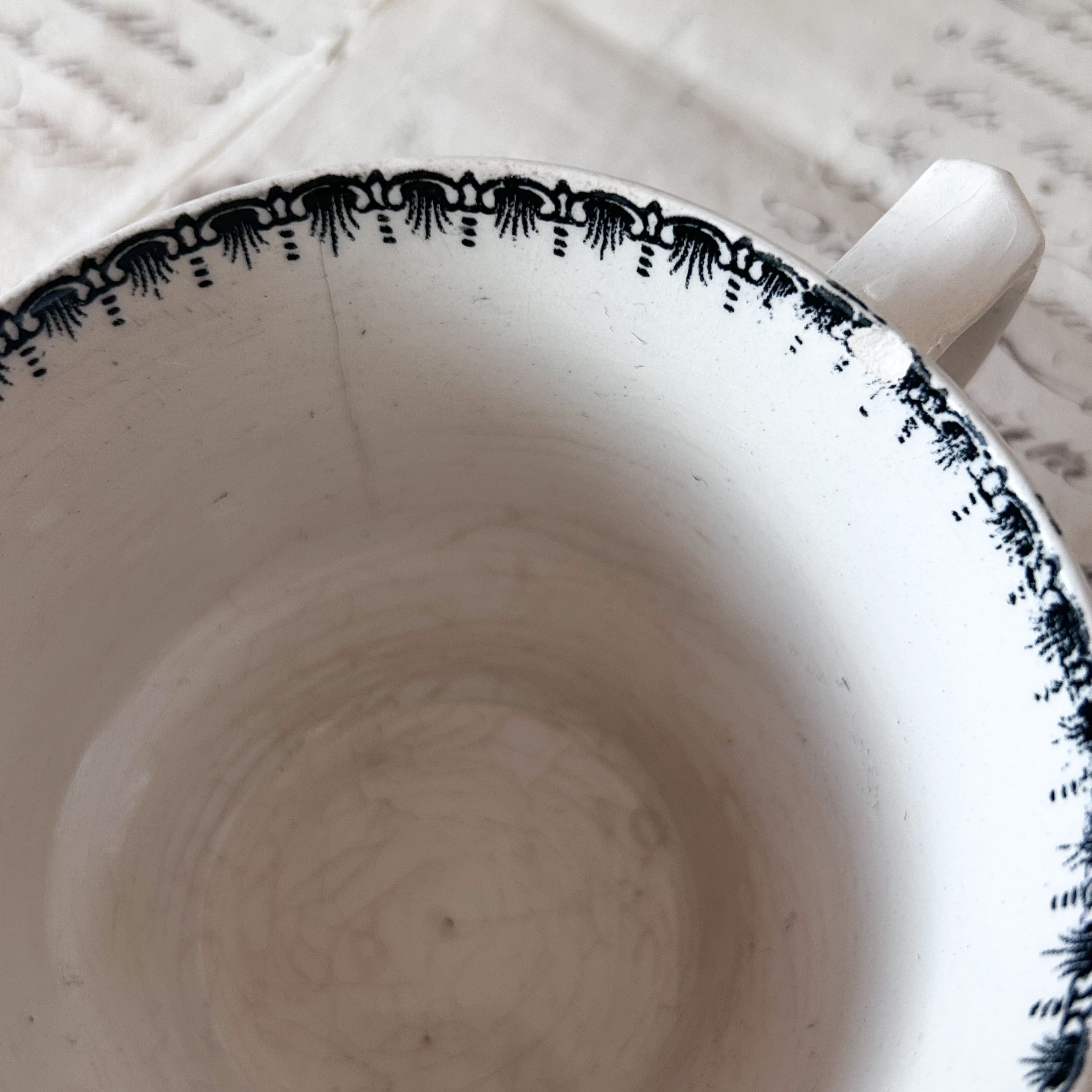 ベルギーの老舗陶磁器メーカー Boch Freres によるアンティークカップです。黒一色の転写で描かれた風景文様は、点描的な表現が美しく、19世紀後半〜20世紀初頭のヨーロッパ陶磁器らしい詩的な雰囲気を感じさせます。外側の風景画と、内側リムに施された繊細な装飾のコントラストも印象的で、静かな存在感を持つ一客です。アンティークならではの風合いがあり、ディスプレイとしておすすめです。
