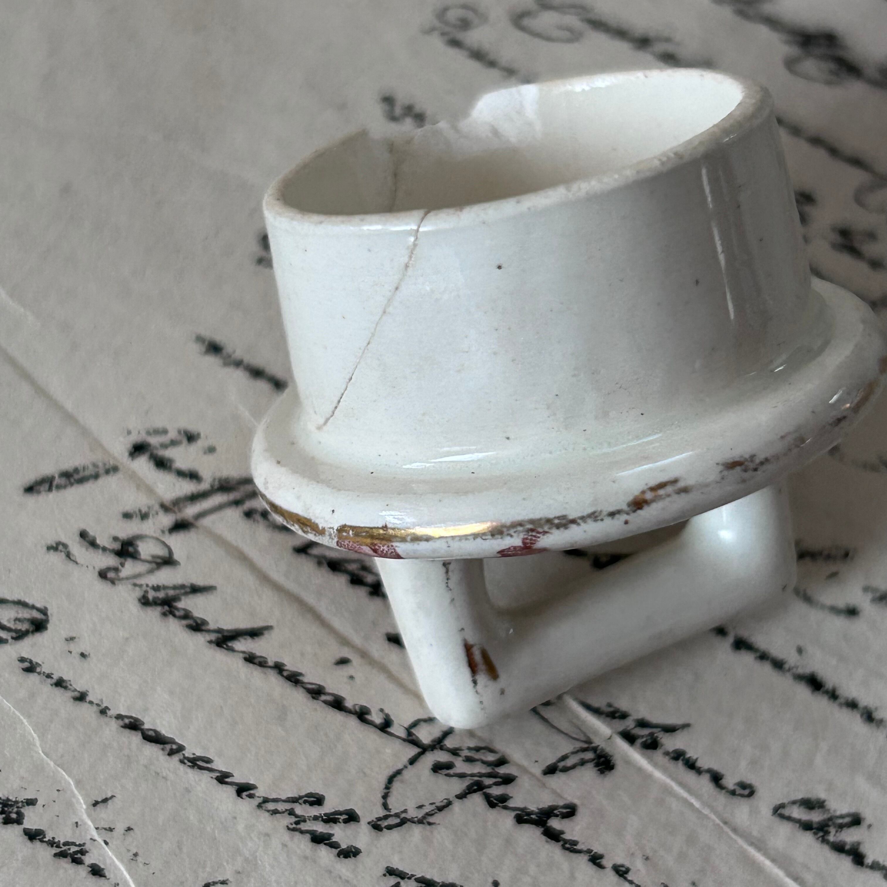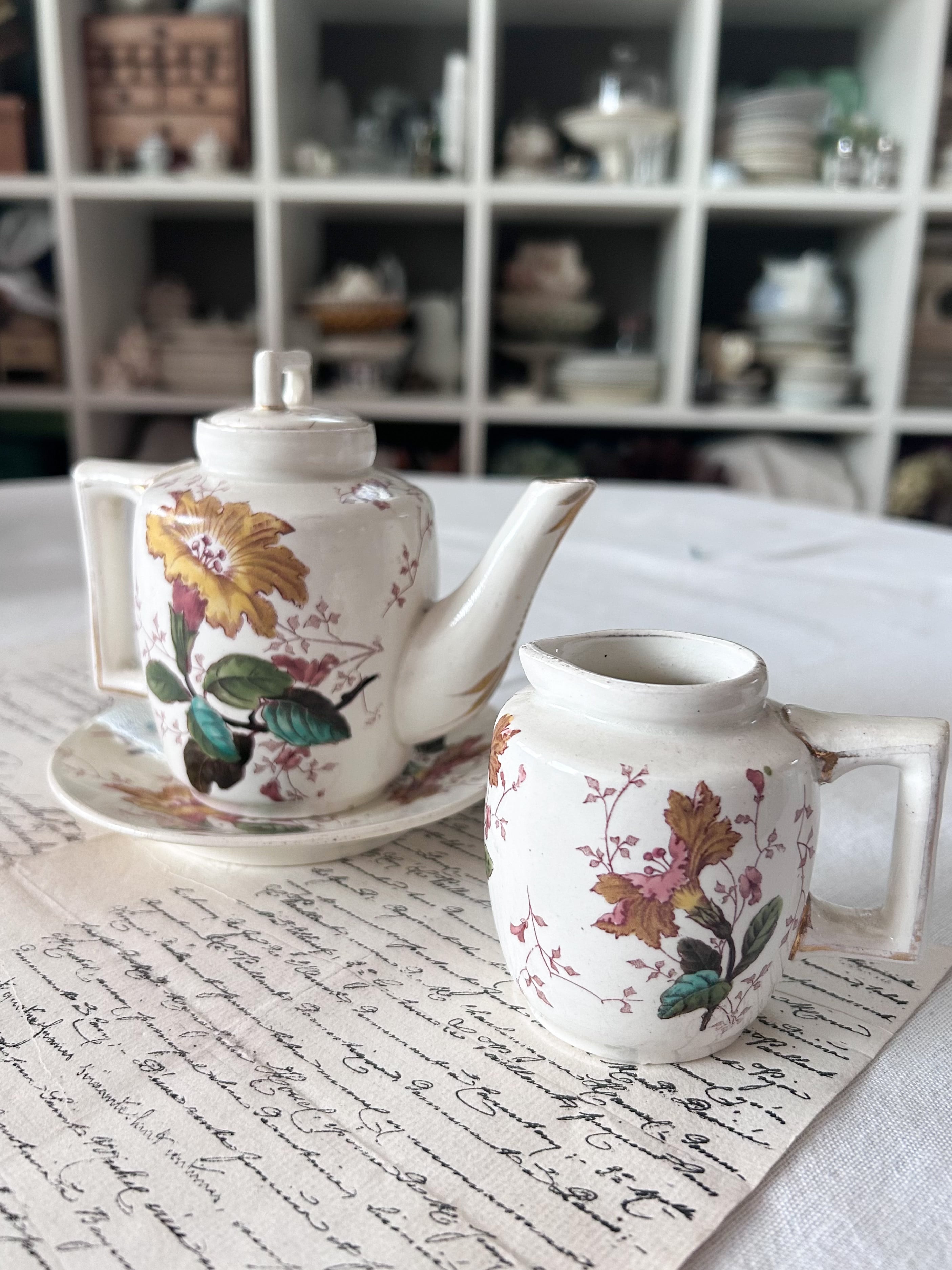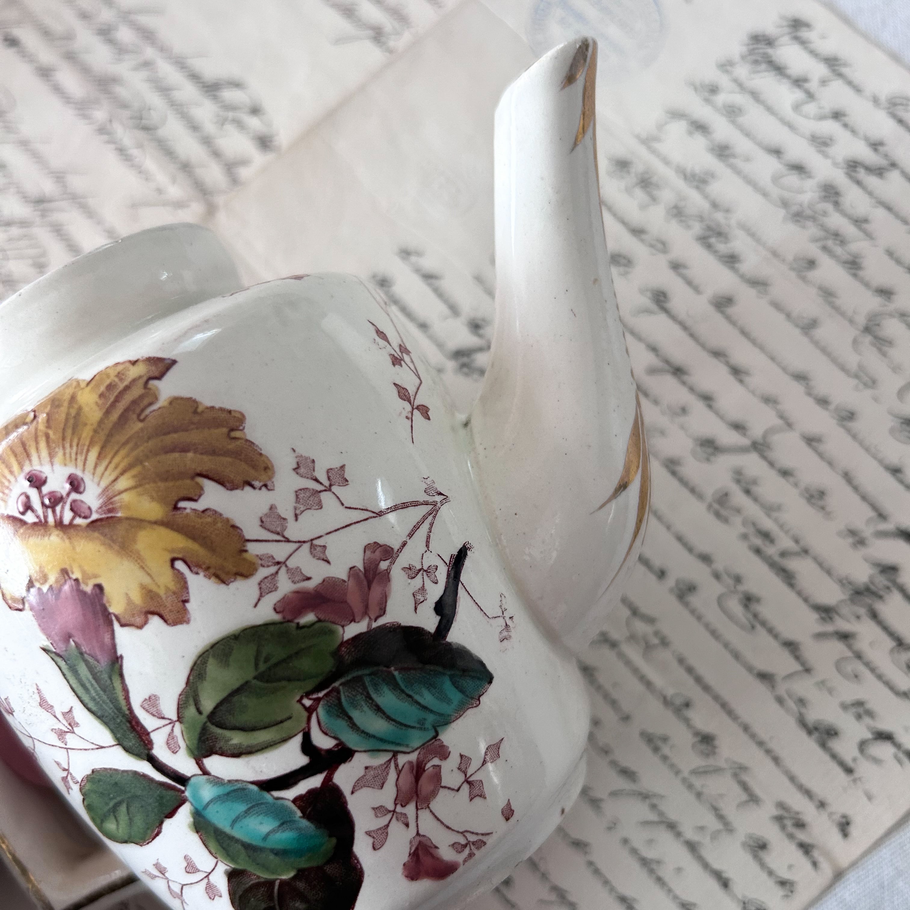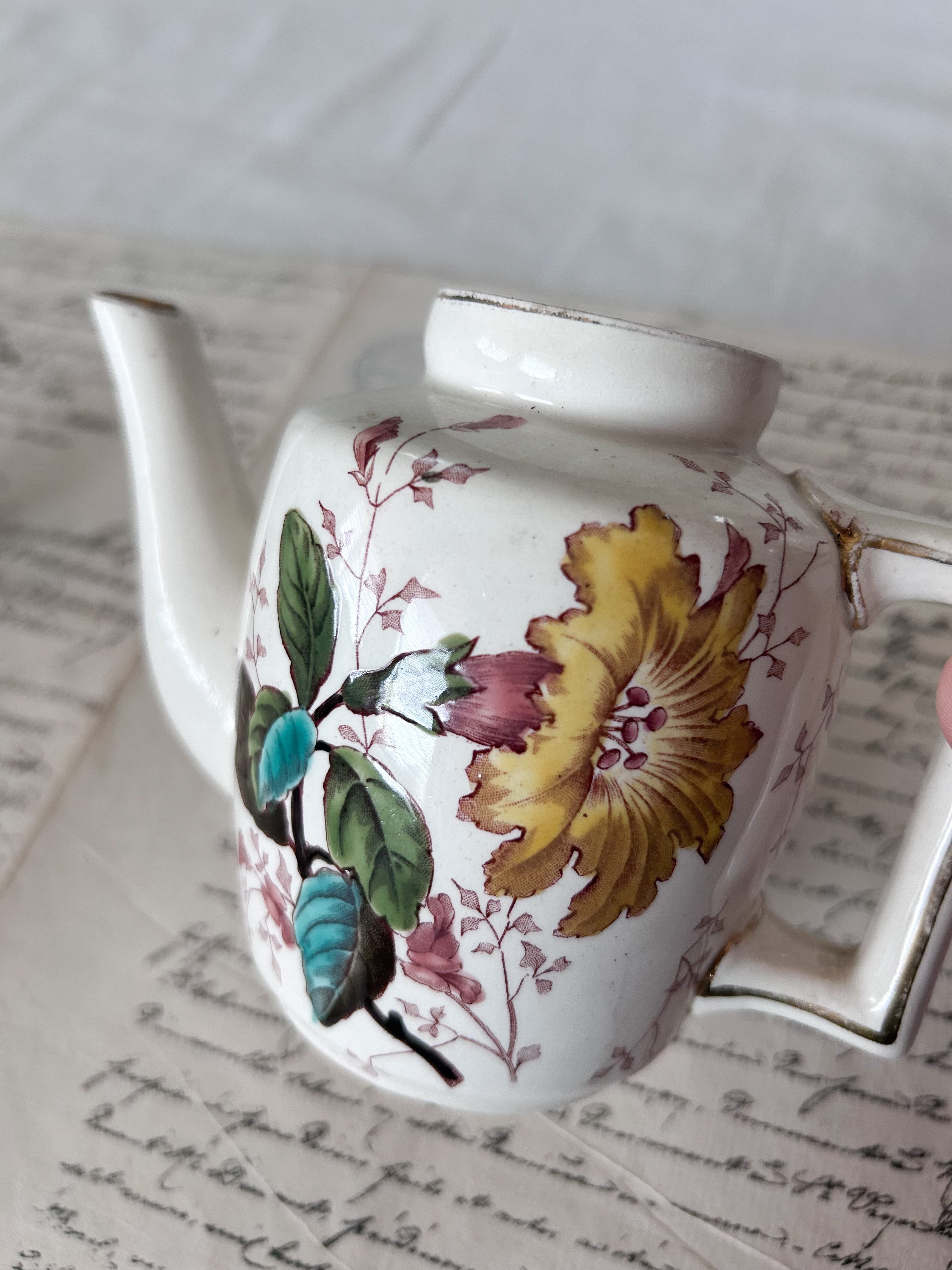 繊細なボタニカルモチーフが愛らしい、小さなポット&ソーサー。赤みを帯びた葉やピンクの小花、緑の葉が手描き調に描かれ、クラシカルな趣の中に柔らかな華やかさを添えています。四角い取手の意匠が特徴的で、丸みのあるフォルムと好対照を成しています。アクセントとして小さなお花を挿して飾ったり、朝食やティータイムの演出にもぴったり。古い陶器ならではの温かみが感じられる、愛らしい逸品です。