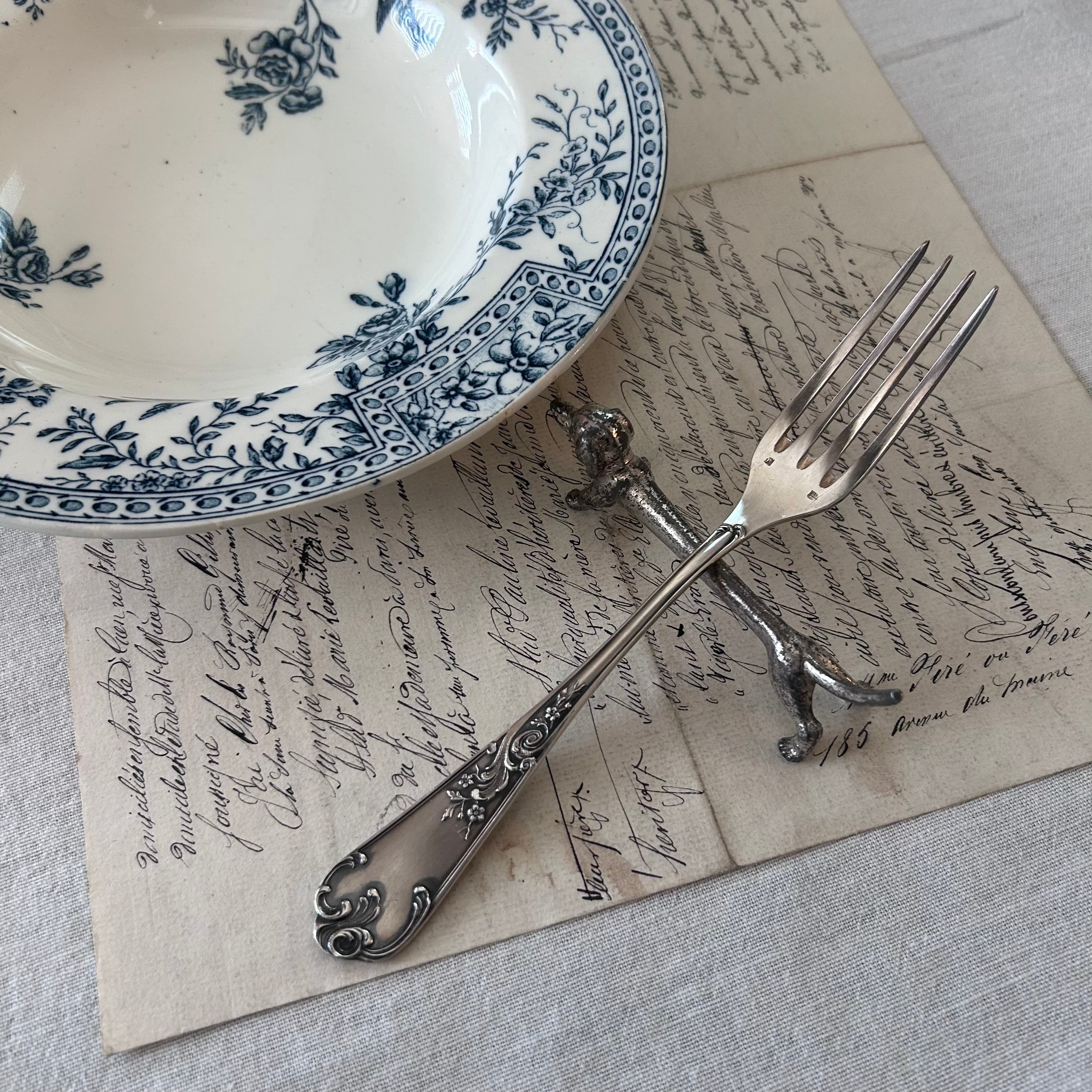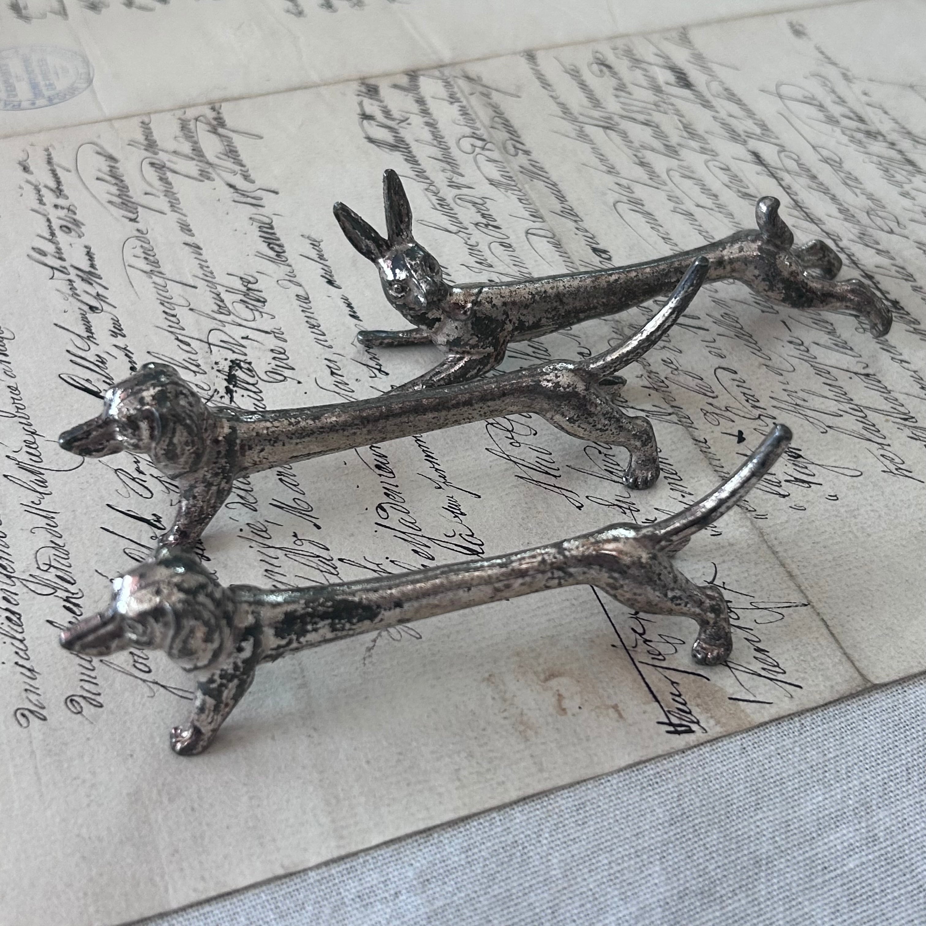 フランスで作られた、動物モチーフのカトラリーレストです。細長い胴体と愛らしい表情が印象的なデザインで、犬やうさぎのユーモラスな造形が食卓に遊び心を添えます。程よく経年変化したシルバーカラーの風合いがアンティークらしい深みを感じさせ、シンプルながらもキャッチーな佇まいです。カトラリーを支える実用品としてはもちろん、オブジェとして飾っても雰囲気を楽しめます。