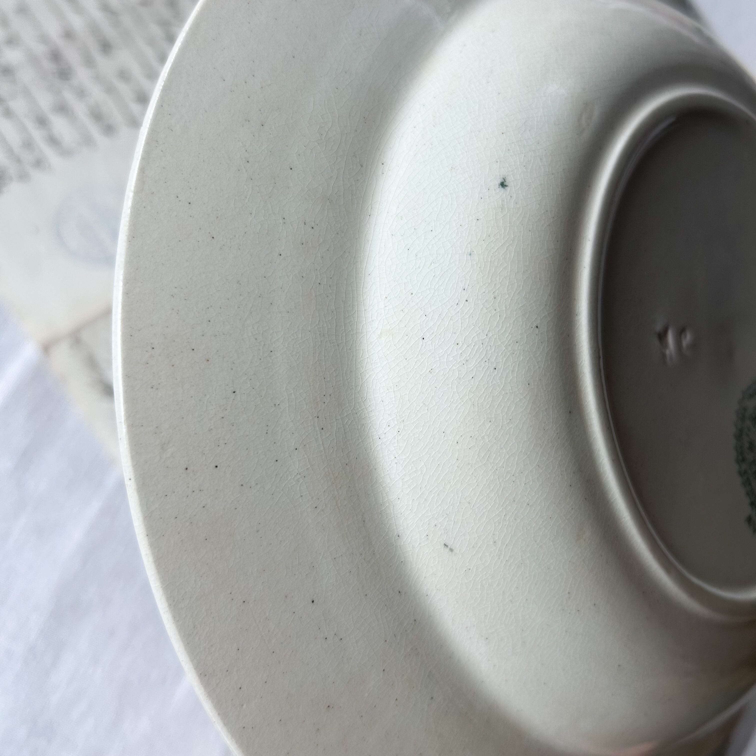 リムの凹みは釉薬がのっています。その他若干の変色、貫入等経年劣化は見られますが、つややかなアンティークコンディションです。