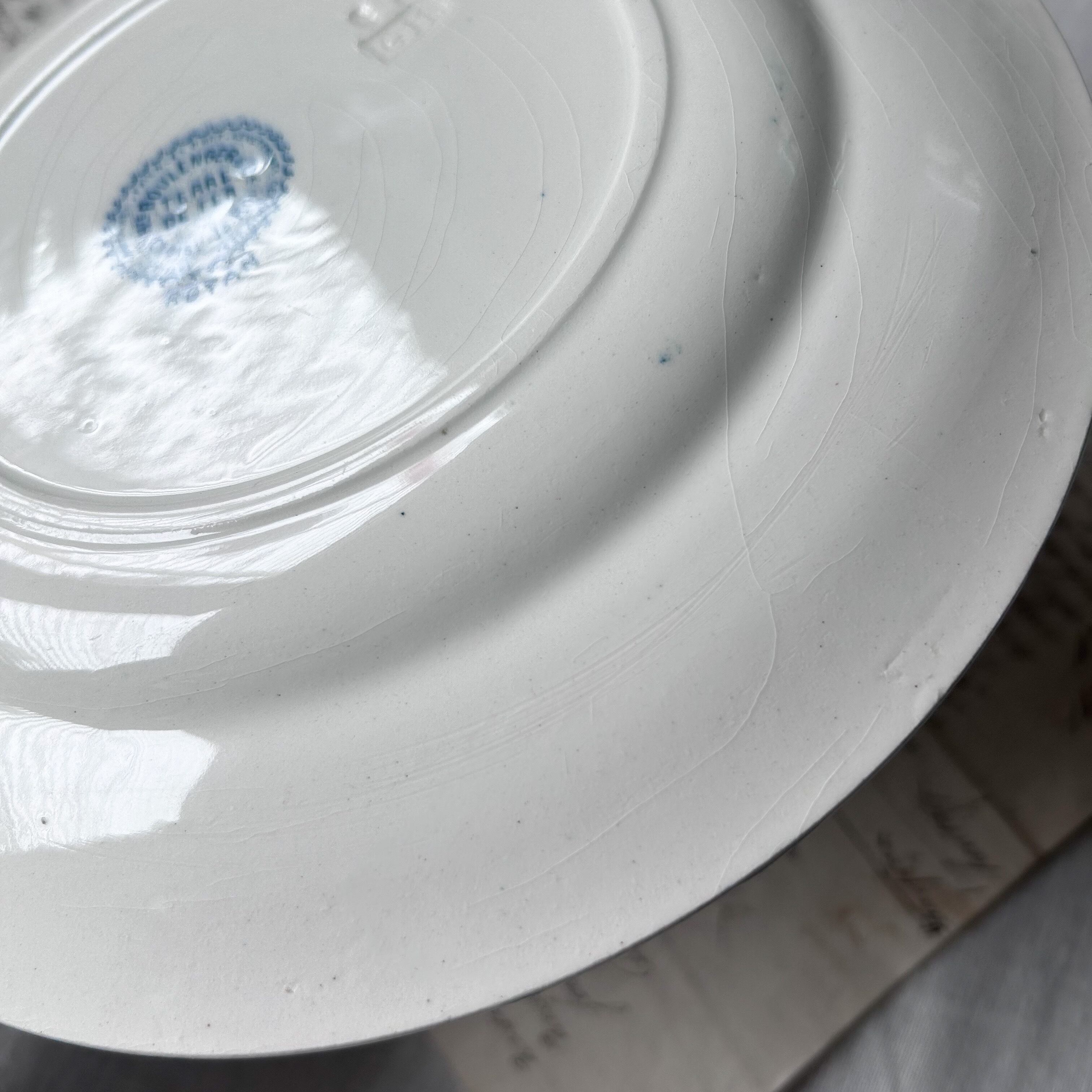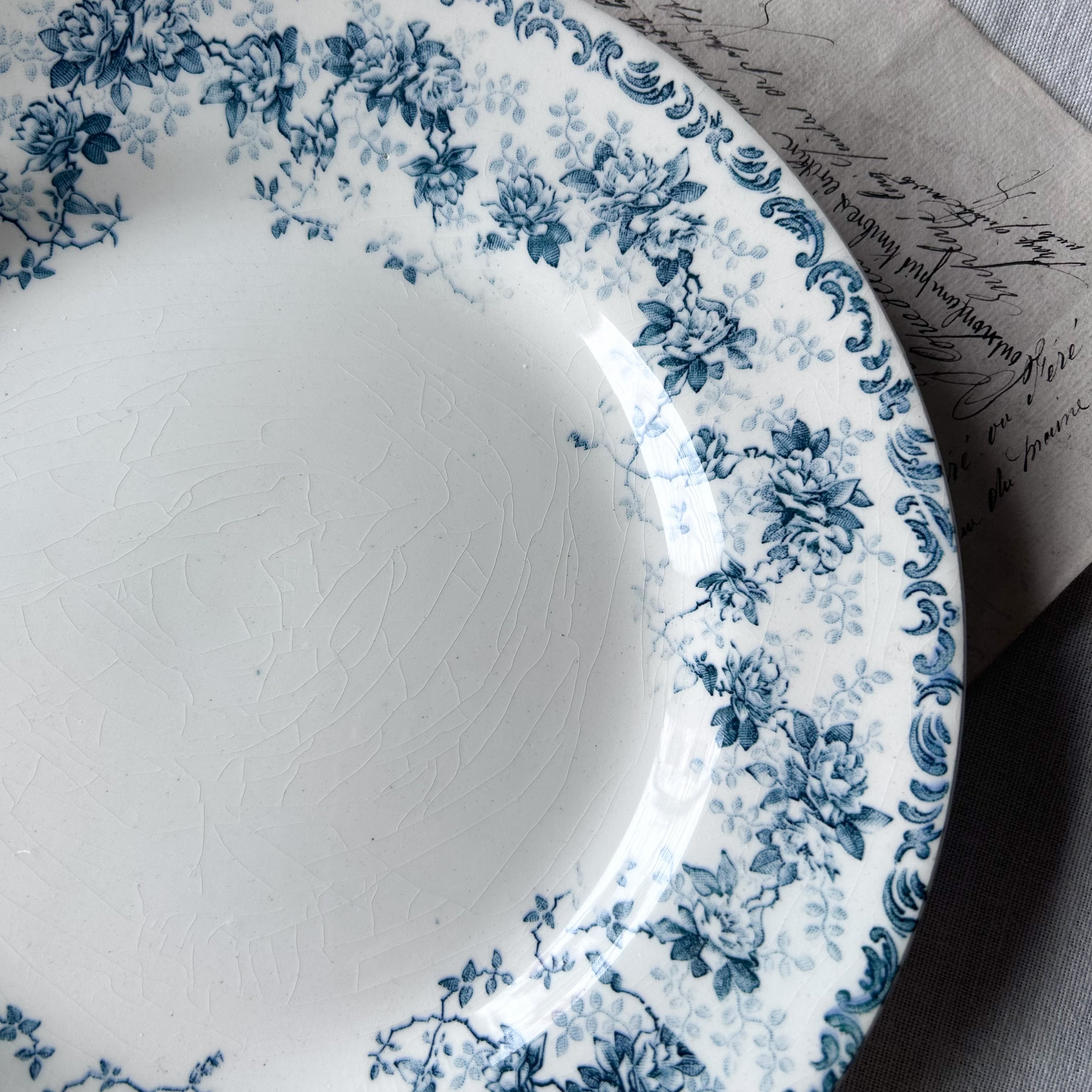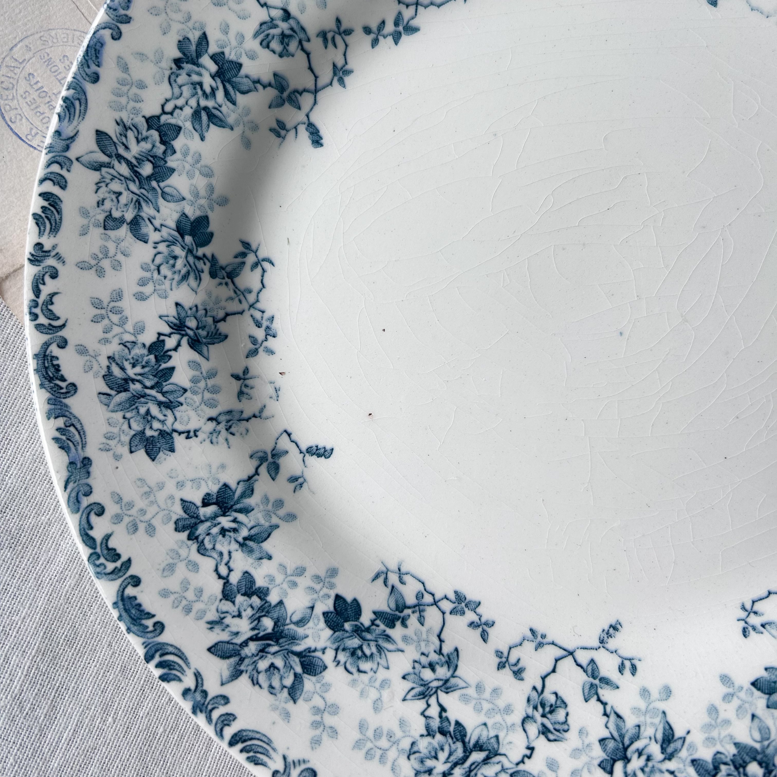 白地に深みのあるブルーで、優雅なバラをモチーフにしたガーランドが縁を彩るRoyanシリーズ。咲き誇るバラと可憐な小花、そして繊細な葉が絡み合う美しいデザインは、クラシカルなフレンチアンティークならではの魅力を感じさせます。縁取りのロカイユ模様がさらに気品を添え、テーブルを華やかに演出します。飾り皿としても存在感のある一枚です。