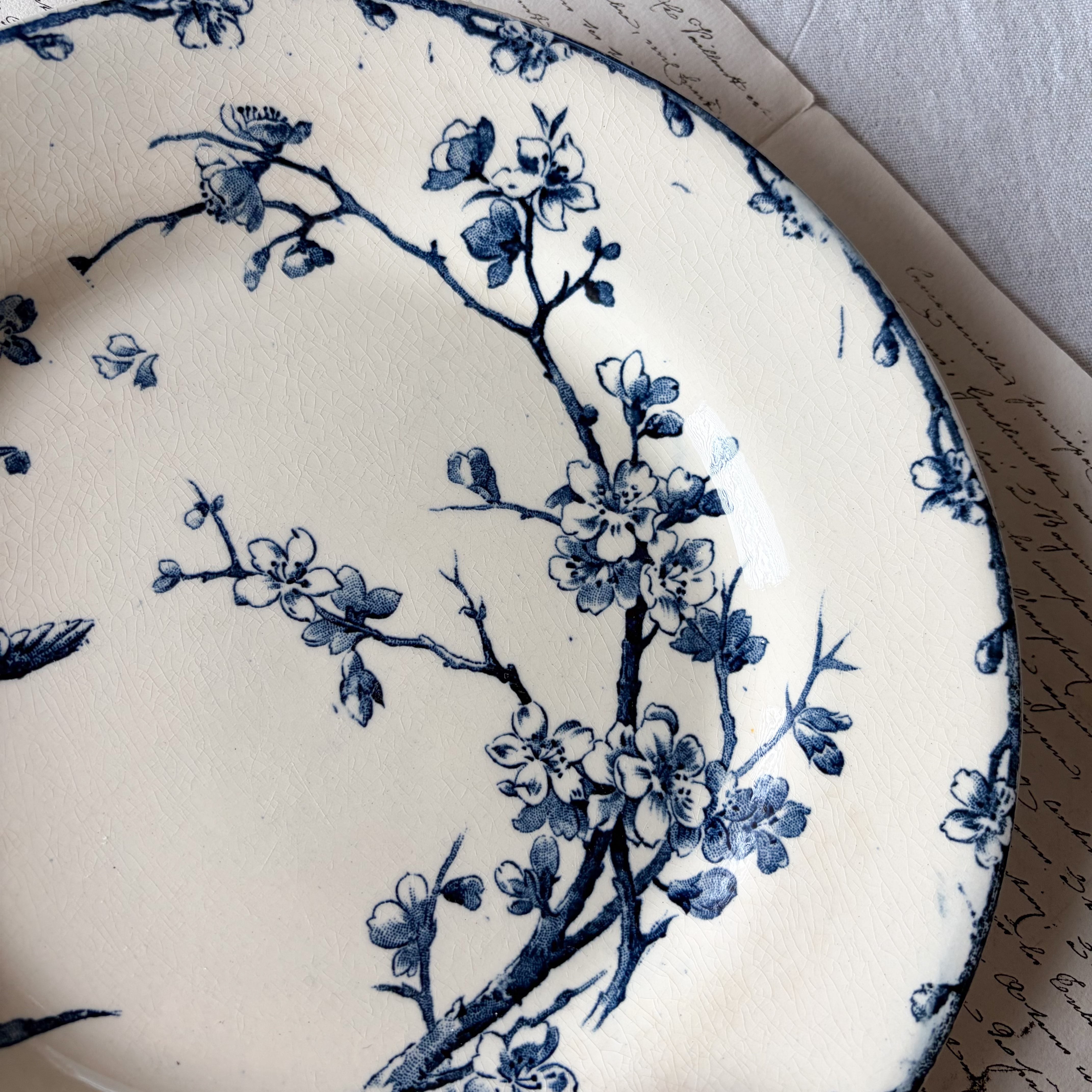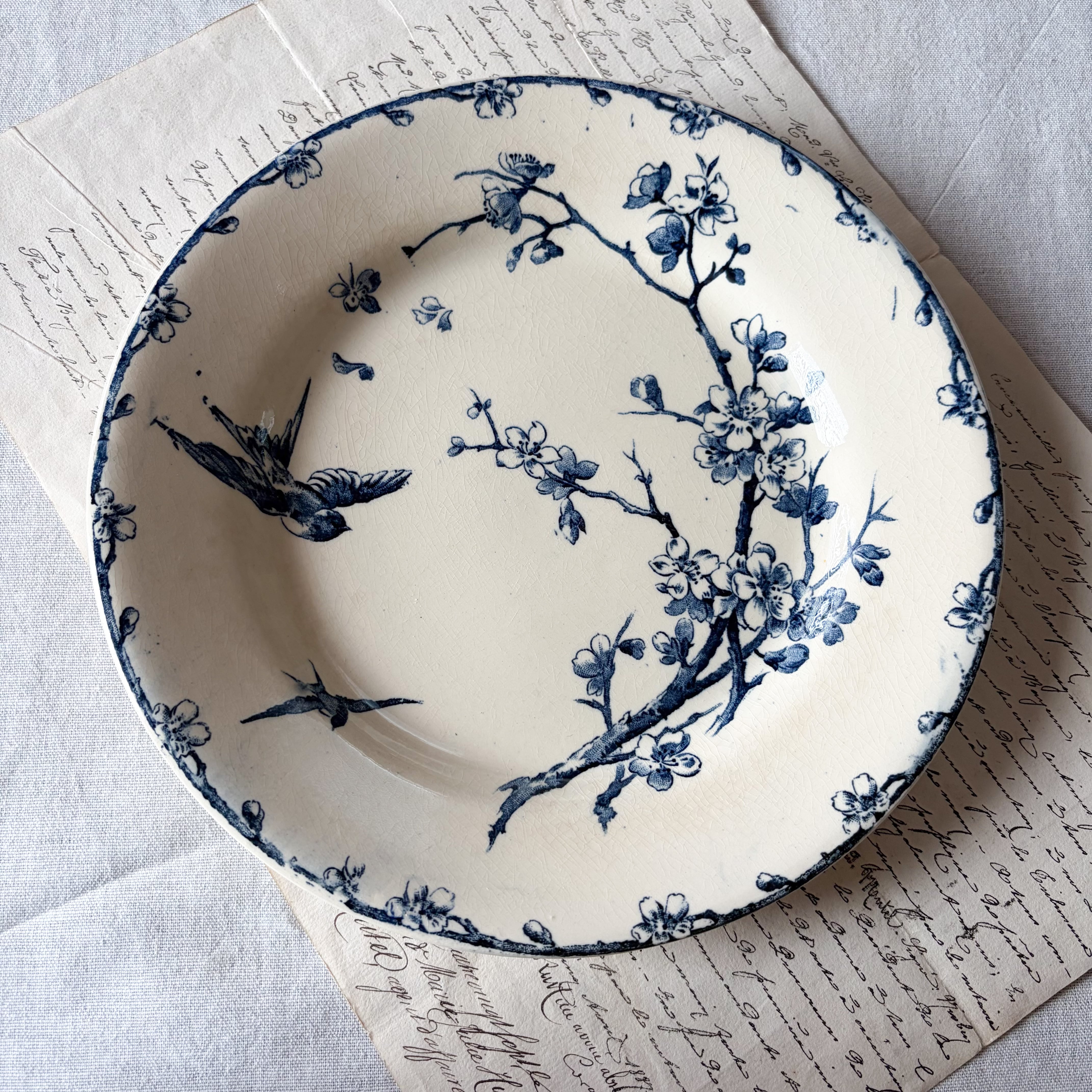 やわらかな白地に濃紺のツバメと桜花(と思われる)が軽やかに描かれた、ジアンのジャポニスム様式を色濃く感じる美しいプレートです。飛び交うツバメの伸びやかな姿と、枝に咲く可憐な花々がバランスよく配され、19世紀末〜20世紀初頭のフランス陶器らしい上品さと詩情が漂います。縁を囲む小花のモチーフが柔らかいアクセントとなり、テーブルに置くだけで季節感と優雅さを添えてくれる一枚です。ディスプレイとしても映える存在感があります。